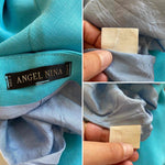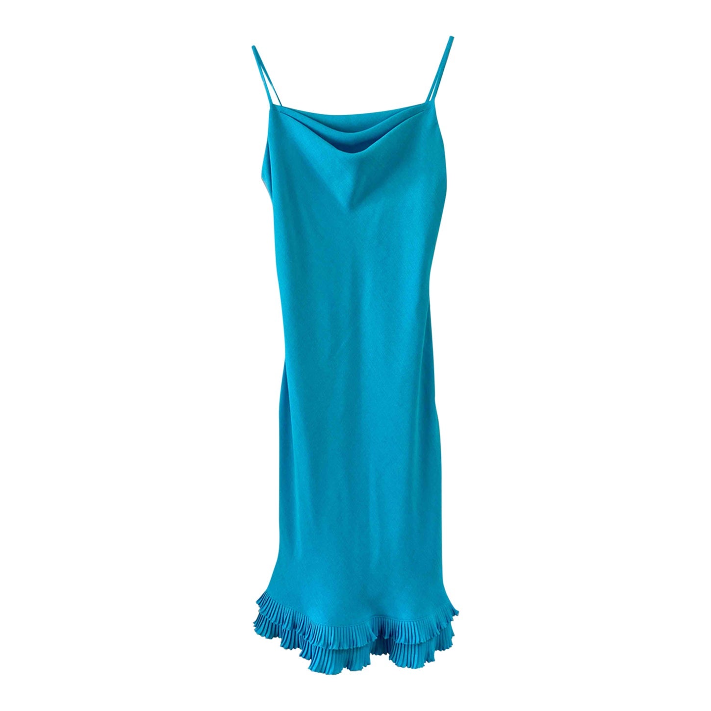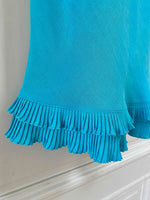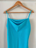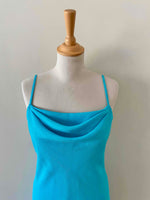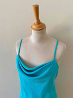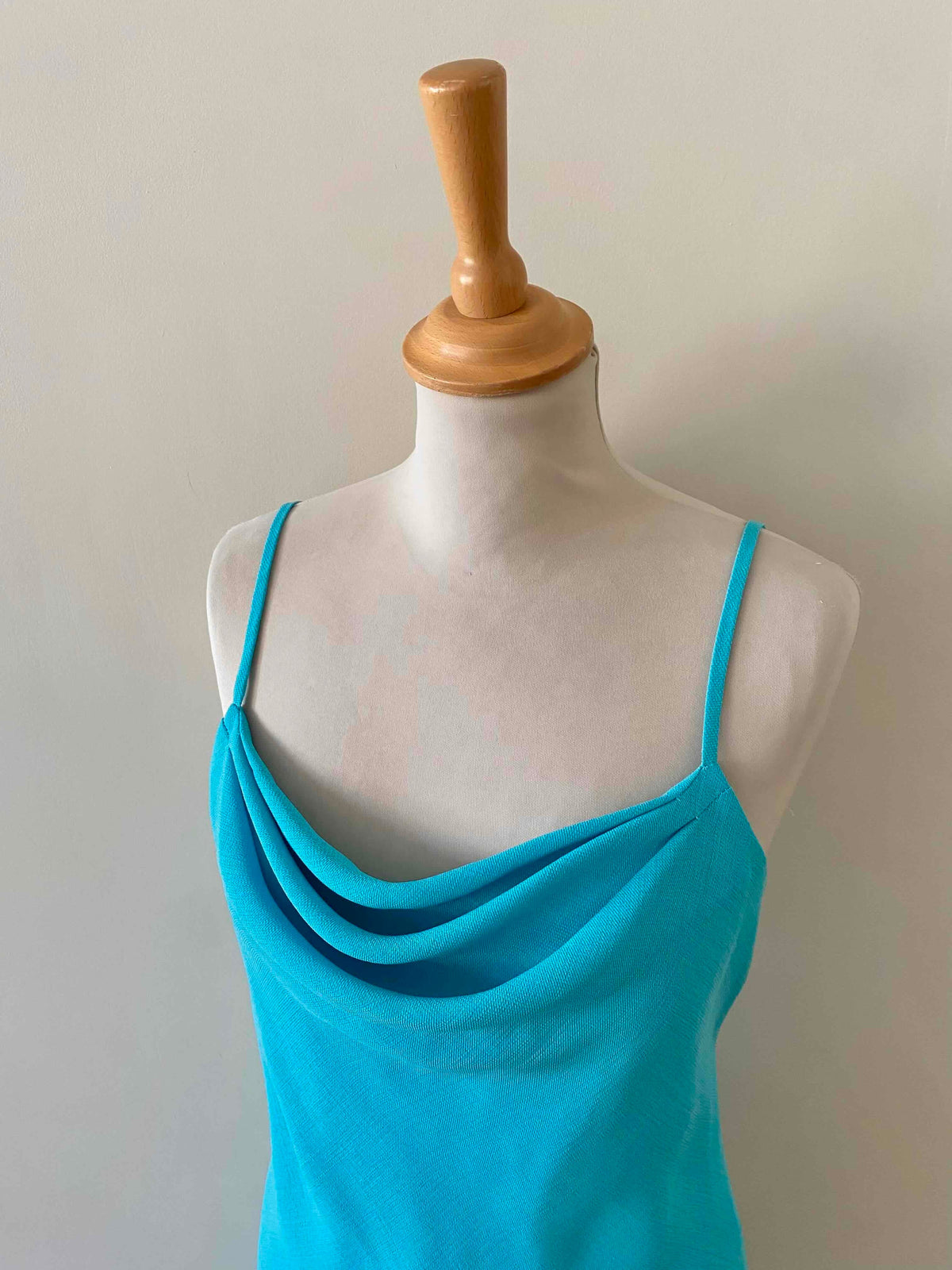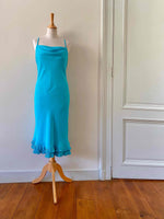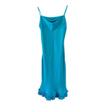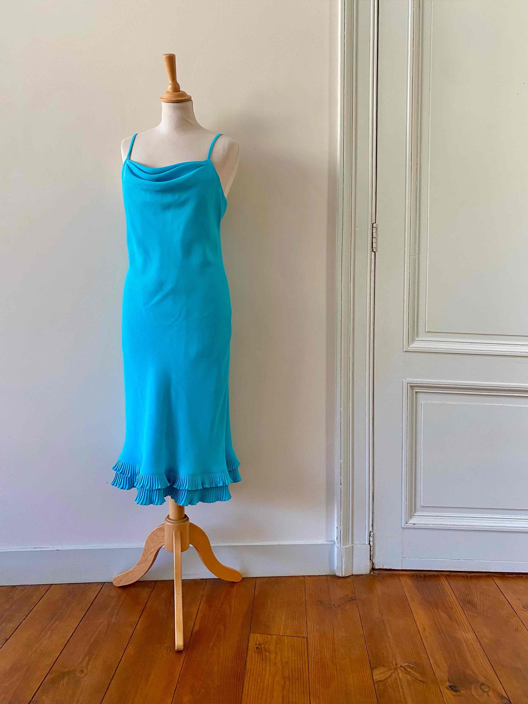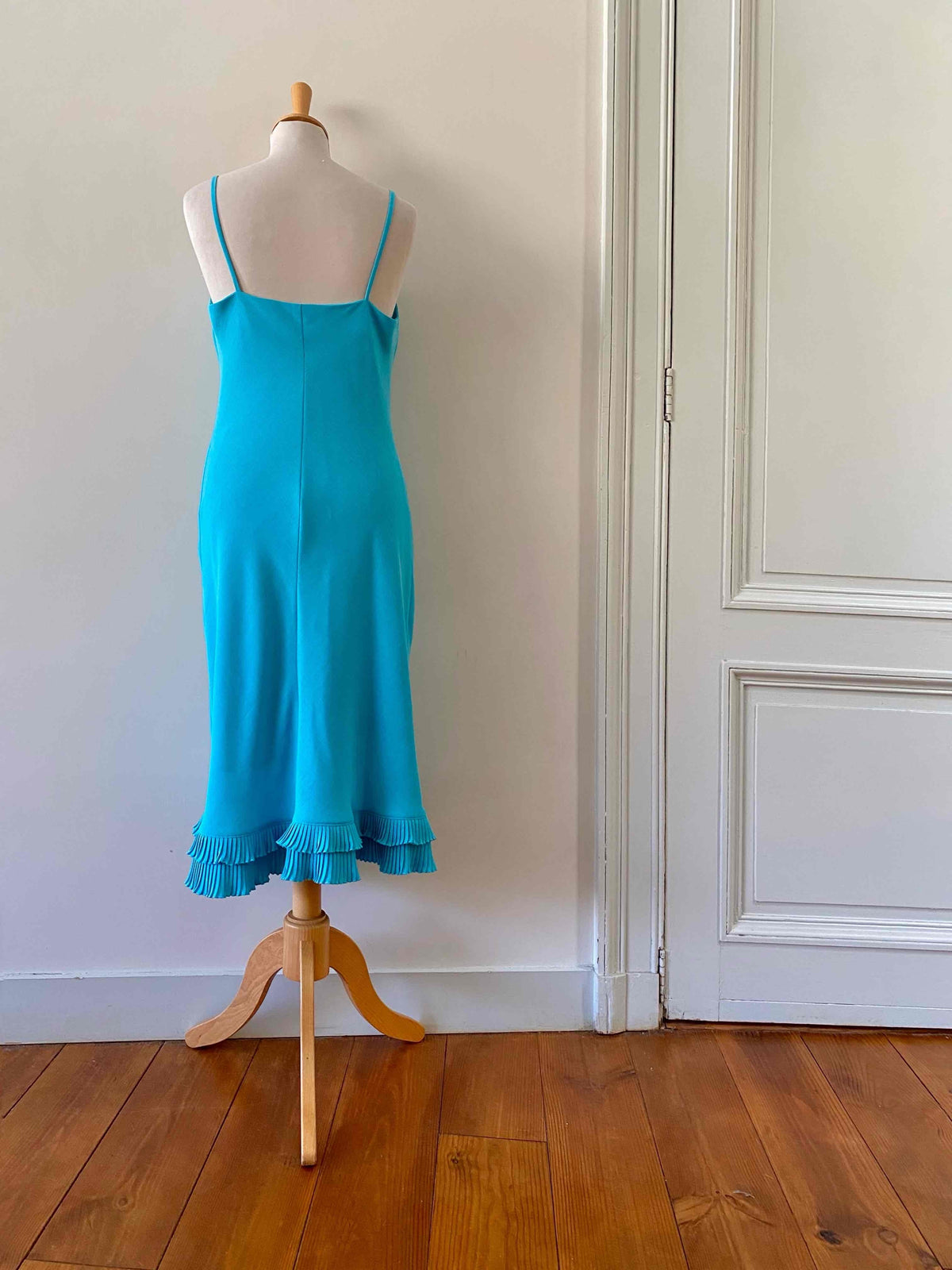 Prix unitaire parRobe nuisette bleu piscine, en crêpe bleu, bretelles spaghettis, encolure benitier drappée, bas volants plissés, forme fit and flare, fabriquée en France, taille 36 et petit 38 portée ici sur un mannequin T36, aisselles 44cm.