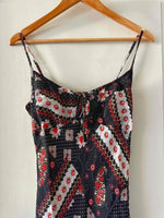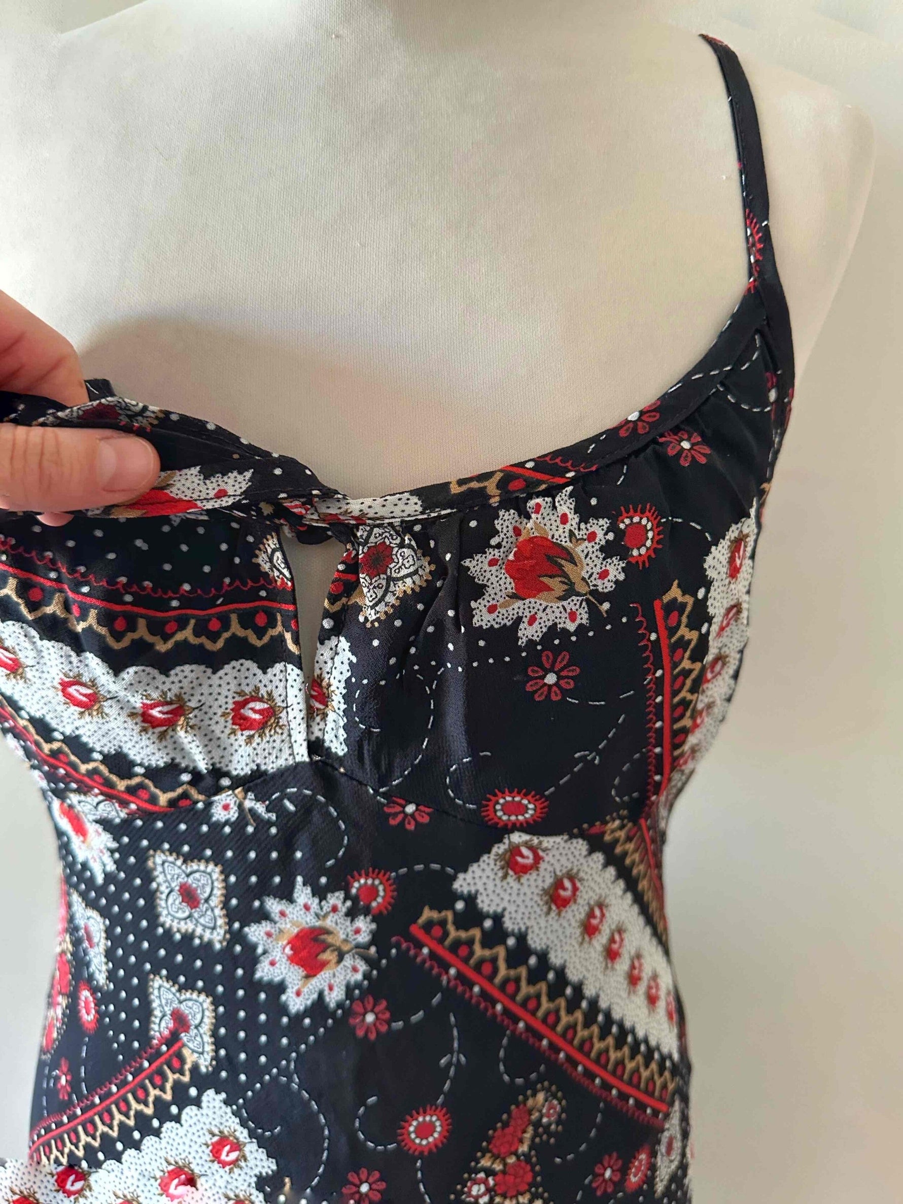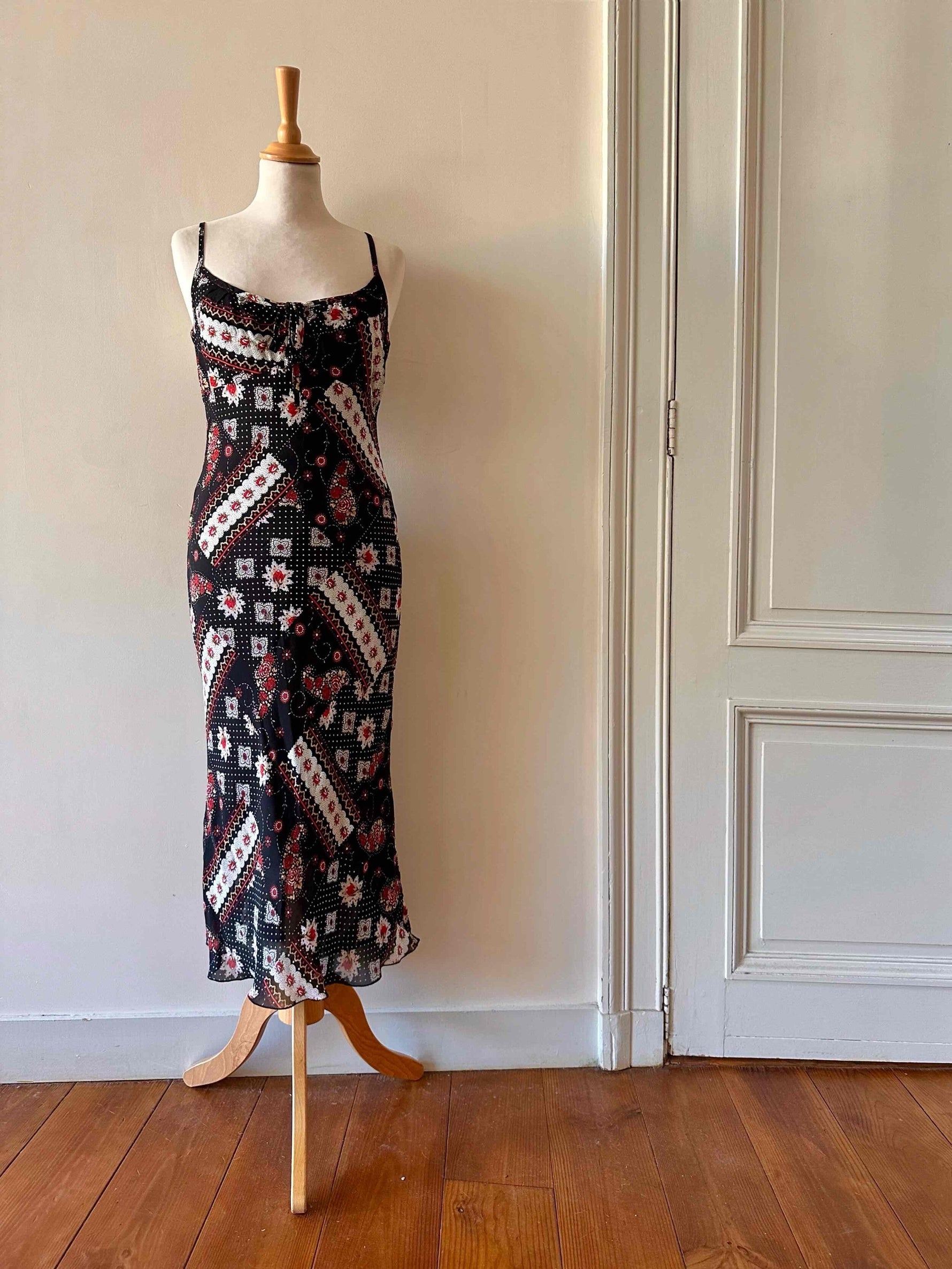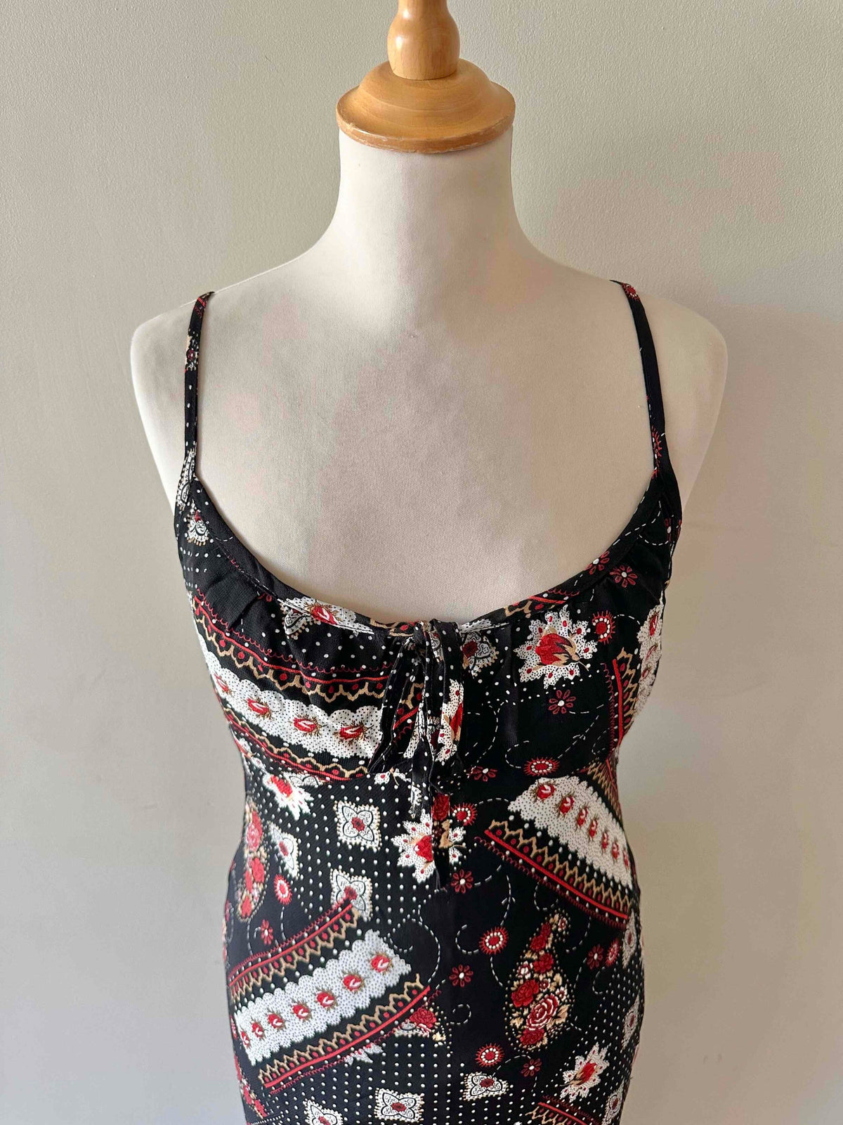 Robe nuisette patchwork, en voile viscose noire doublée, imprimée patchwork fleuri rouge, blanc, beige, bretelles spaghettis réglables, poitrine à nouer, forme fit and flare en biais, fabriquée en France, taille 36 portée ici sur un mannequin T36, aisselles 43cm.