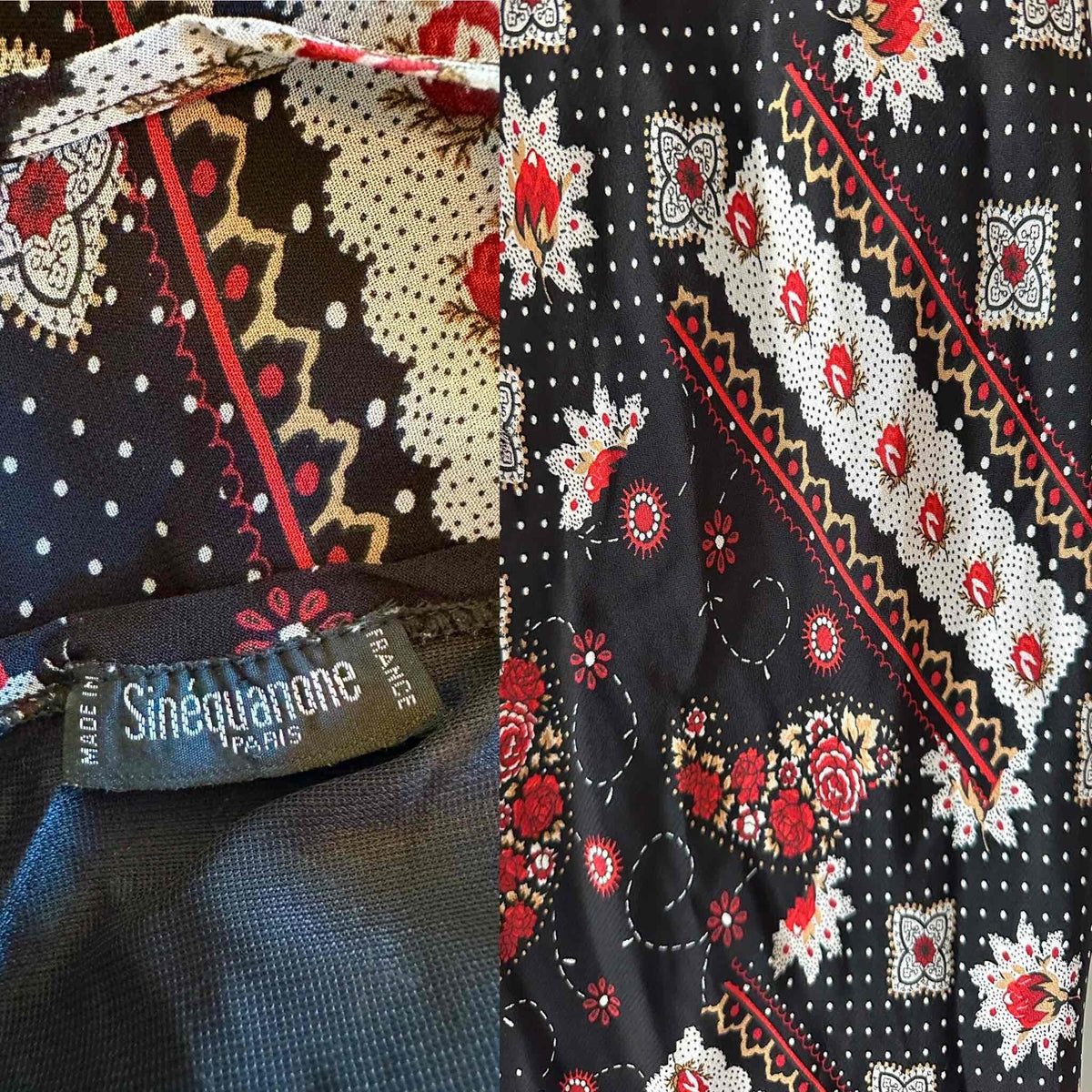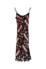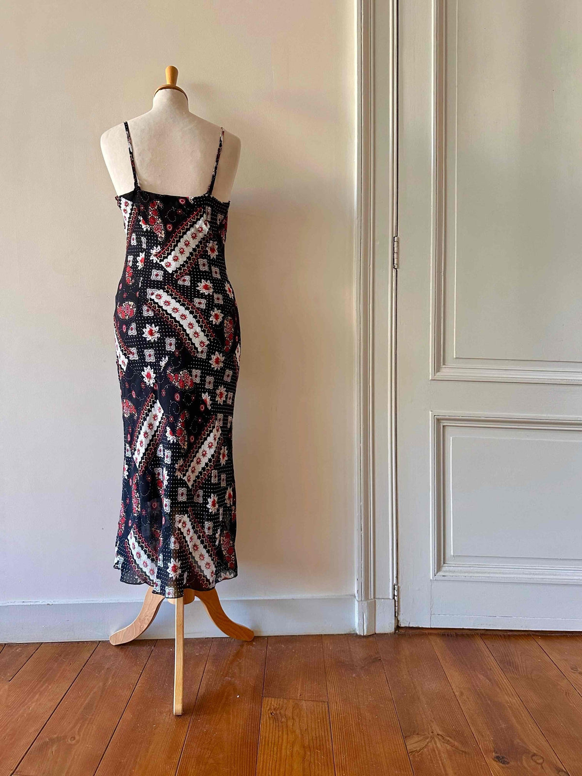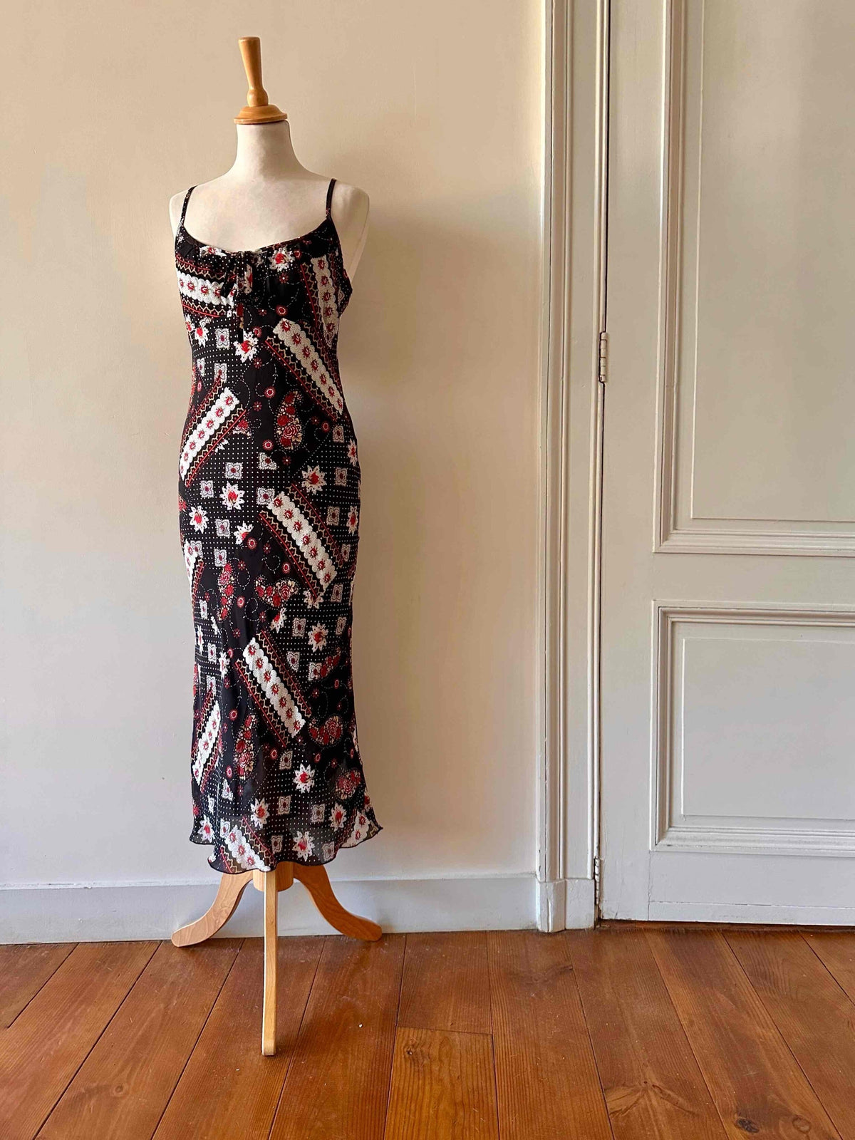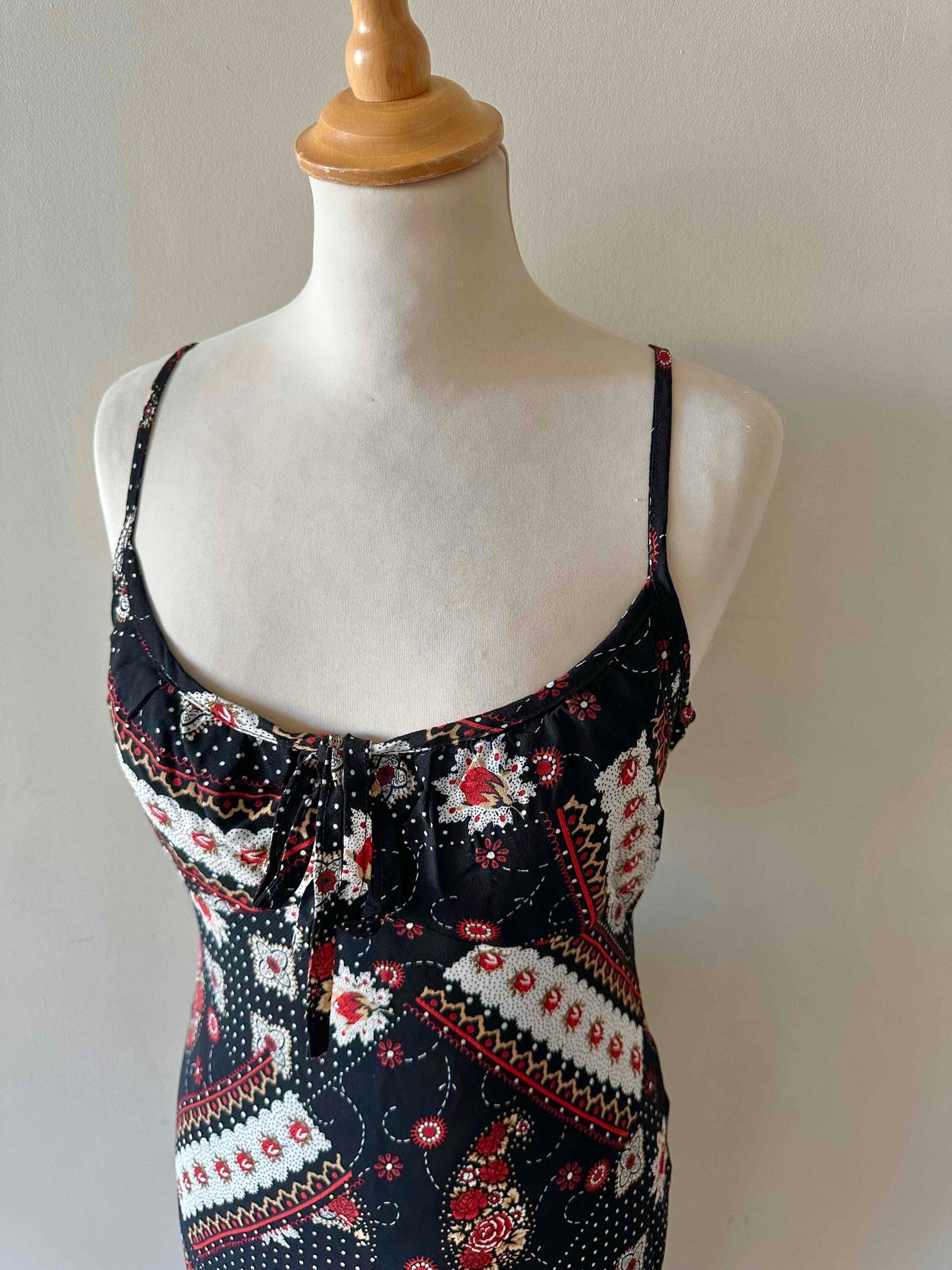Robe nuisette patchwork, en voile viscose noire doublée, imprimée patchwork fleuri rouge, blanc, beige, bretelles spaghettis réglables, poitrine à nouer, forme fit and flare en biais, fabriquée en France, taille 36 portée ici sur un mannequin T36, aisselles 43cm.