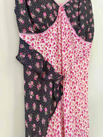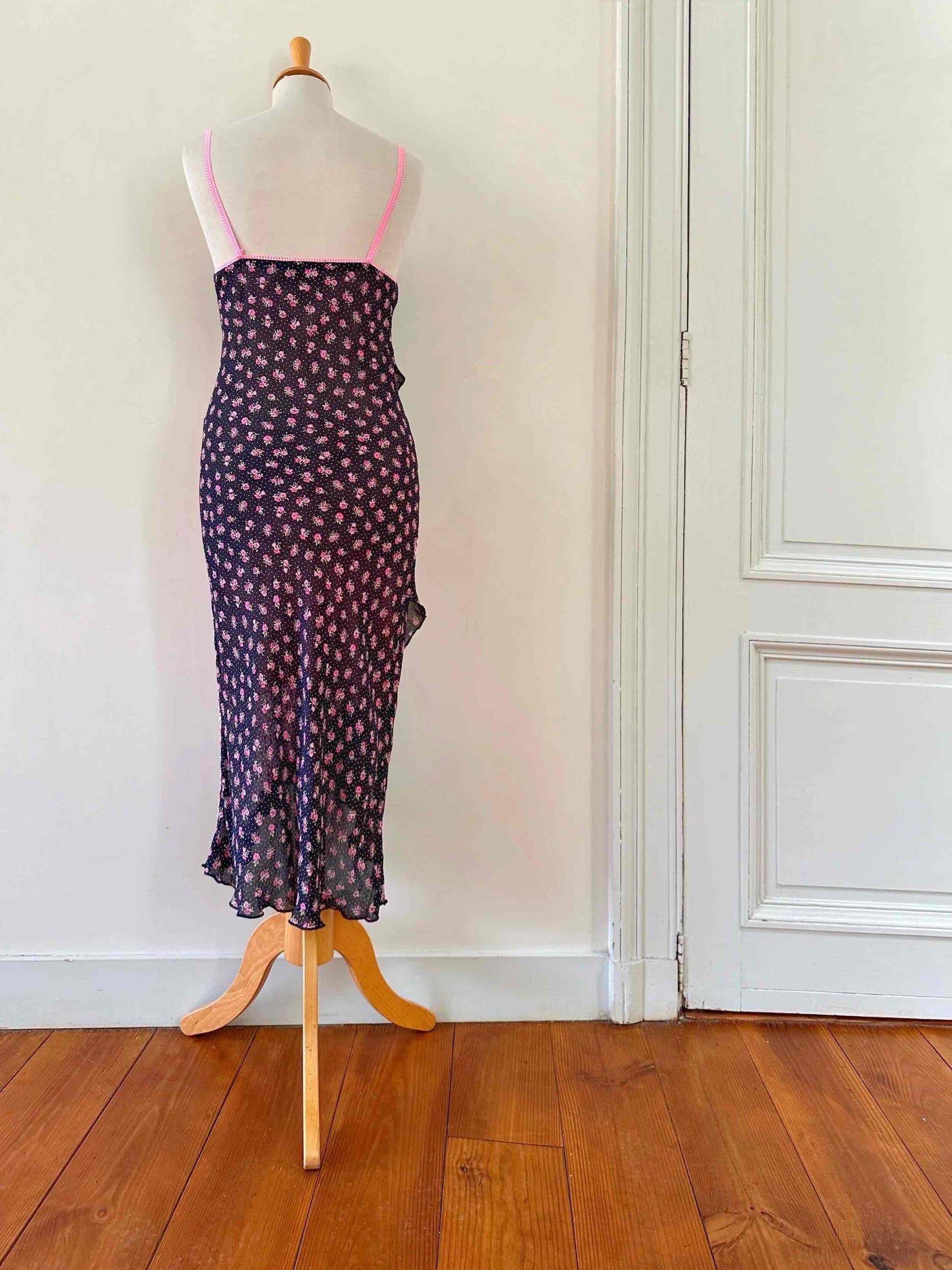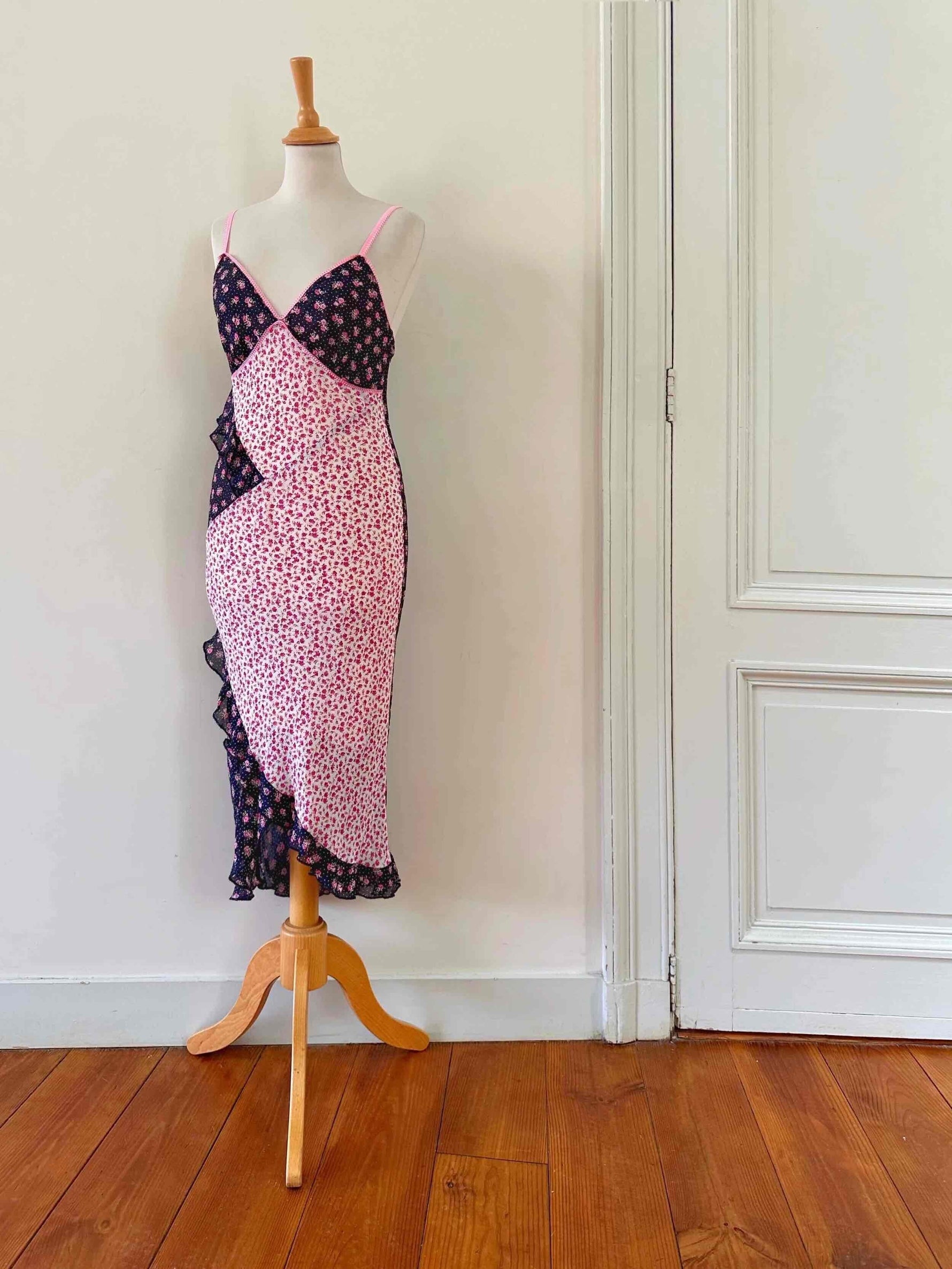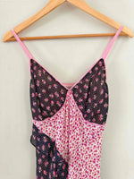 Prix unitaire parRobe nuisette à fleurs, en voile viscose doublée, imprimé patchwork de petites fleurs roses fond blanc et noir, bretelles spaghettis et poitrine en dentelle élastique rose, fabriquée en France, taille 36 portée ici sur un mannequin T36, aisselles 43 cm.
