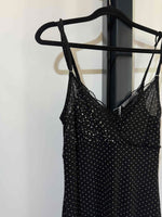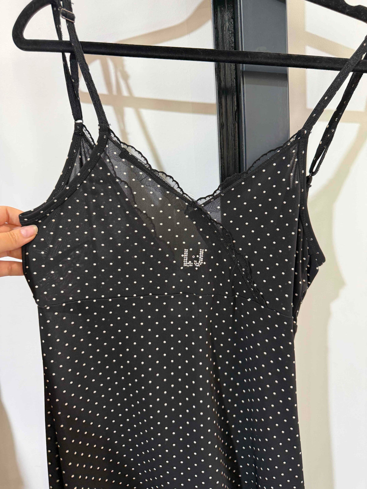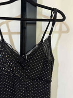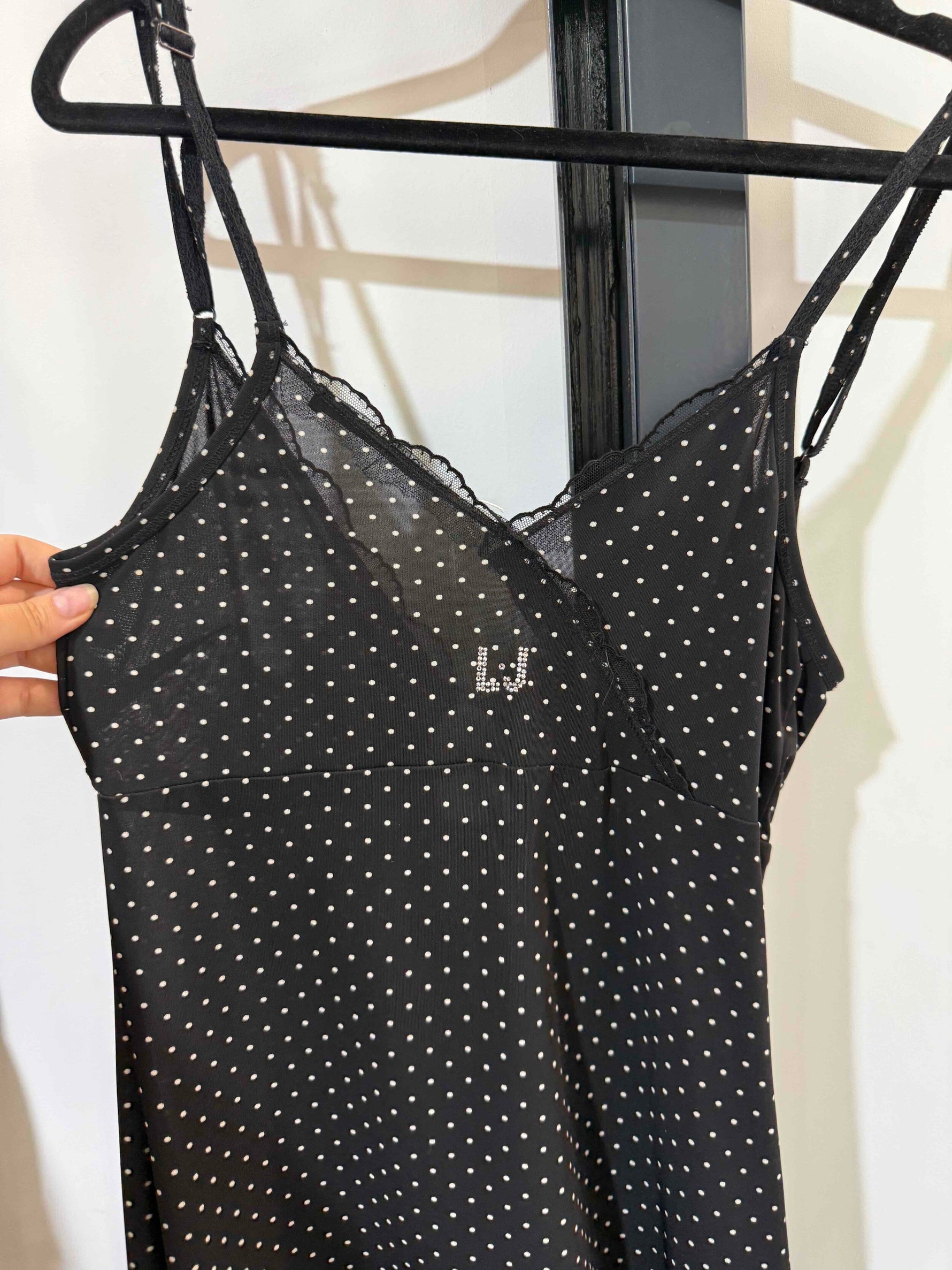 Robe midi noire à pois blanc de la marque Liu Jo, taille 38. Excellent état. Années 2000s matière strech. Détails en strass.