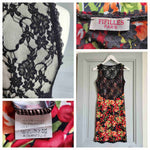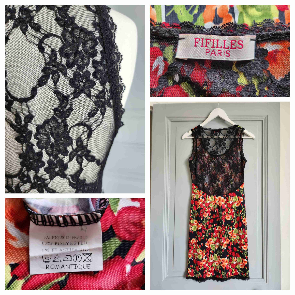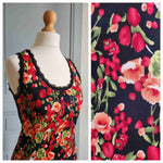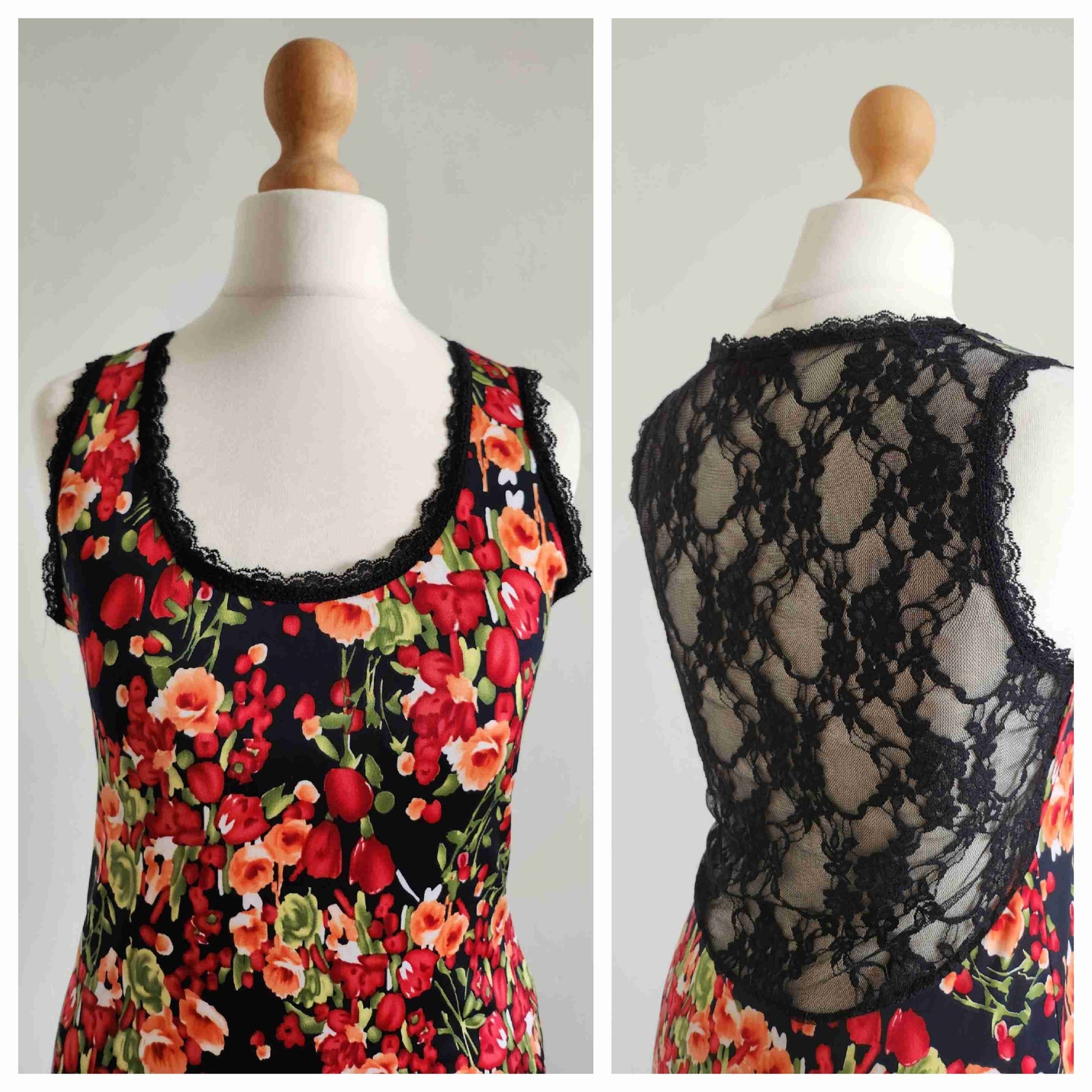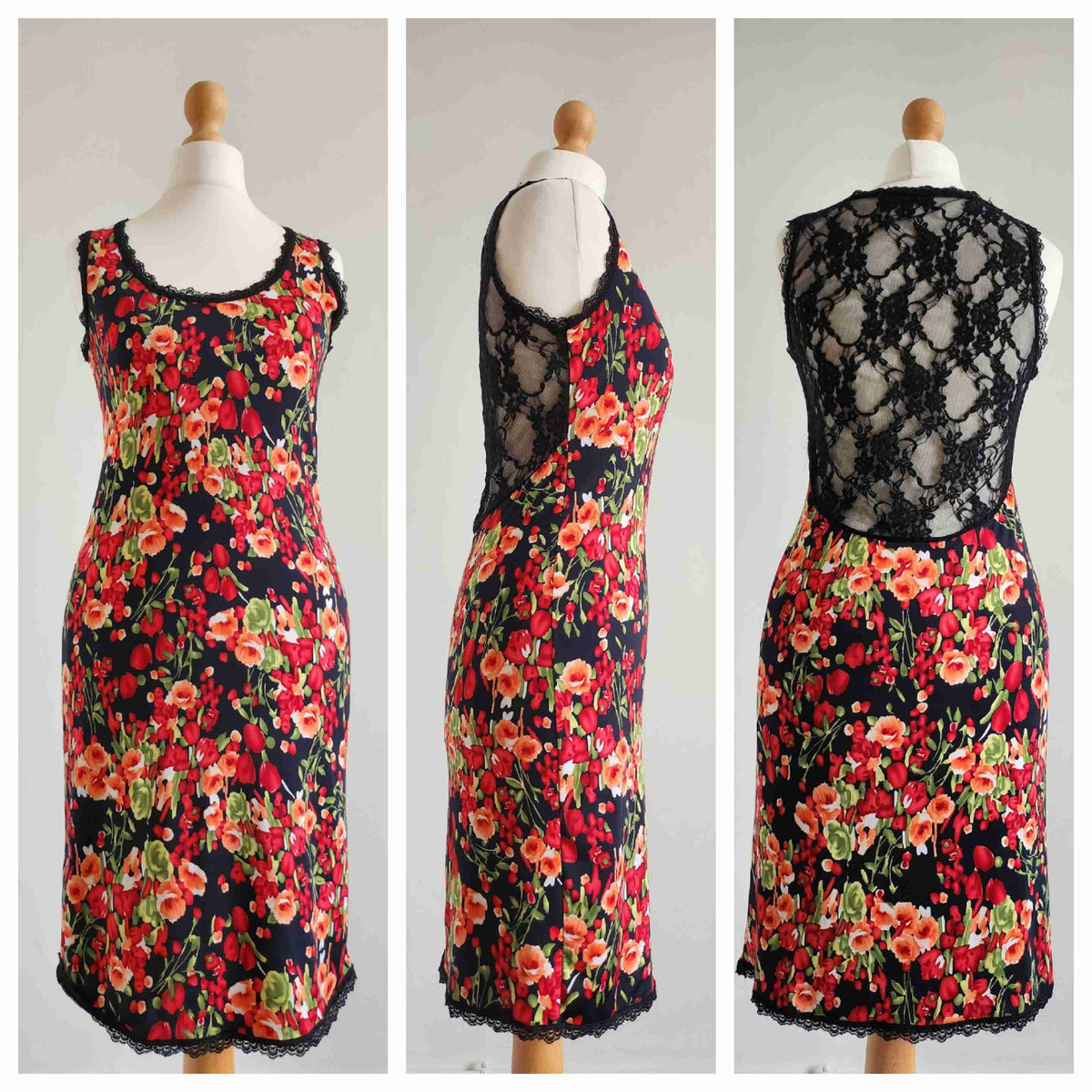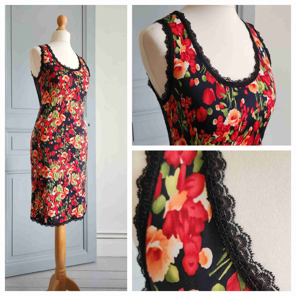 Prix unitaire parRobe nuisette à fleurs en tissu stretch imprimé rouge, corail et vert sur fond noir, finition et dos en dentelle noire. Fabriqué en France. Poitrine 38 cm.