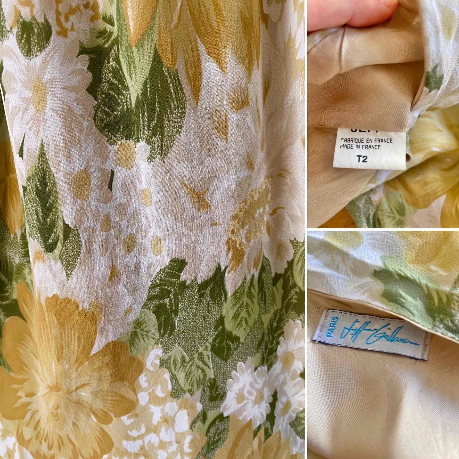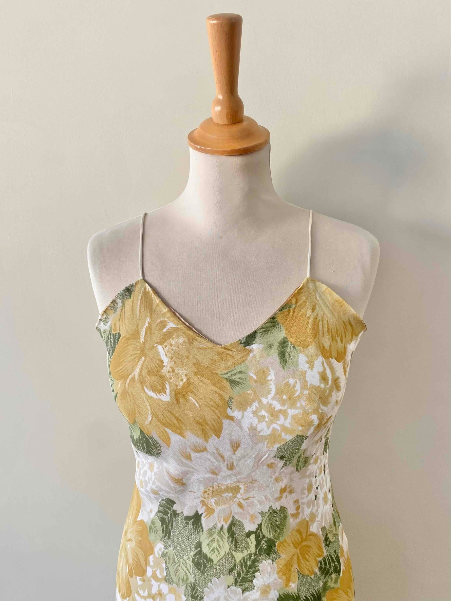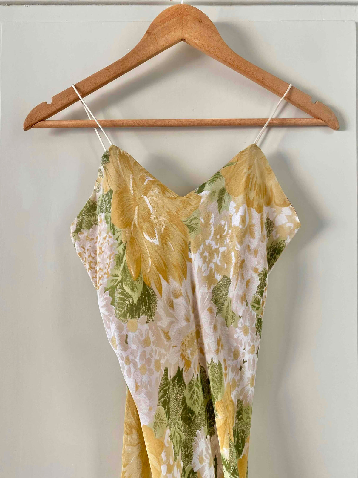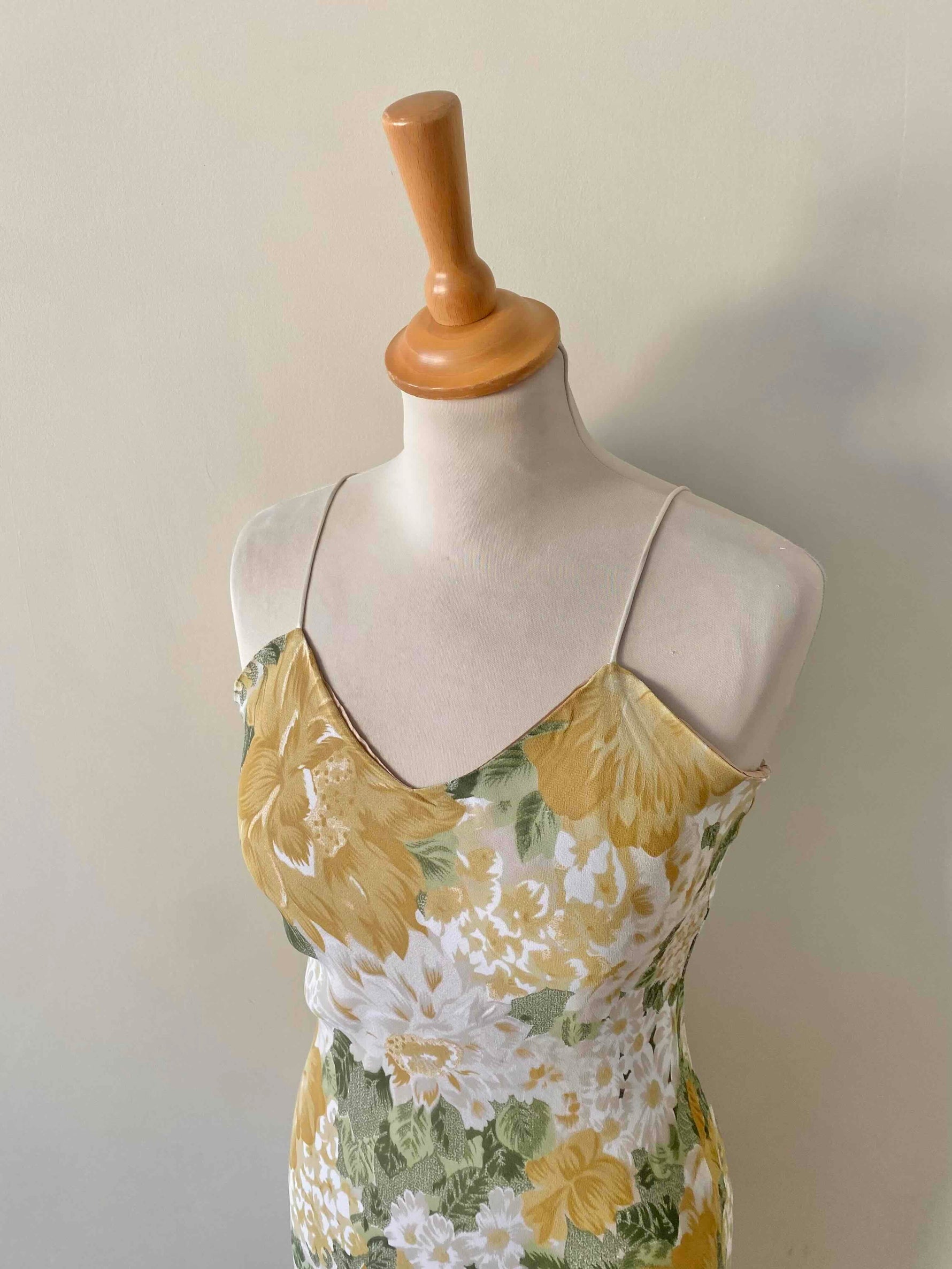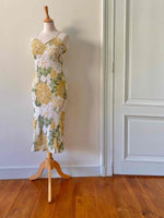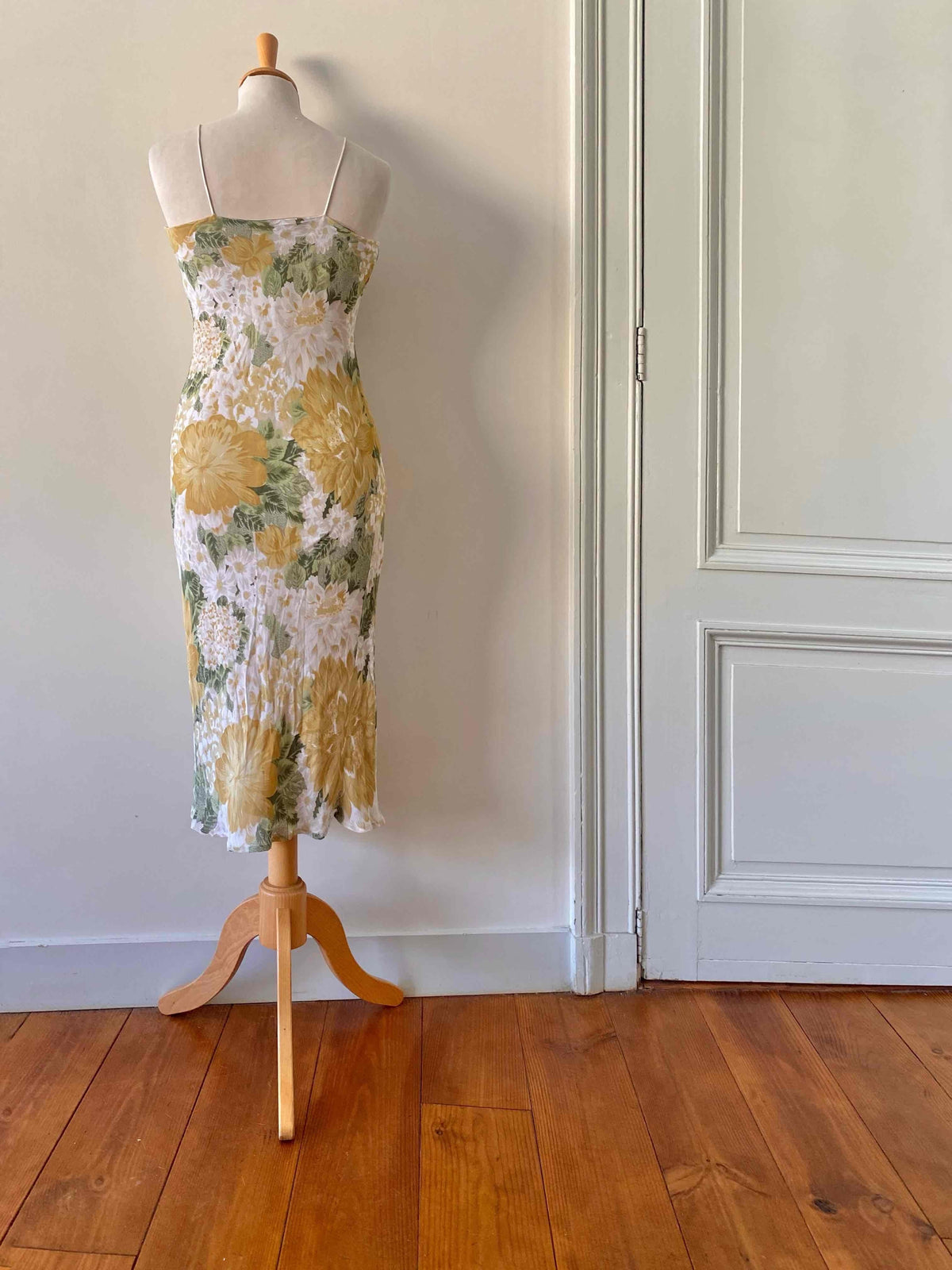 Prix unitaire parRobe nuisette à fleurs, en voile viscose blanche imprimée grande fleurs ocre, beiges et vertes, bretelles spaghettis satinées, longueur midi et forme fit and flare en biais, fabriquée en France, taille 34 et 36 portée ici sur un mannequin T36, aisselles 42cm.