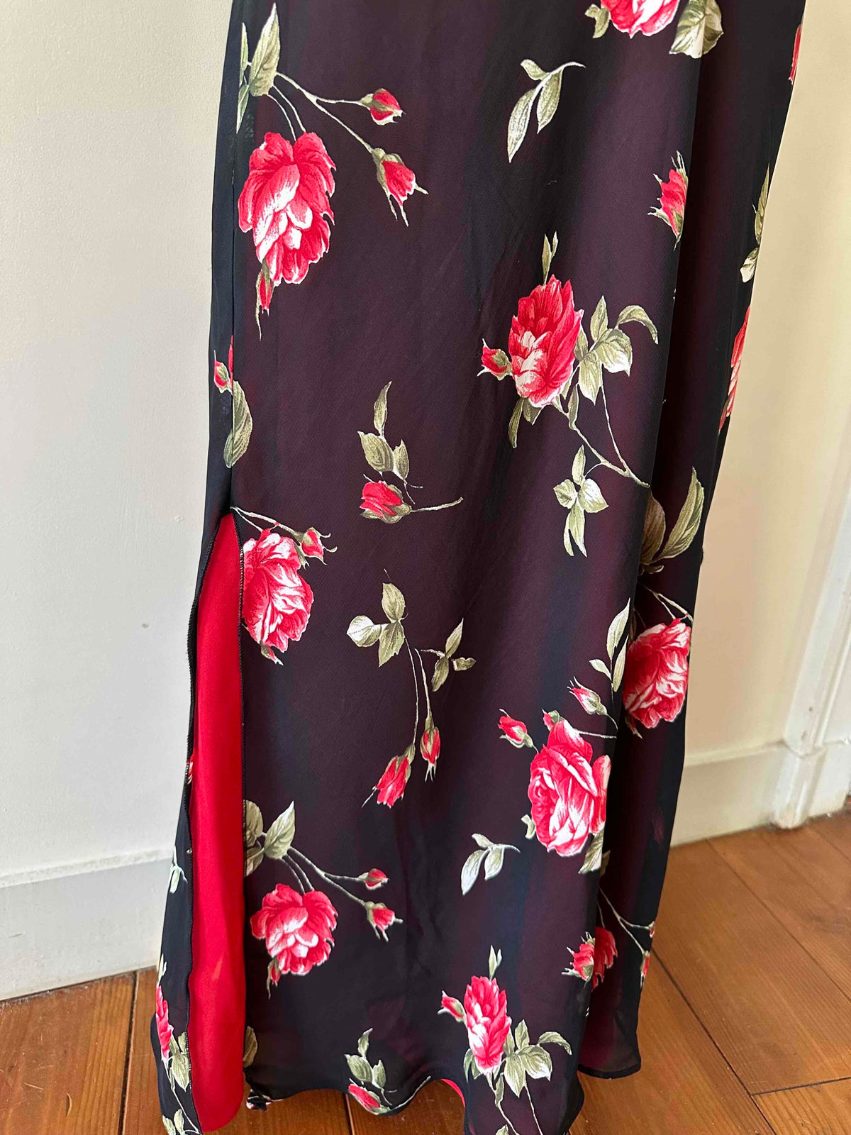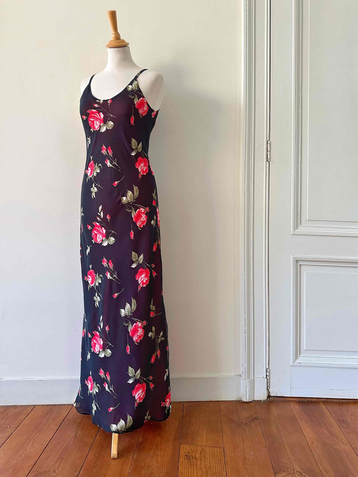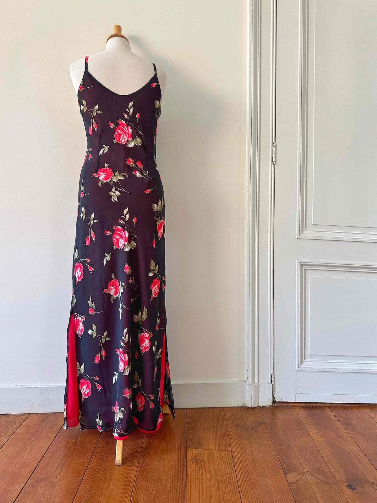 Robe nuisette à fleurs, en voile viscose noir doublé rouge imprimé roses rouges et vertes, bretelles spaghettis, encolure en V, longueur maxi, fentes côtés, taillée en biais, fabriquée en Italie, taille 36 portée ici sur un mannequin T36, aisselles 43cm.