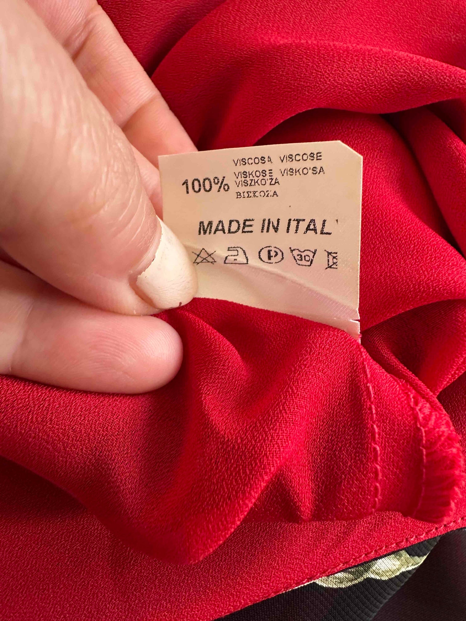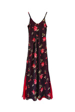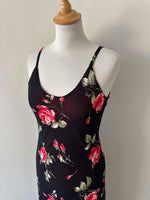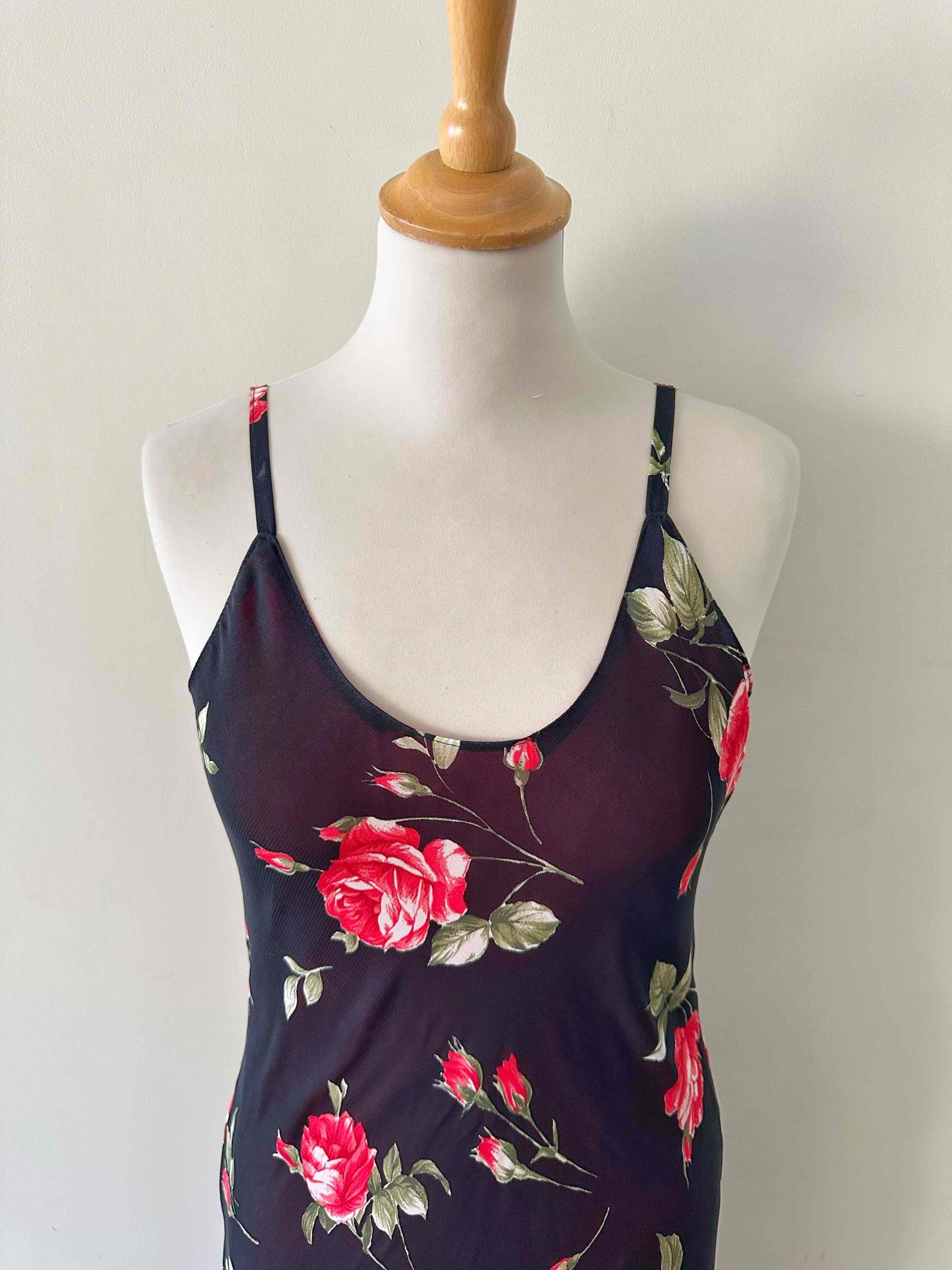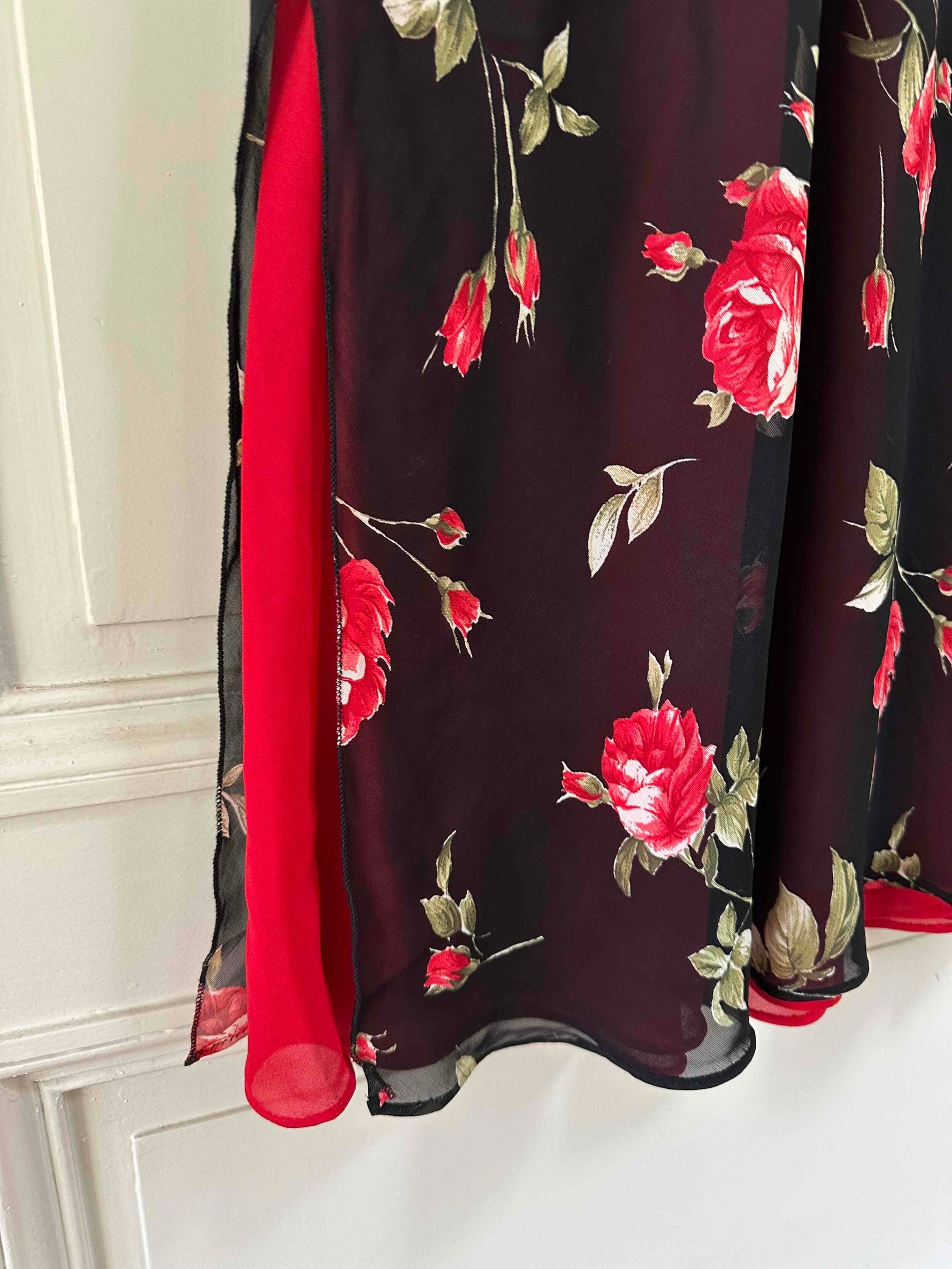 Robe nuisette à fleurs, en voile viscose noir doublé rouge imprimé roses rouges et vertes, bretelles spaghettis, encolure en V, longueur maxi, fentes côtés, taillée en biais, fabriquée en Italie, taille 36 portée ici sur un mannequin T36, aisselles 43cm.