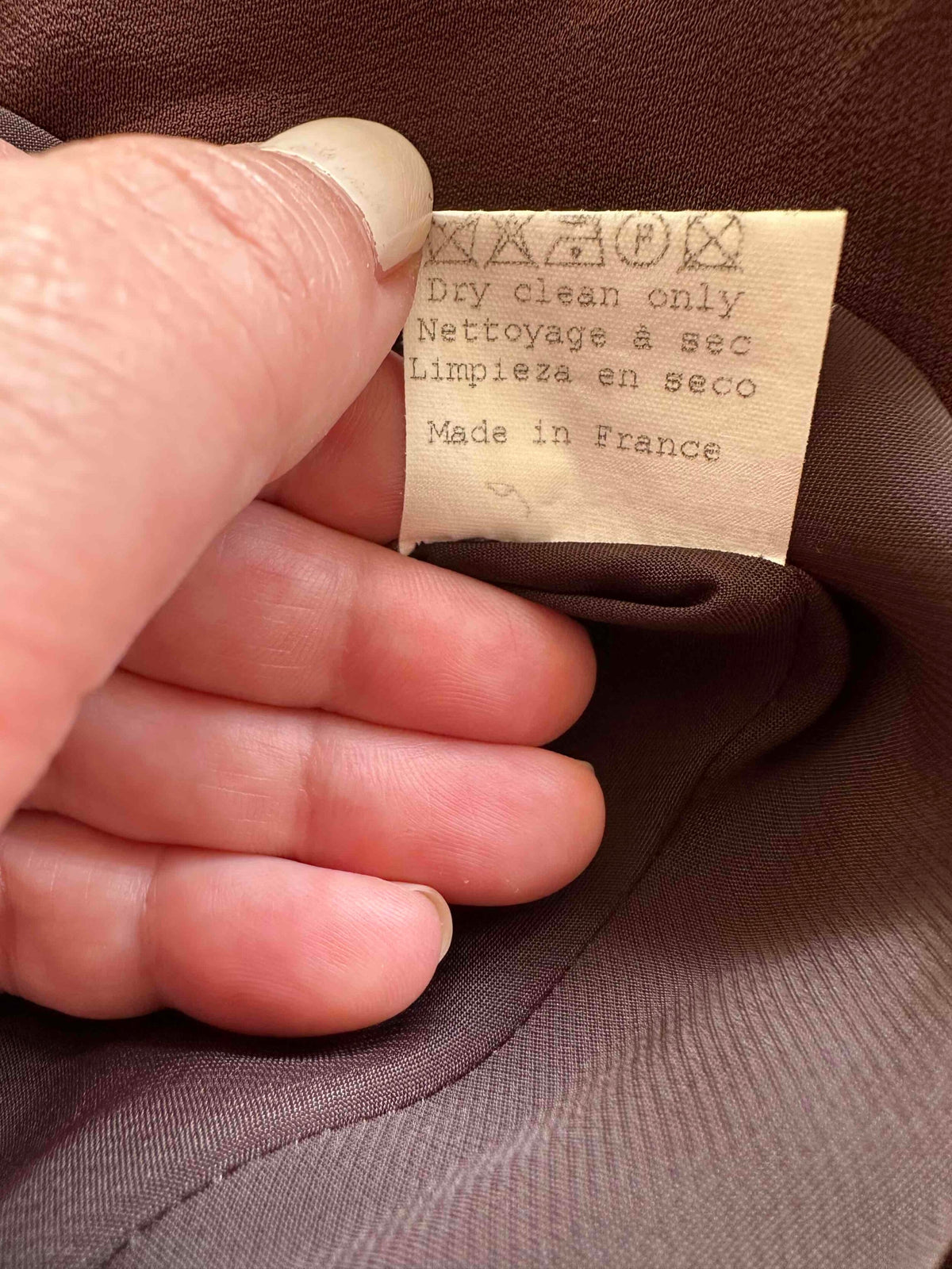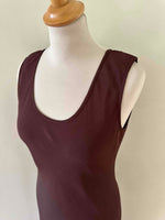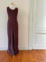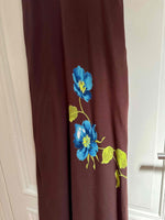 Robe nuisette à fleurs, en voile viscose chocolat, motif fleur placé bleues et vertes, longueur maxi, taillée en biais, fabriquée en France, taille 36 portée ici sur un mannequin 136, aisselles 44cm.