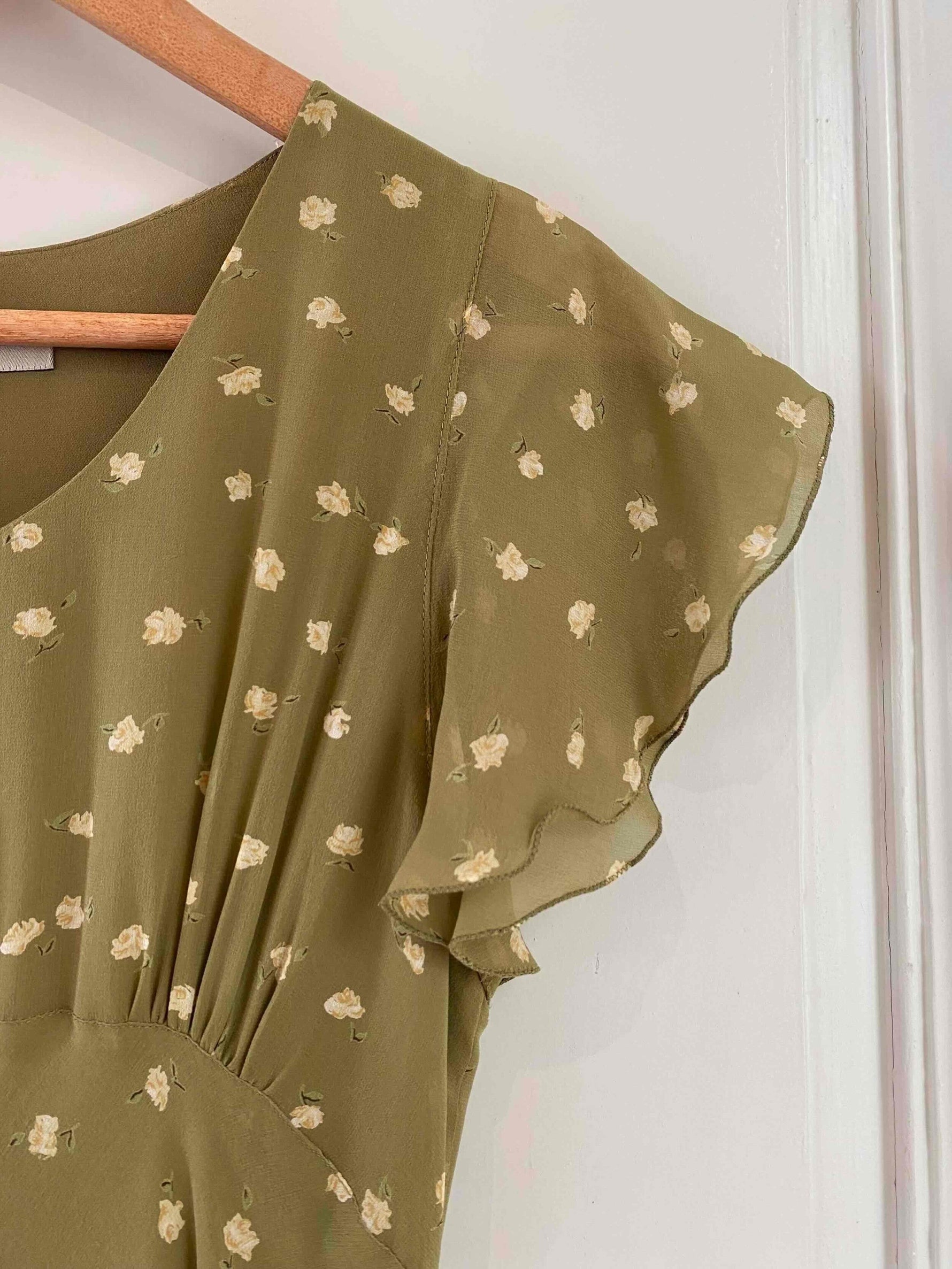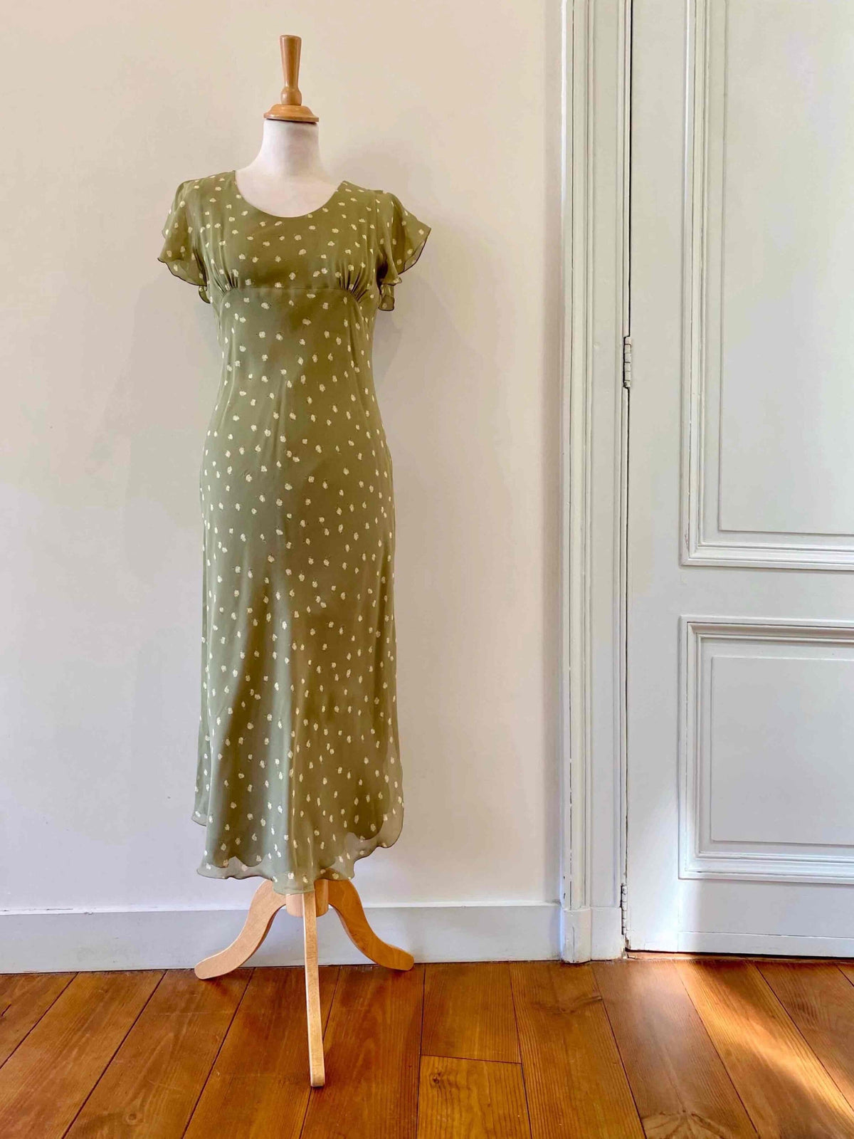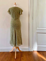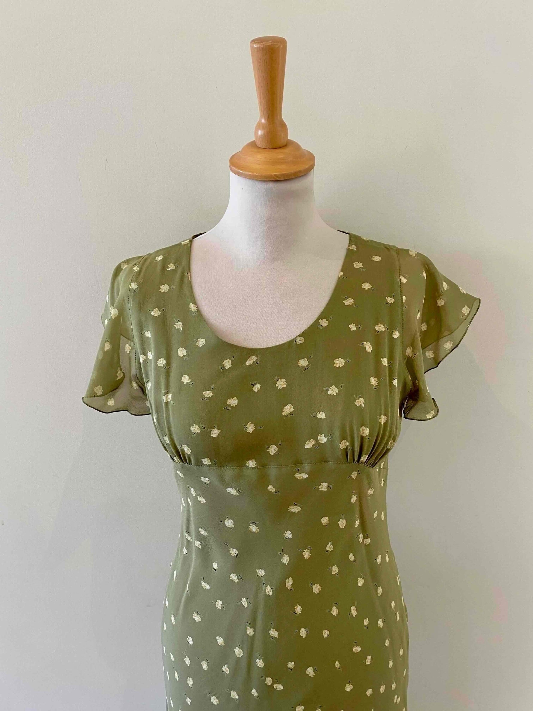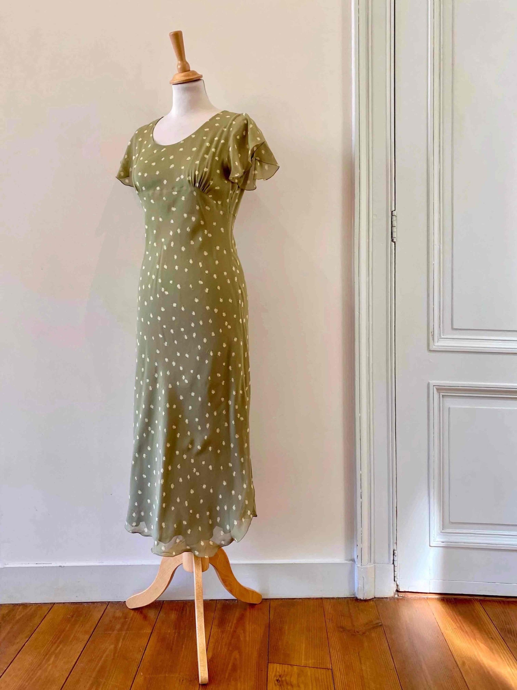 Prix unitaire parRobe nuisette en soie fleurie, mousseline de soie vert olive pastel doublée en soie, imprimée petites fleurs jaunes, découpes froncées sous poitrine col V, manches volantées, longueur midi et forme fit and flare en biais, fabriquée en Italie, taille 34 et 36 portée ici sur un mannequin T36, aisselles 43cm.