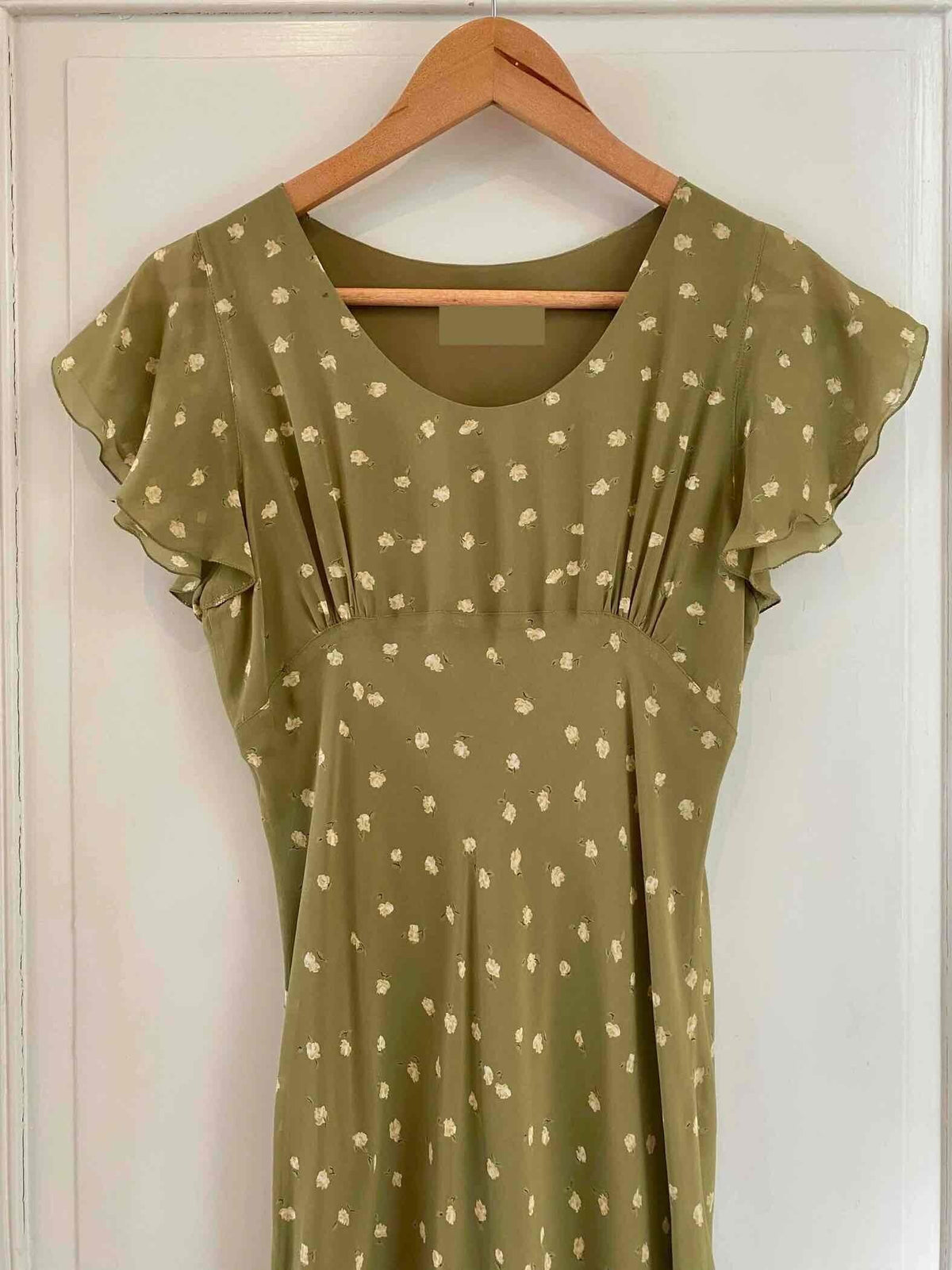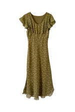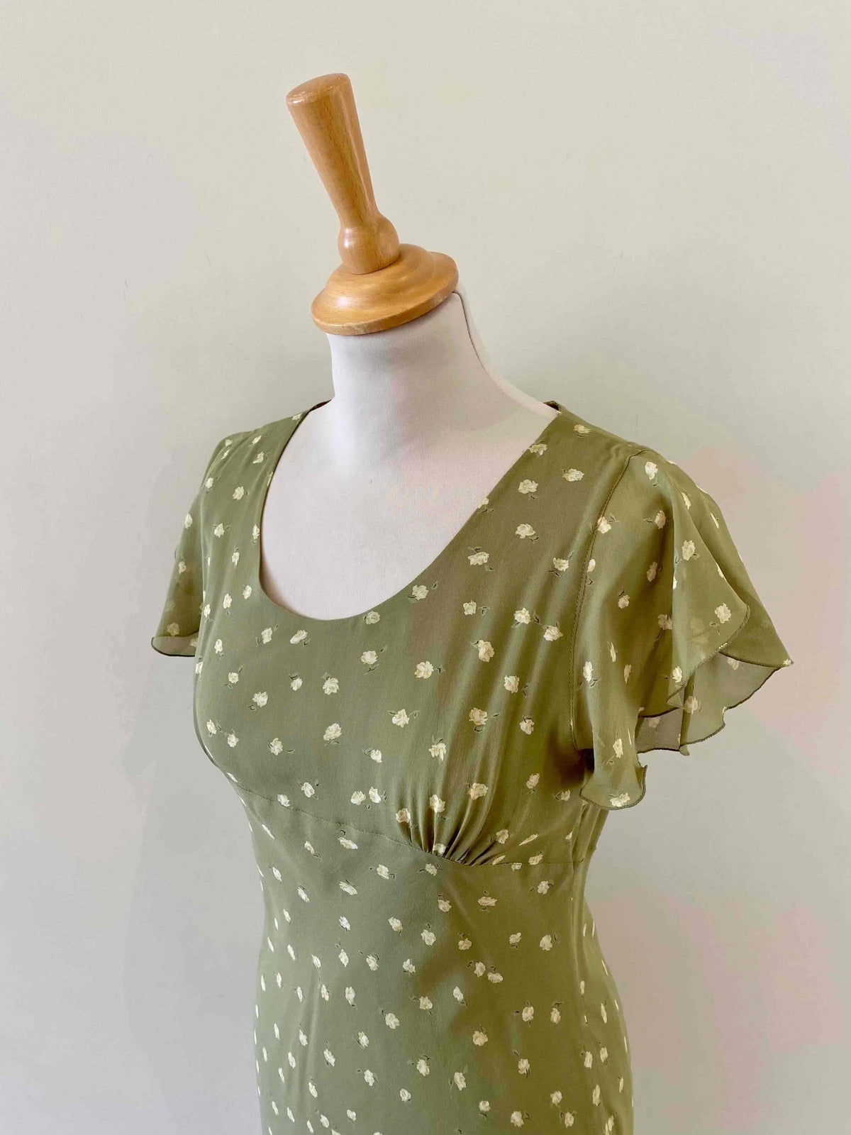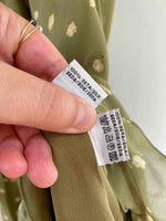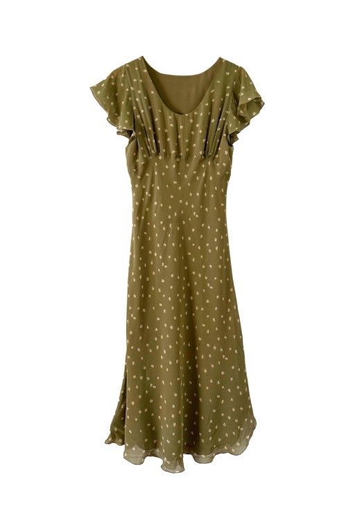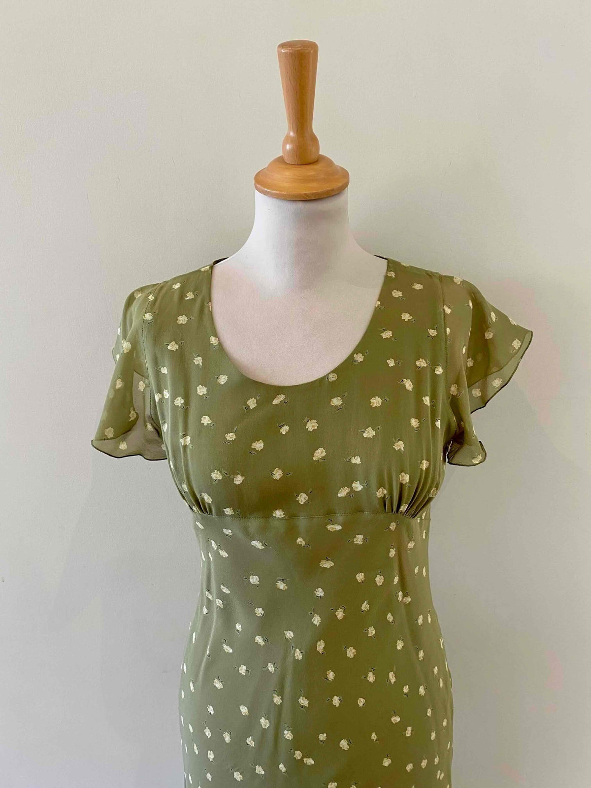 Prix unitaire parRobe nuisette en soie fleurie, mousseline de soie vert olive pastel doublée en soie, imprimée petites fleurs jaunes, découpes froncées sous poitrine col V, manches volantées, longueur midi et forme fit and flare en biais, fabriquée en Italie, taille 34 et 36 portée ici sur un mannequin T36, aisselles 43cm.