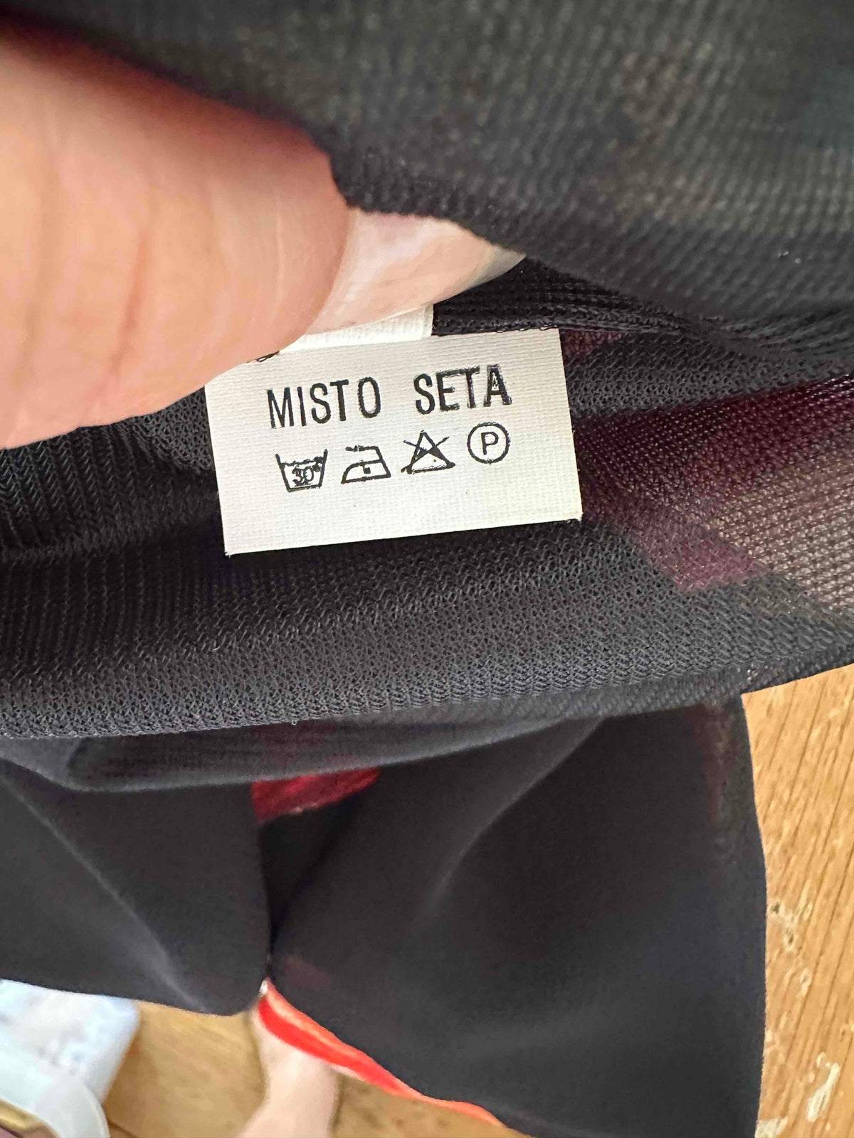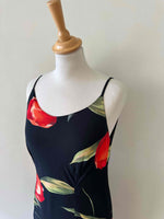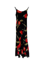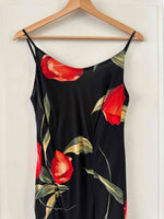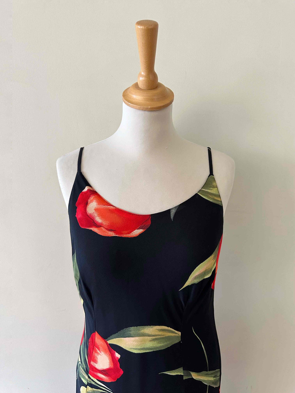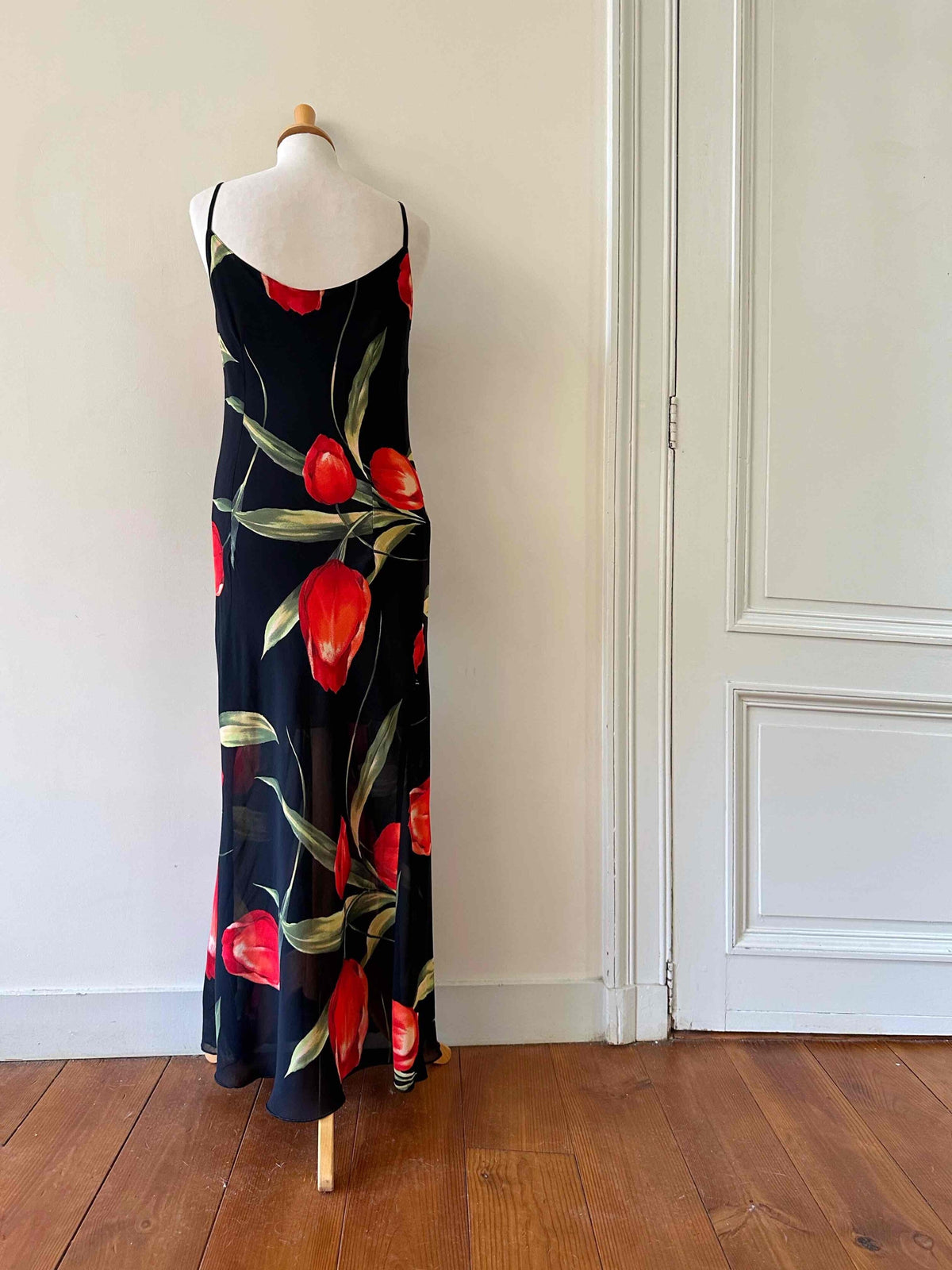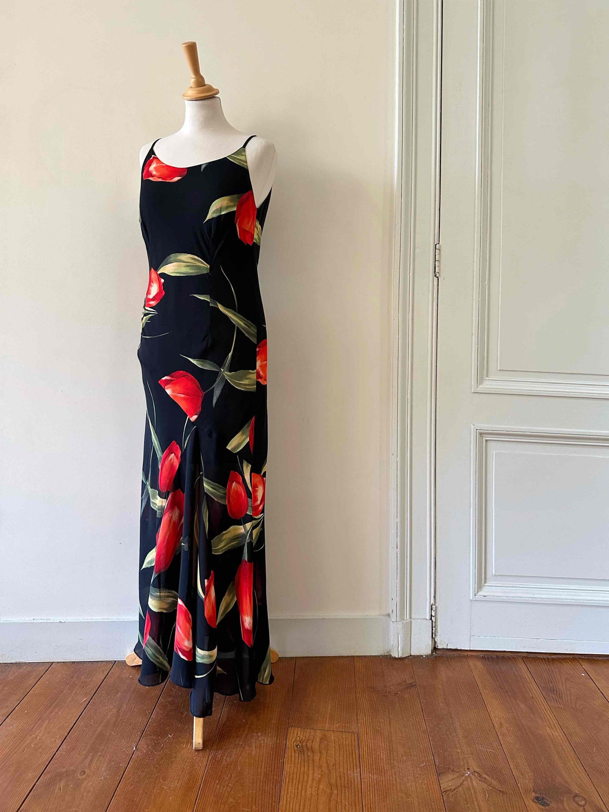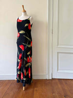 Prix unitaire parRobe nuisette à fleurs, en soie mélangée, noire motifs grandes fleurs de tulipes rouges et vertes, bretelles spaghettis, fabriquée en Italie, taille 36 portée ici sur un mannequin T36, aisselles 43cm.