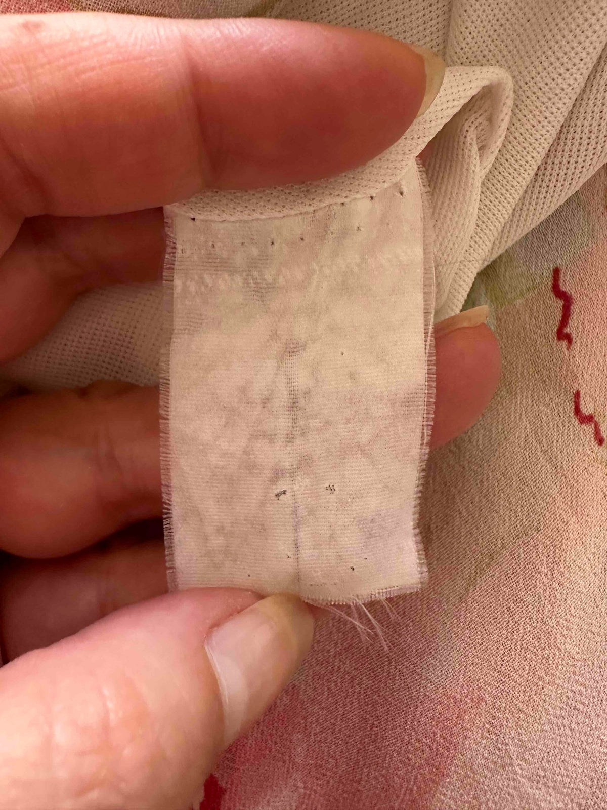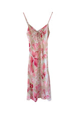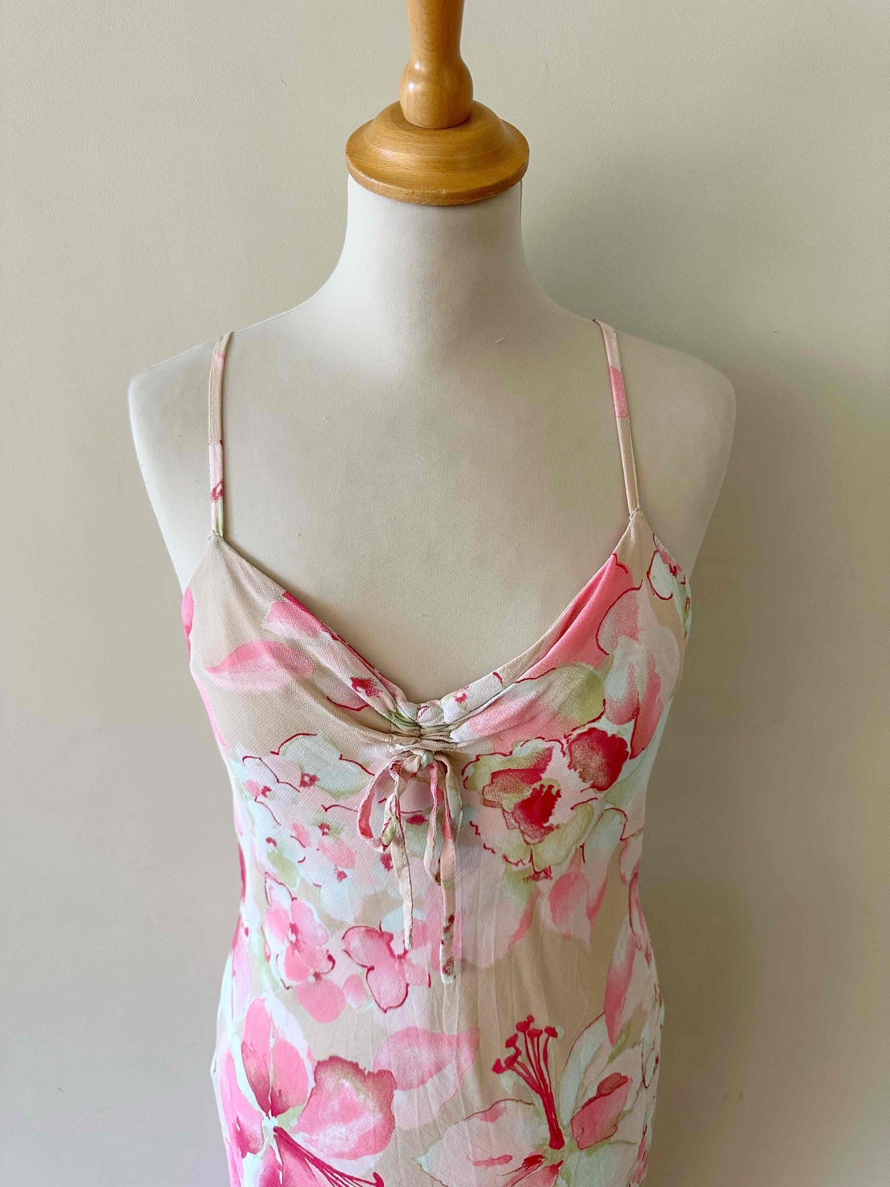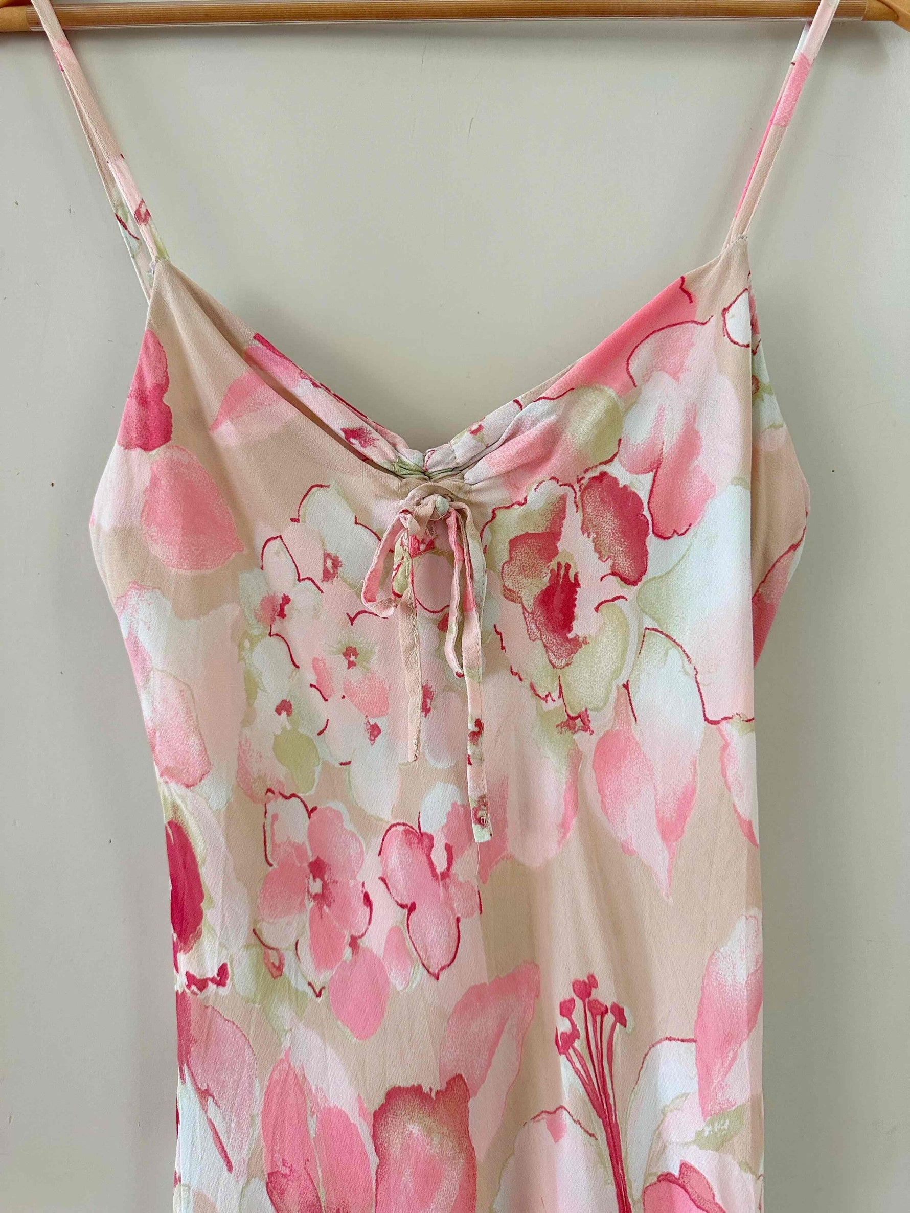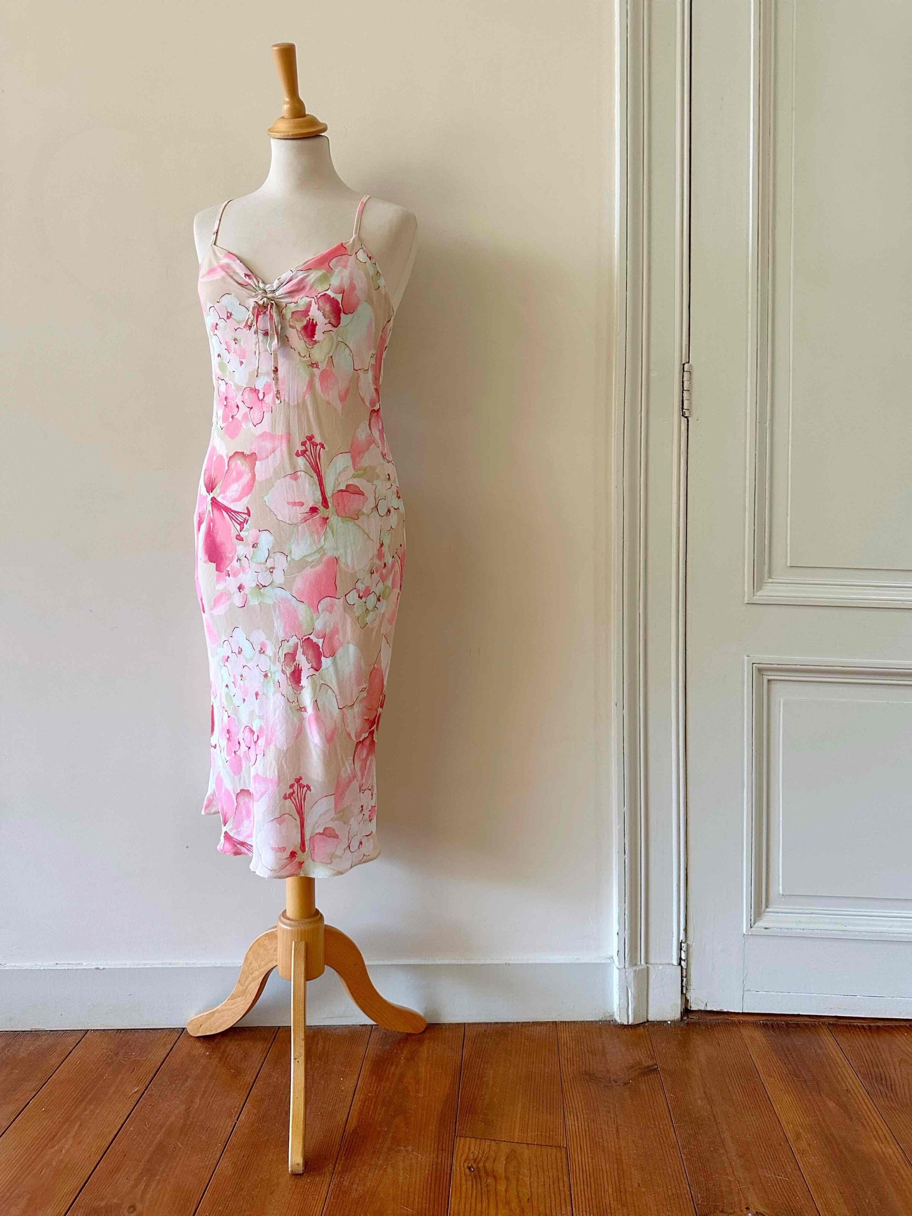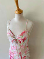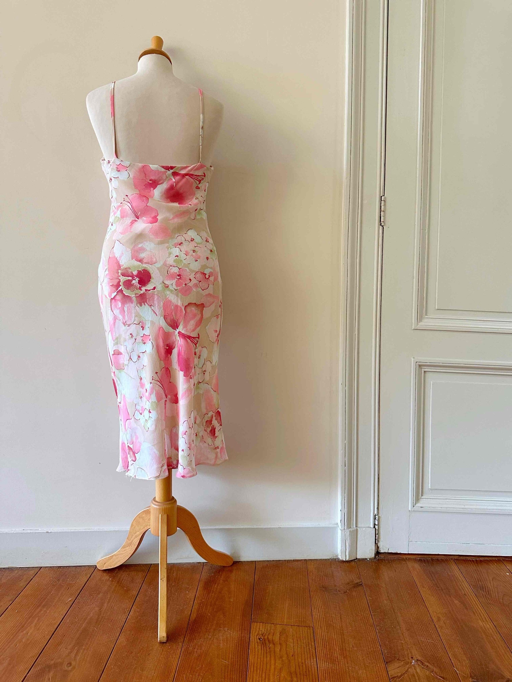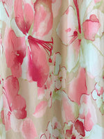Prix unitaire parRobe nuisette à fleurs, en voile viscose blanc motifs fleurs aquarelles roses pastel, fuchsia et vertes pastel, poitrine froncée à nouer, bretelles spaghettis, taillée en biais, fabriquée en France, taille 36 portée ici sur un mannequin T36, aisselles 43cm.
