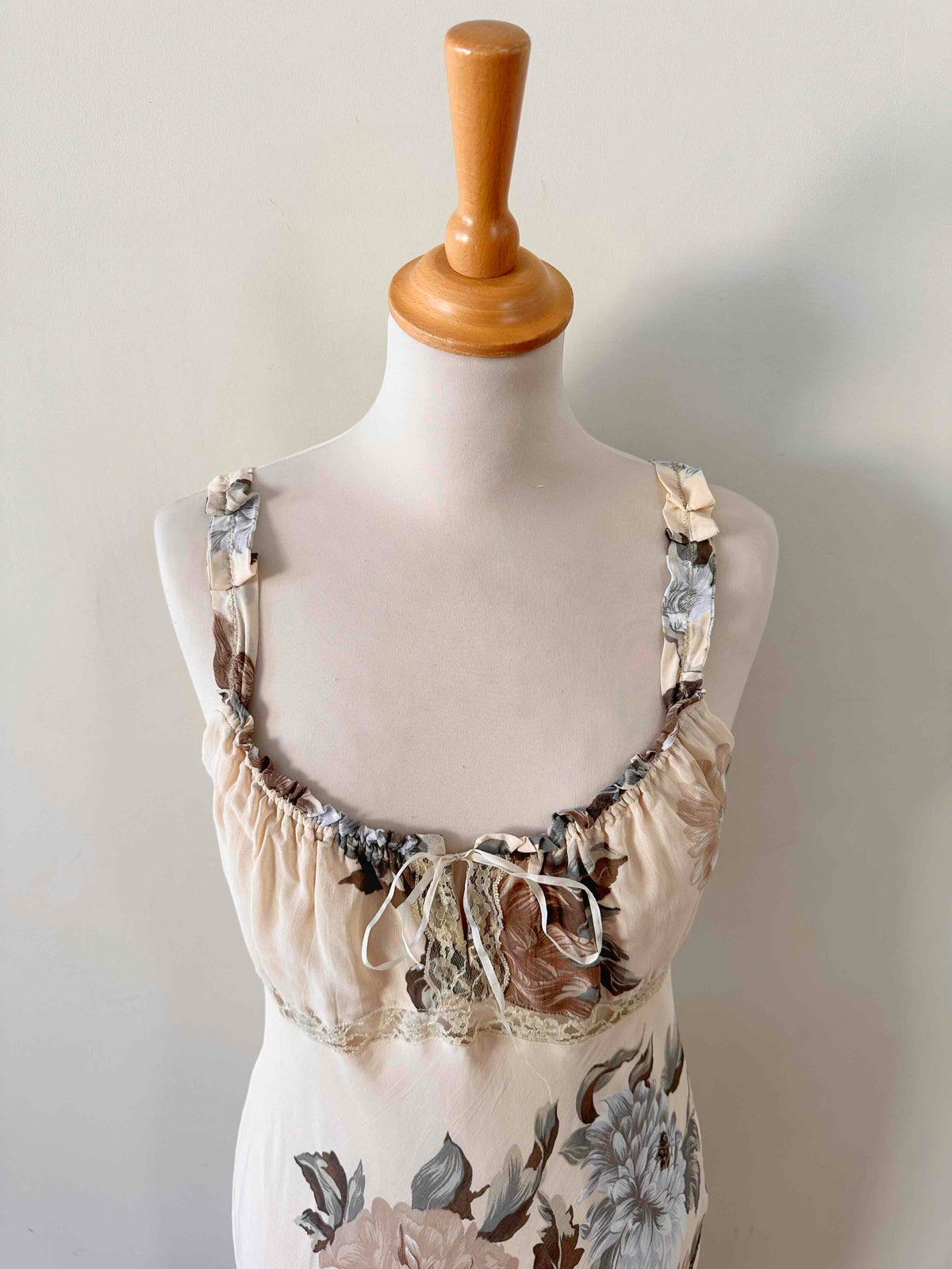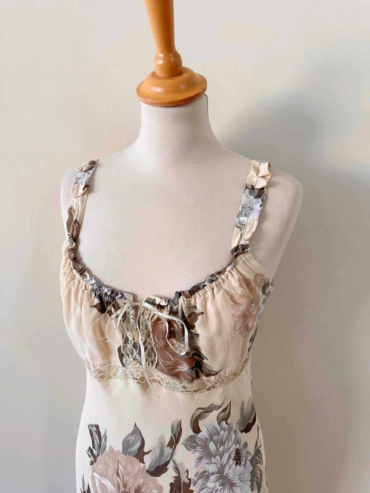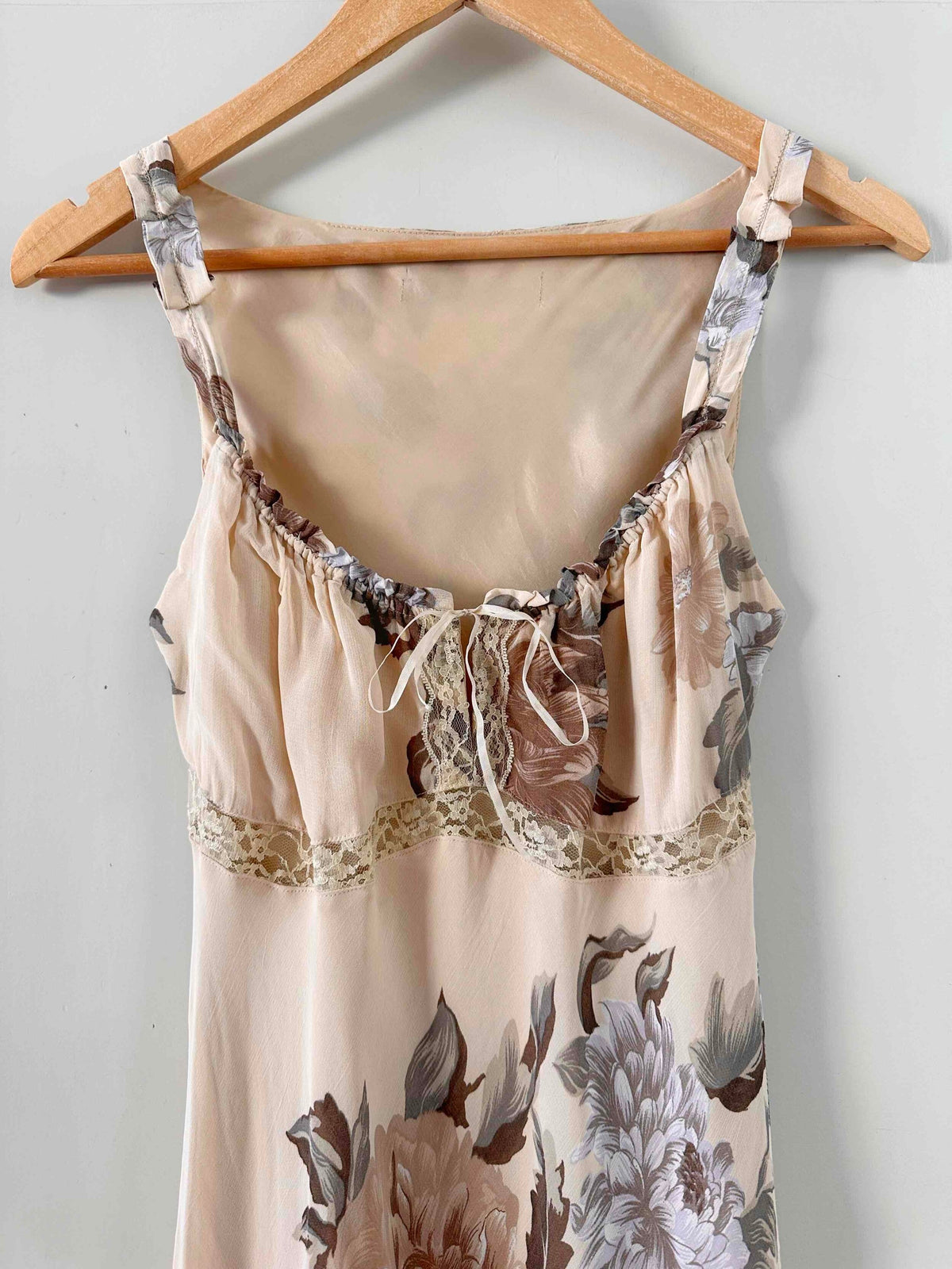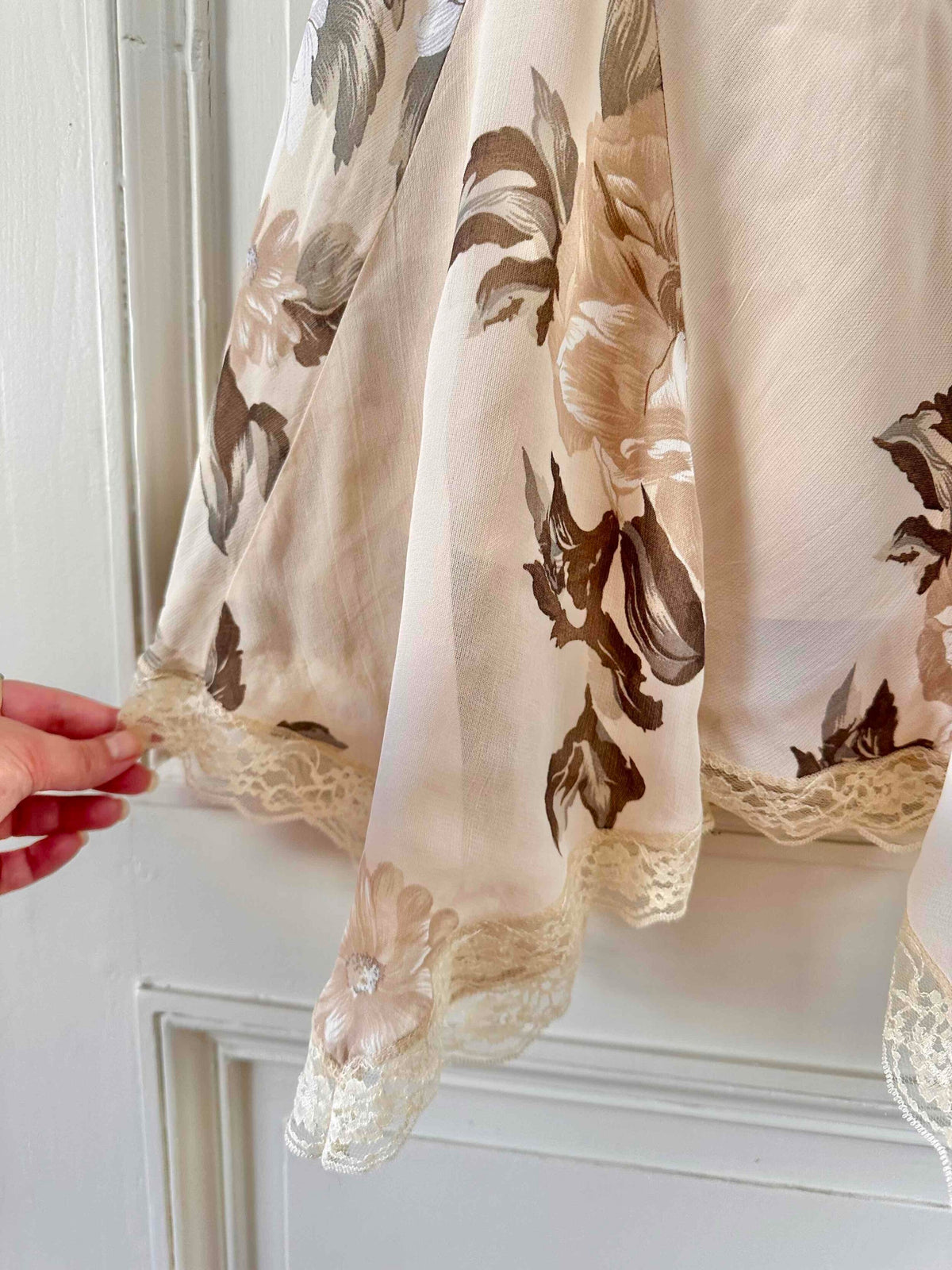 Robe nuisette à fleurs, en voile viscose beige rosé imprimée motifs grandes fleurs camel, marrons glacé, encolure corsage, poitrine froncée à nouer, dentelle en bas et sous poitrine, taillée en biais, forme fairydress, fabriquée en France, taille 36 portée ici sur un mannequin T36, aisselles 43cm.