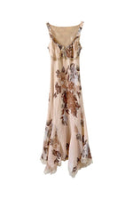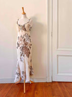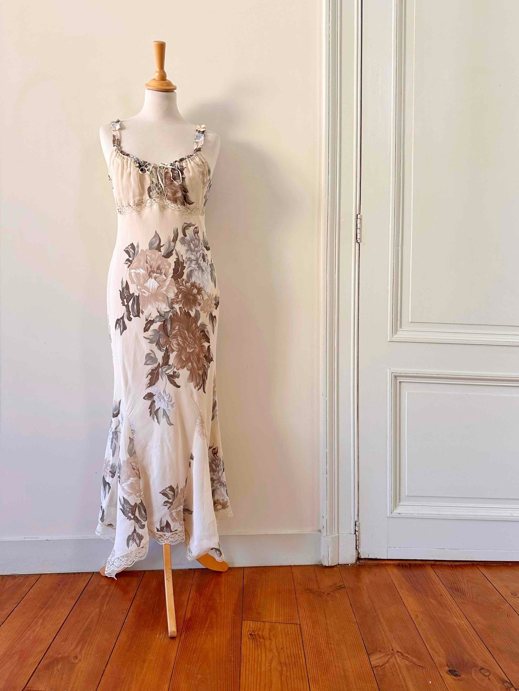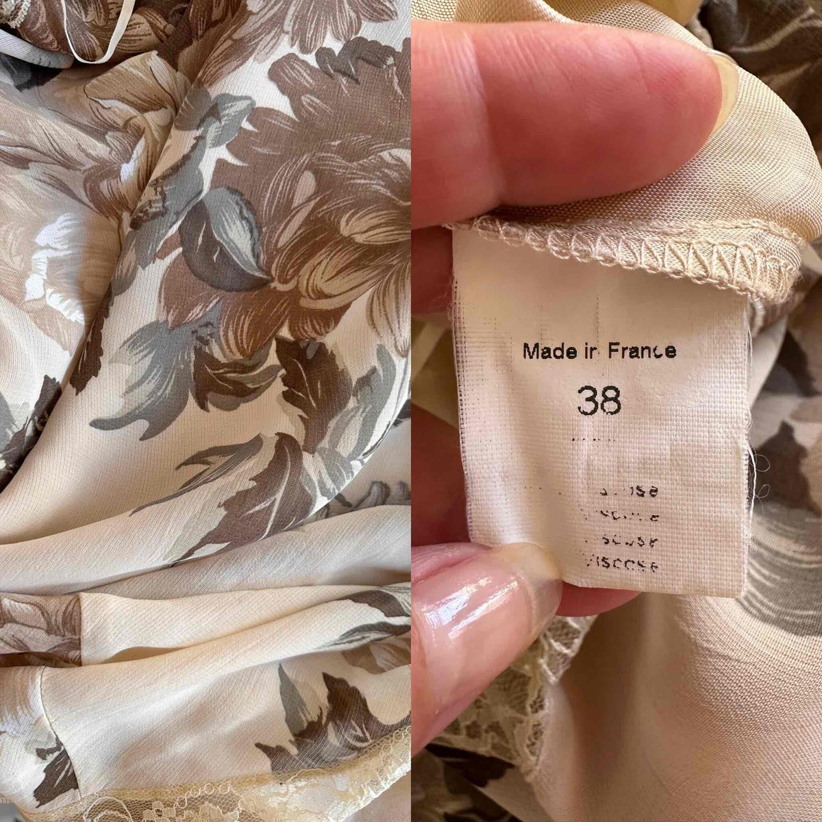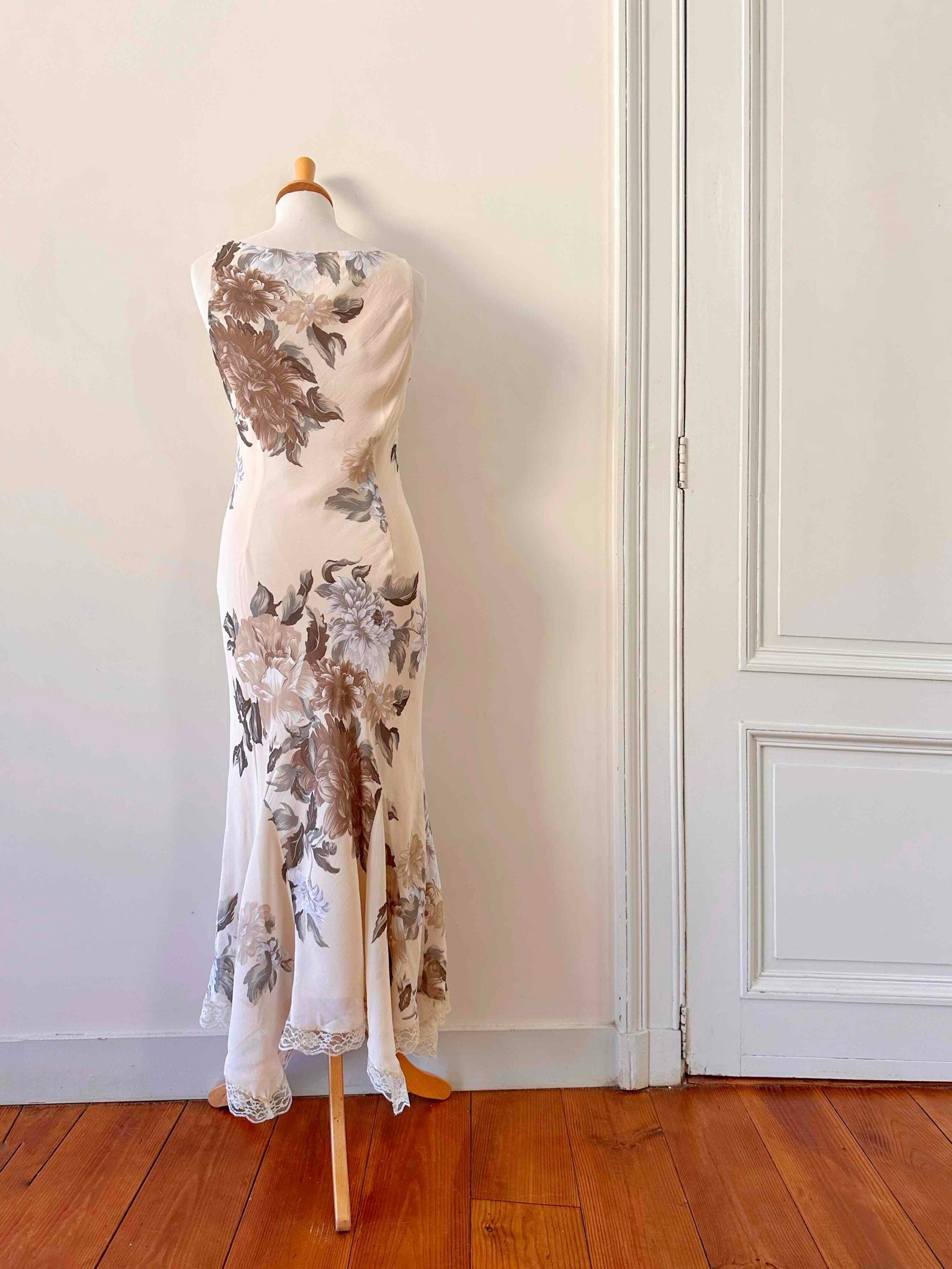 Robe nuisette à fleurs, en voile viscose beige rosé imprimée motifs grandes fleurs camel, marrons glacé, encolure corsage, poitrine froncée à nouer, dentelle en bas et sous poitrine, taillée en biais, forme fairydress, fabriquée en France, taille 36 portée ici sur un mannequin T36, aisselles 43cm.