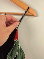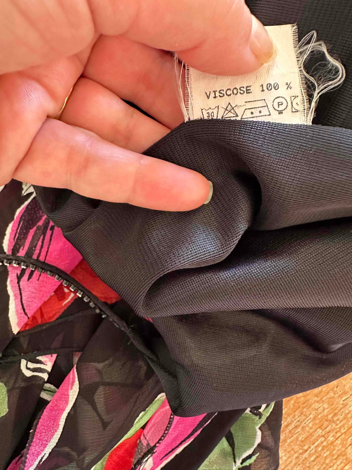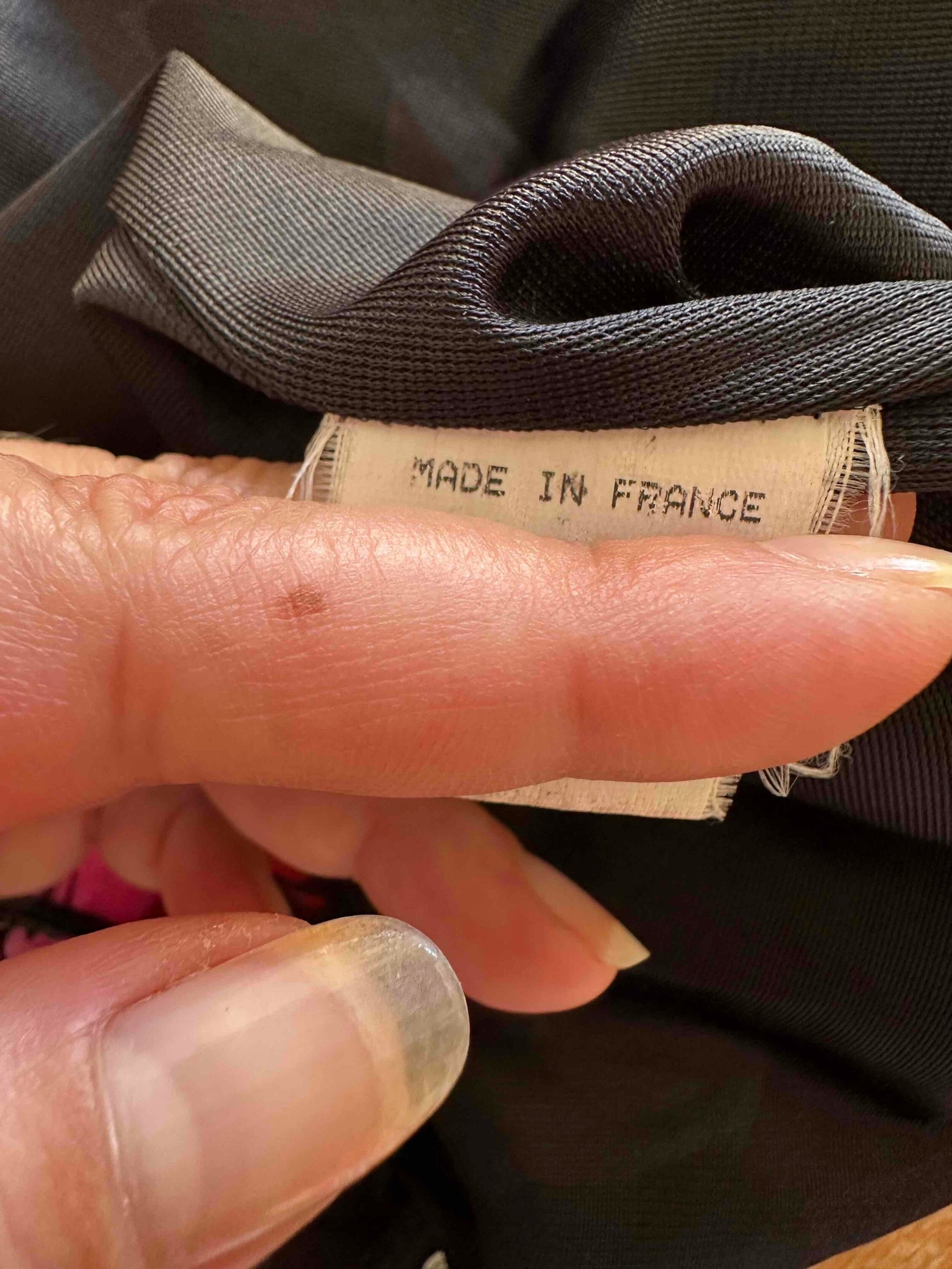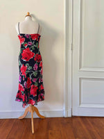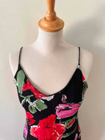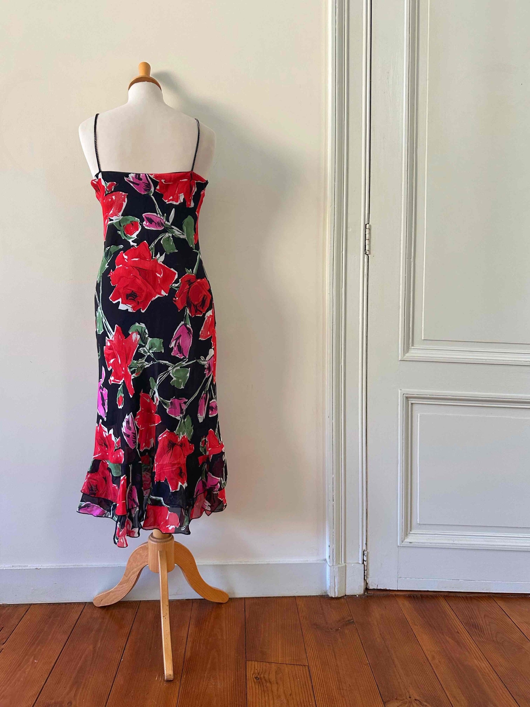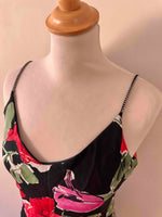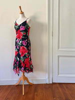 Prix unitaire parRobe nuisette à fleurs, en voile viscose noir imprimé motifs fleurs rouges, roses fuchsia et vertes, bretelles spaghettis à strass, taillée en biais, longueur asymétrique, fabriquée en France, taille 36 portée ici sur un mannequin T36, aisselles 43cm.