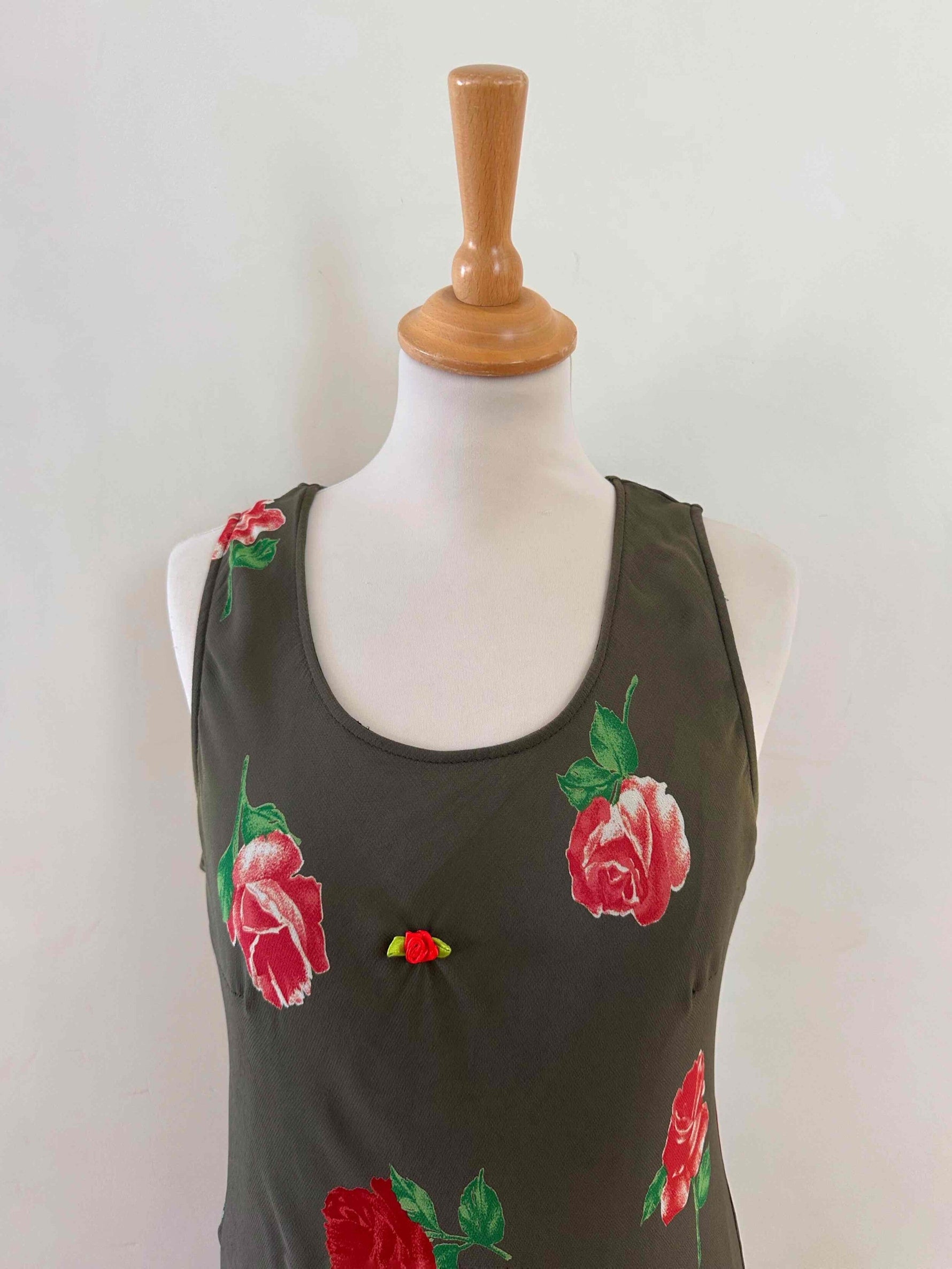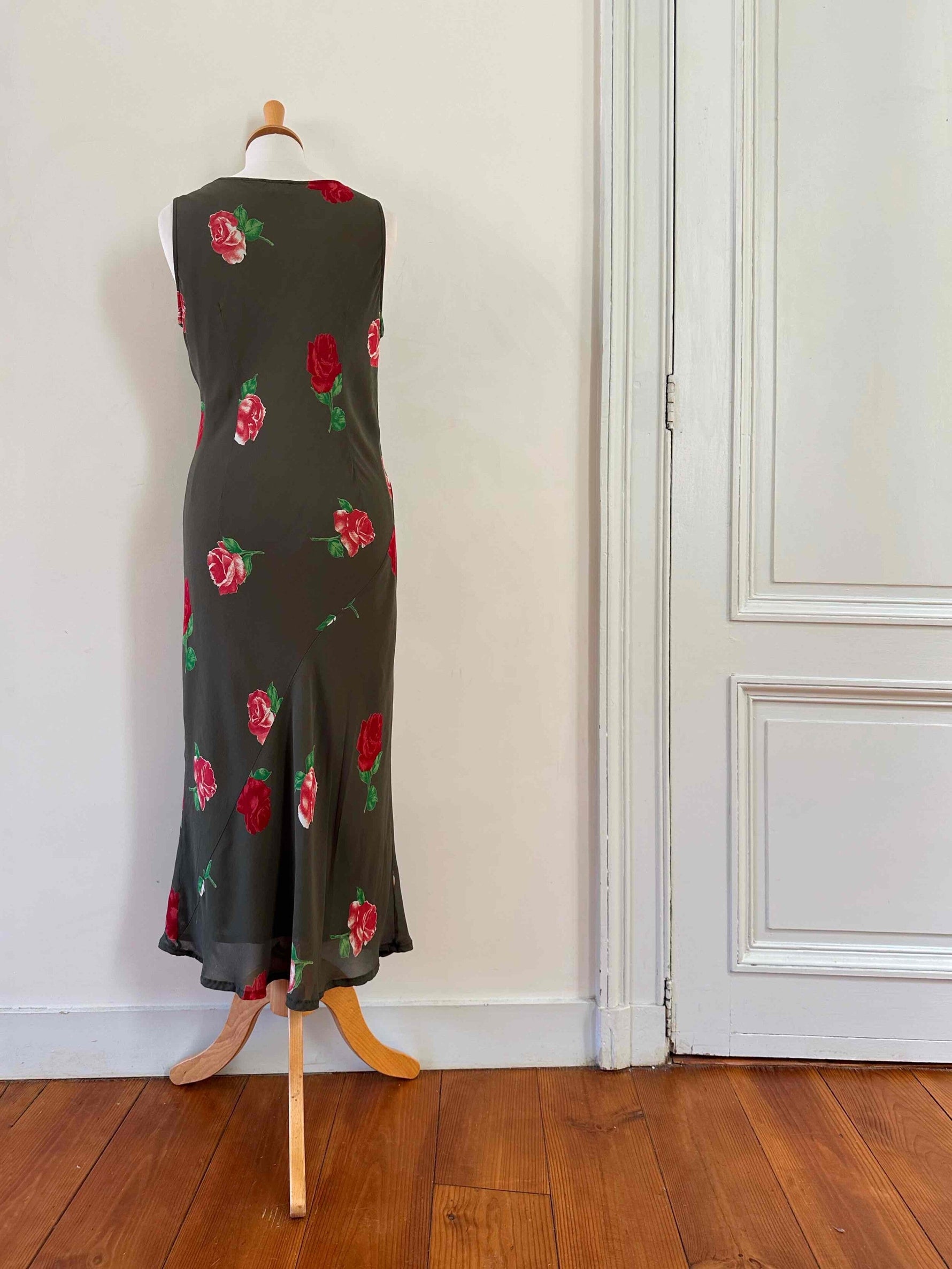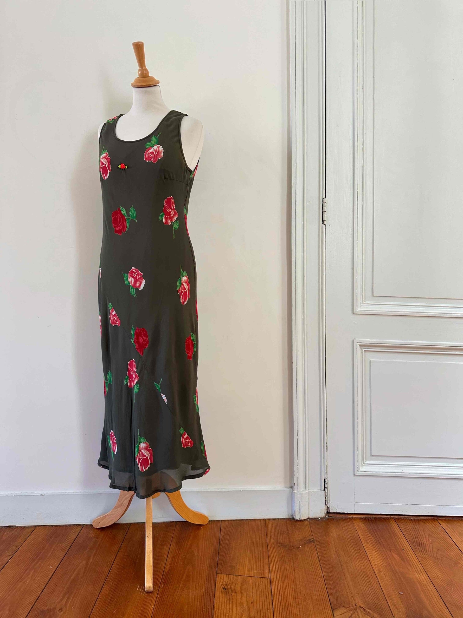 Robe nuisette à fleurs, en voile viscose vert olive foncé imprimé motifs roses rouges et vertes, petite rose ruban brodée, taillée en biais, fabriquée en Italie, taille 36 portée ici sur un mannequin T36, aisselles 44cm.