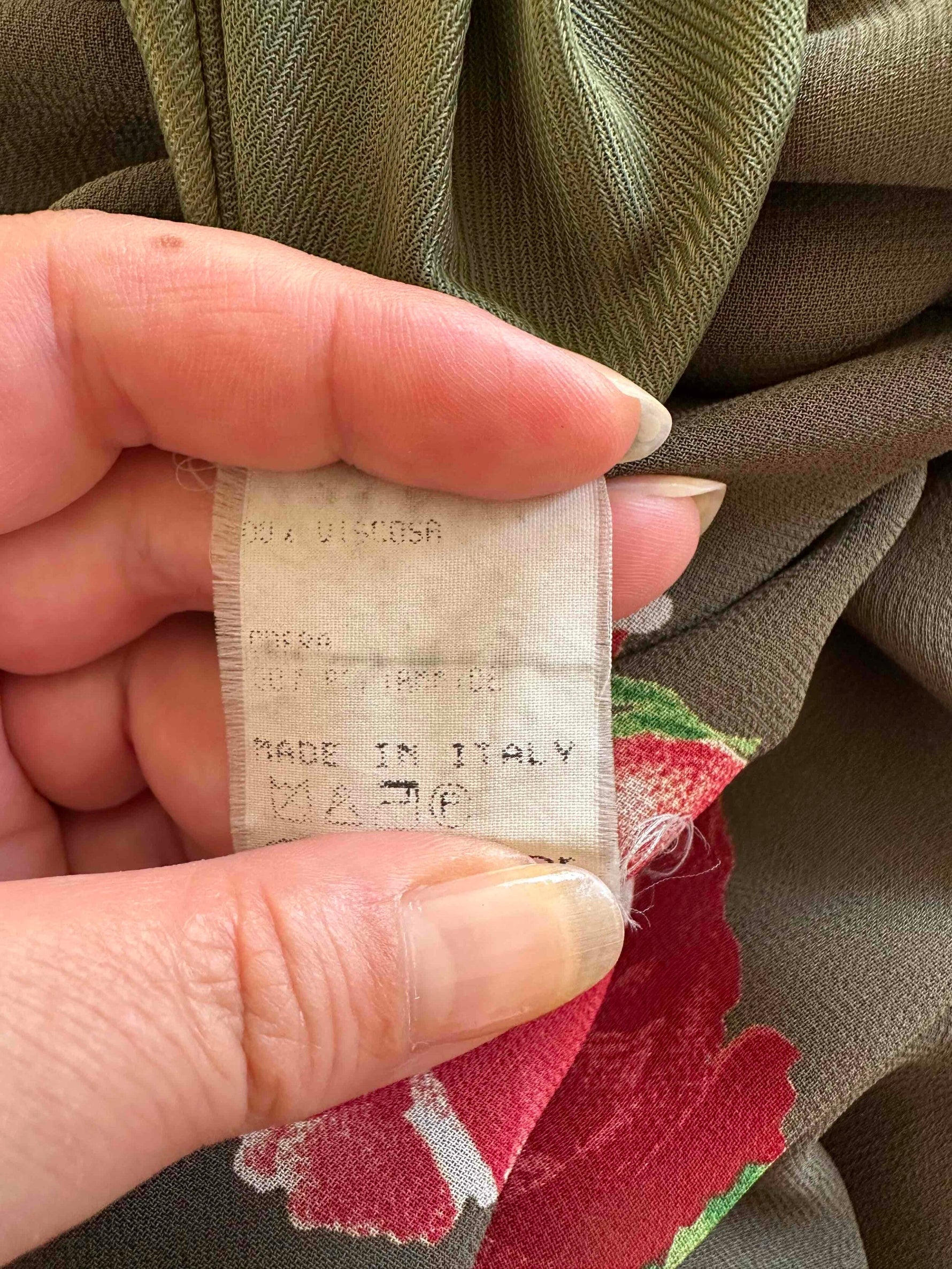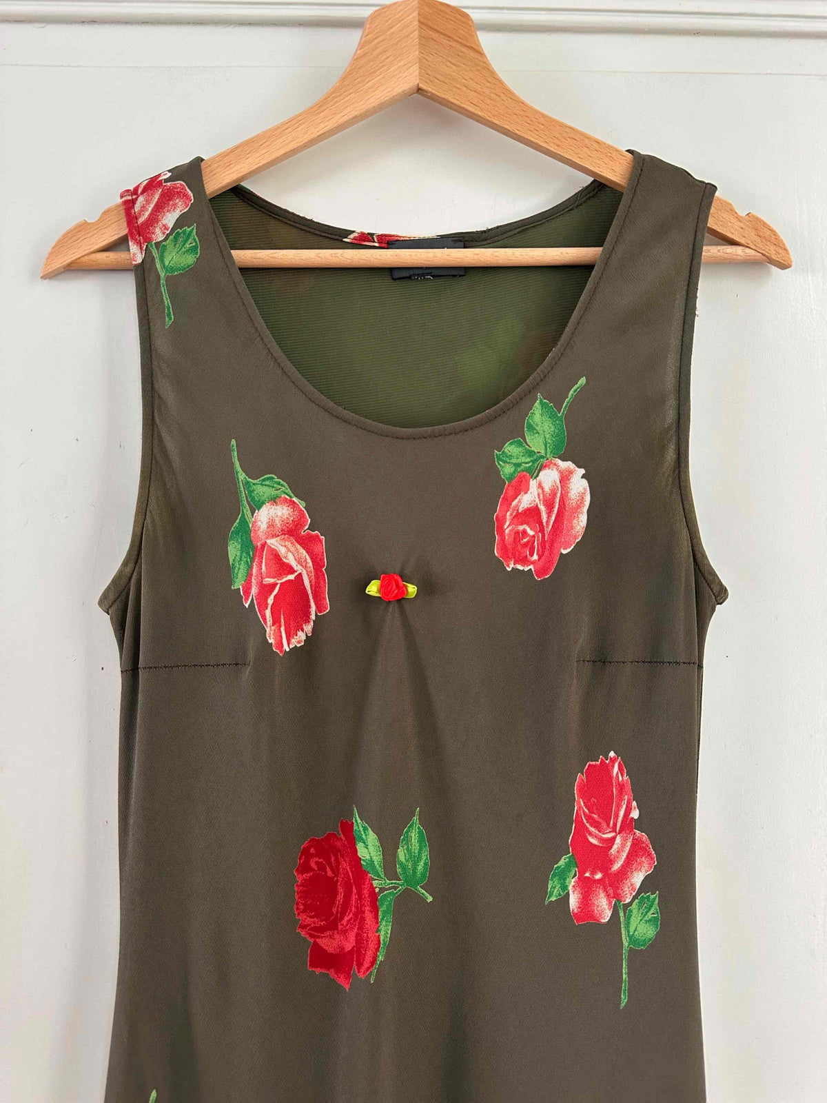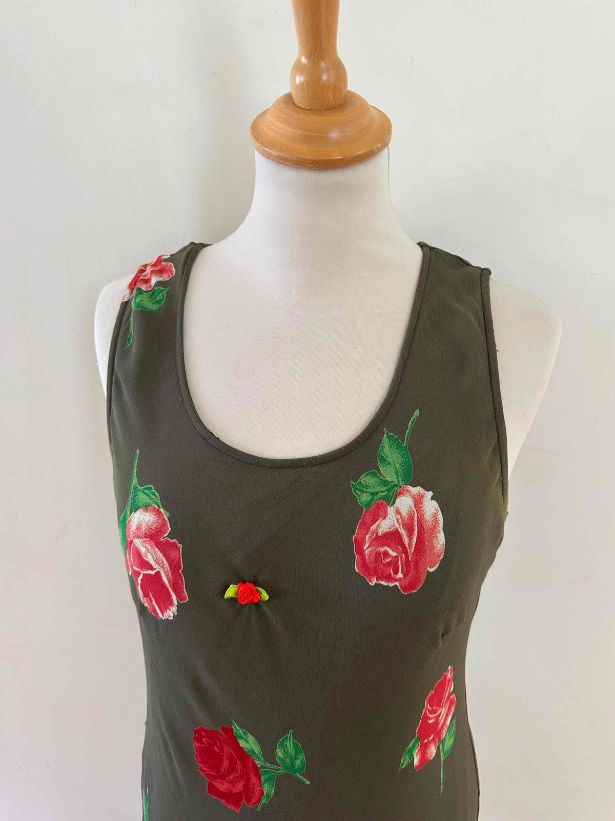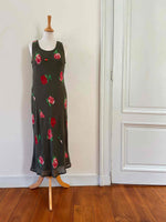 Robe nuisette à fleurs, en voile viscose vert olive foncé imprimé motifs roses rouges et vertes, petite rose ruban brodée, taillée en biais, fabriquée en Italie, taille 36 portée ici sur un mannequin T36, aisselles 44cm.