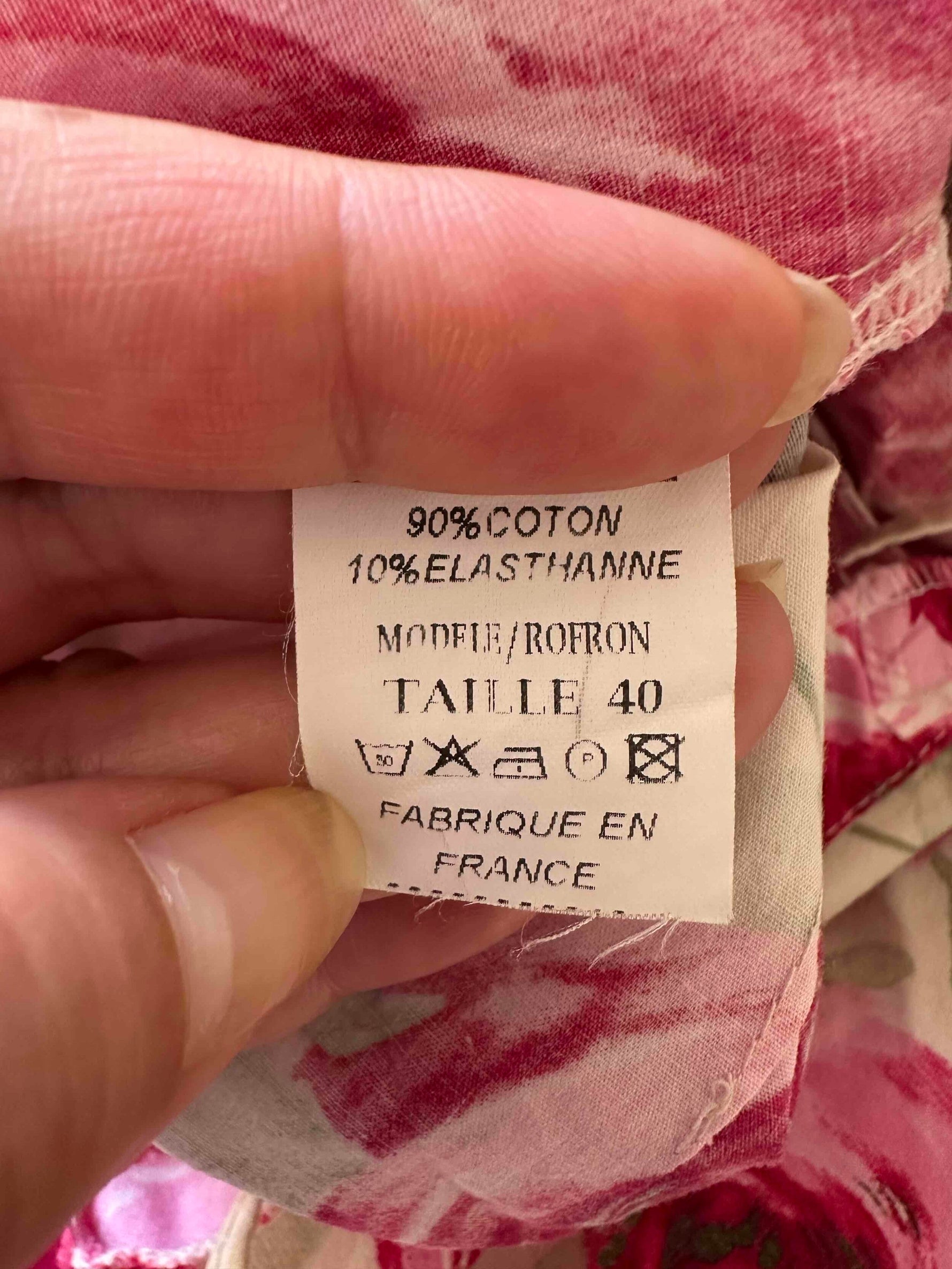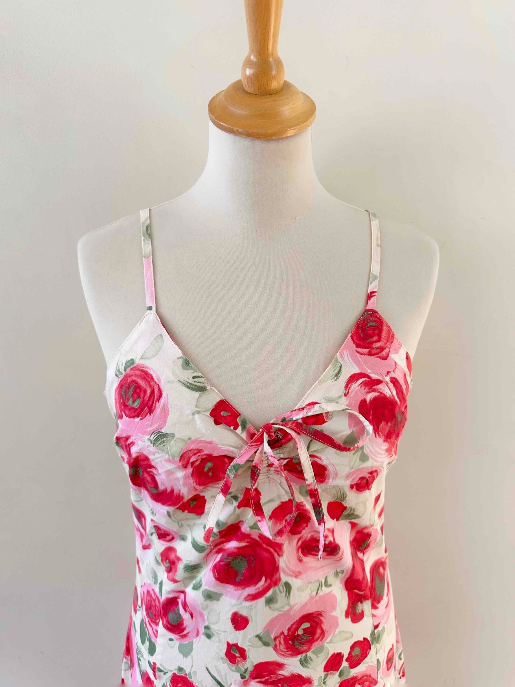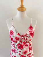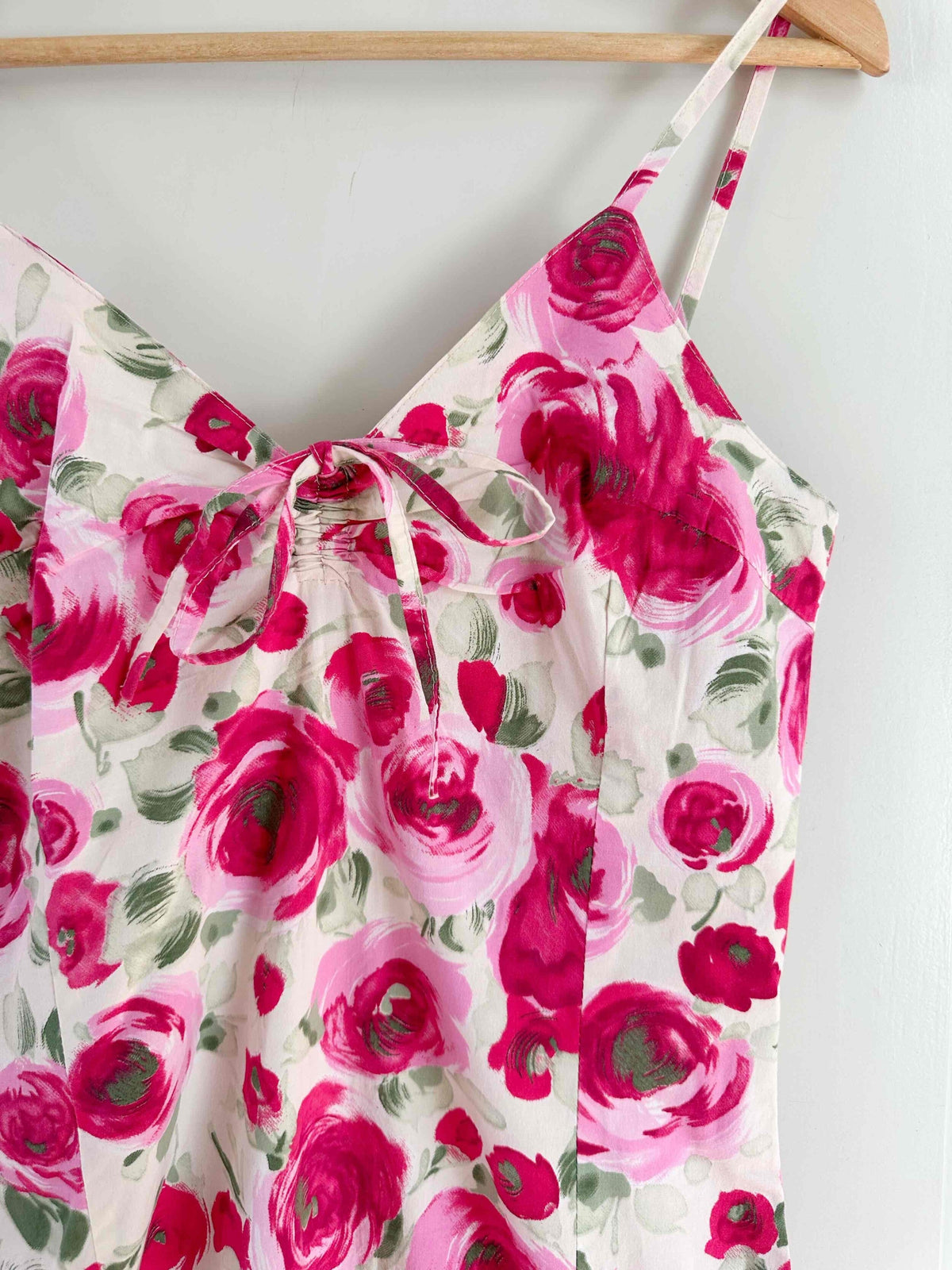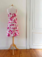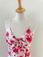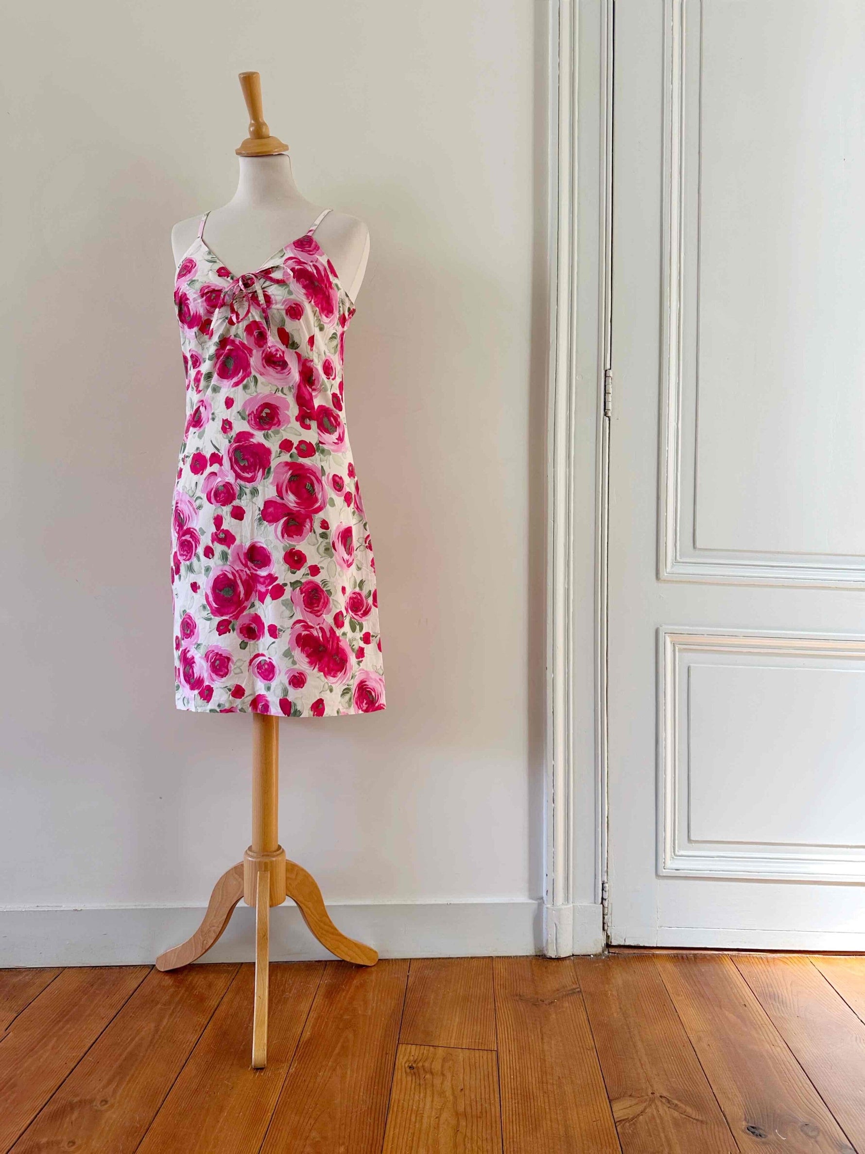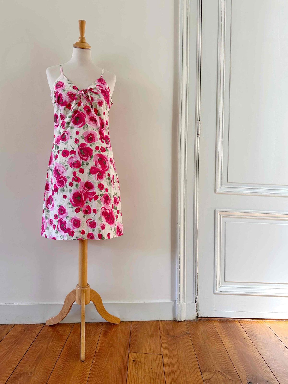 Robe nuisette à fleurs, en coton élasthanne blanc imprimé fleurs roses, fuschias et vertes, bretelles spaghettis, poitrine à nouer, fabriquée en France, taille 36 portée ici sur un mannequin T36, aisselles 44cm.