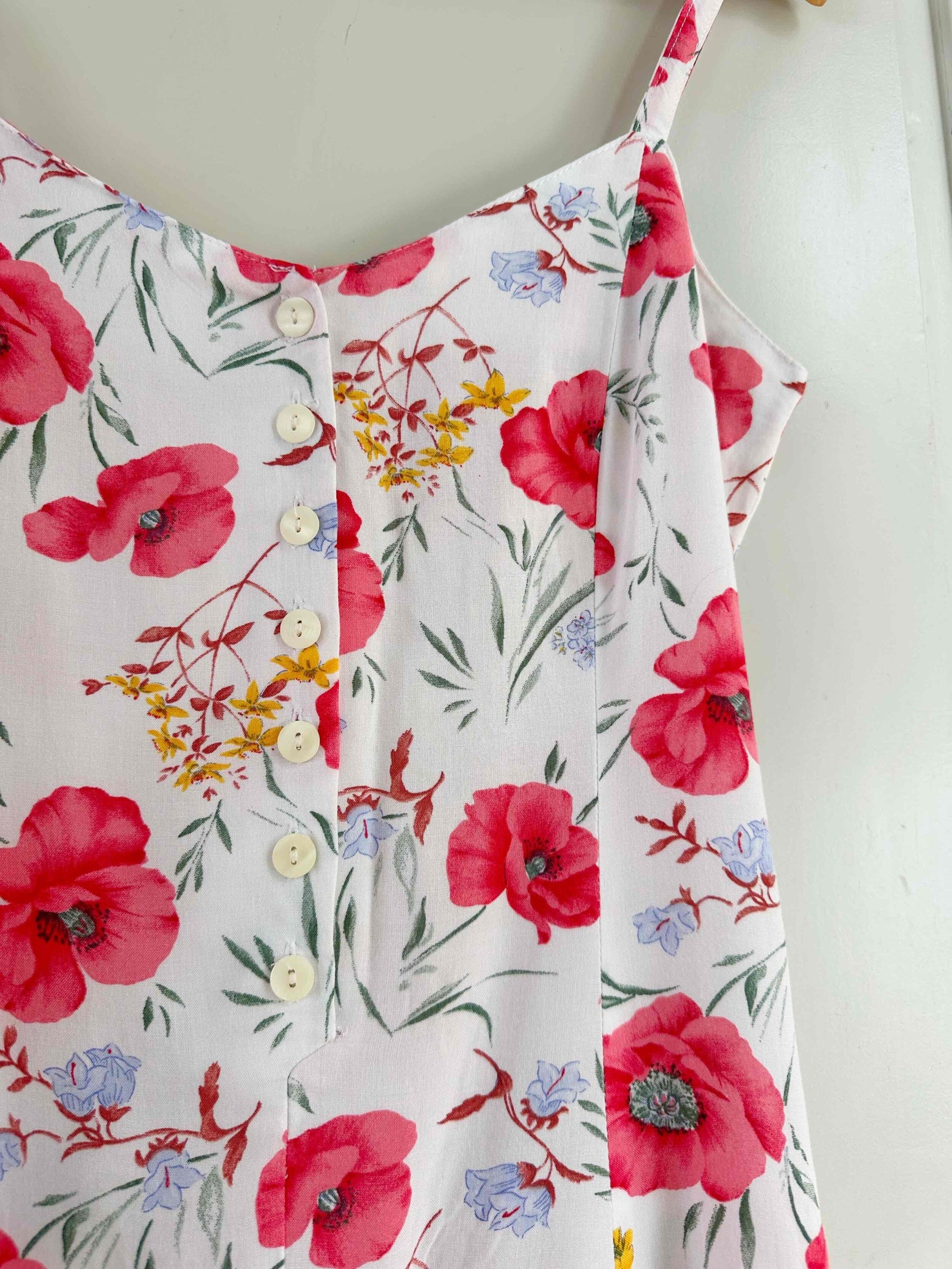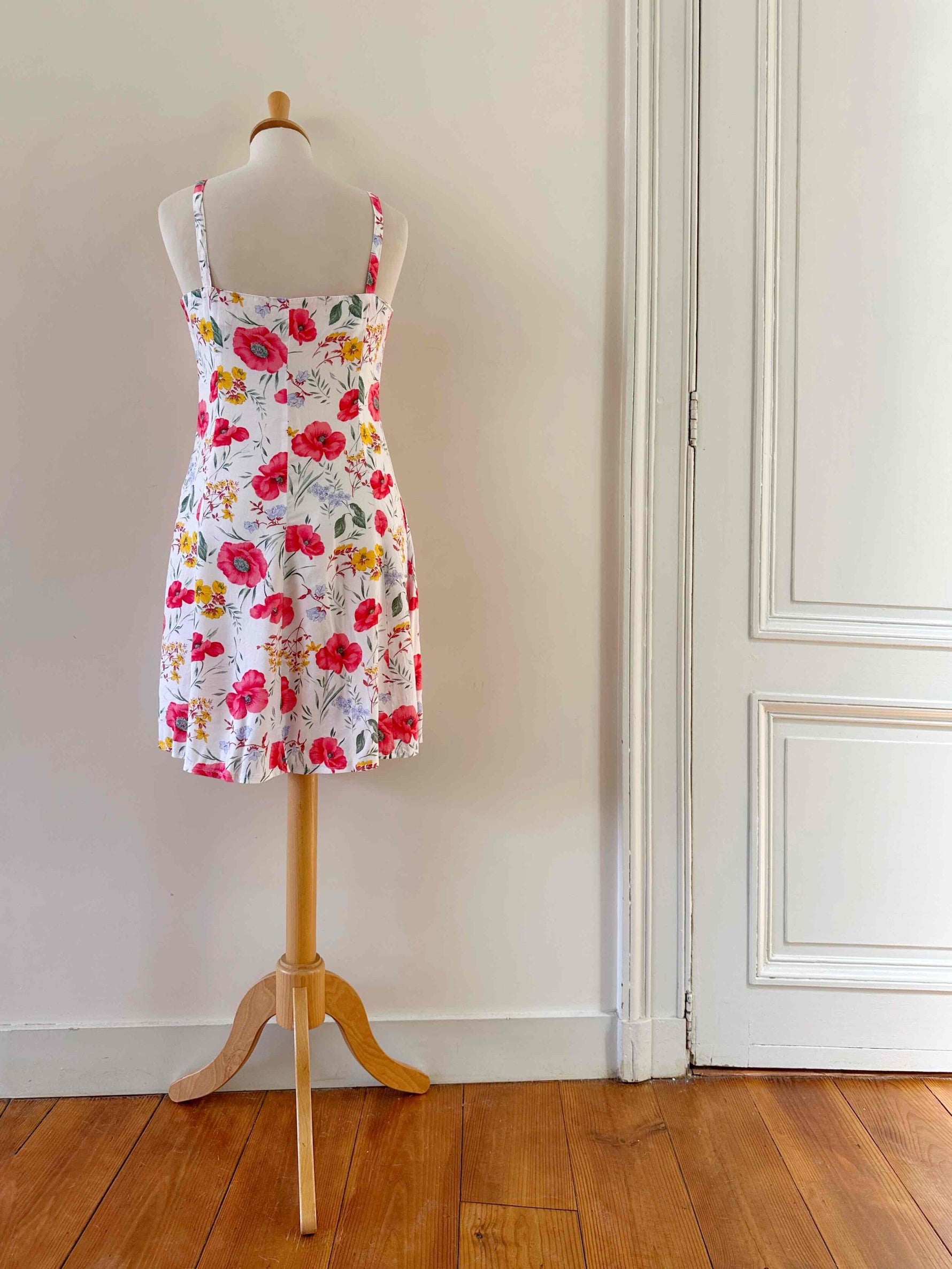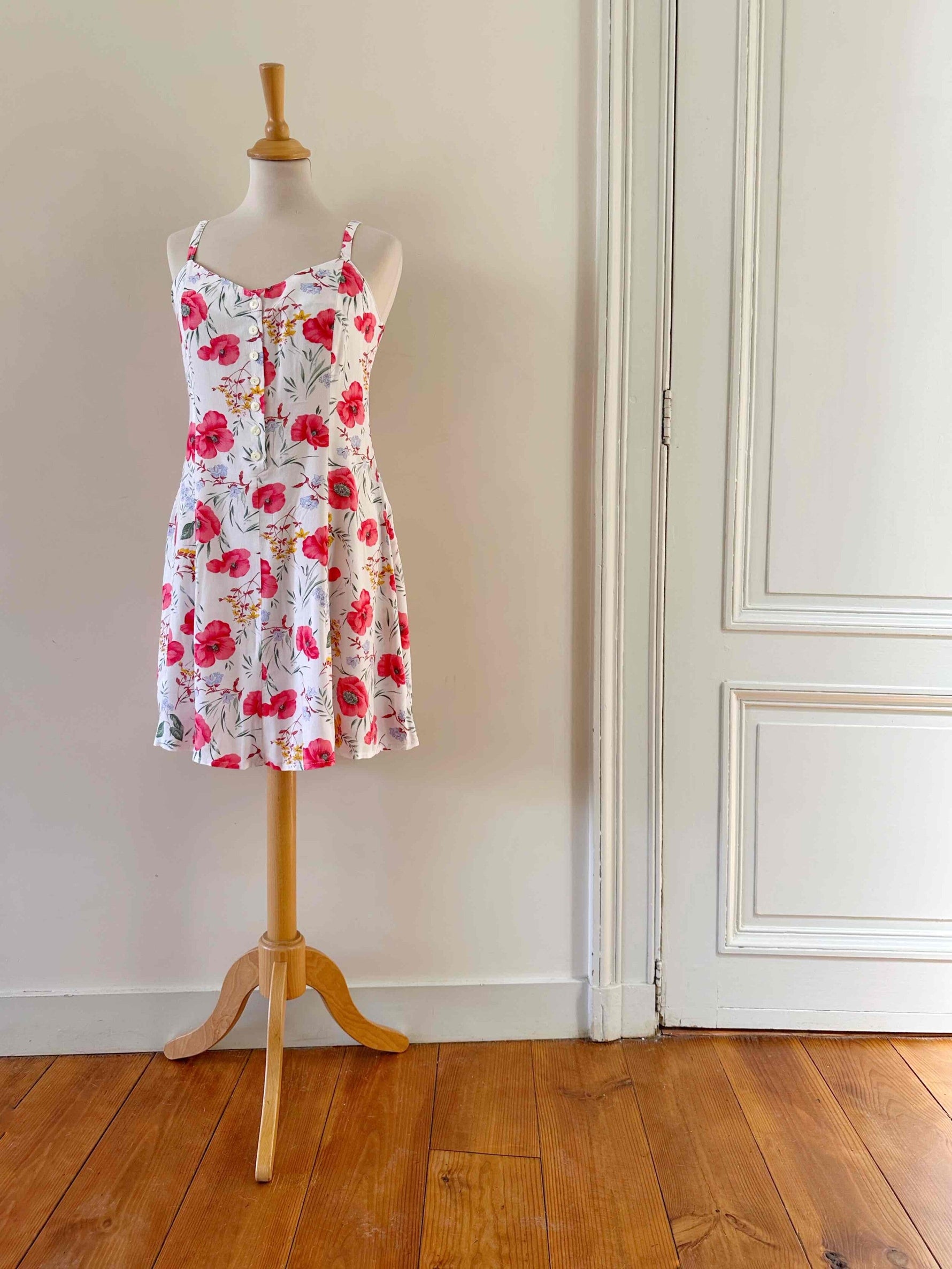 Robe nuisette à fleurs, en viscos blanche imprimé fleurs prairie, coquelicots rouge rose, fleurs jaunes, bleu ciel et vertes, bretelles spaghettis, boutonnée sur le haut, années 90s, taille 36 portée ici sur un mannequin T36, aisselles 43cm.