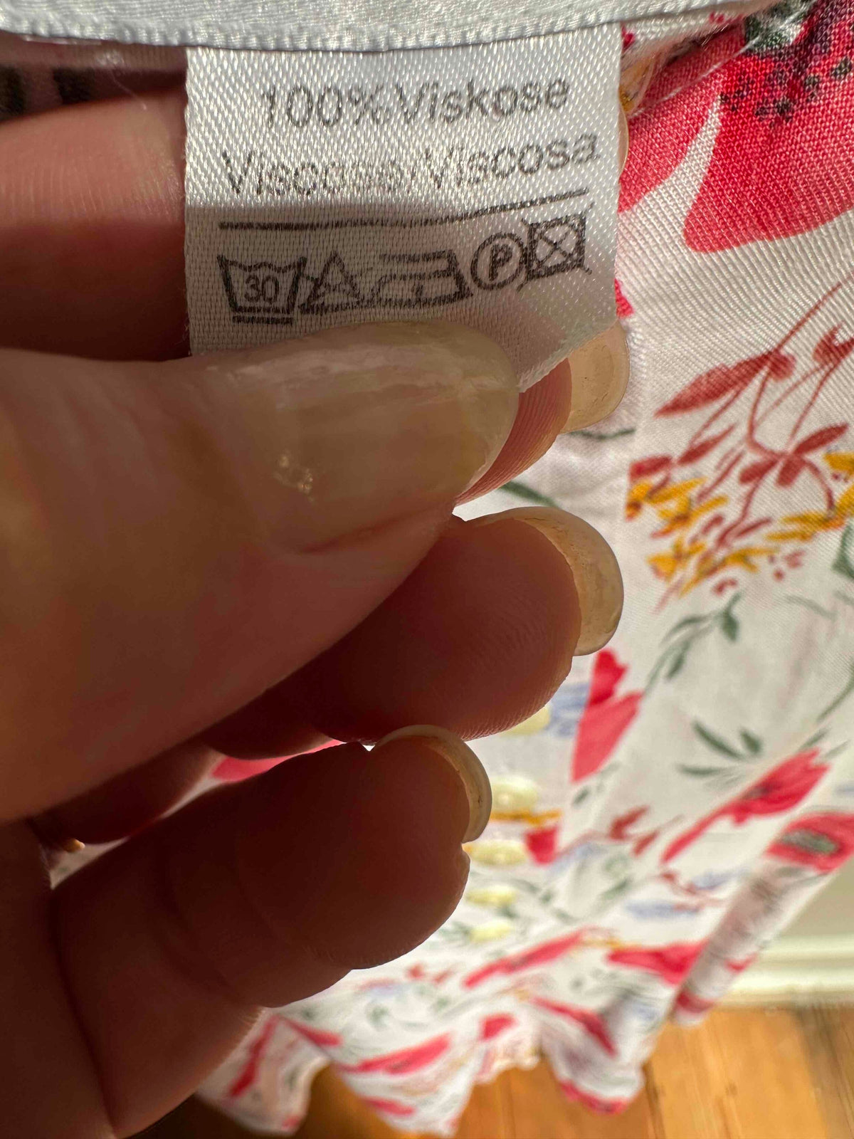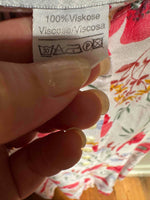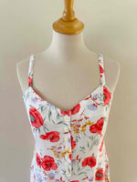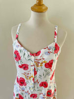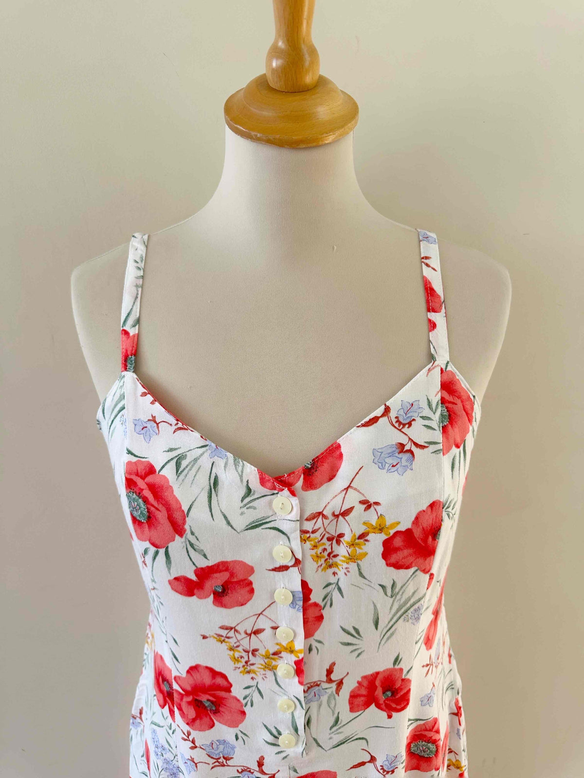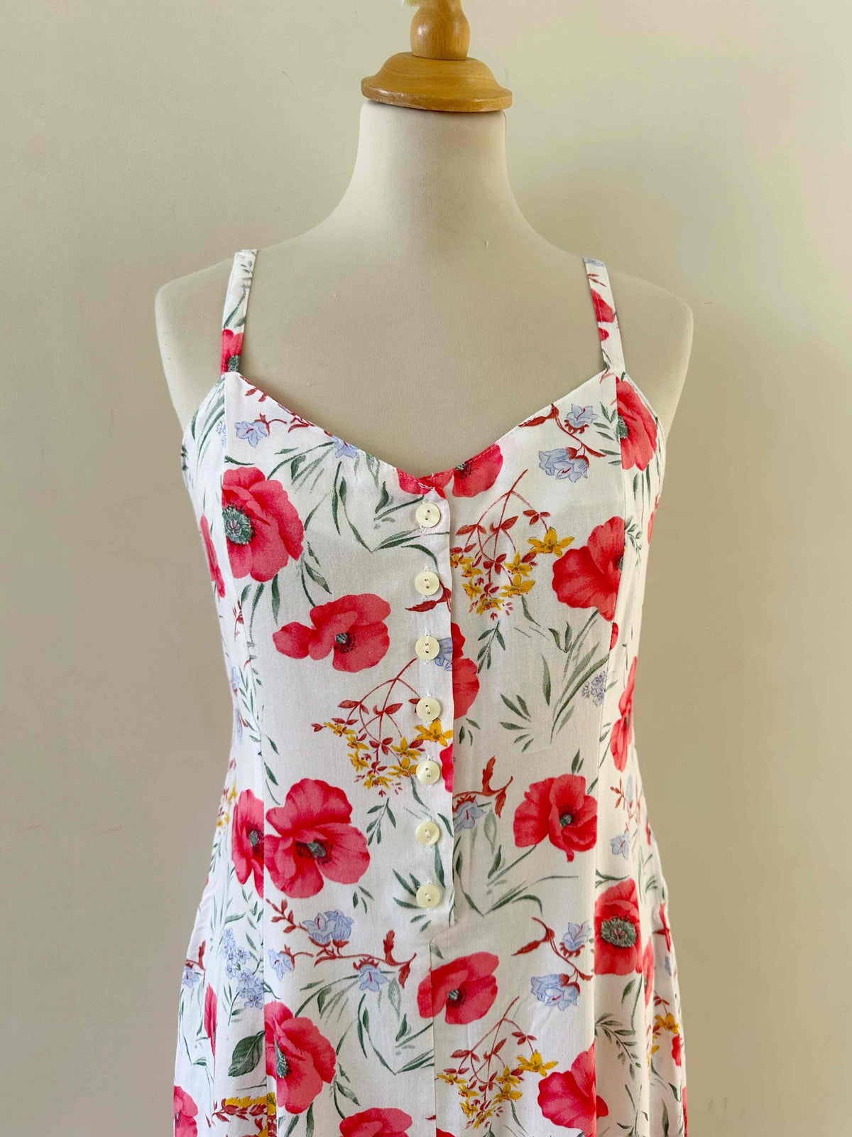 Robe nuisette à fleurs, en viscos blanche imprimé fleurs prairie, coquelicots rouge rose, fleurs jaunes, bleu ciel et vertes, bretelles spaghettis, boutonnée sur le haut, années 90s, taille 36 portée ici sur un mannequin T36, aisselles 43cm.