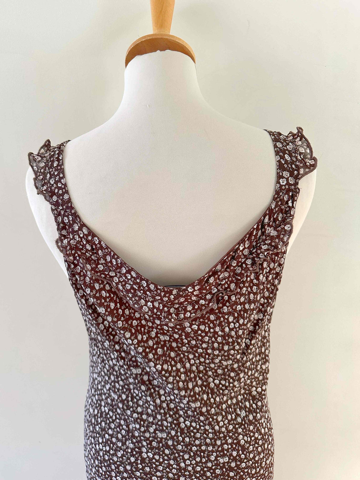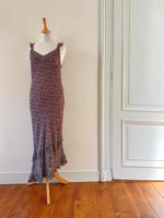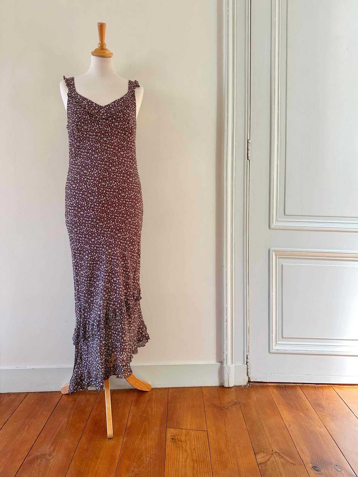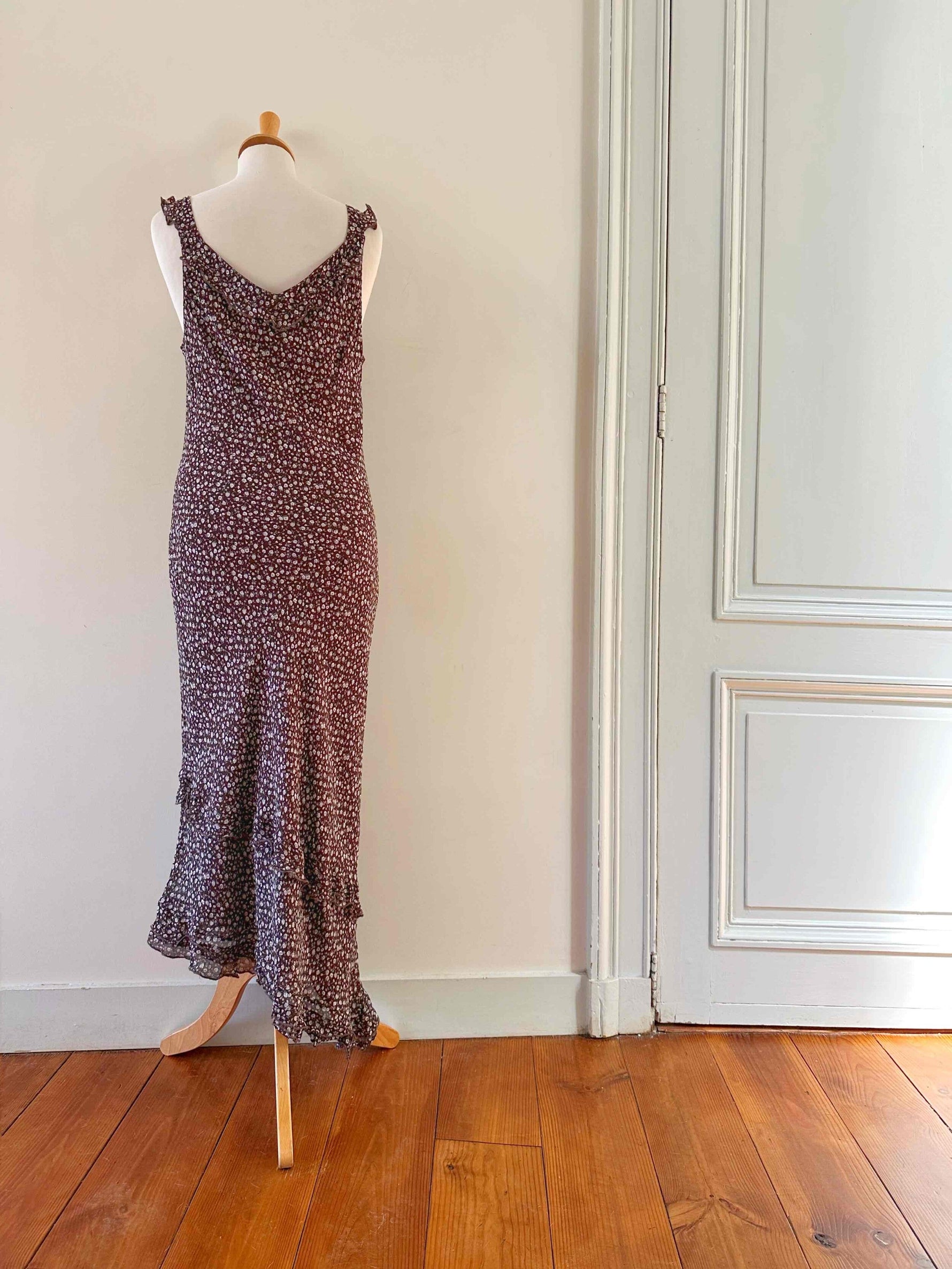 Prix unitaire parRobe nuisette à fleurs, en voile viscose chocolat, bretelles fines et bordures à petits volants, taillée en biais, longueur asymétrique, fabriquée en France, taille 38 portée ici sur un mannequin T36, aisselles 45cm.