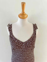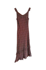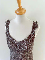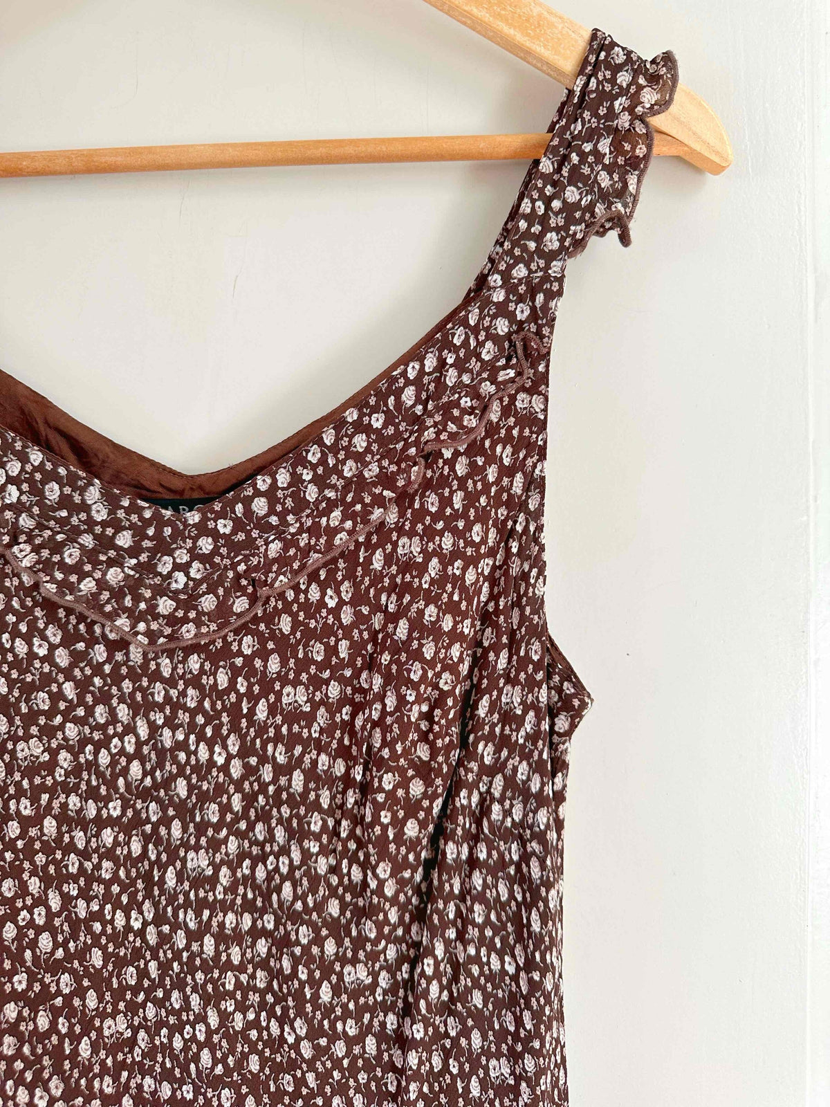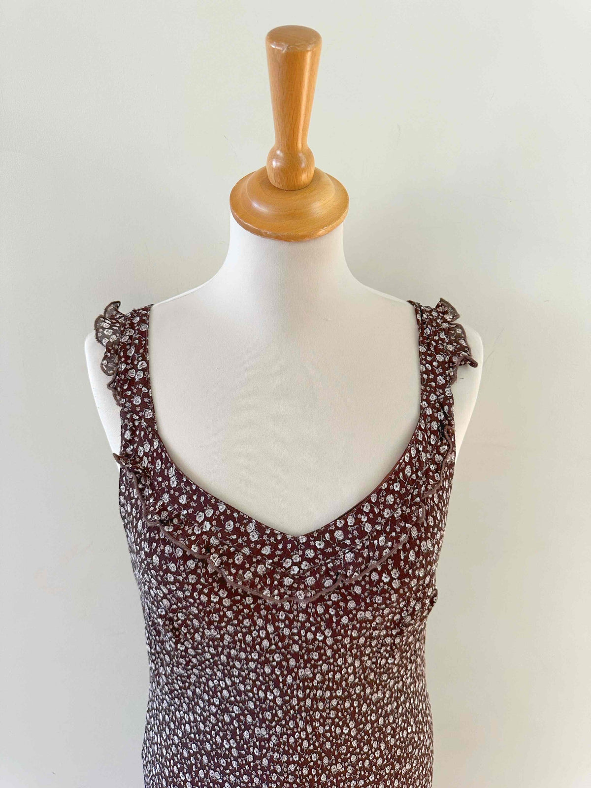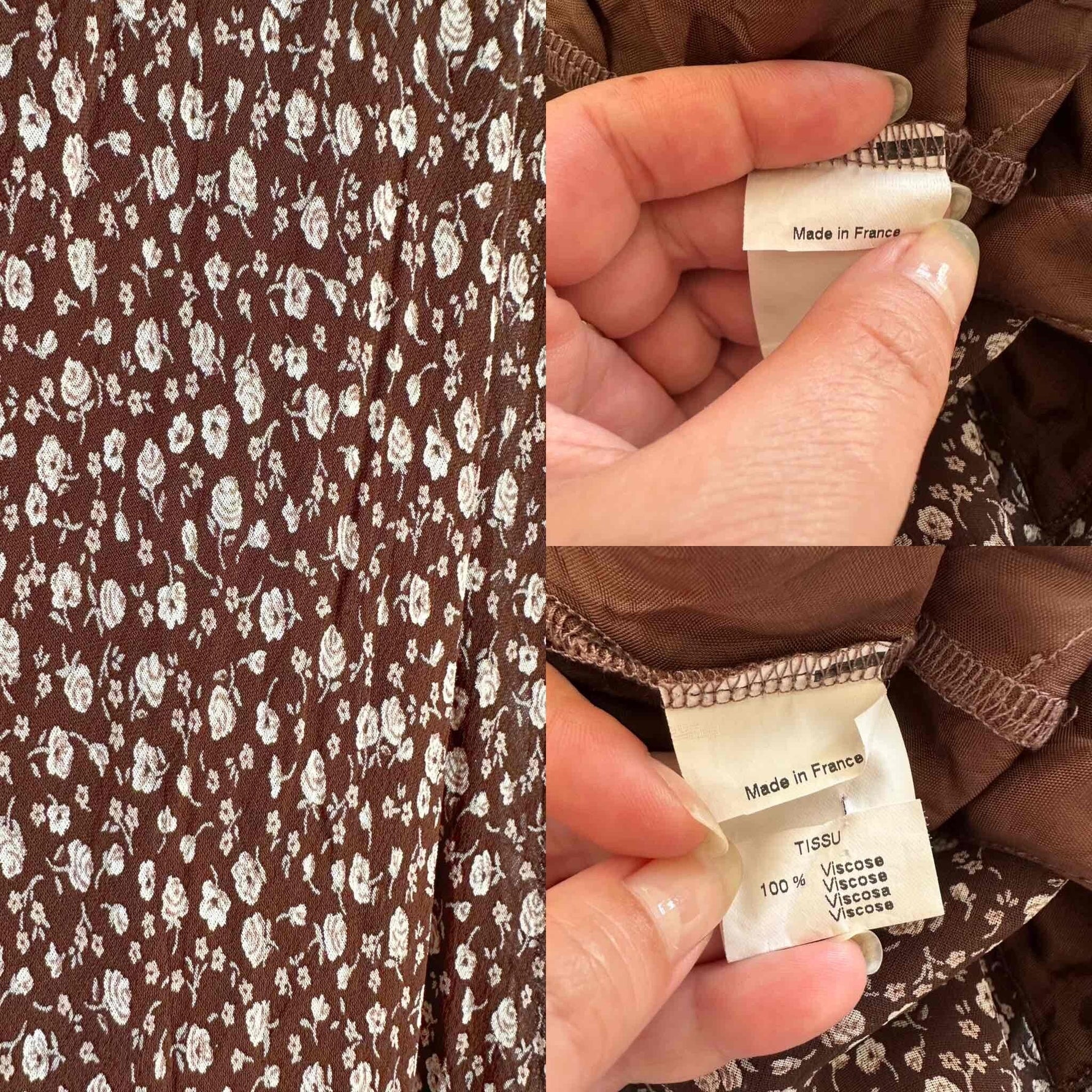 Prix unitaire parRobe nuisette à fleurs, en voile viscose chocolat, bretelles fines et bordures à petits volants, taillée en biais, longueur asymétrique, fabriquée en France, taille 38 portée ici sur un mannequin T36, aisselles 45cm.