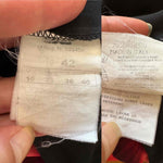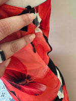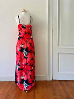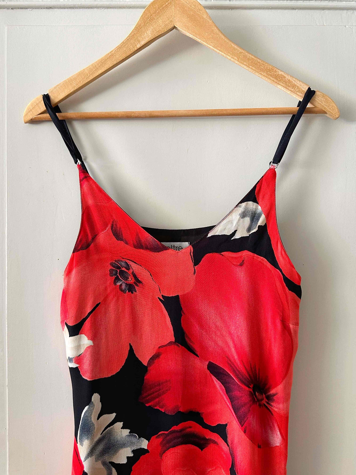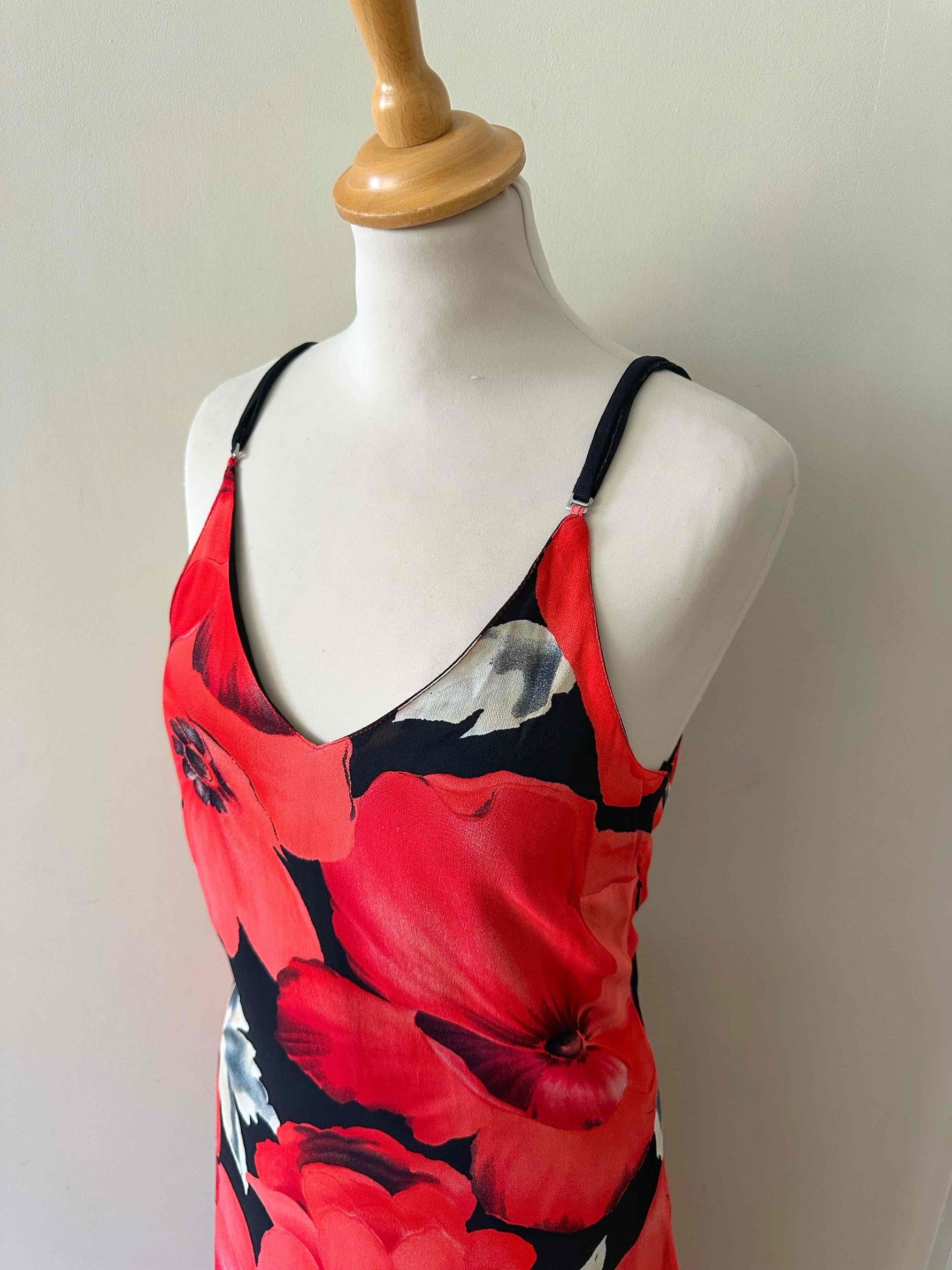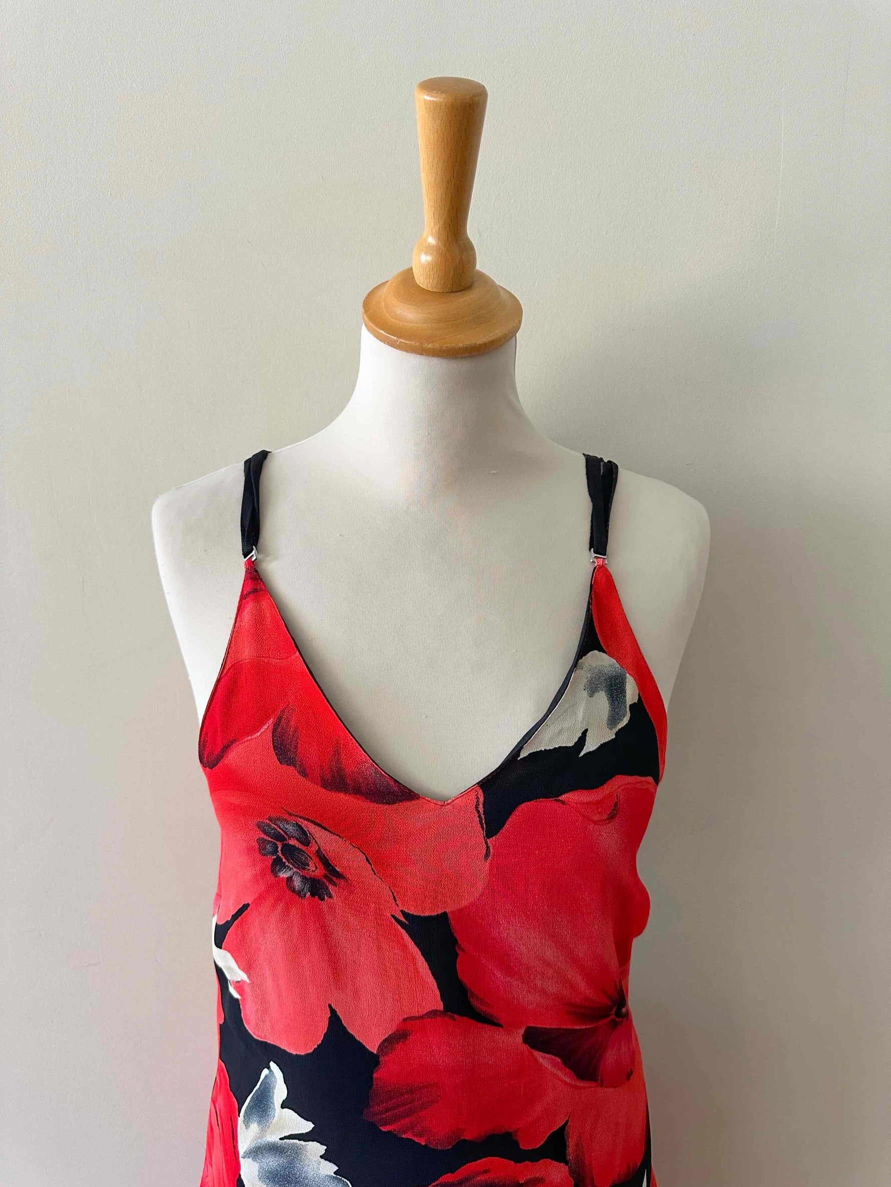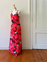 Prix unitaire parRobe nuisette à fleurs, en voile viscose noir imprimé grandes fleurs rouges, bretelles réglables et amovibles, fermeture éclair invisible côté, longueur maxi fabriquée en Italie, taille 36 portée ici sur un mannequin T36, aisselles 43cm.