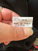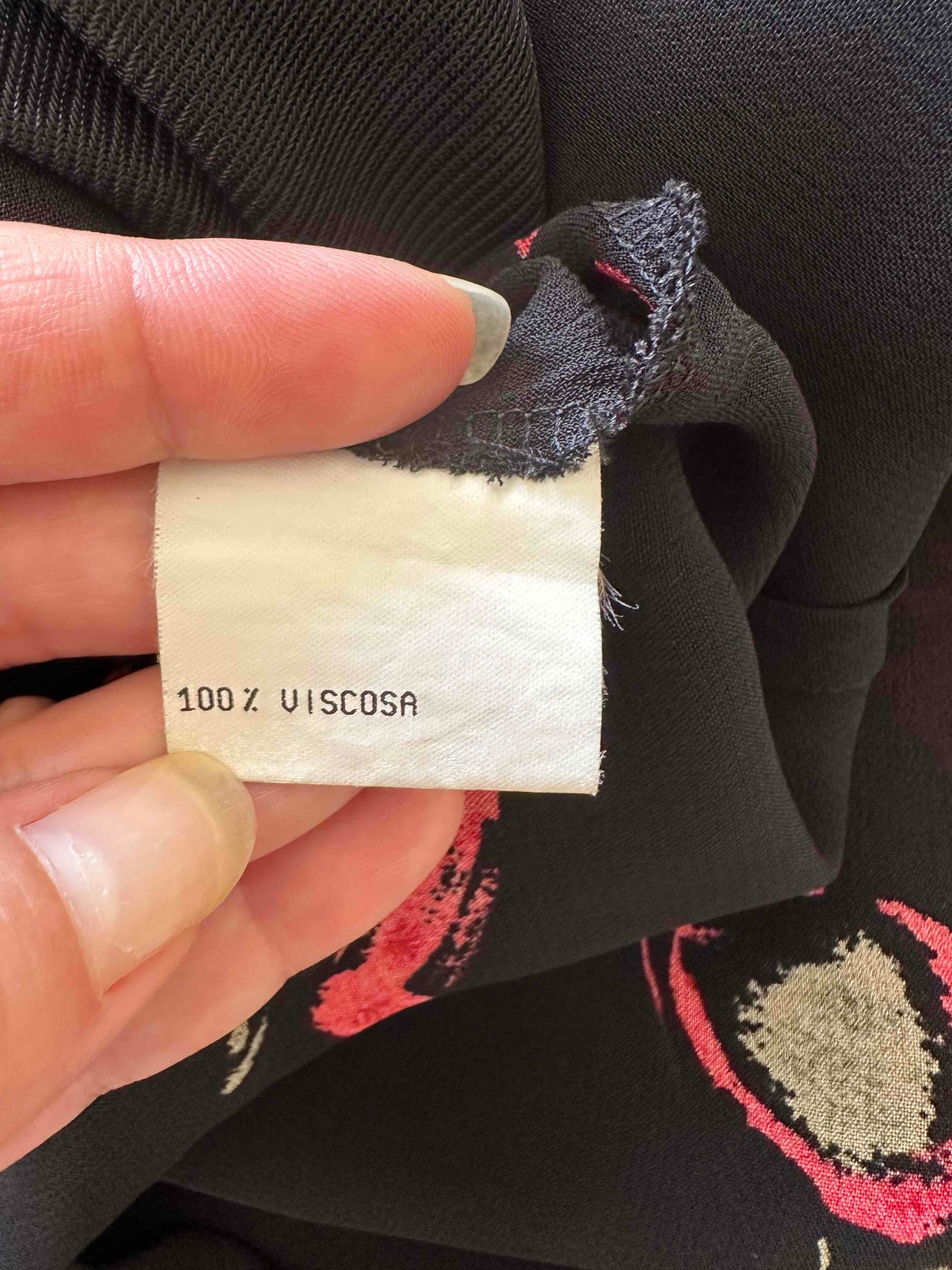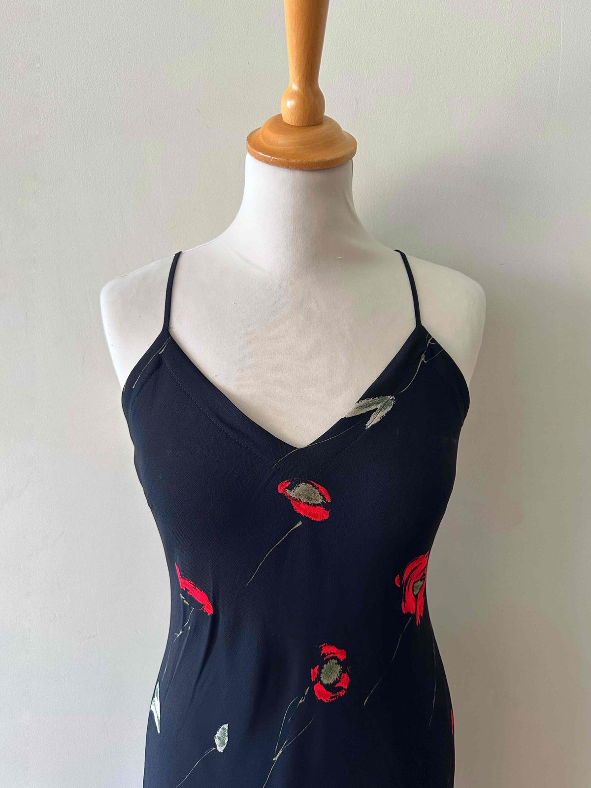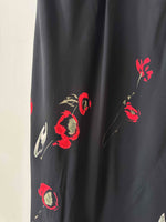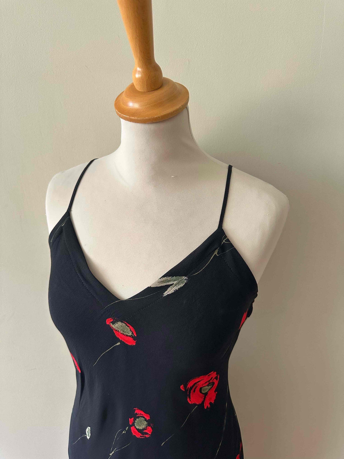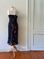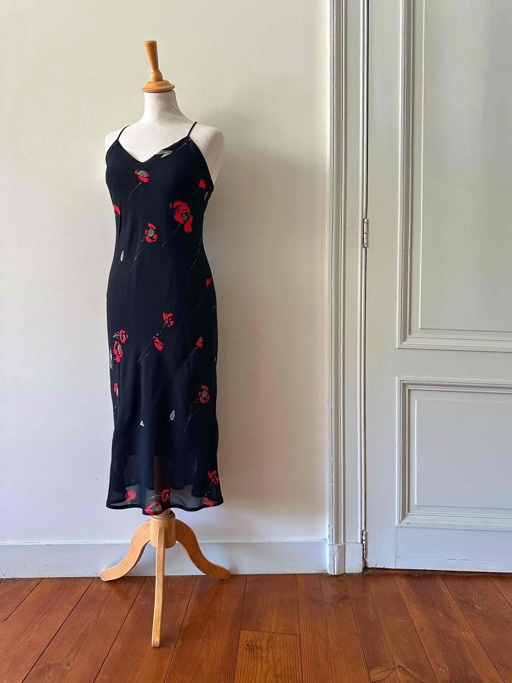 Prix unitaire parRobe nuisette à fleurs, en voile viscose noir imprimé motifs fleurs rouges et vertes, bretelles spaghettis, taillée en biais, fabriquée en Italie, taille 36 portée ici sur un mannequin T36, aisselles 43cm.