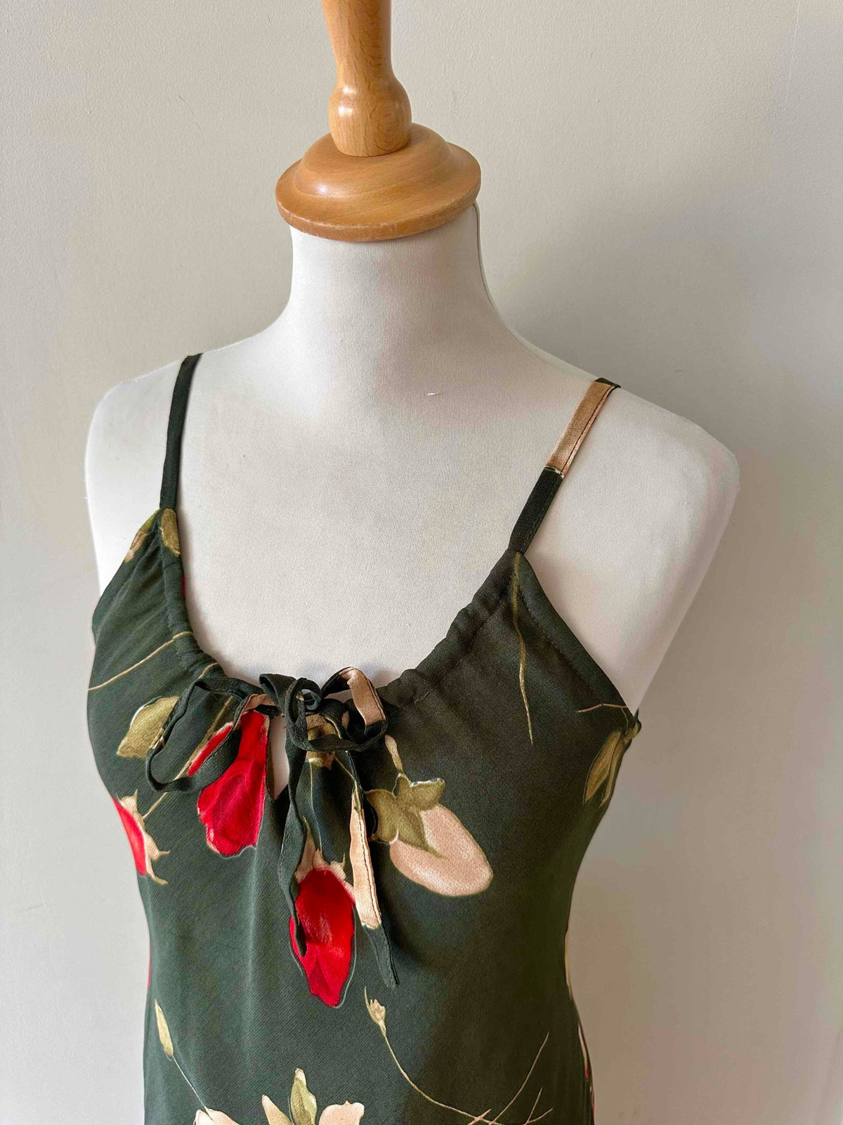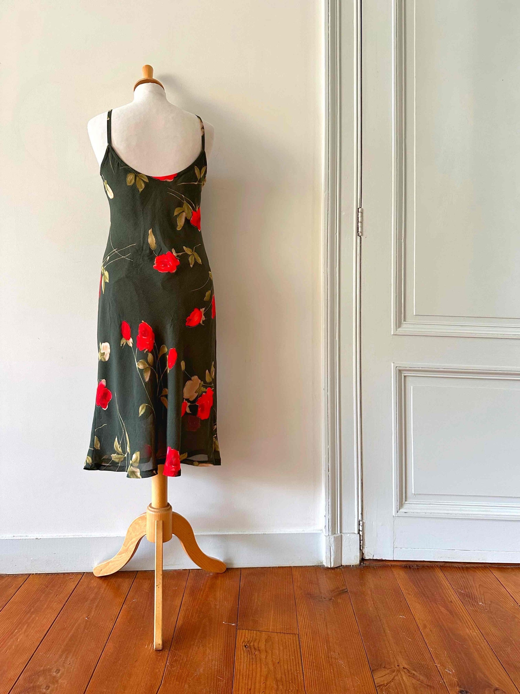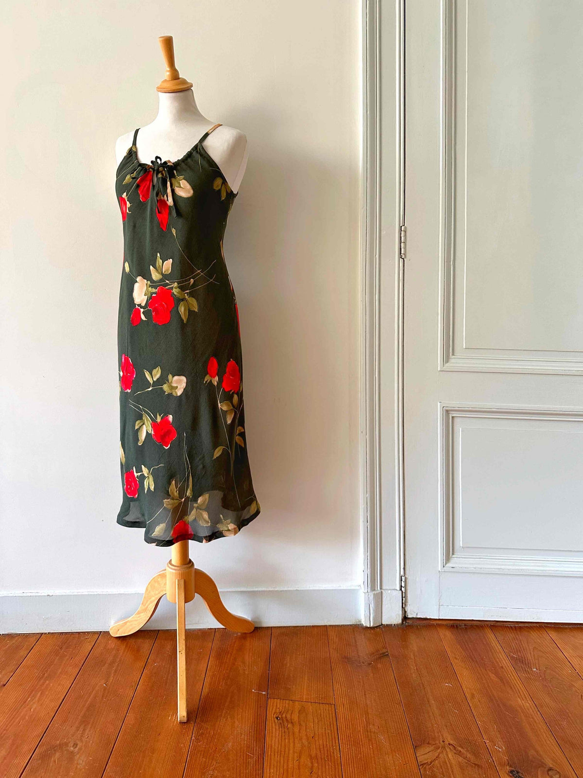 Prix unitaire parRobe nuisette à fleurs, en voile viscose doublé vett olive foncé, imprimée motifs roses rouges, beiges et vertes. Bretelles spaghettis à nouer à la poitrine, taillée en biais, fabriquée en Italie, taille 36 portée ici sur un mannequin T36. Aisselles 43cm.