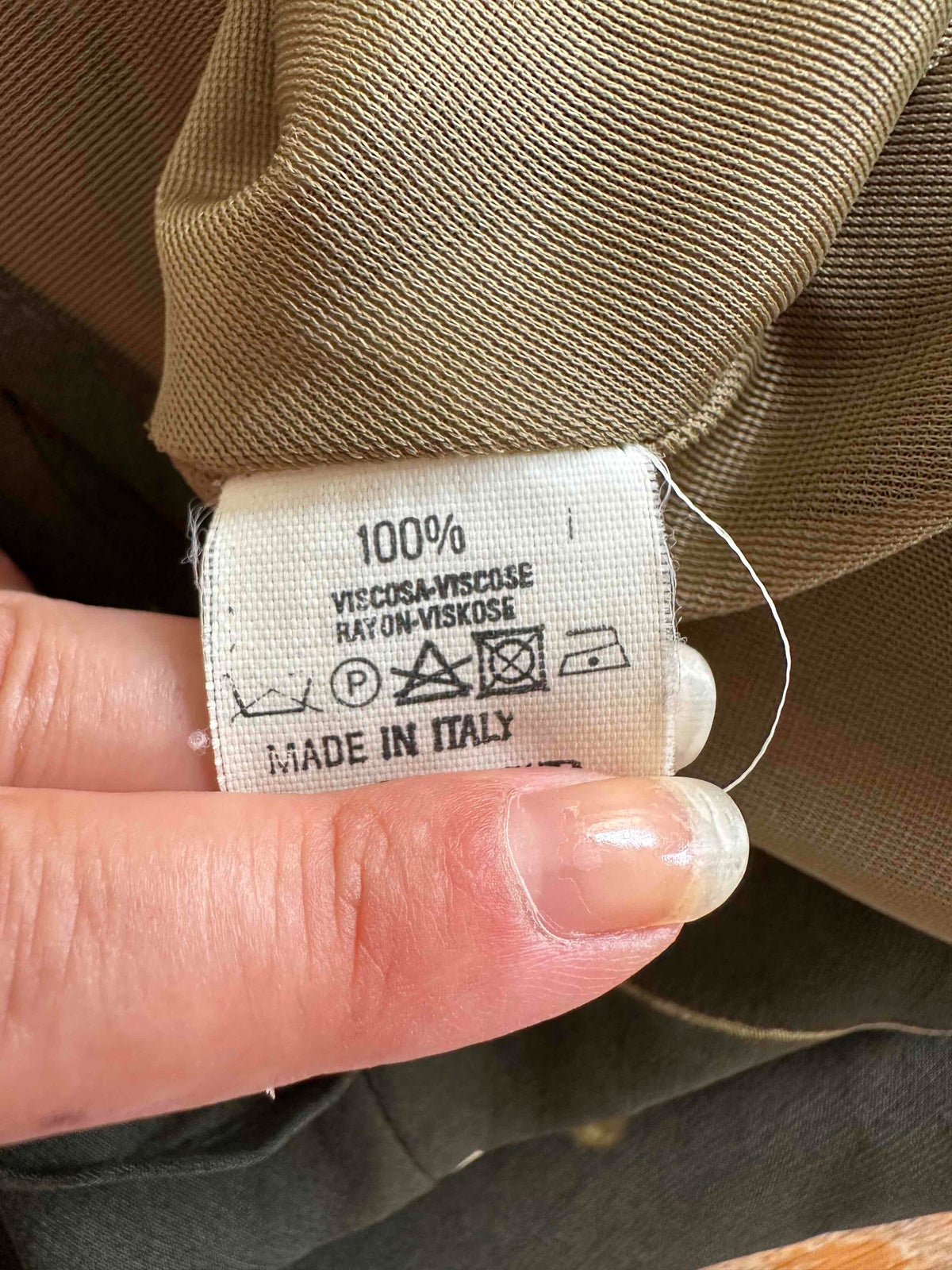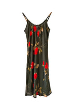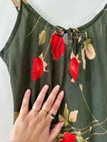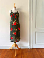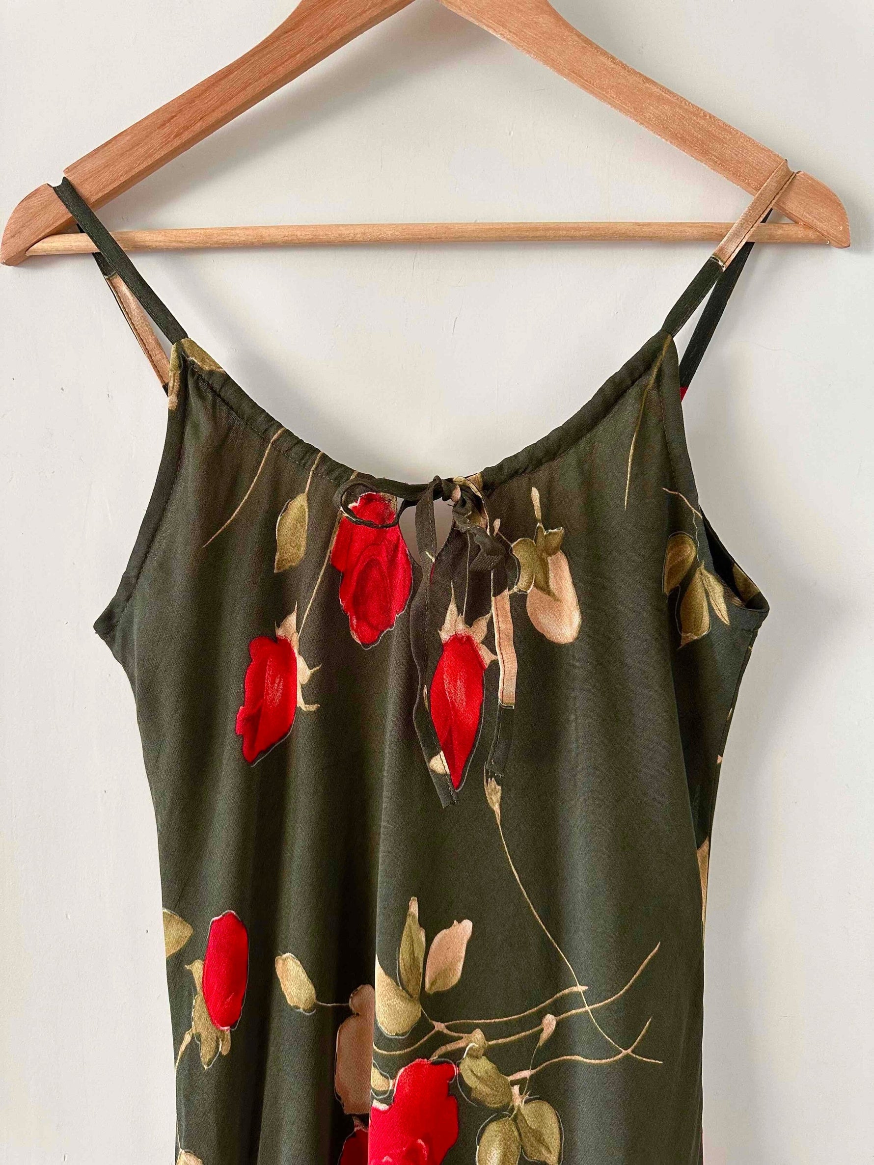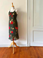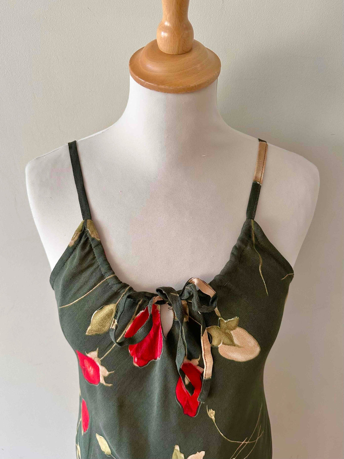 Prix unitaire parRobe nuisette à fleurs, en voile viscose doublé vett olive foncé, imprimée motifs roses rouges, beiges et vertes. Bretelles spaghettis à nouer à la poitrine, taillée en biais, fabriquée en Italie, taille 36 portée ici sur un mannequin T36. Aisselles 43cm.