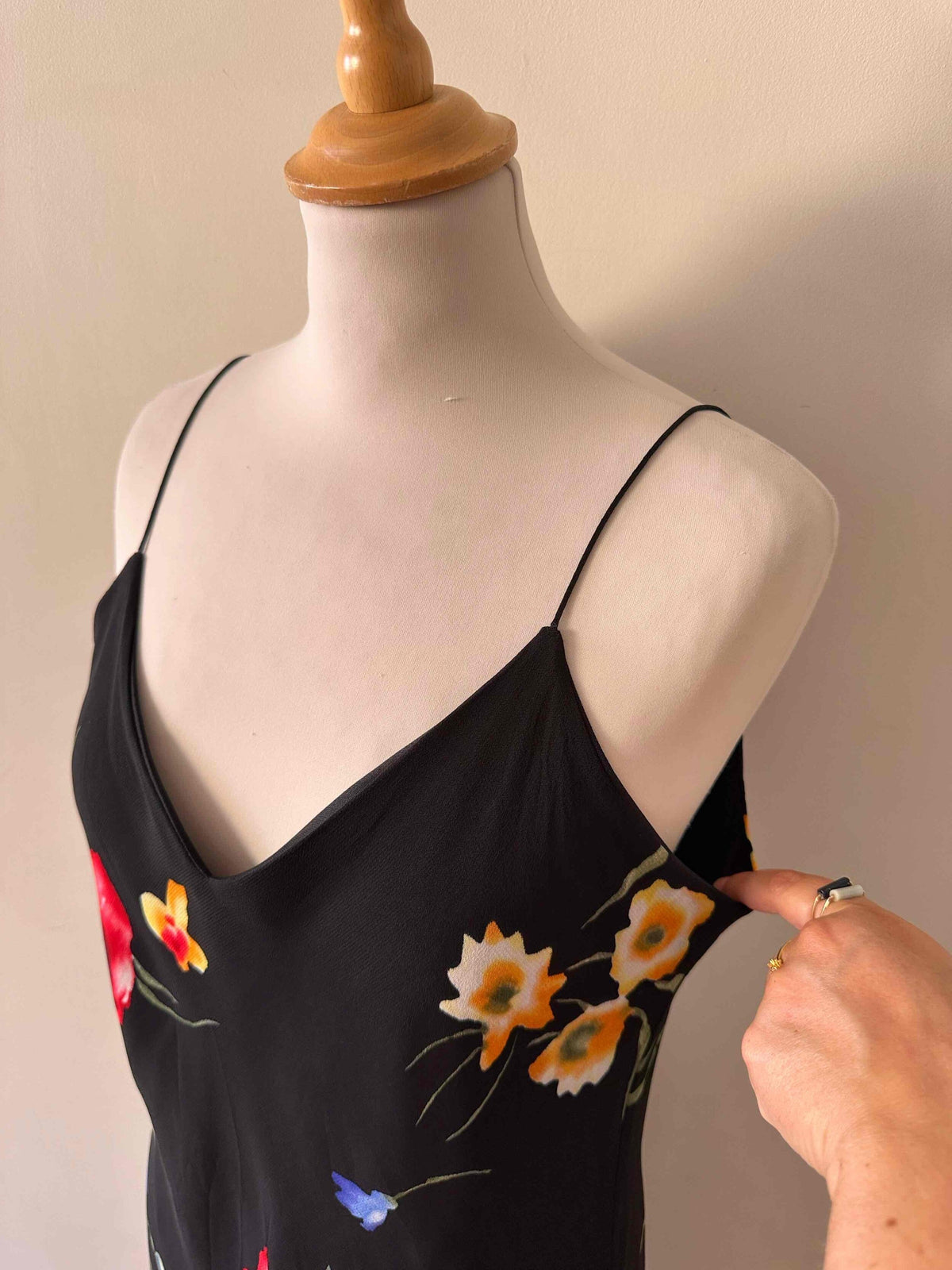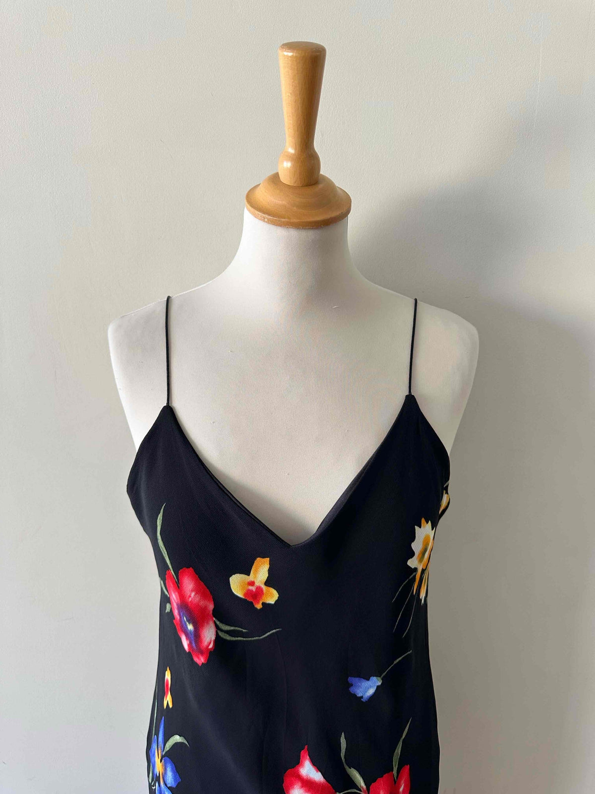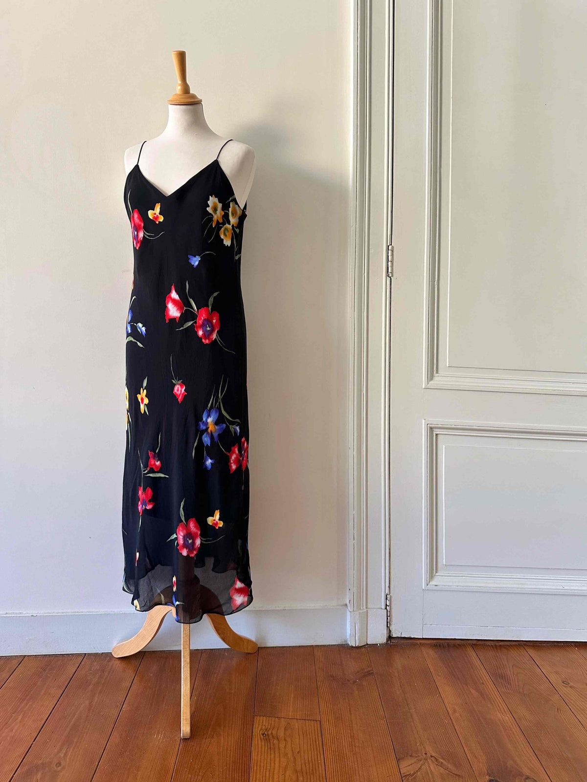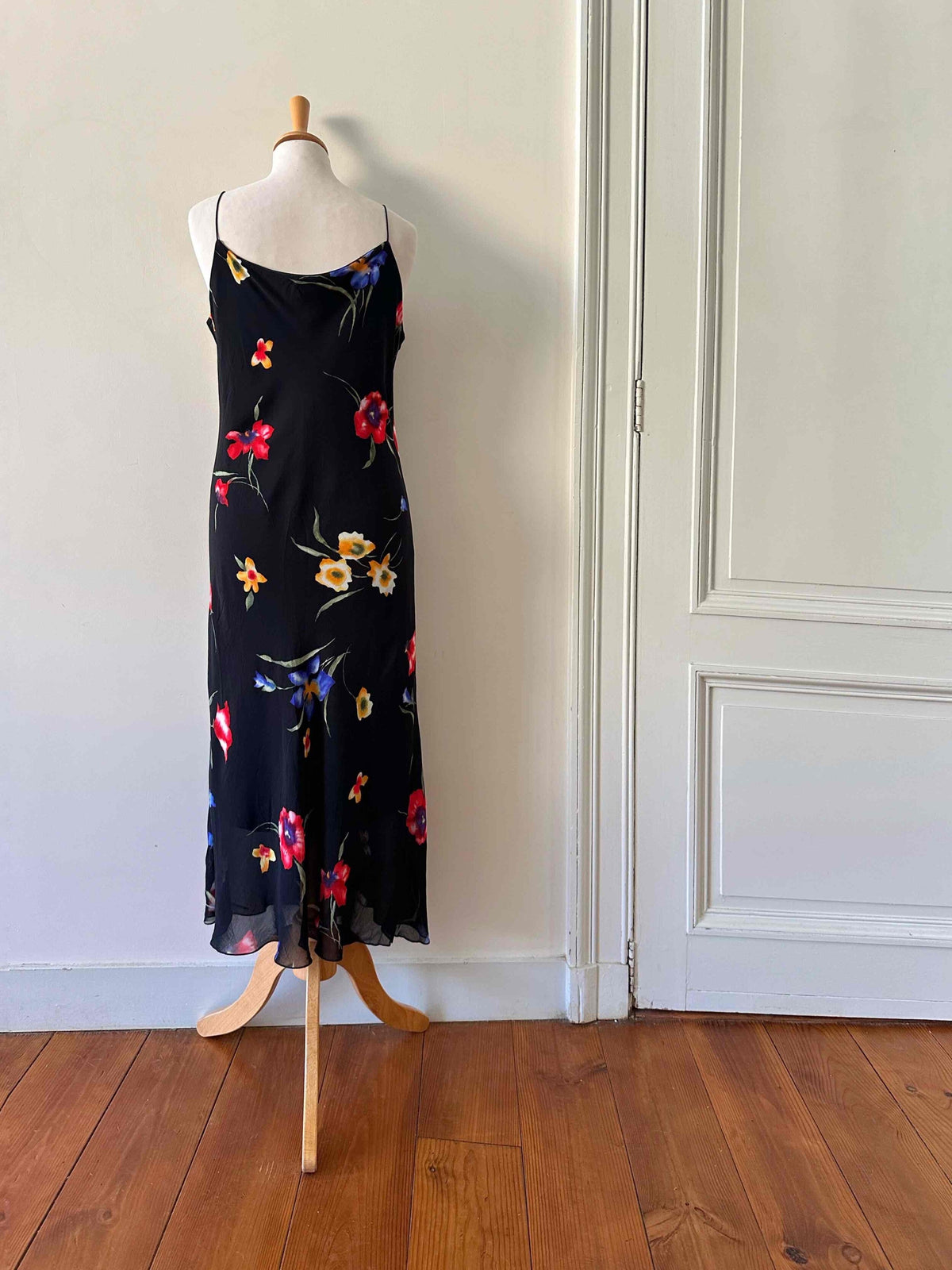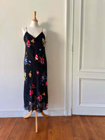 Robe nuisette à fleurs, en voile viscose noir imprimé fleurs multicolores rouges, jaunes et bleues. Bretelles soaghettis satinées, taillée en biais, fabriquée en France, taille 38 portée ici sur un mannequin T36, aisselles 45cm.