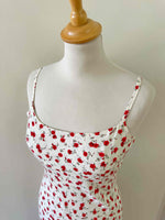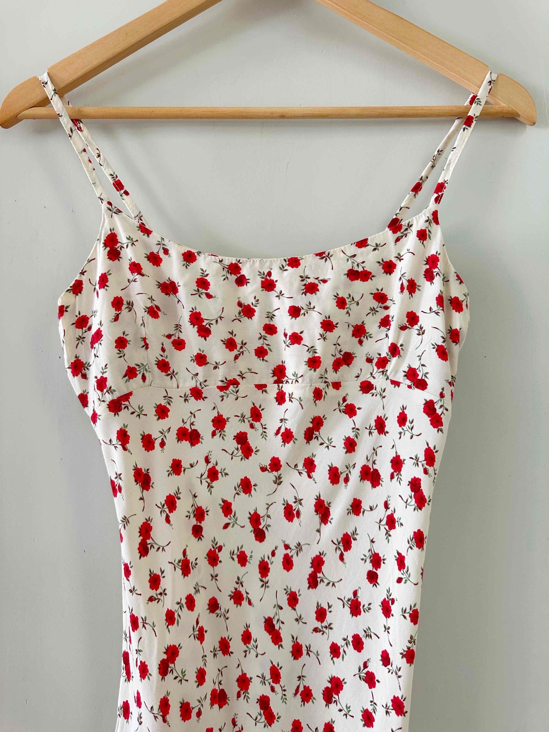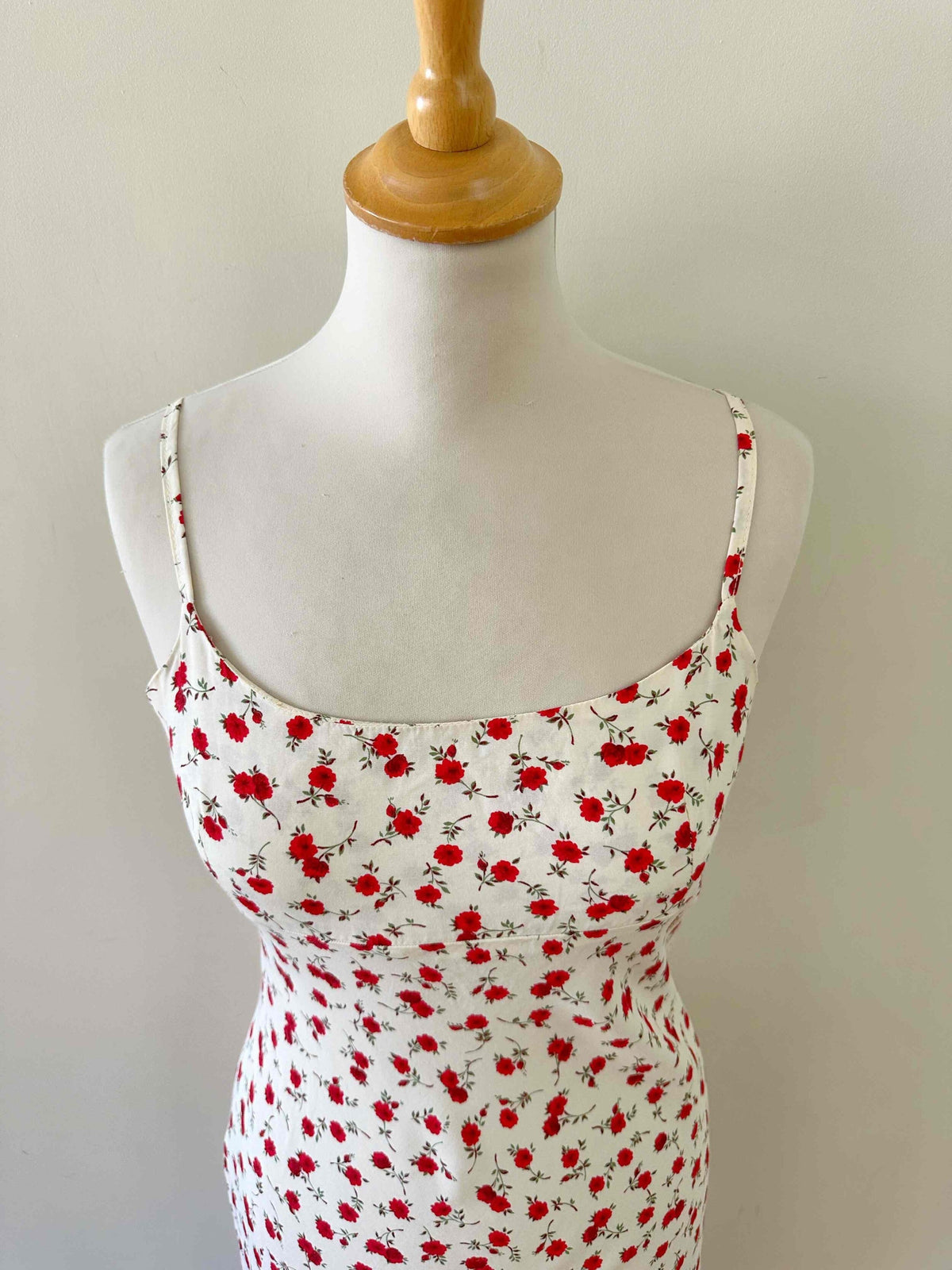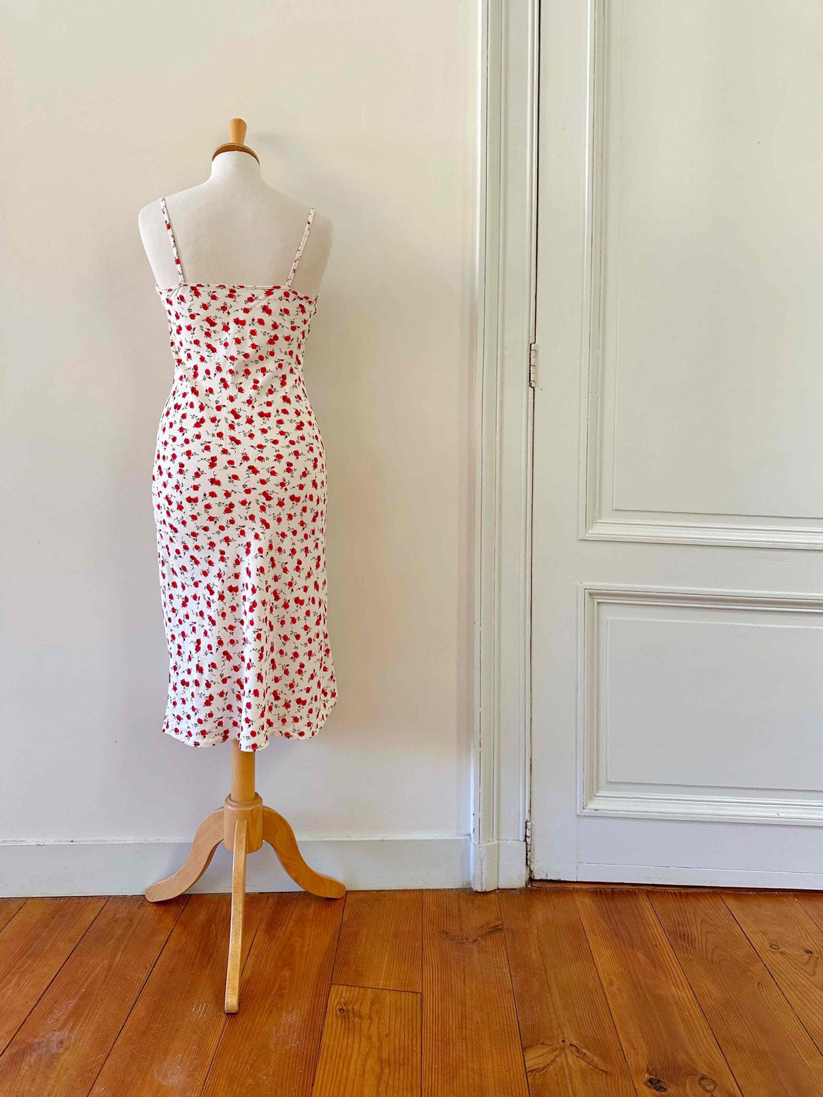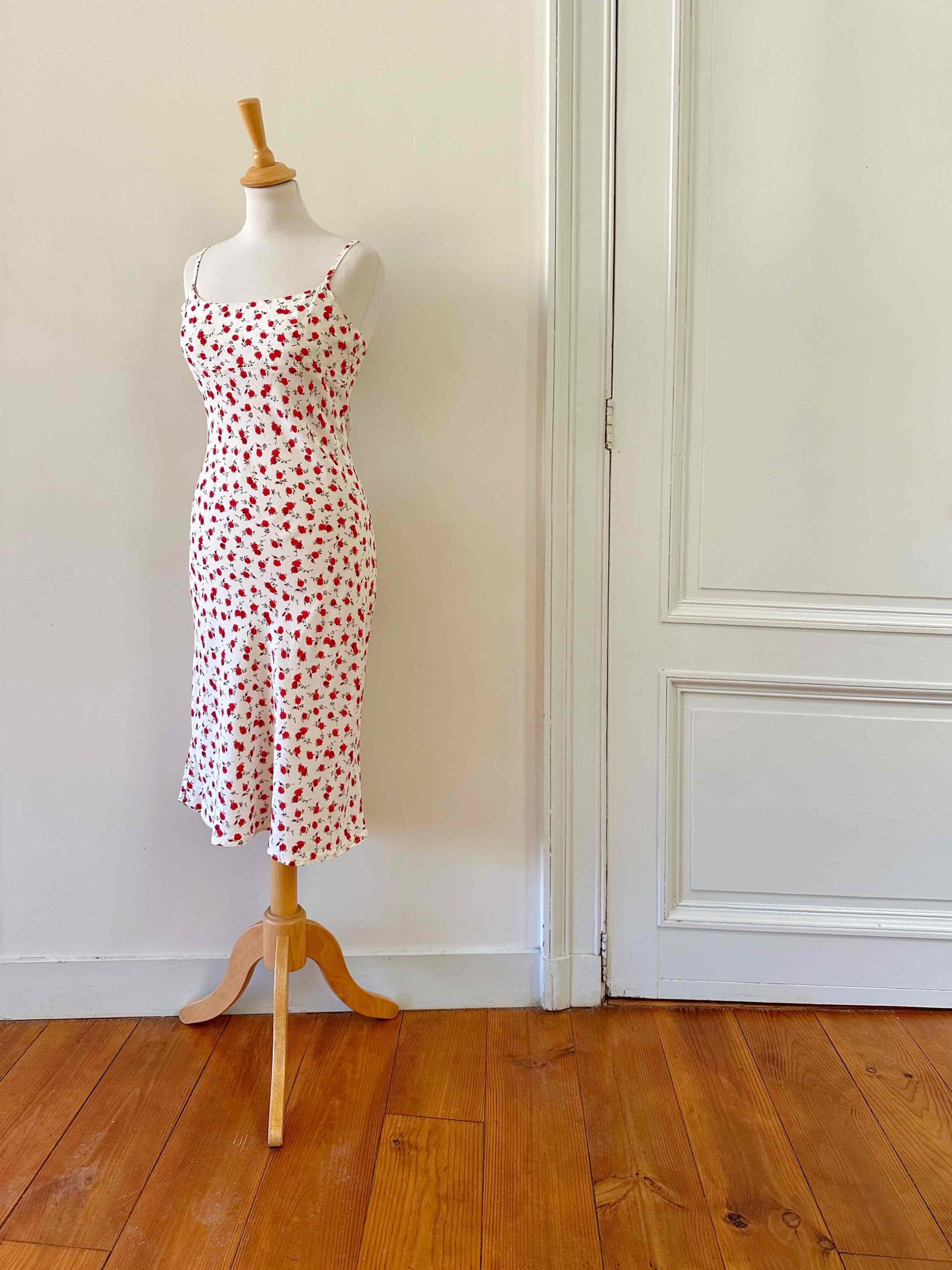 Prix unitaire parRobe nuisette à fleurs en viscose écrue imprimée petites fleurs rouges et vertes, bretelles spaghettis, poitrine froncée, à enfiler, années 90's, taille 34 portée ici sur un mannequin T36, aisselles 42cm