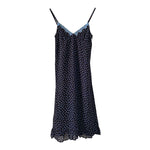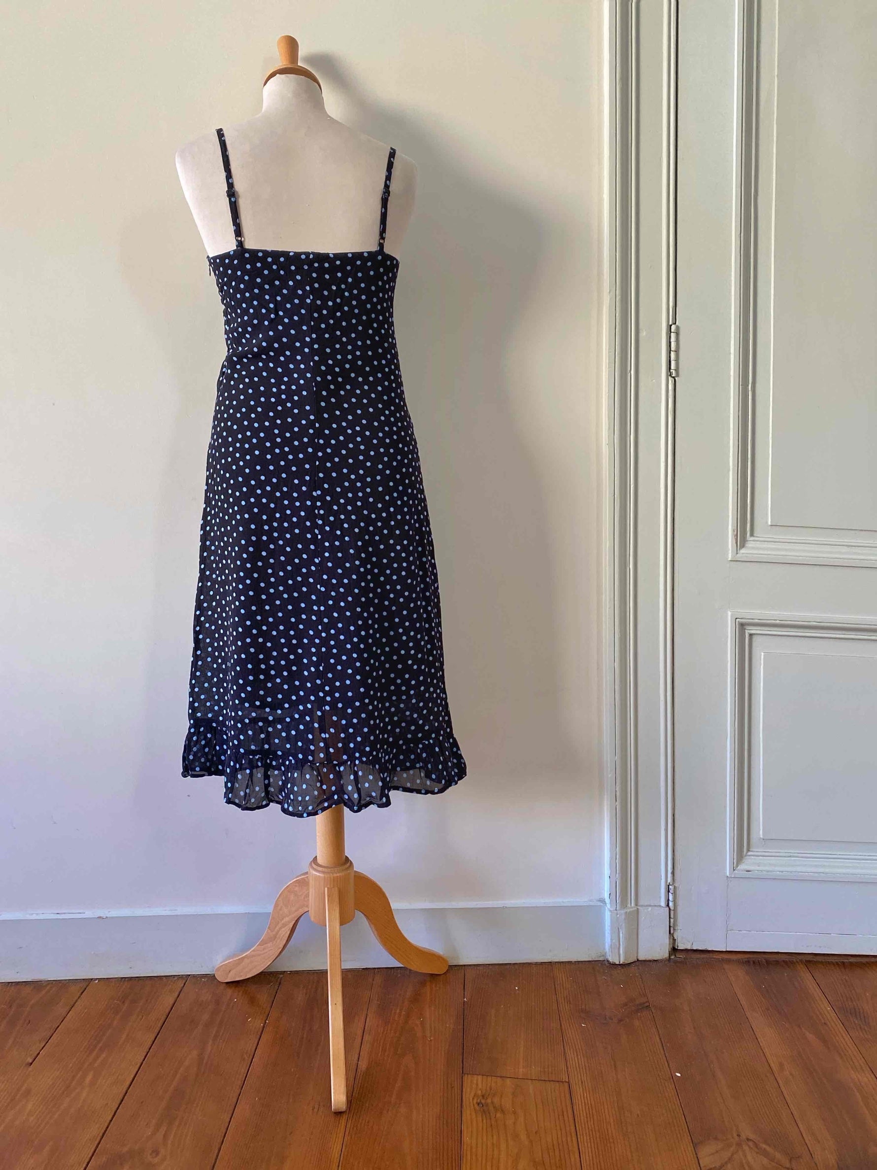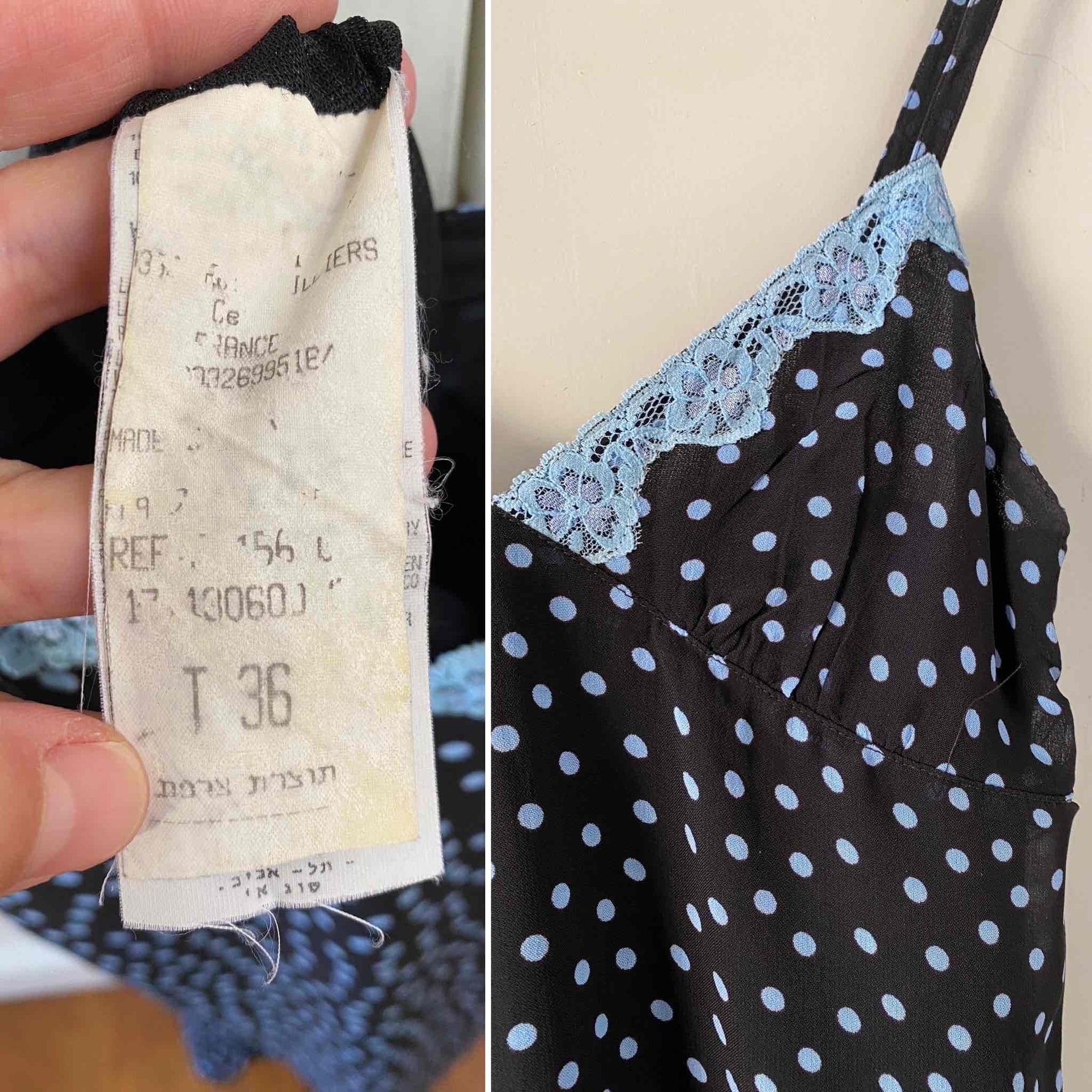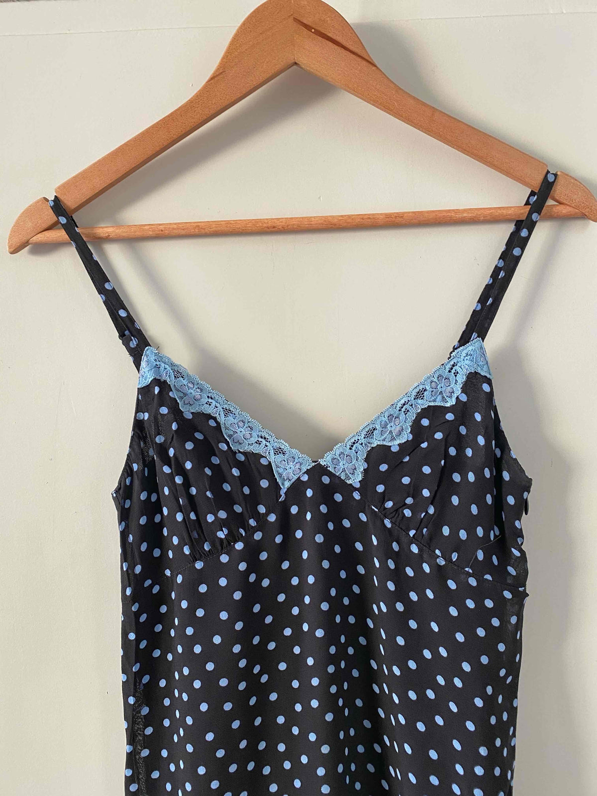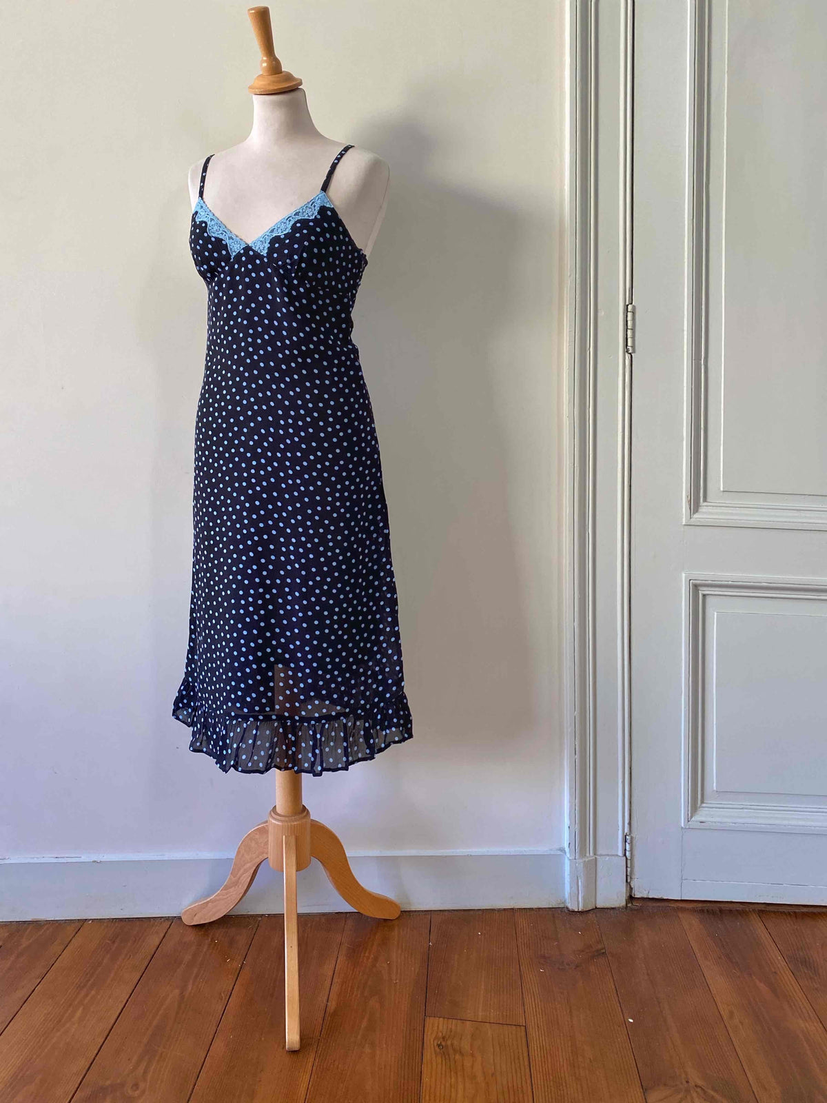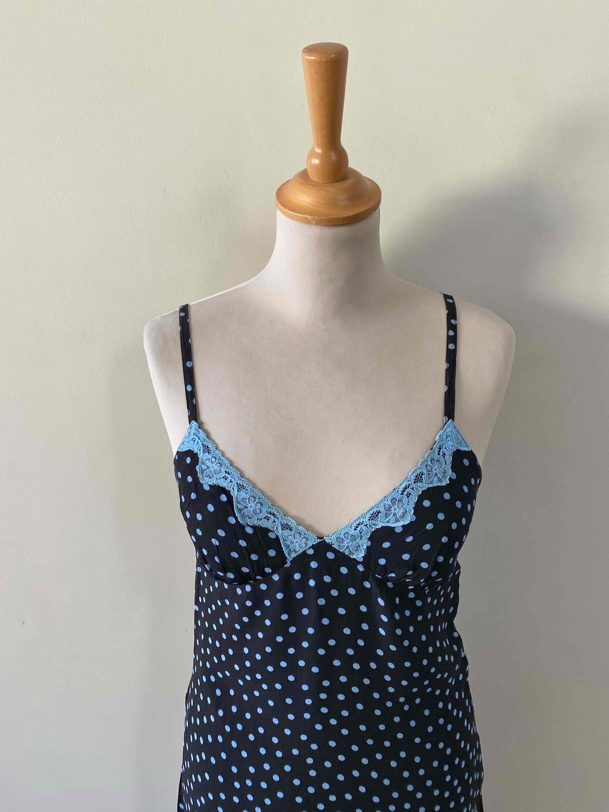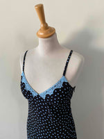 Prix unitaire parRobe nuisette à pois en voile viscose noire imprimée pois bleus ciel, poitrine bordée de dentelle bleue ciel, bretelles spaghettis réglables, bas volanté, y2k, fabriquée en France, taille 36 portée ici sur un mannequin T36, aisselles 43cm.