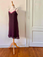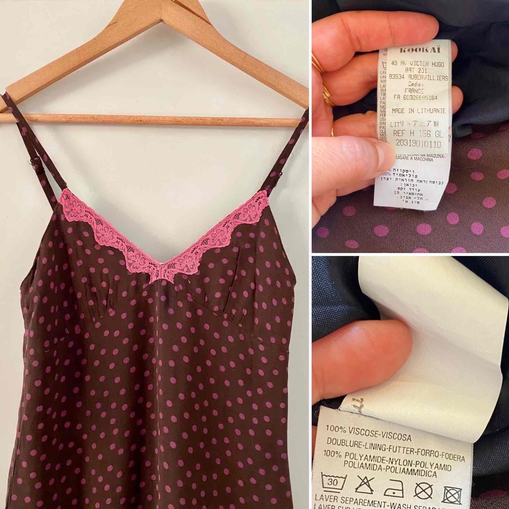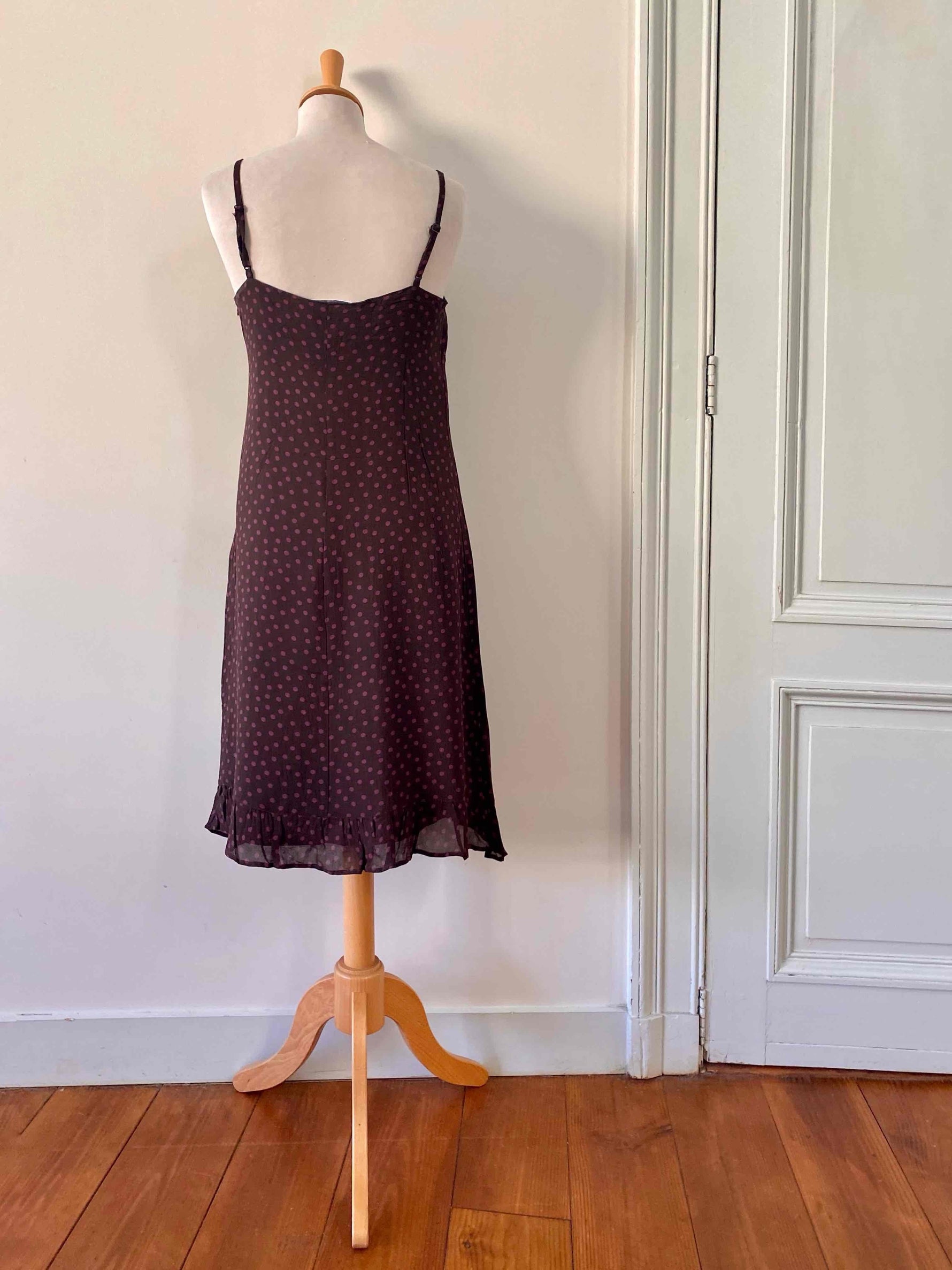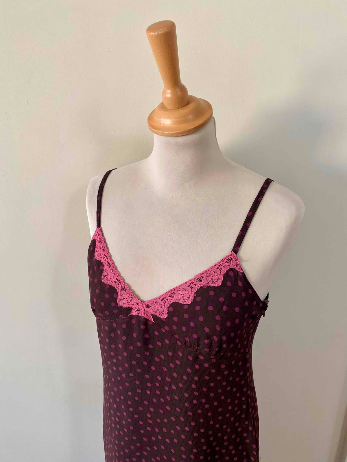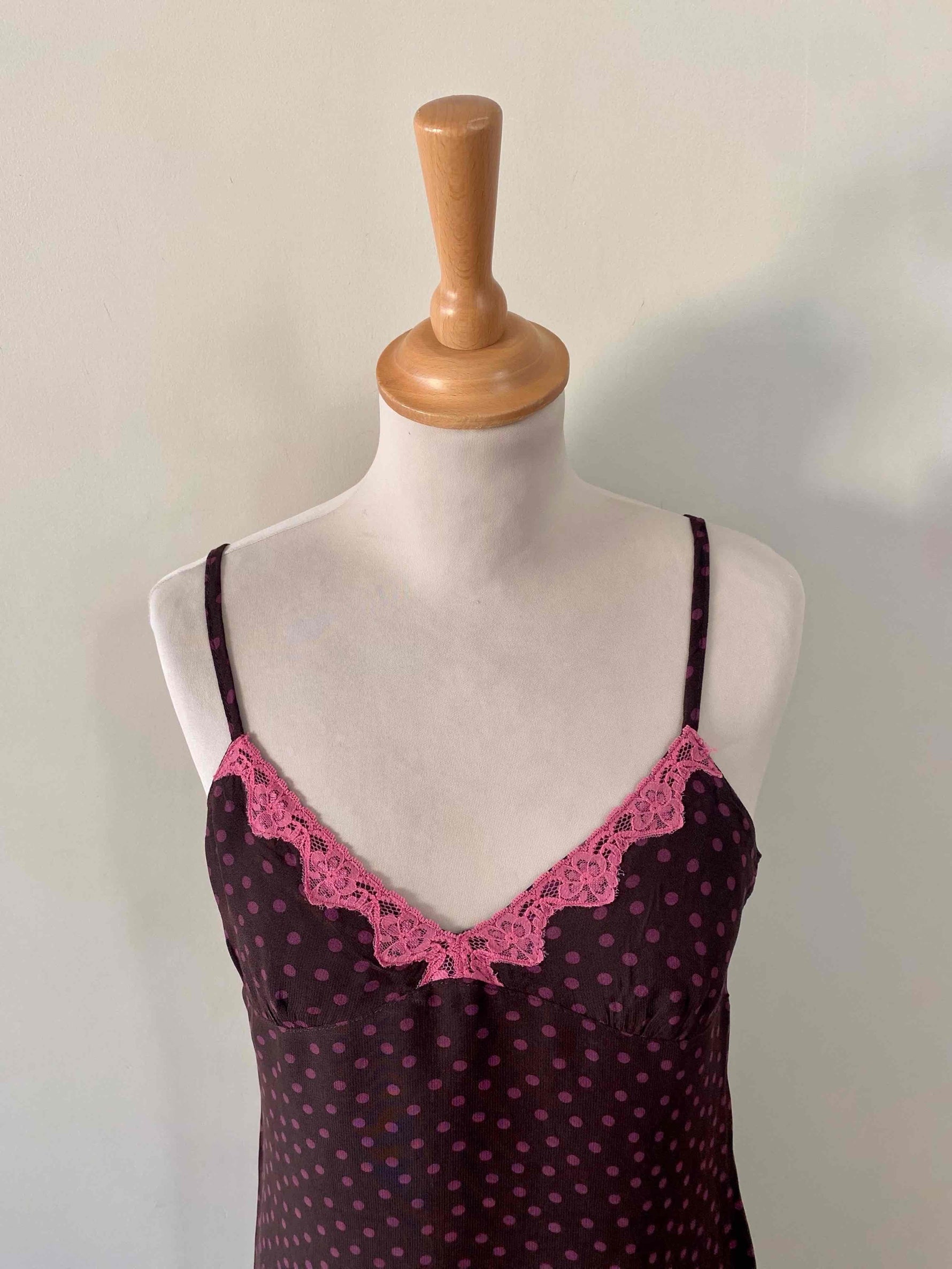 Robe nuisette à pois en voile viscose chocolat imprimée pois roses, poitrine bordée de dentelle, bretelles spaghettis réglables, bas volanté, y2k, taille actuelle 38 portée ici sur un mannequin T36, aisselles 44cm.