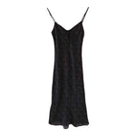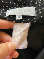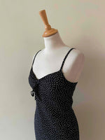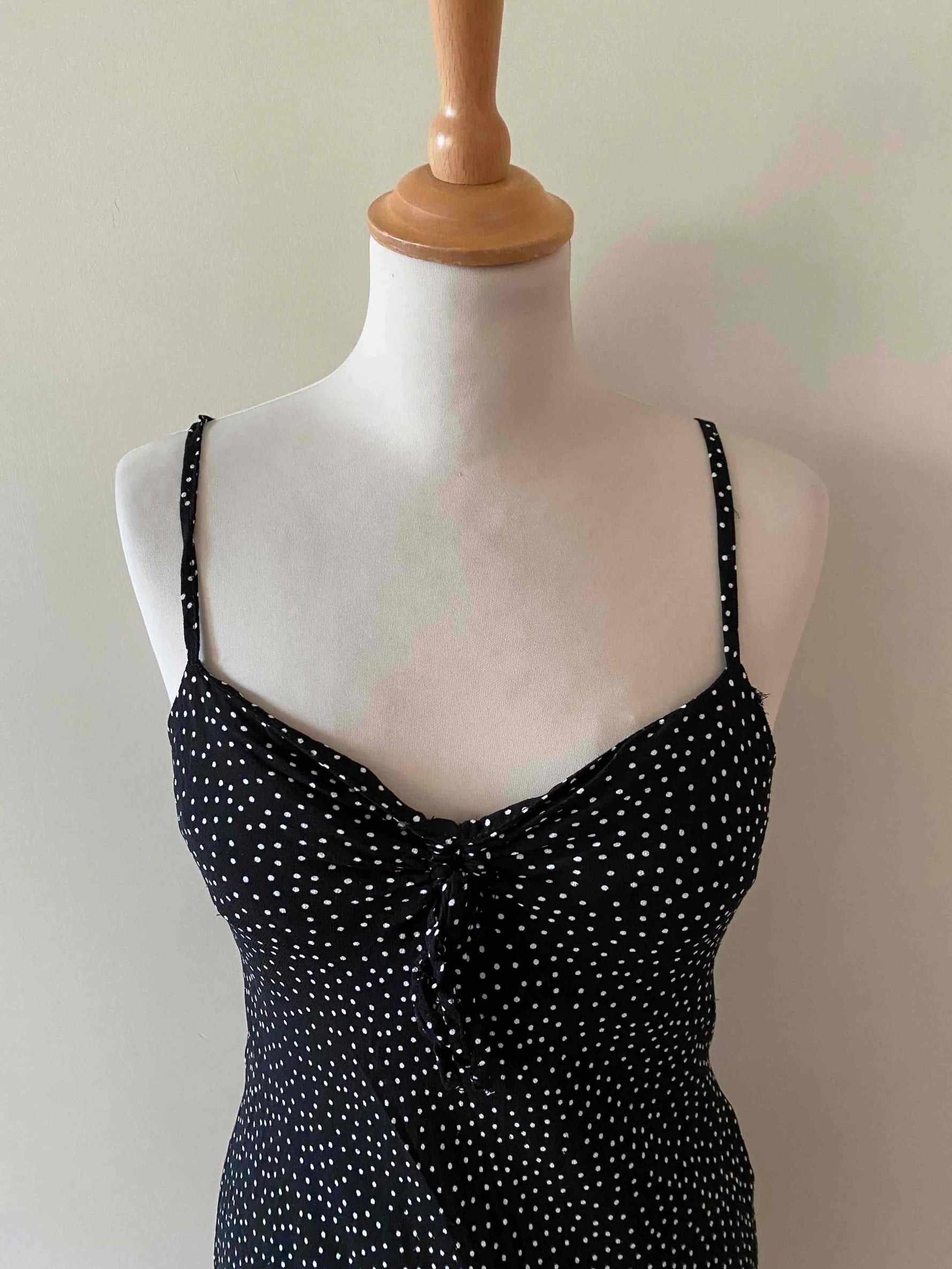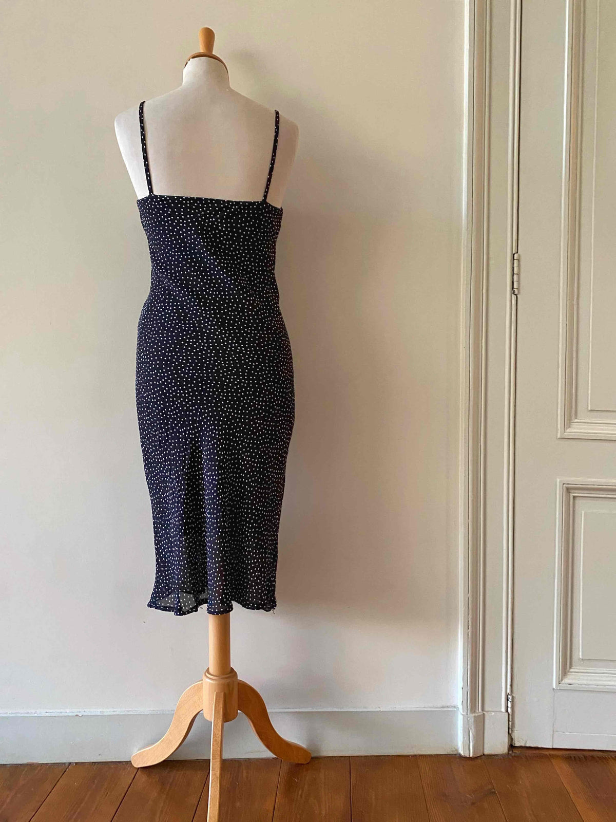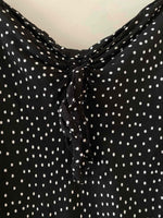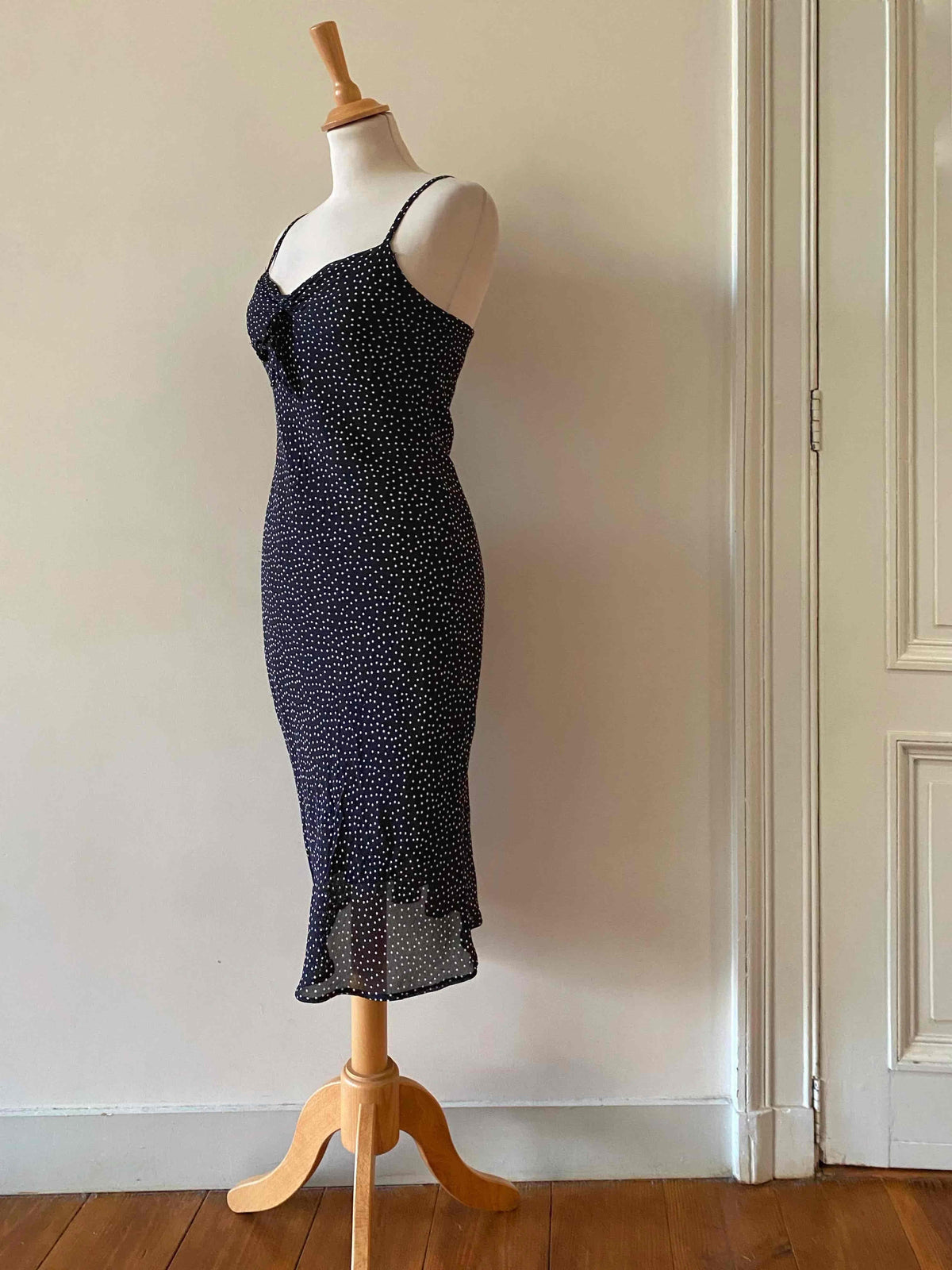 Robe nuisette à pois, en voile viscose noire imprimée pois blancs, bretelles spaghettis, poitrine froncée à nouer, forme fit and flare en biais, esprit slip dress, fabriquée en France, taille 34 actuelle portée ici serrée sur un mannequin T36, aisselles 40cm.