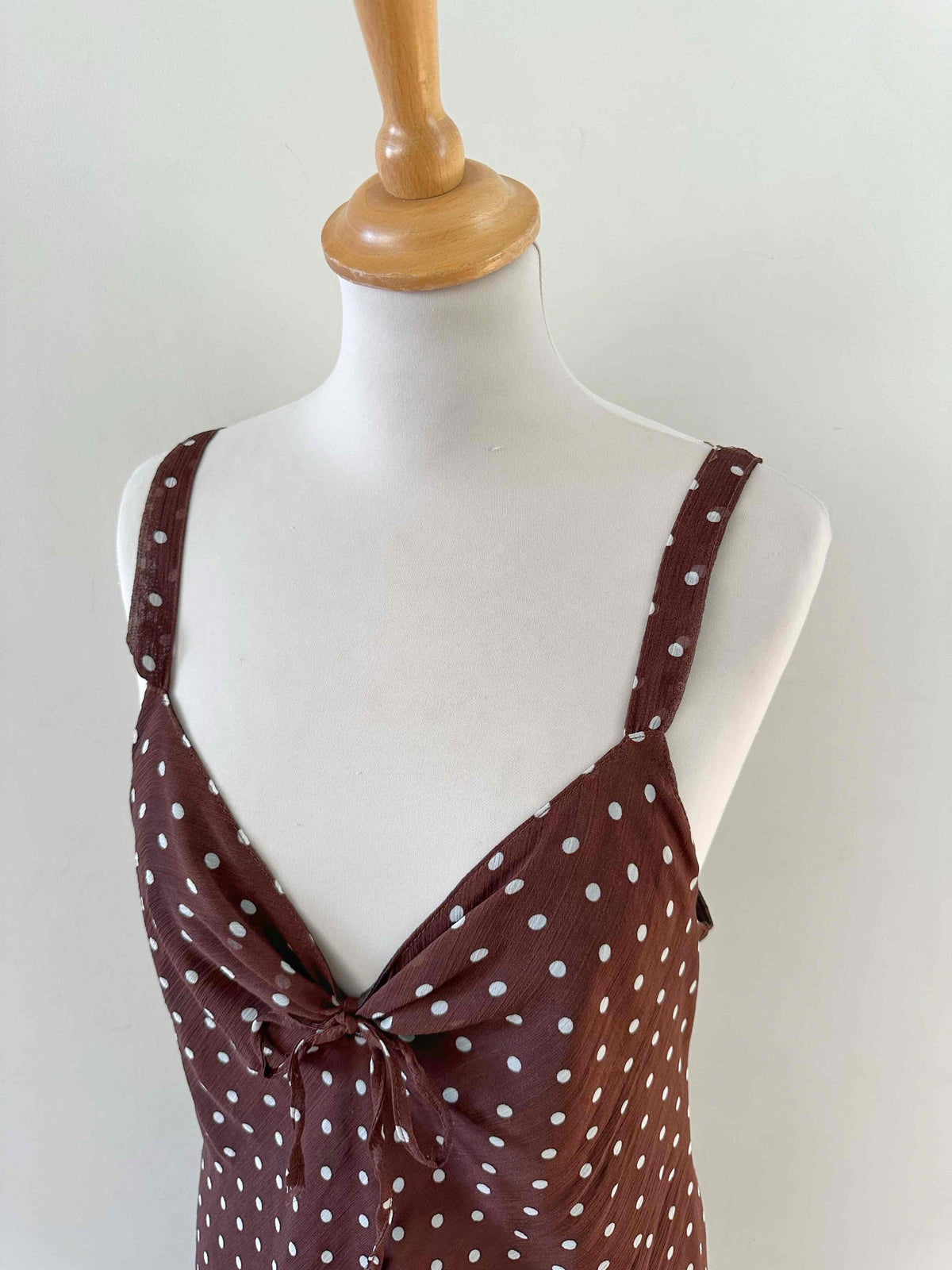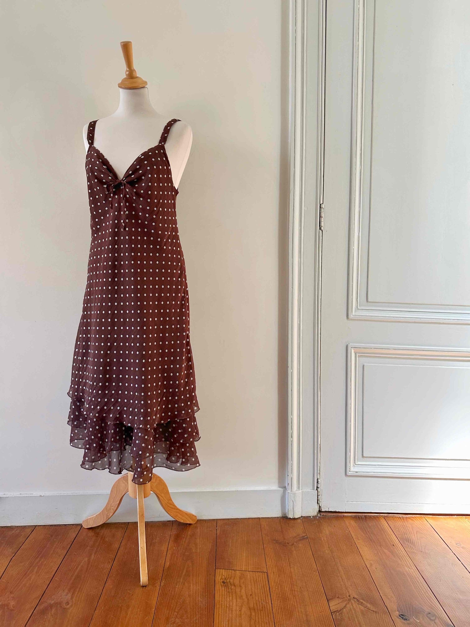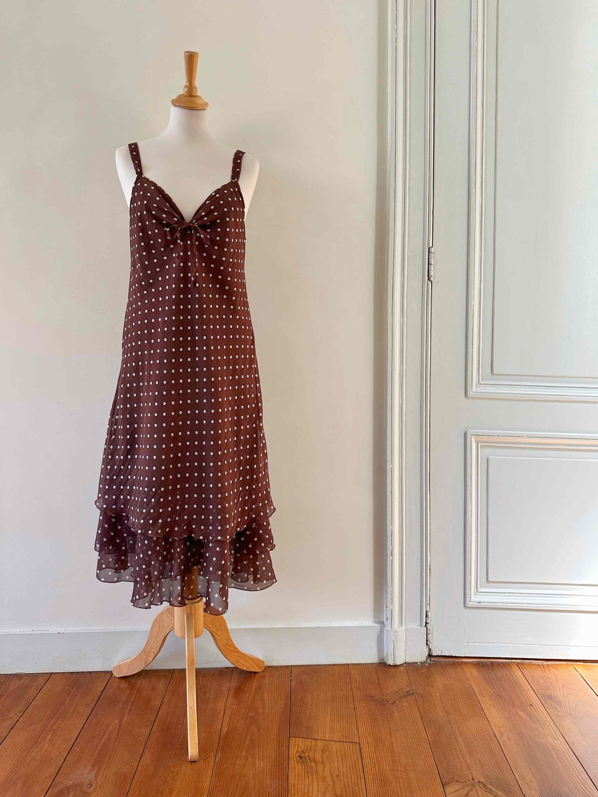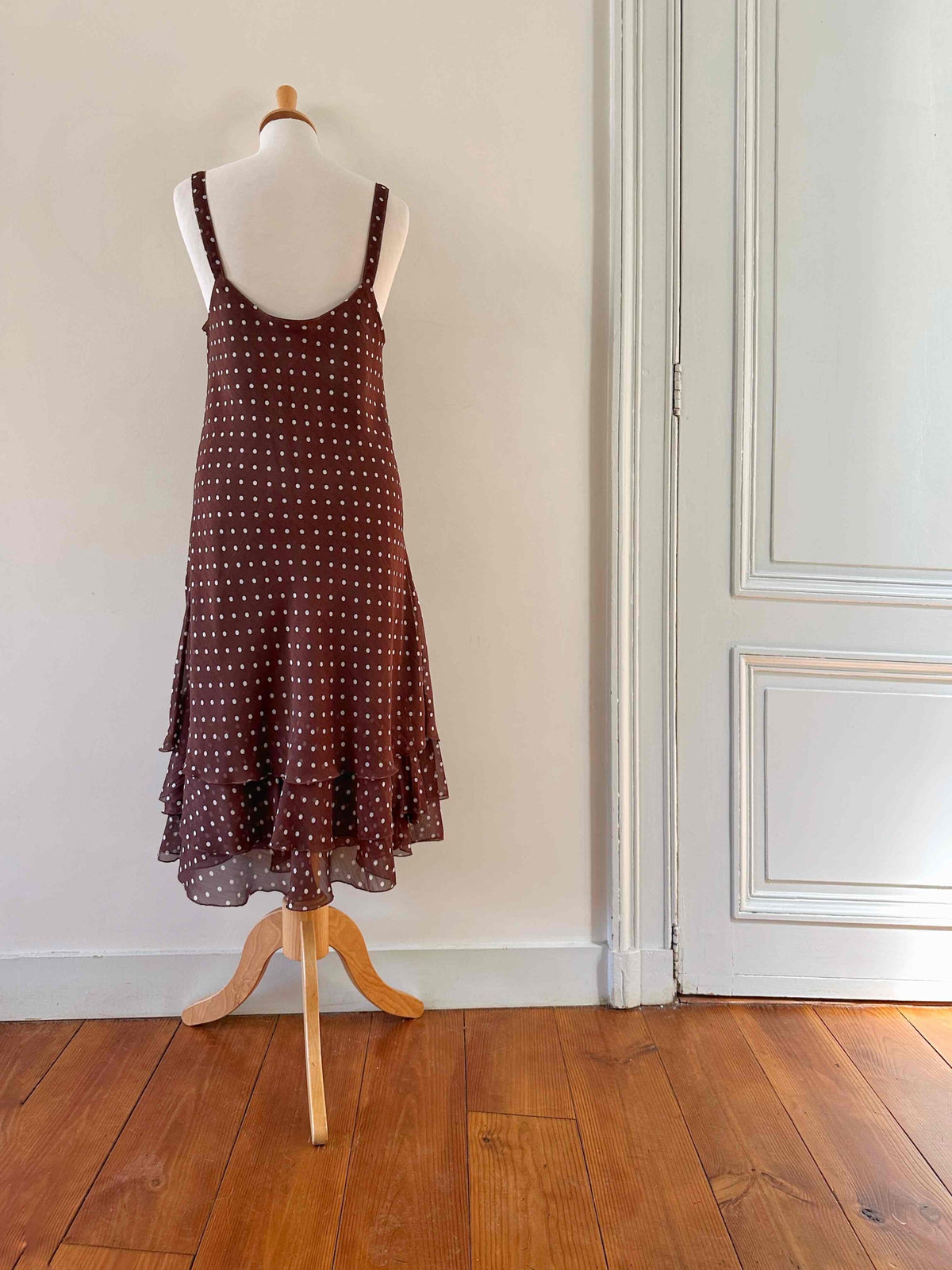 Prix unitaire parRobe nuisette à pois, en voile vicose chocolat imprimée pois blancs, poitrine froncée à nouer, taillée en biais, triple volants en bas, fabriquée en Italie, taille 38 portée ici sur un mannequin T36, aisselles 45cm.