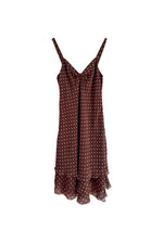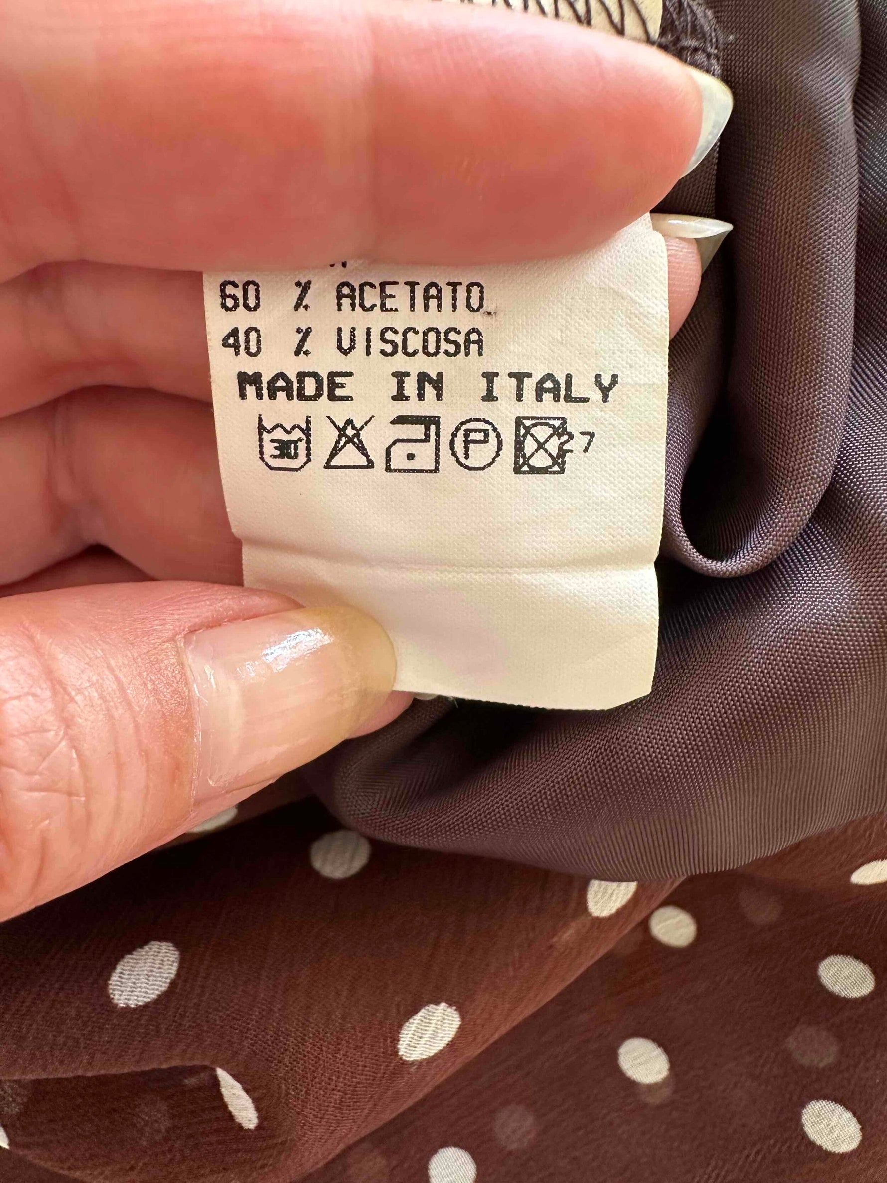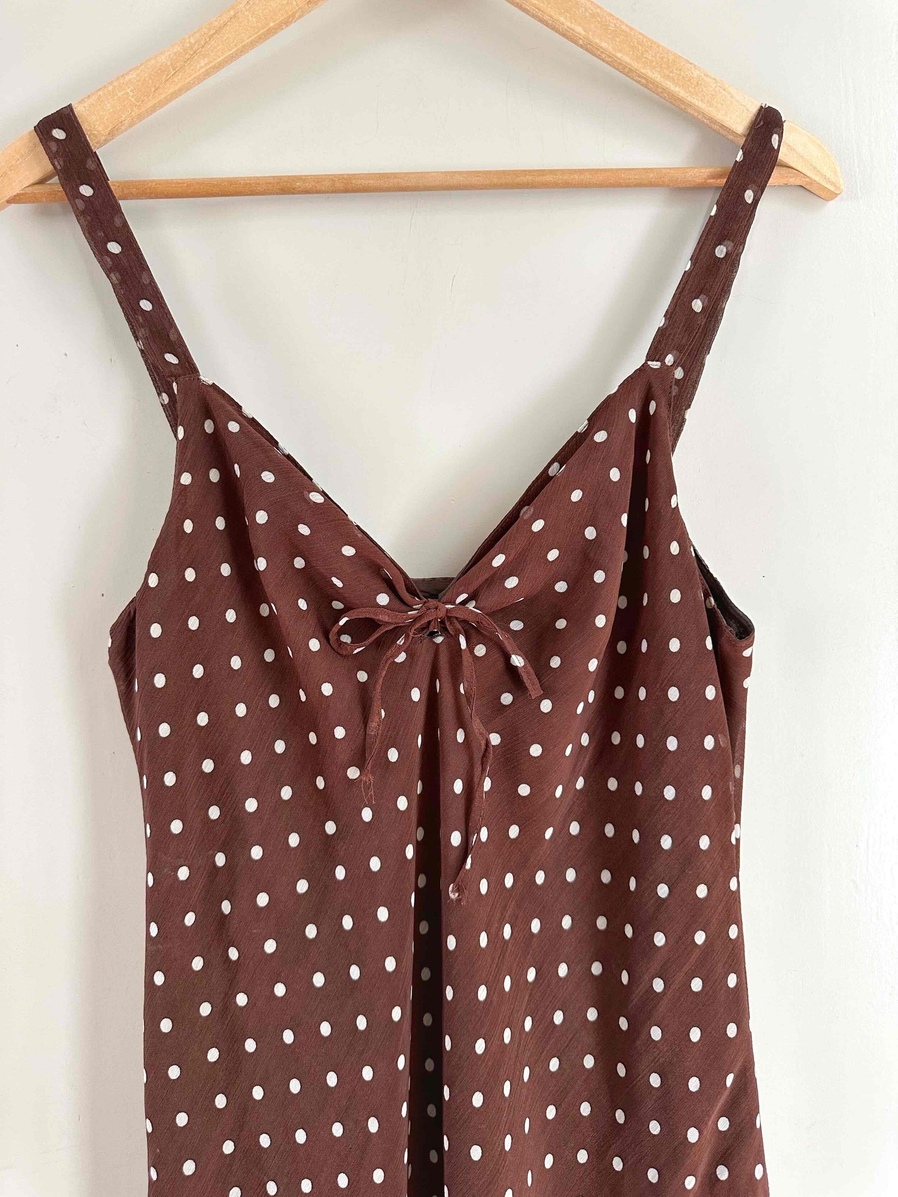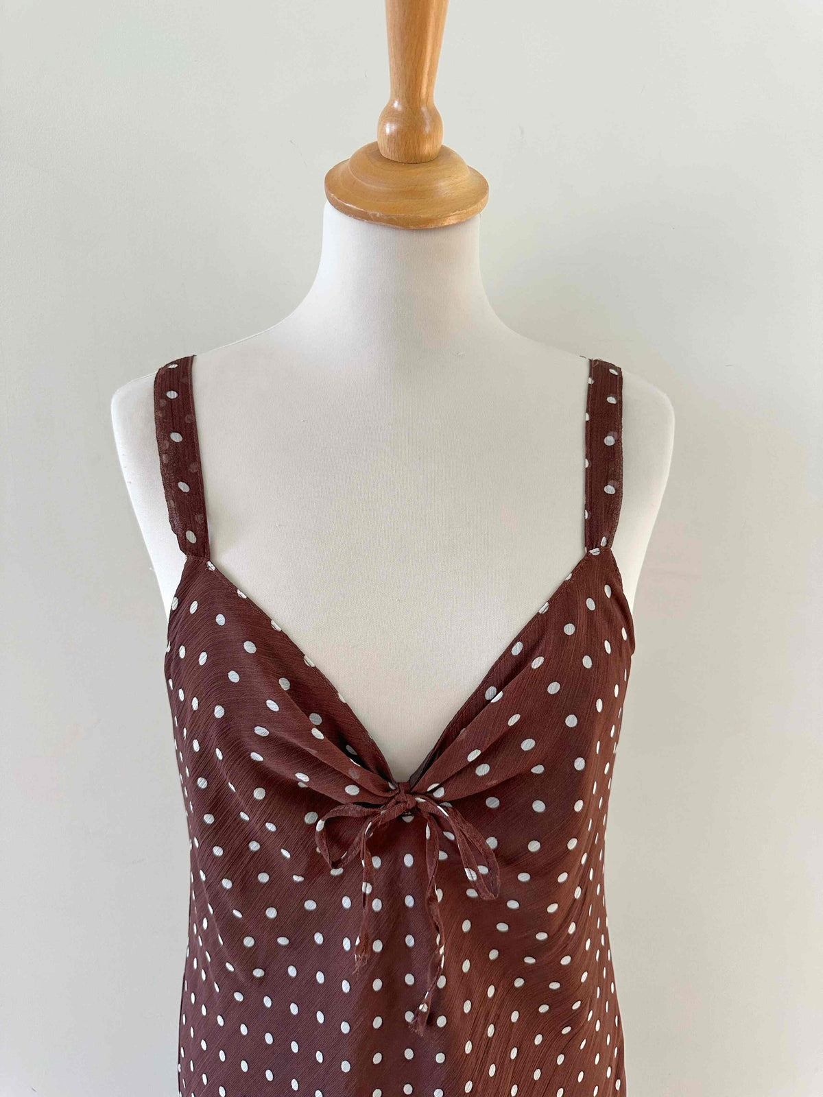 Prix unitaire parRobe nuisette à pois, en voile vicose chocolat imprimée pois blancs, poitrine froncée à nouer, taillée en biais, triple volants en bas, fabriquée en Italie, taille 38 portée ici sur un mannequin T36, aisselles 45cm.