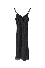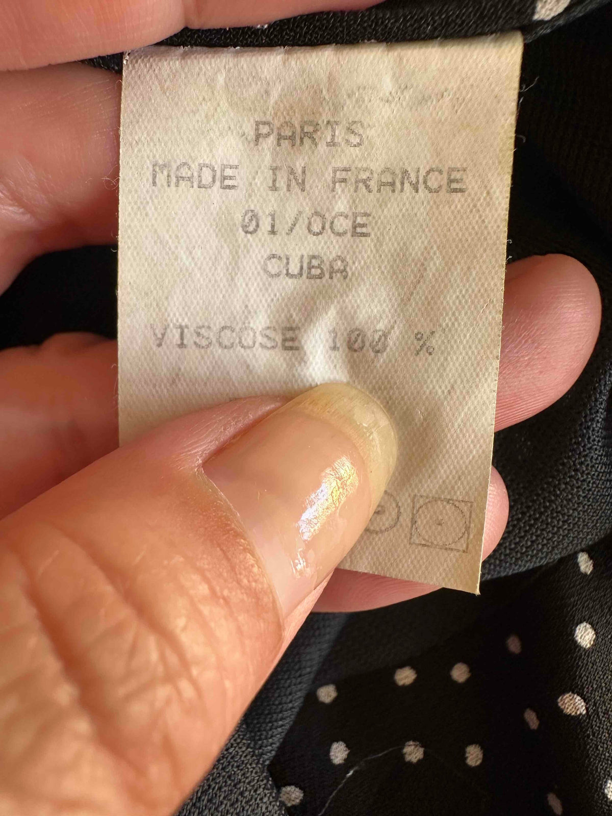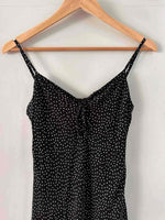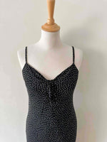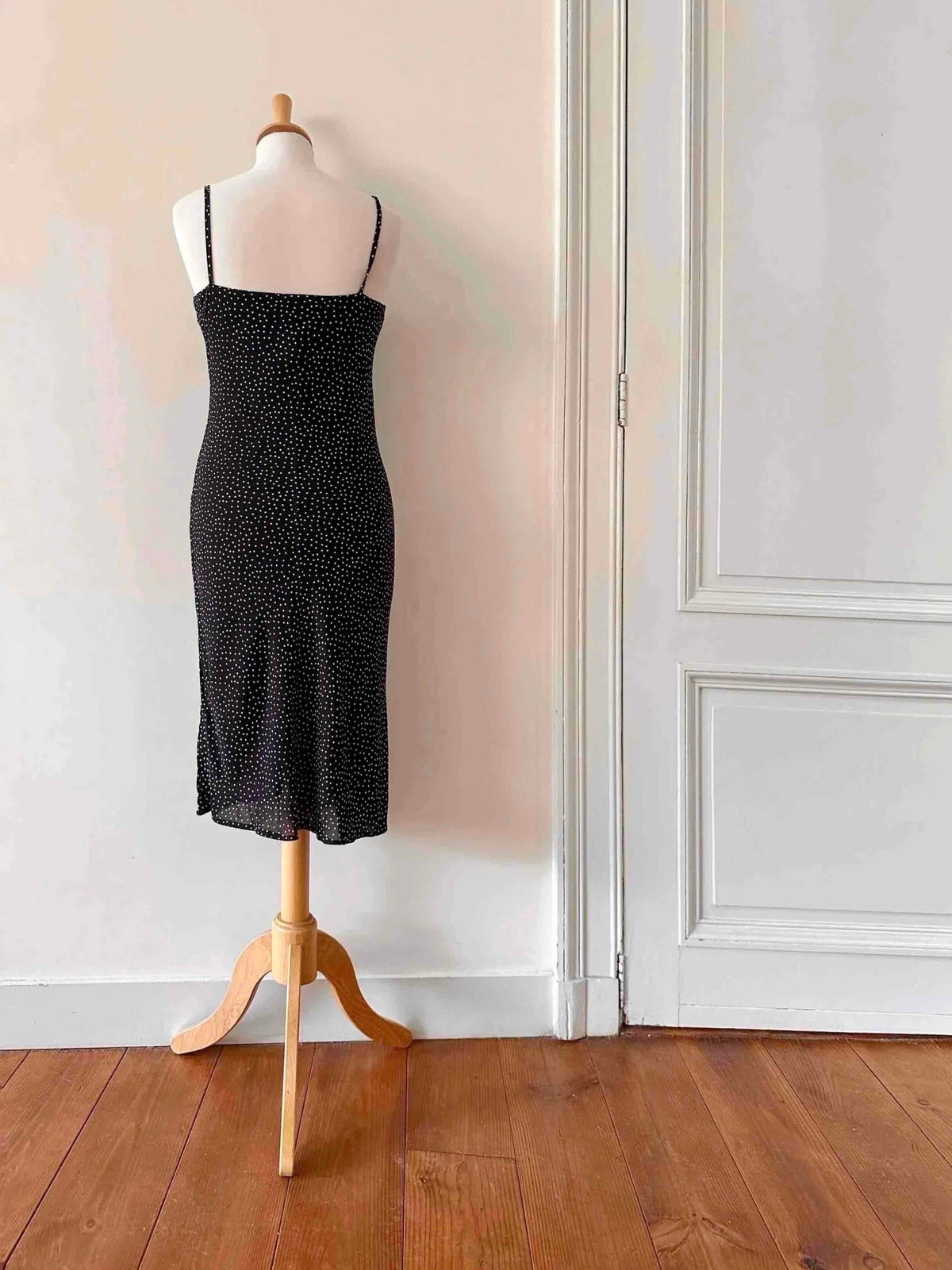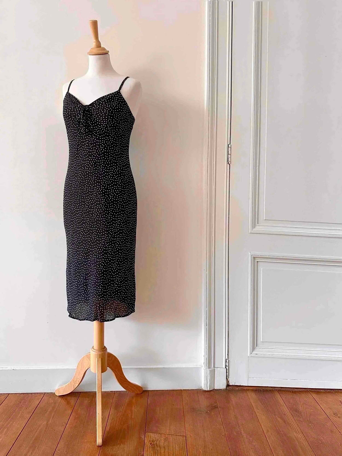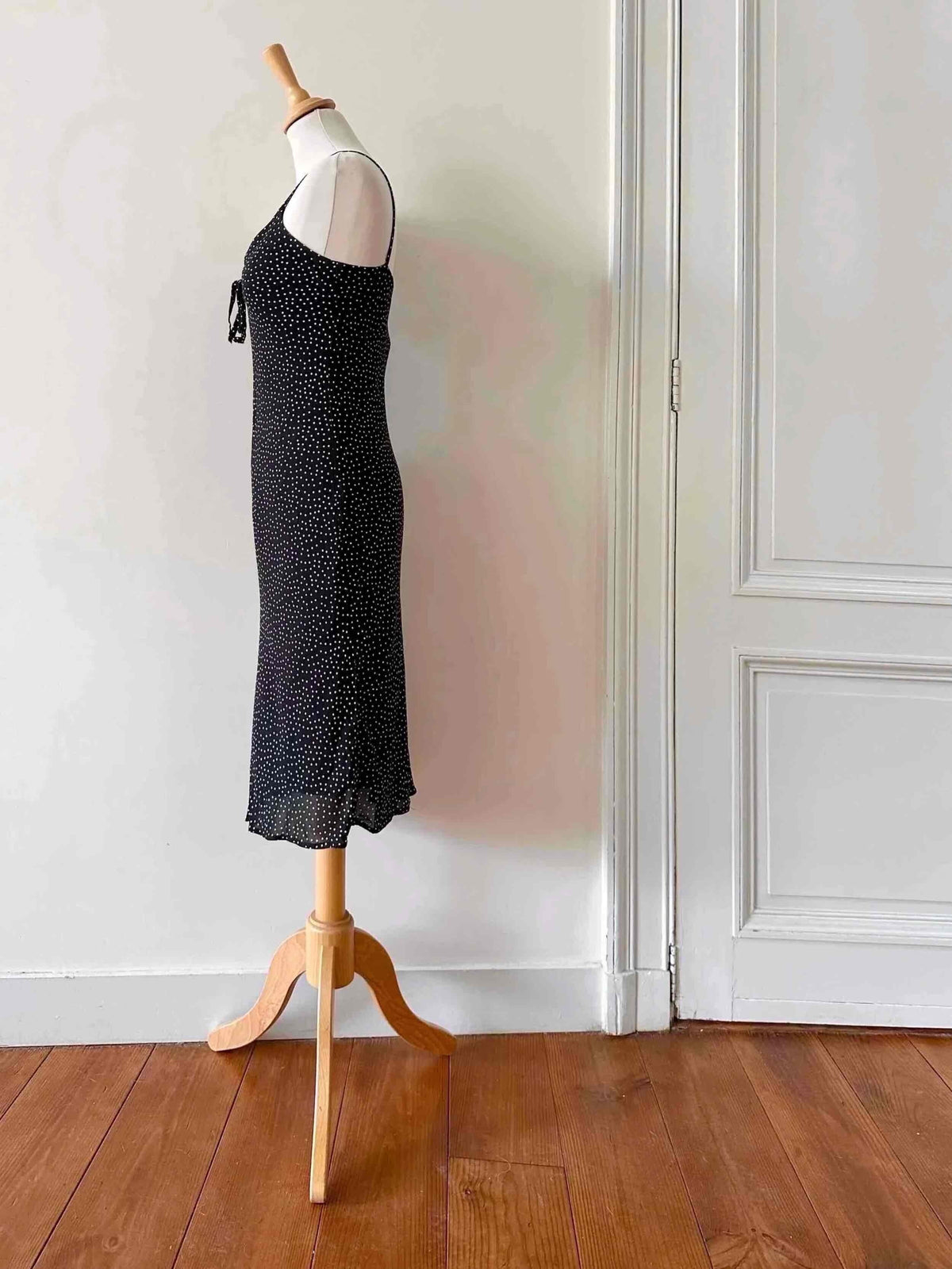 Prix unitaire parRobe nuisette à pois, en voile viscose doublée noire imprimée minis pois blancs, poitrine froncée à nouer, fines bretelles, taillée en biais, fabriquée en France, taille 36, portée ici sur un mannequin T36, aisselles 43