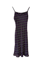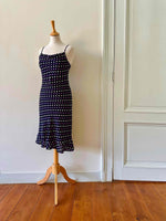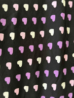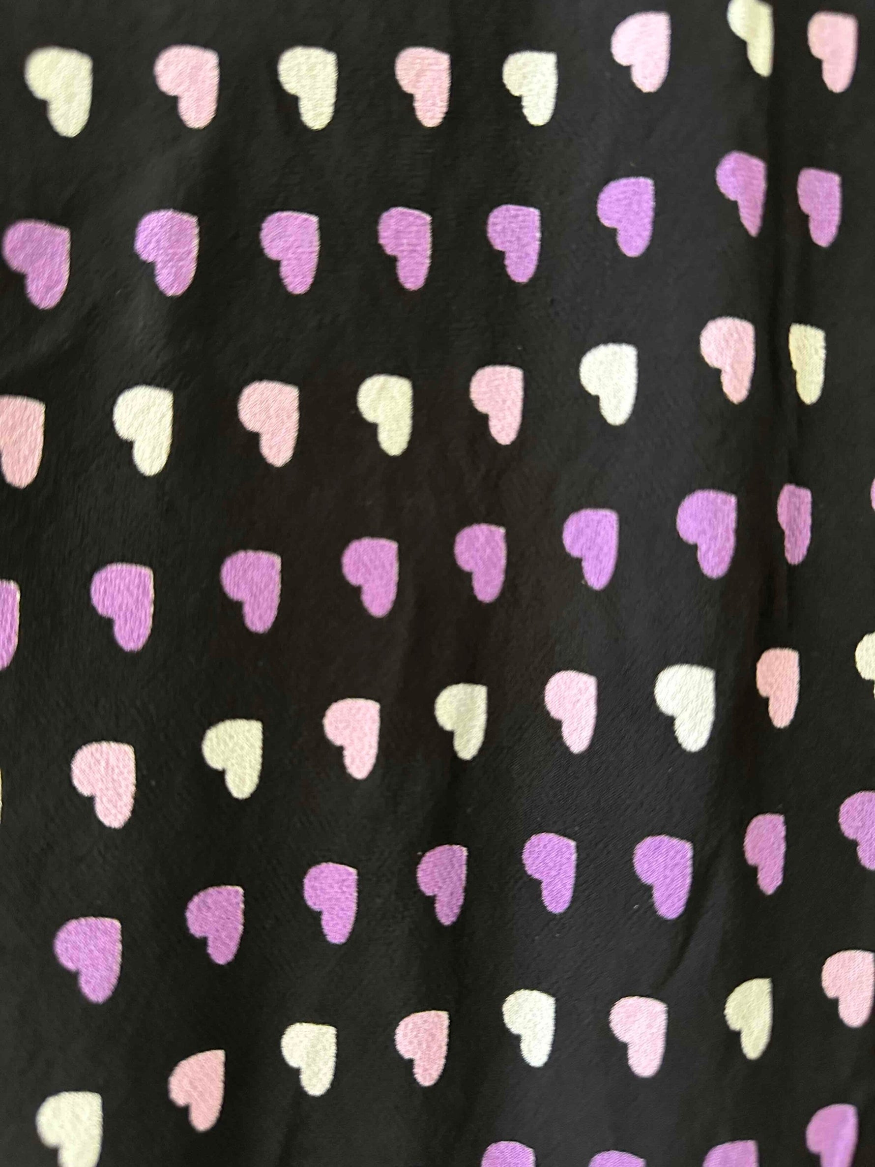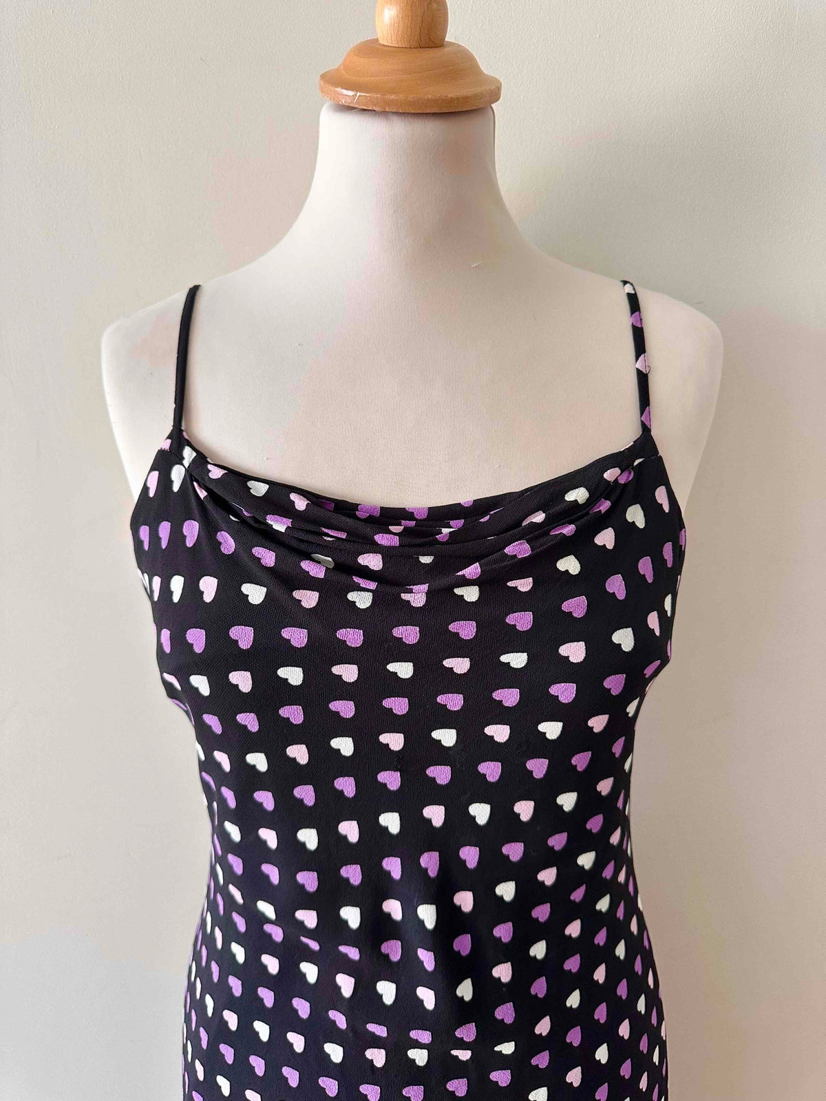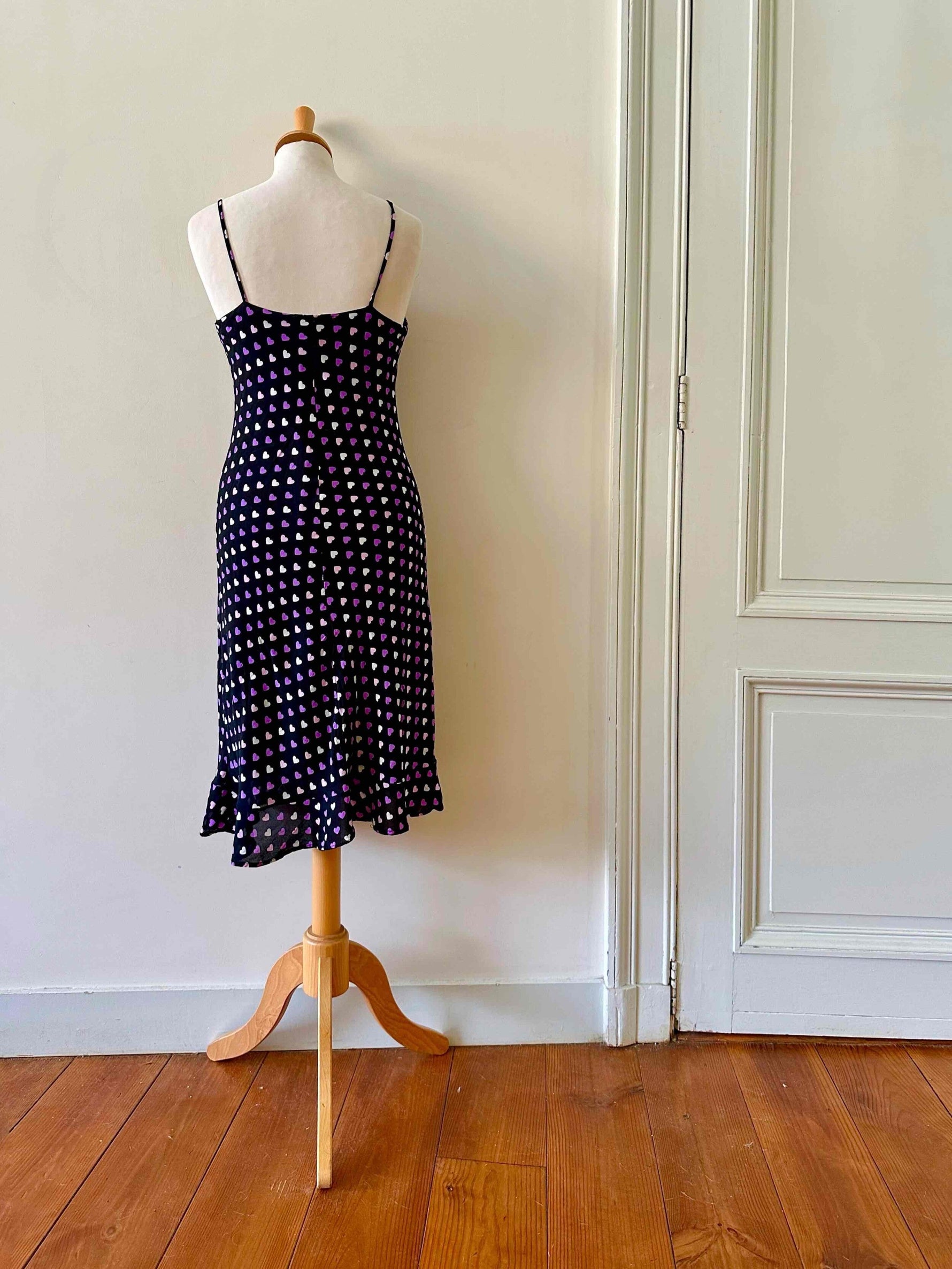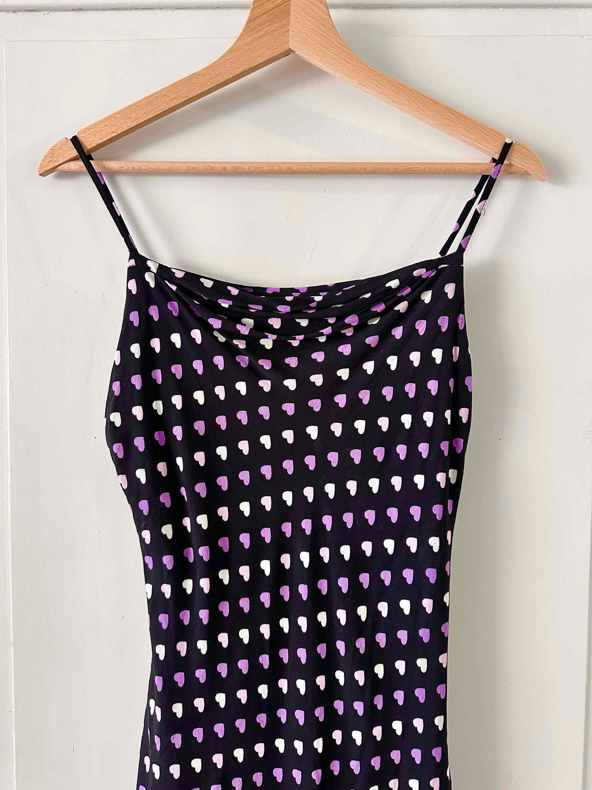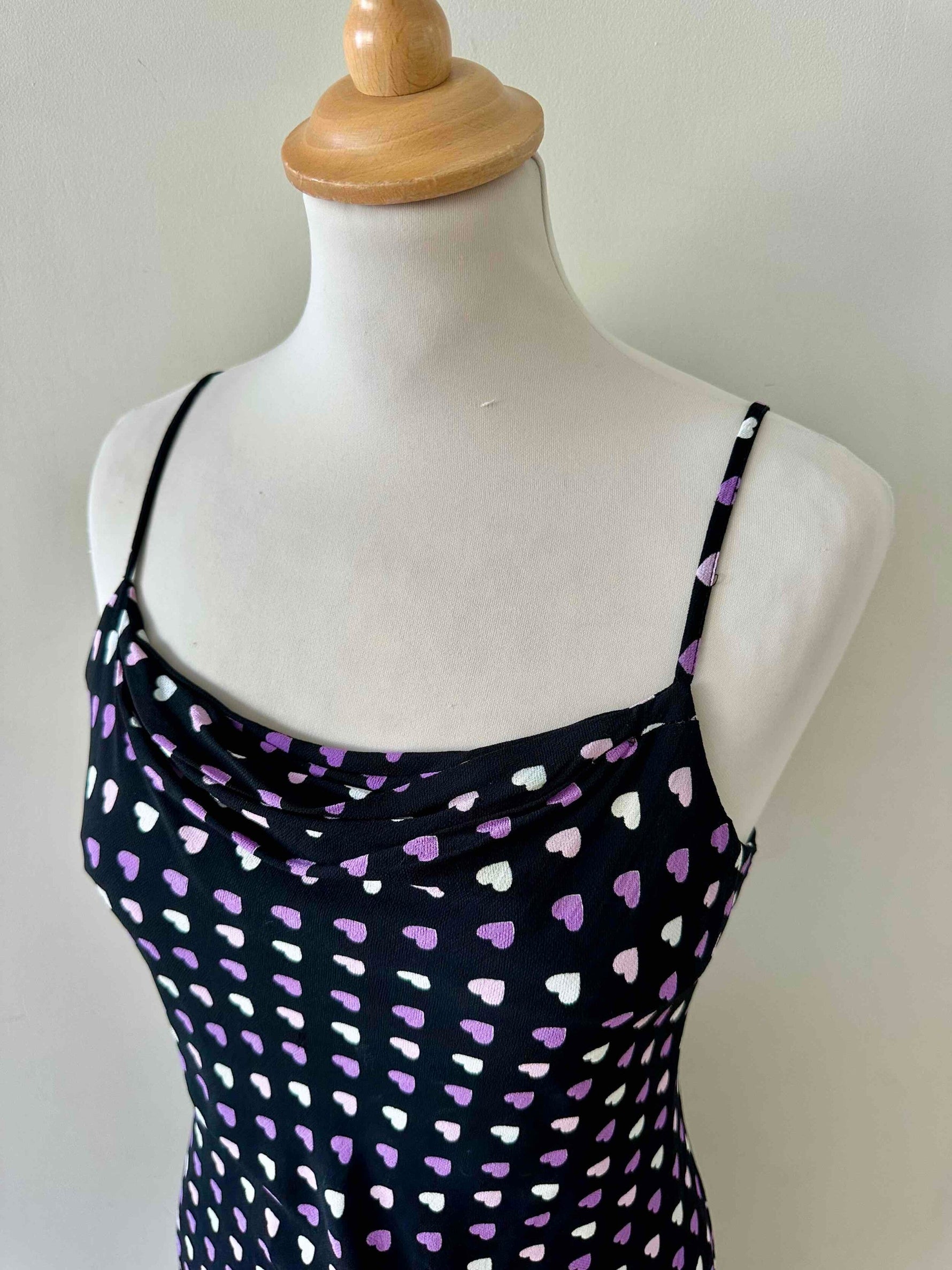 Robe nuisette cœurs, en voile viscose noire imprimée motifs coeurs violets, lilas et blancs. Bretelles spaghettis, encolure bénitier drapée, taillée en biais.