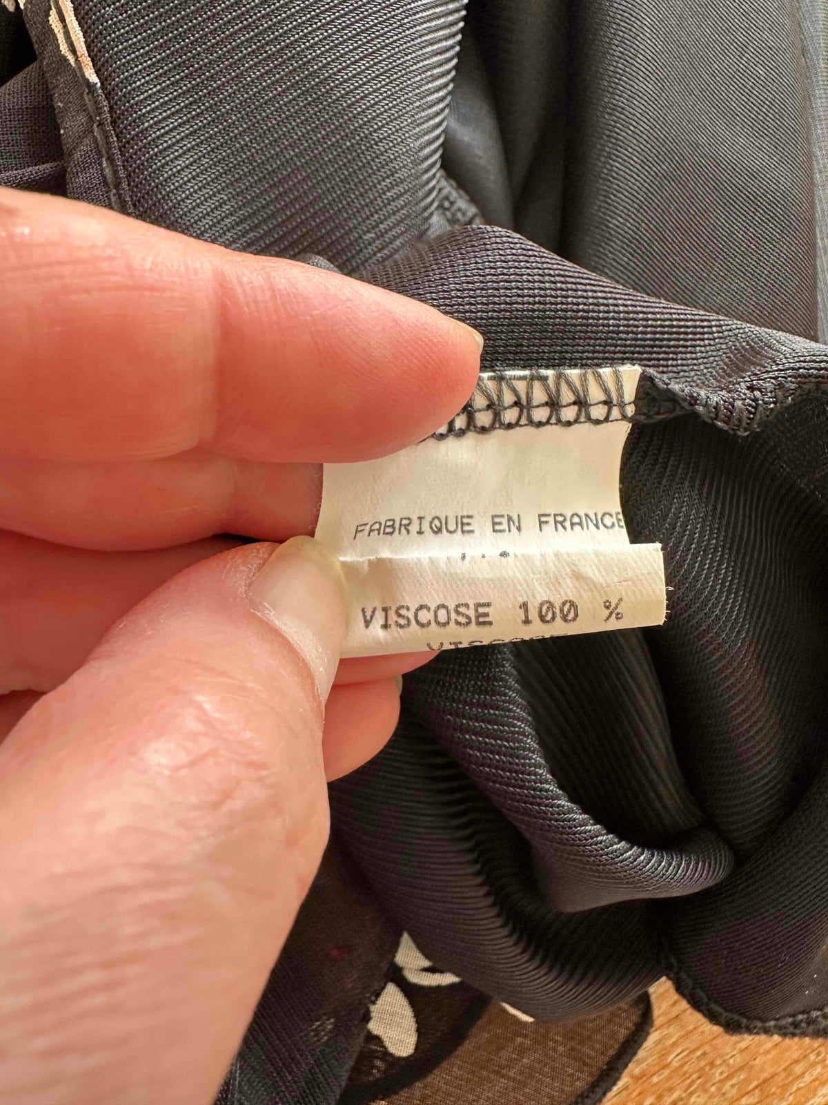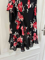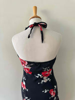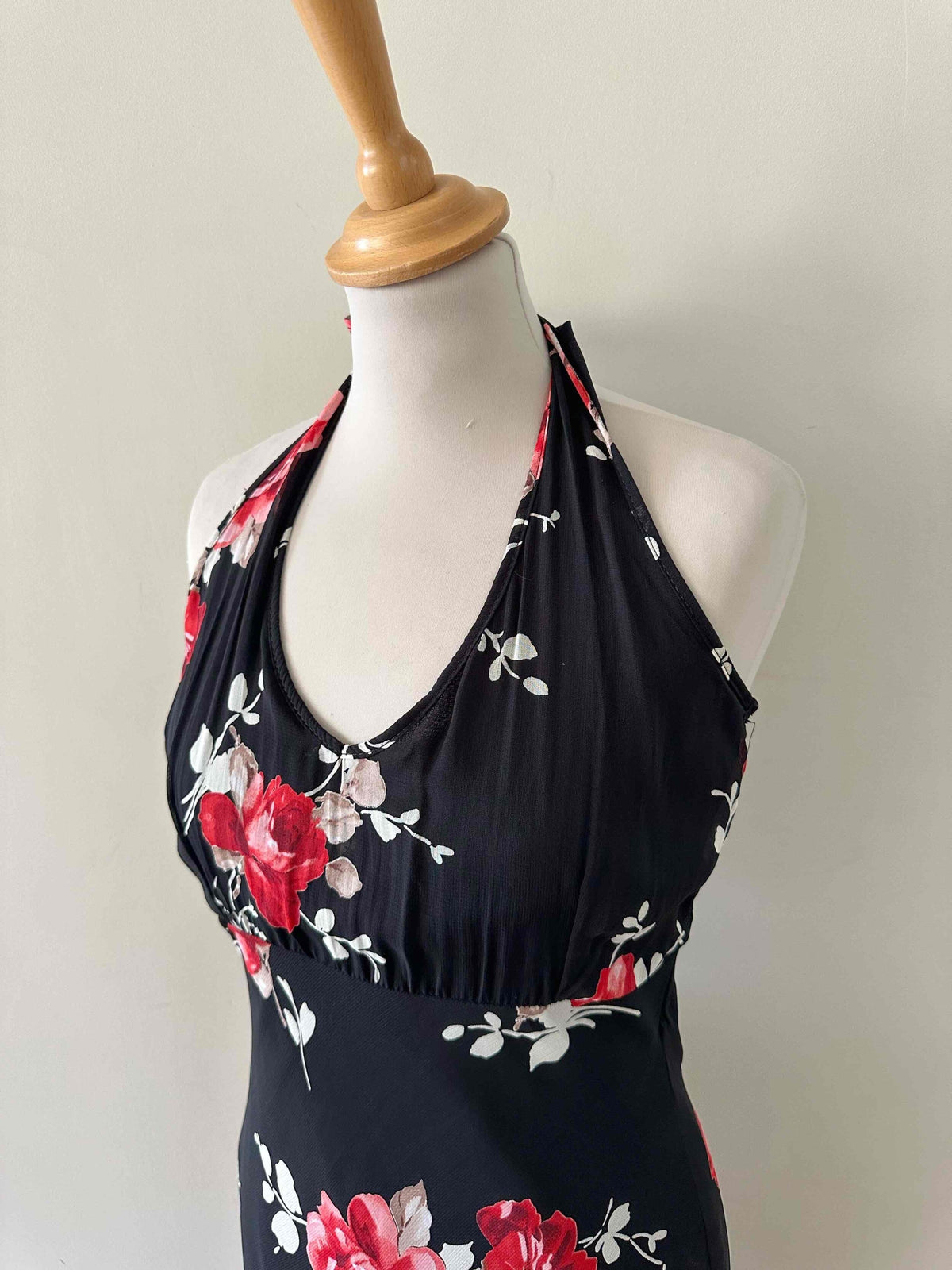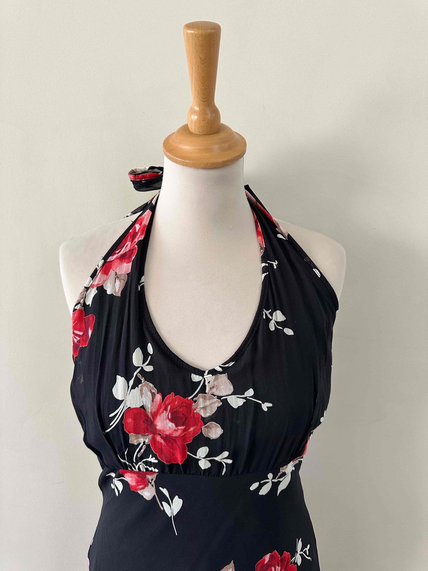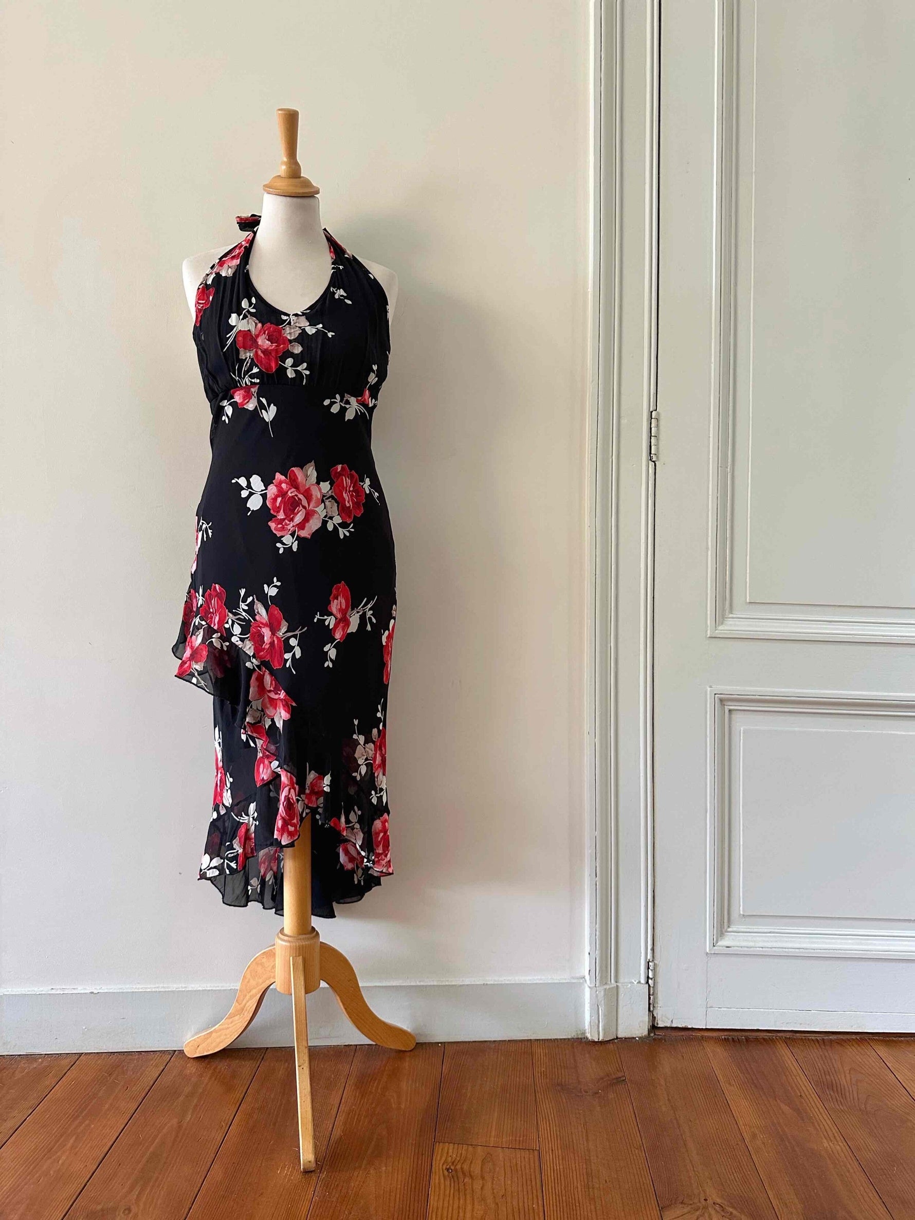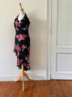 Prix unitaire parRobe nuisette dos nu, en voile viscose noir imprimé fleurs de roses rouges, découpe sous poitrine froncée et lien à nouer au col dos nu, bas volanté asymétrique, fabriquée en France, taille 36 portée ici sur un mannequin T36.
