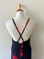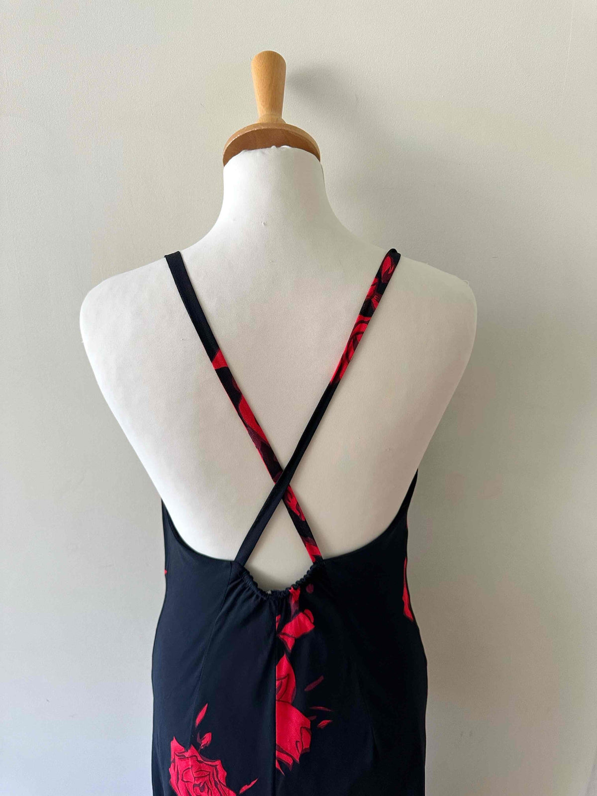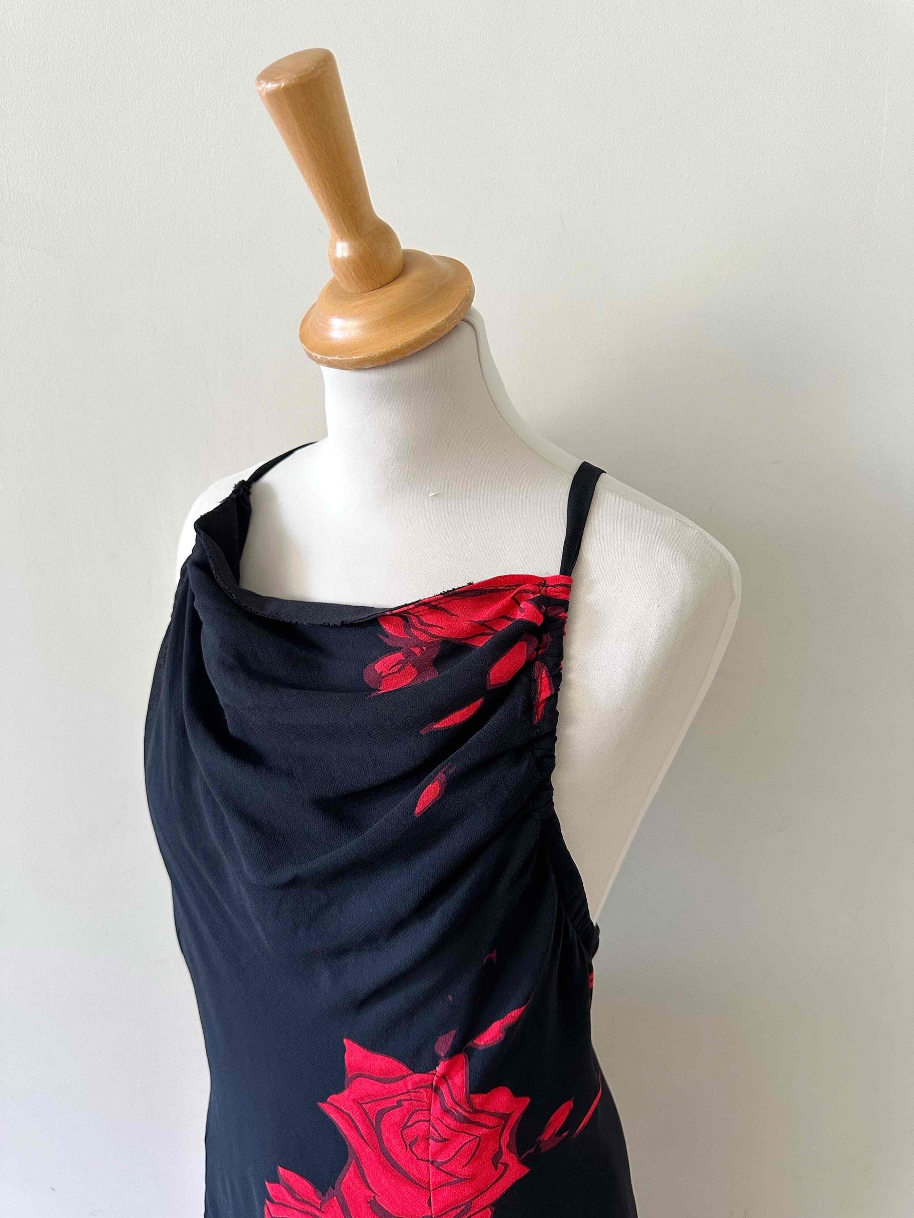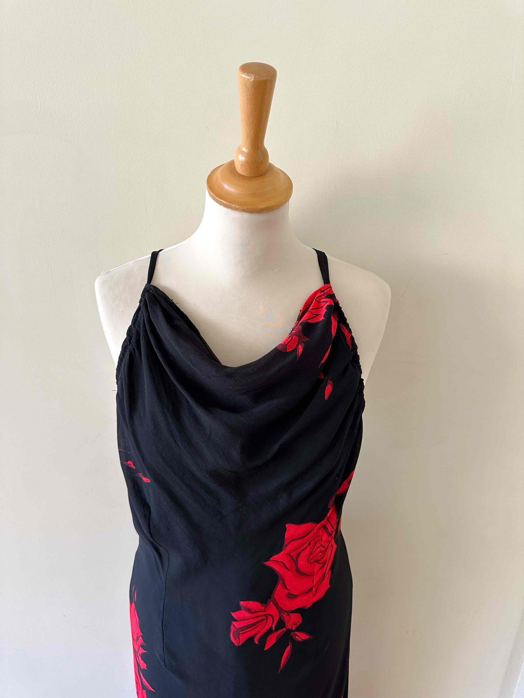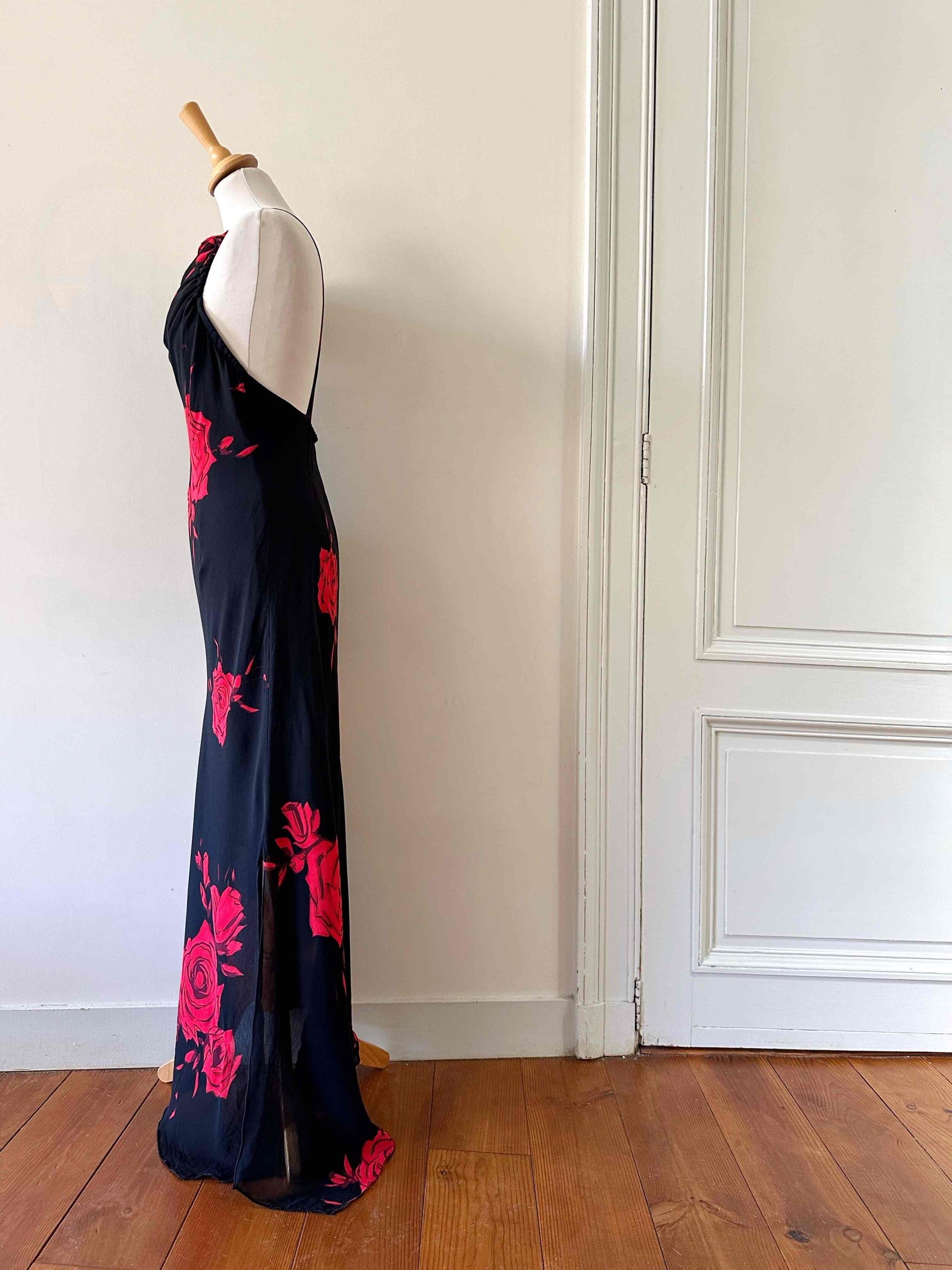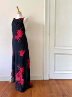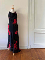 Prix unitaire parRobe nuisette dos nu, en voile viscose noire motifs grandes roses rouges, encolure drapée bénitier, bretelles froncée croisée dans le dos nu plongeant, longueur maxi, taillée en biais, bas fendu asymétrique style fairydress.