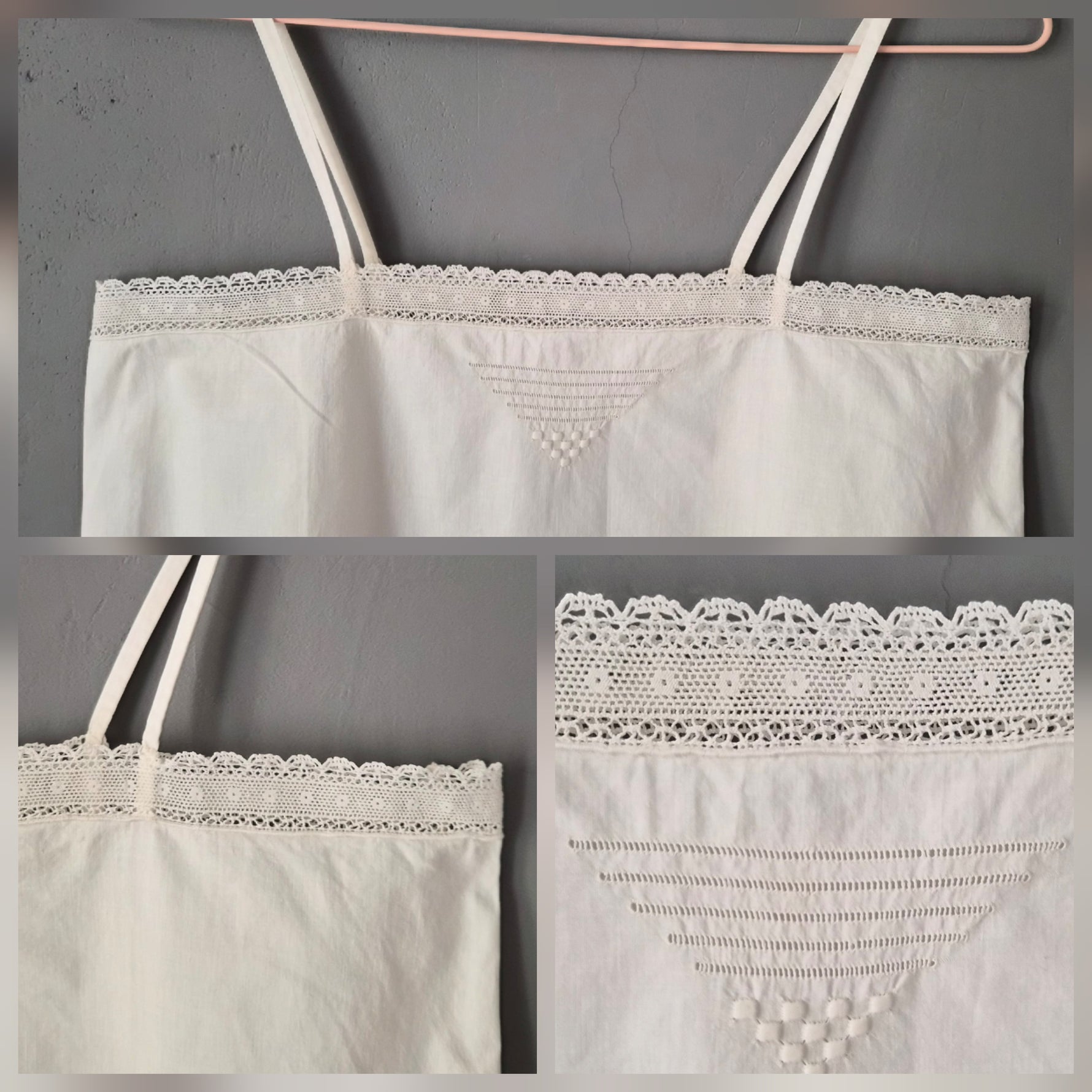 Nuisette en fil de coton blanc à bretelles fines, devant droit bordure dentelle, détails fins de petits jours et reliefs. Coutures françaises. Coupe trapèze. Pièce ancienne confection main fine et soignée. Mesures prises à plat : Aisselles 42 cm / longueur 80 cm