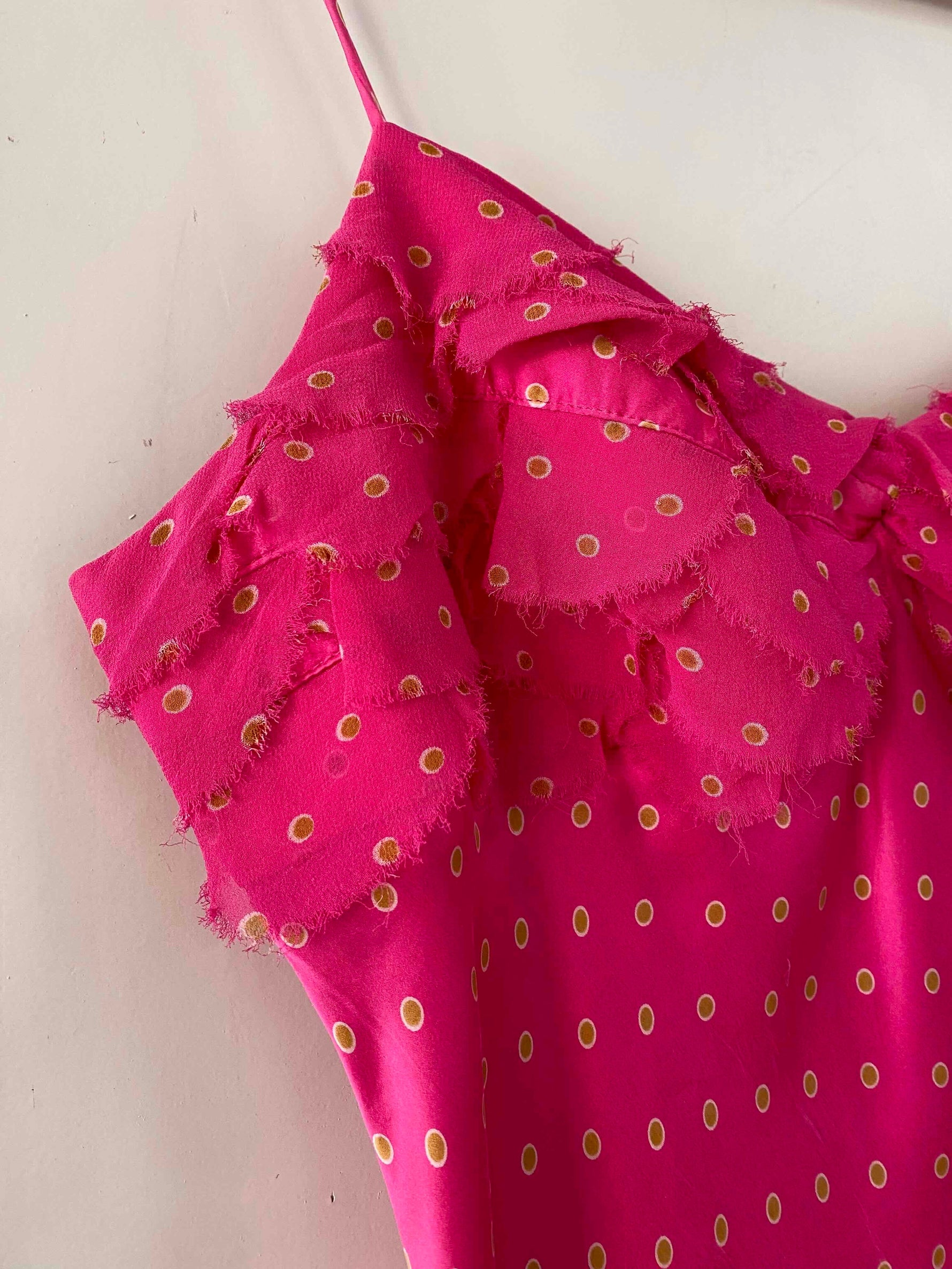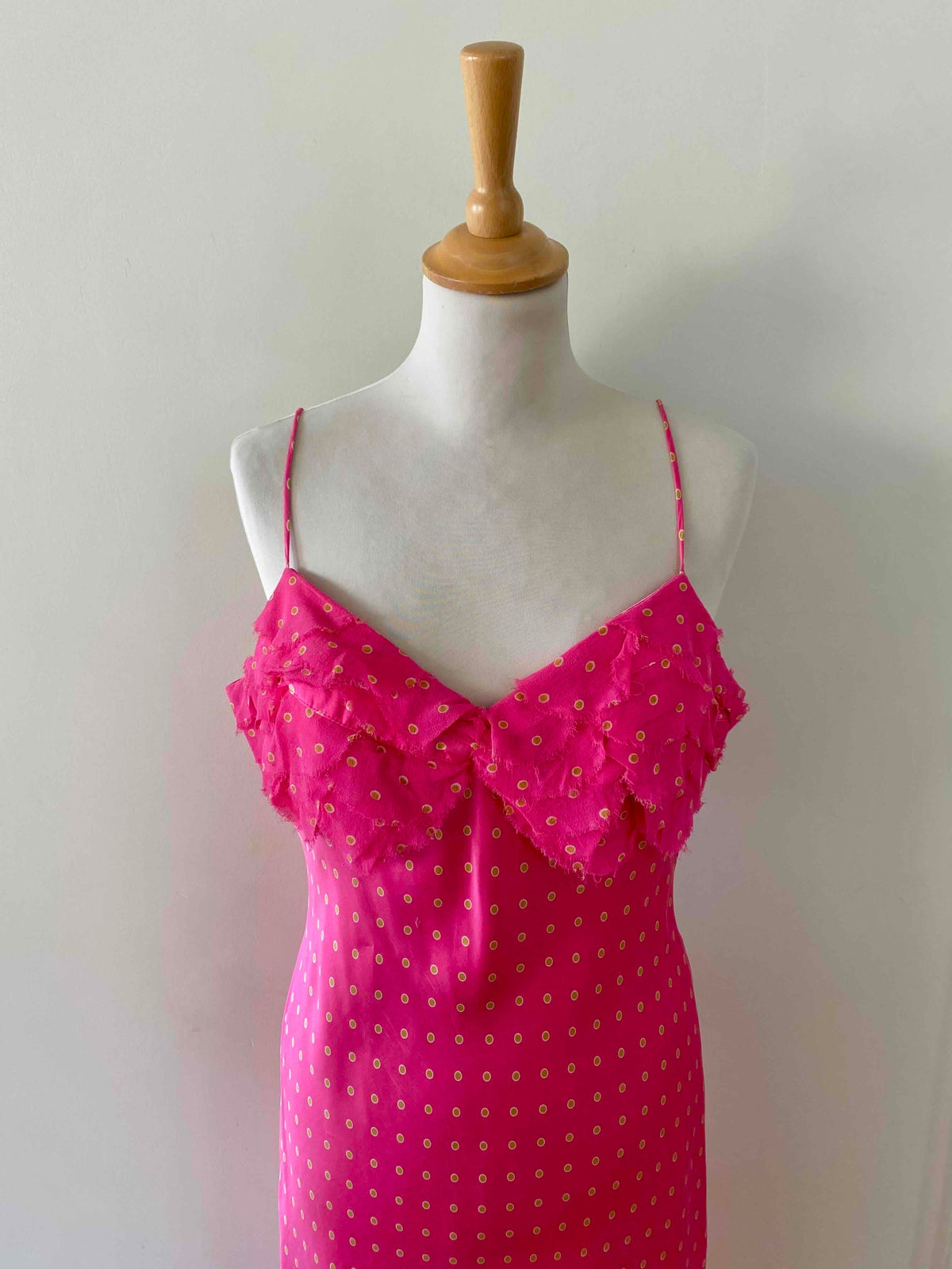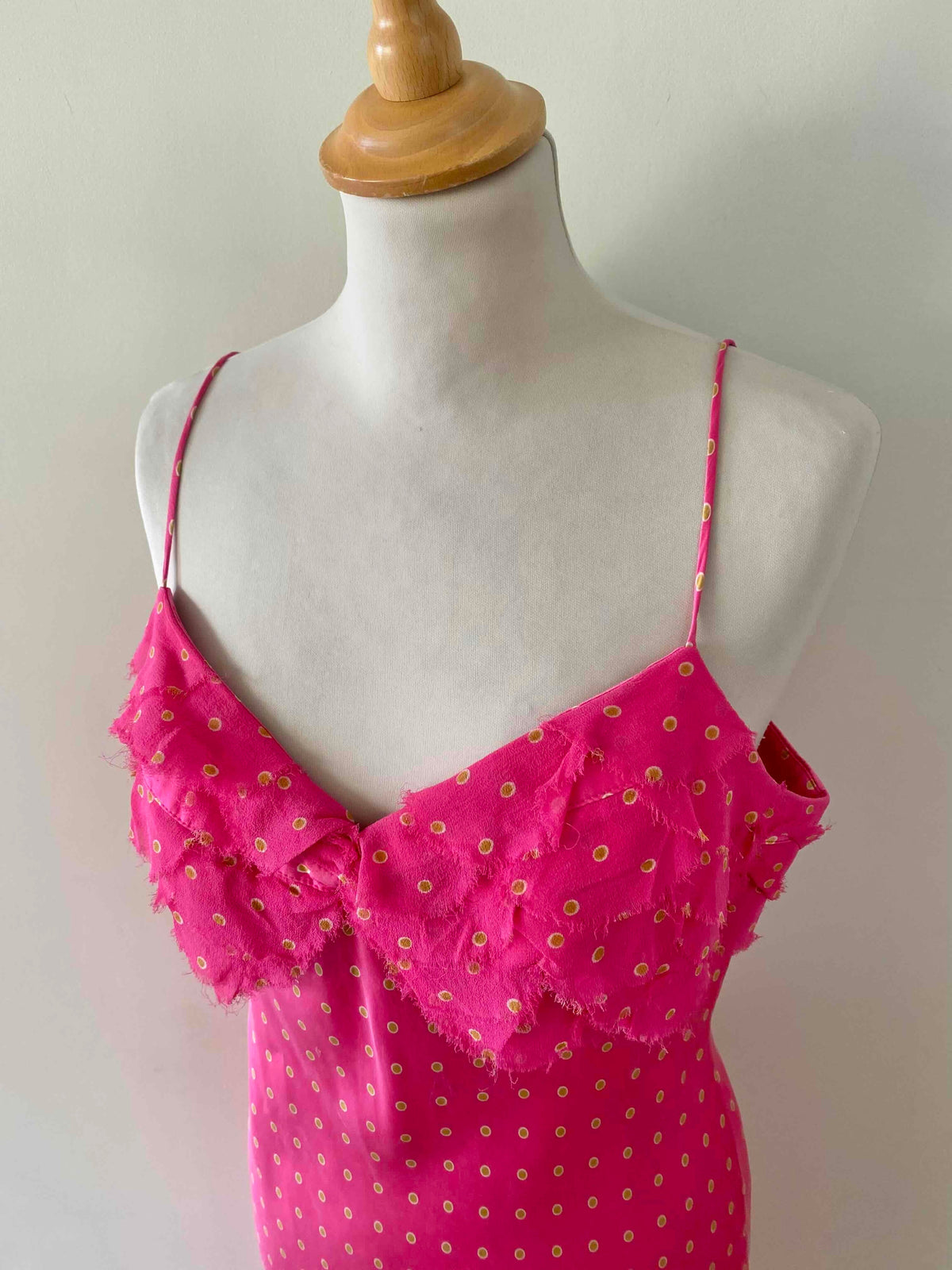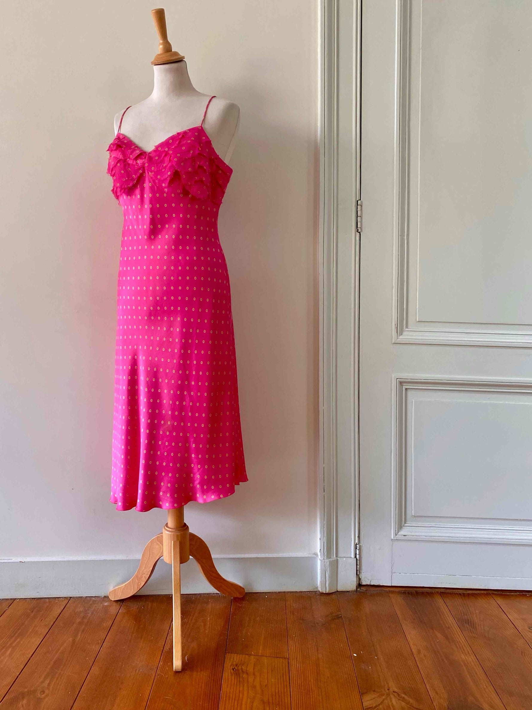 Prix unitaire parRobe nuisette en soie, satin de soie rose fuschia imprimée pois ocres, bretelles spaghettis, poitrine en mousseline de soie à froufrous, forme fit and flare, fabriquée en France, taille 38 portée ici sur un mannequin T36, aisselles 46cm.