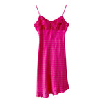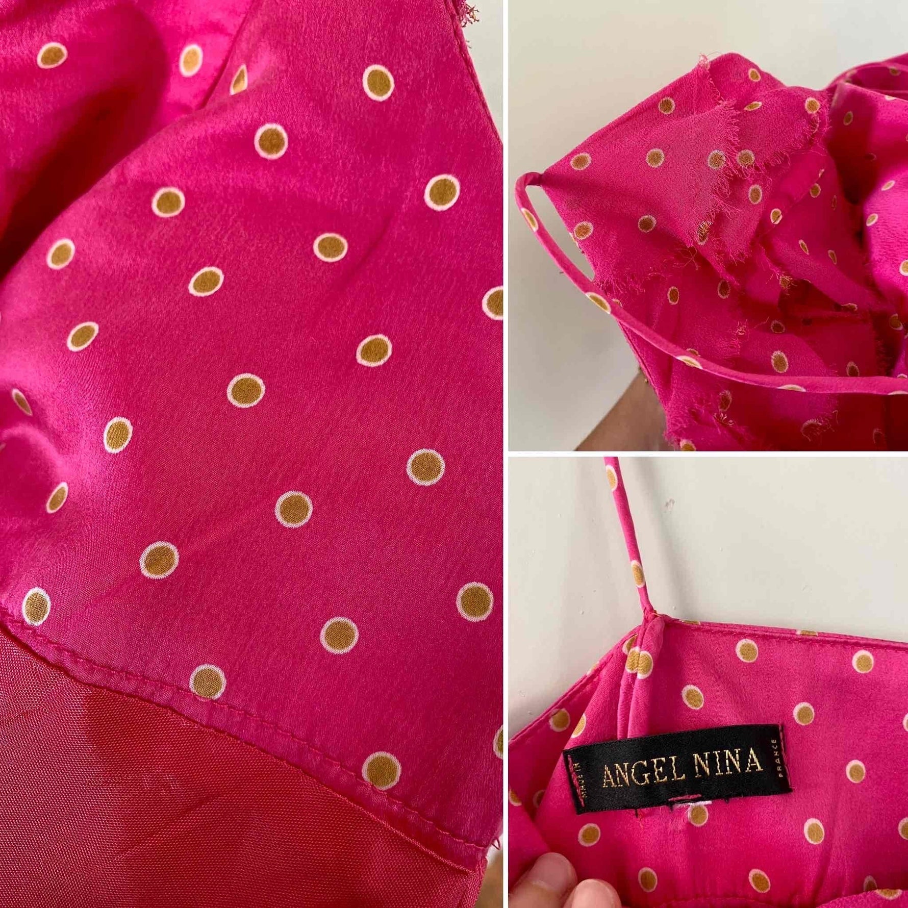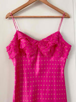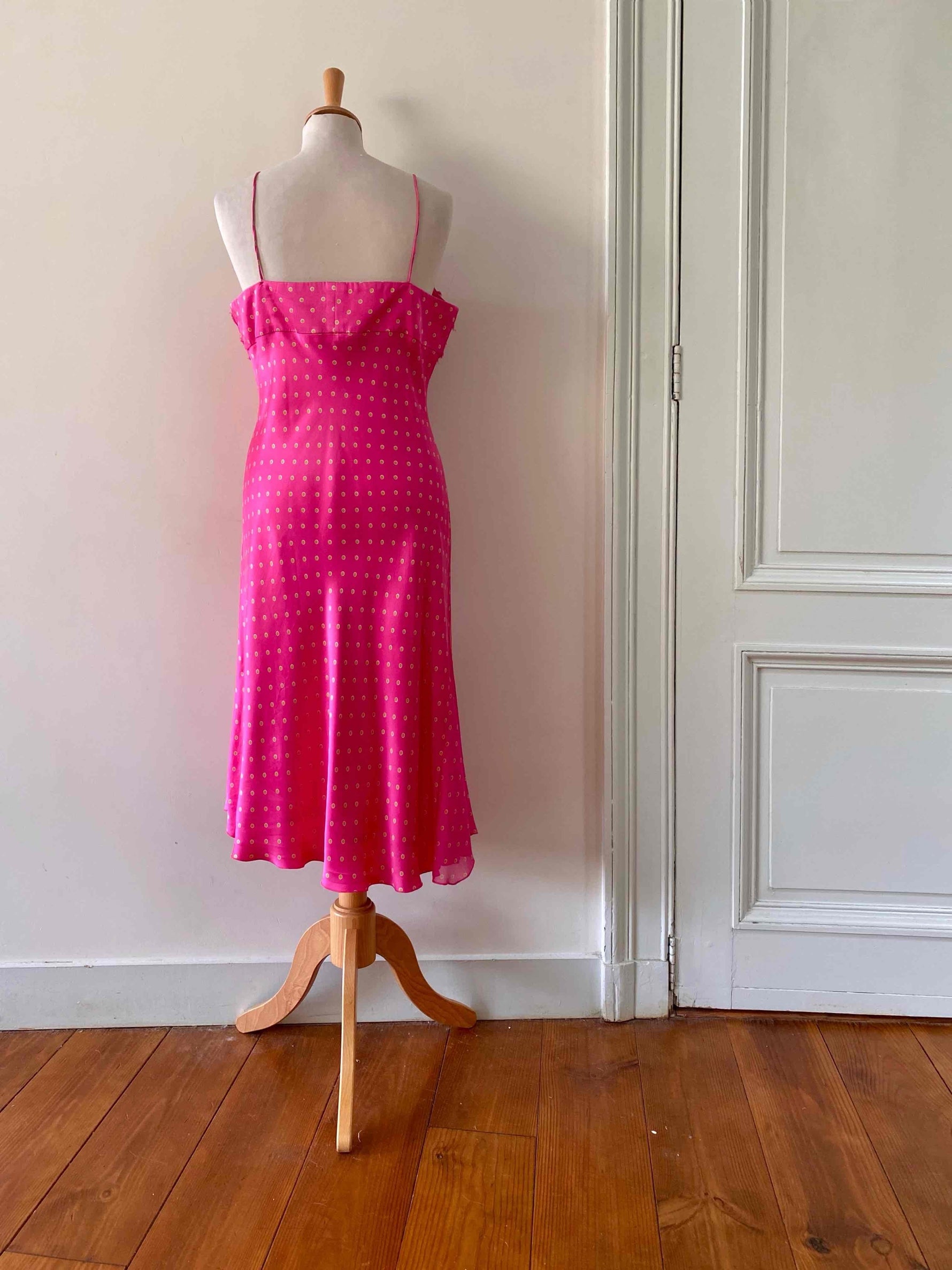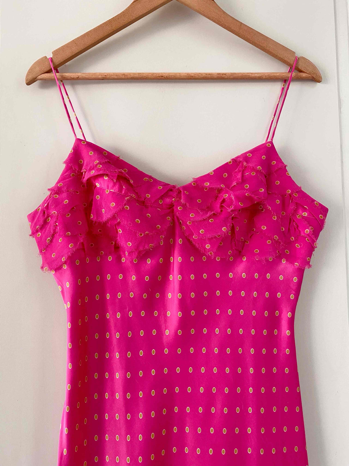 Prix unitaire parRobe nuisette en soie, satin de soie rose fuschia imprimée pois ocres, bretelles spaghettis, poitrine en mousseline de soie à froufrous, forme fit and flare, fabriquée en France, taille 38 portée ici sur un mannequin T36, aisselles 46cm.