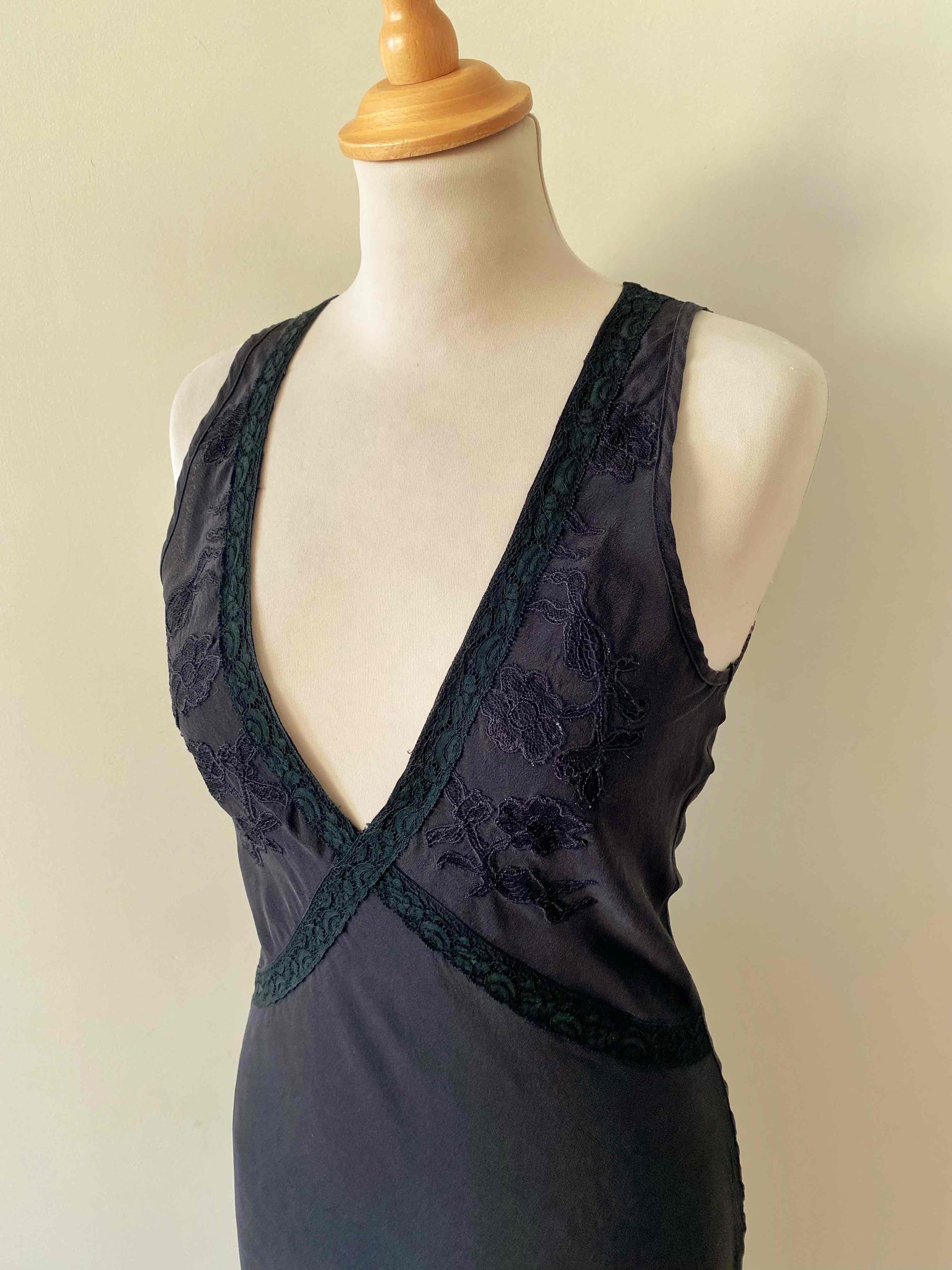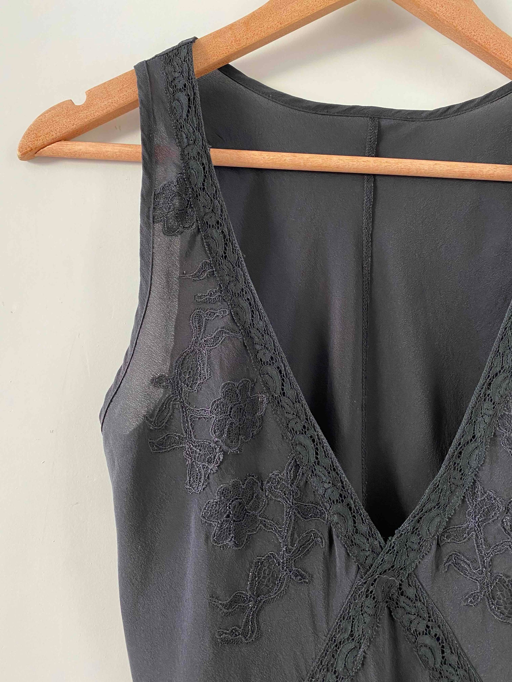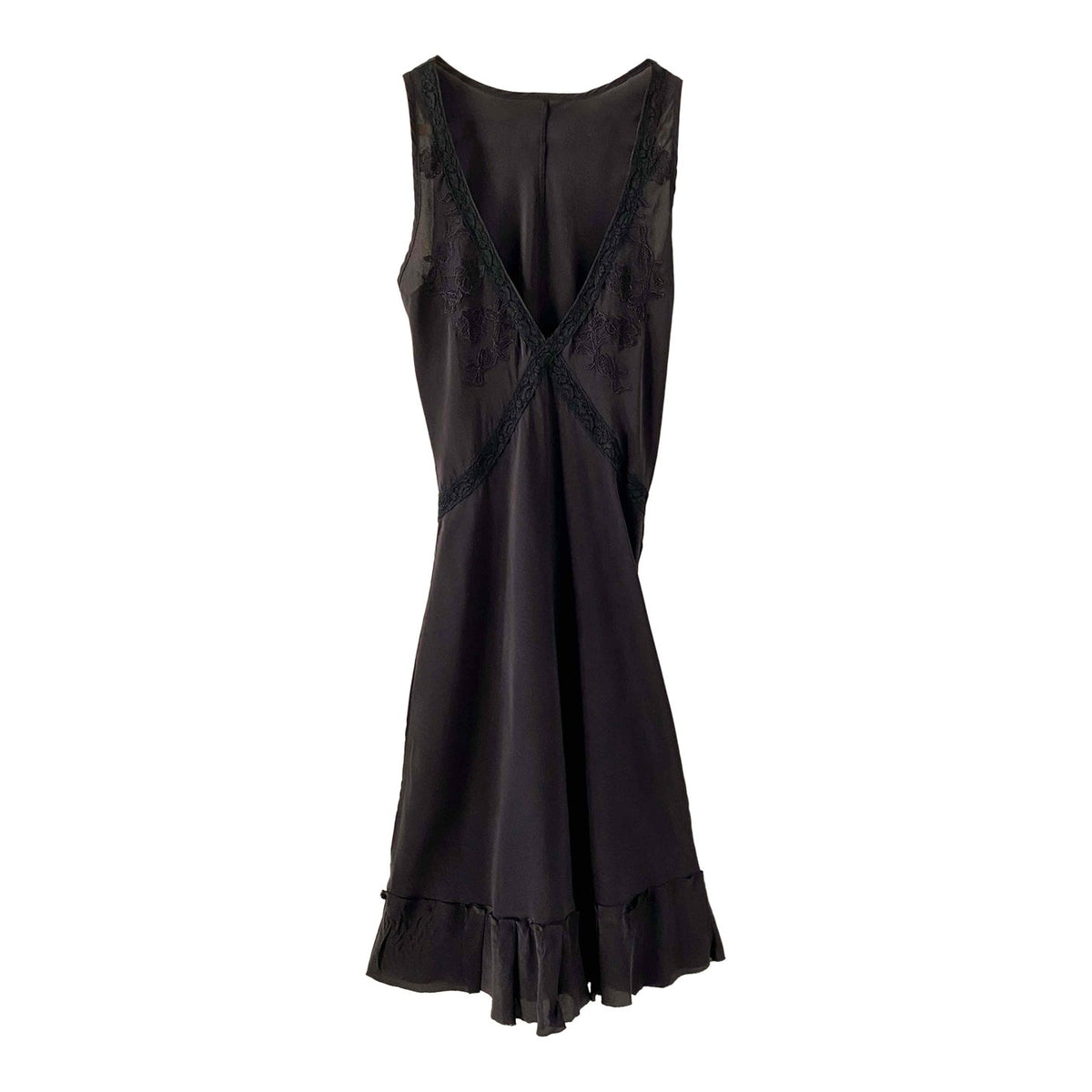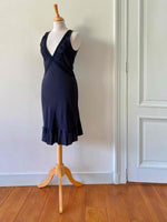 Prix unitaire parRobe nuisette en soie, 100% soie noire, encolure V plongeante brodée de dentelle, découpes poitrine croisées et brodées de dentelle noire appliquées, bas volanté, forme fit and flare, fabriquée en Italie, taille 36 portée ici sur un mannequin T36, aisselles 43cm.