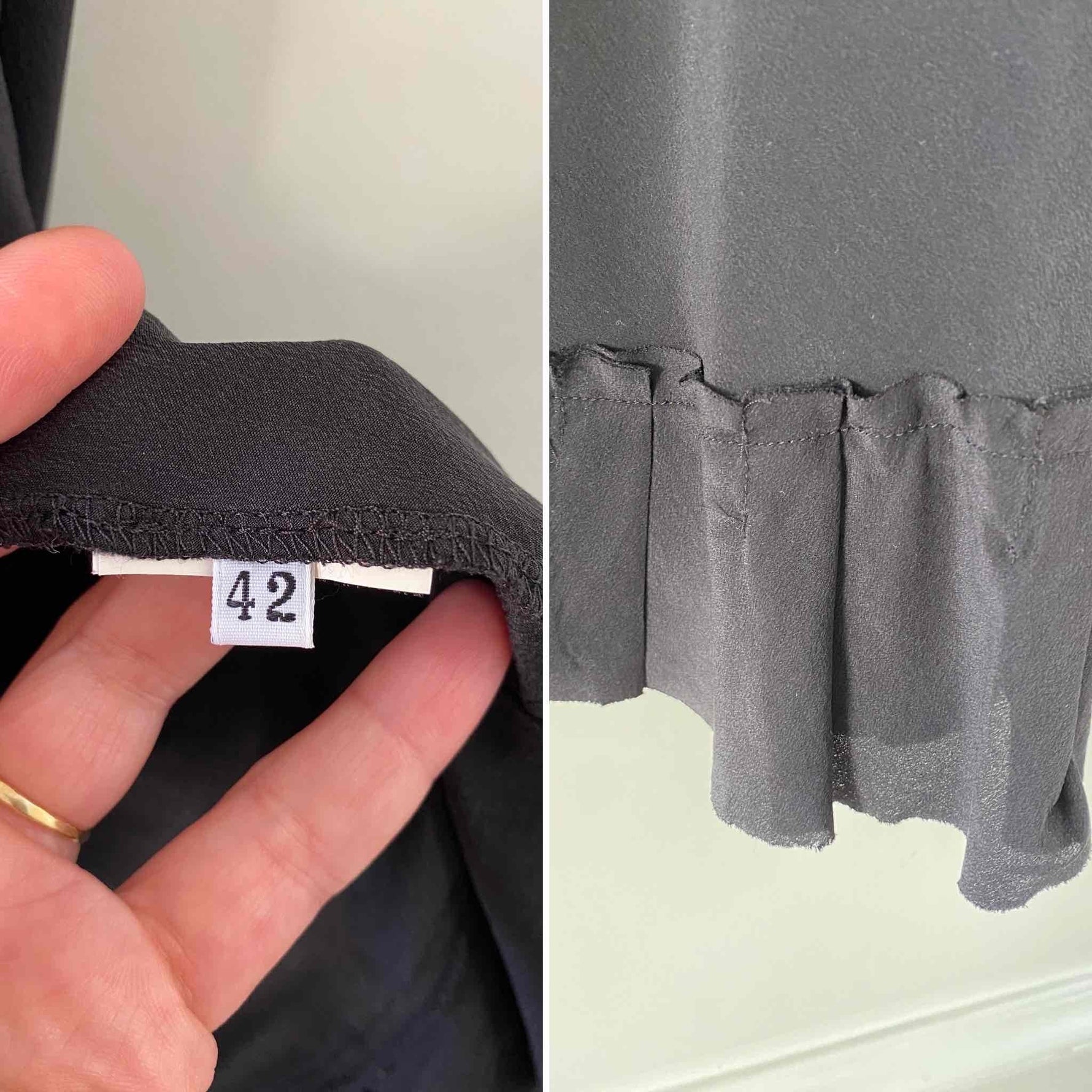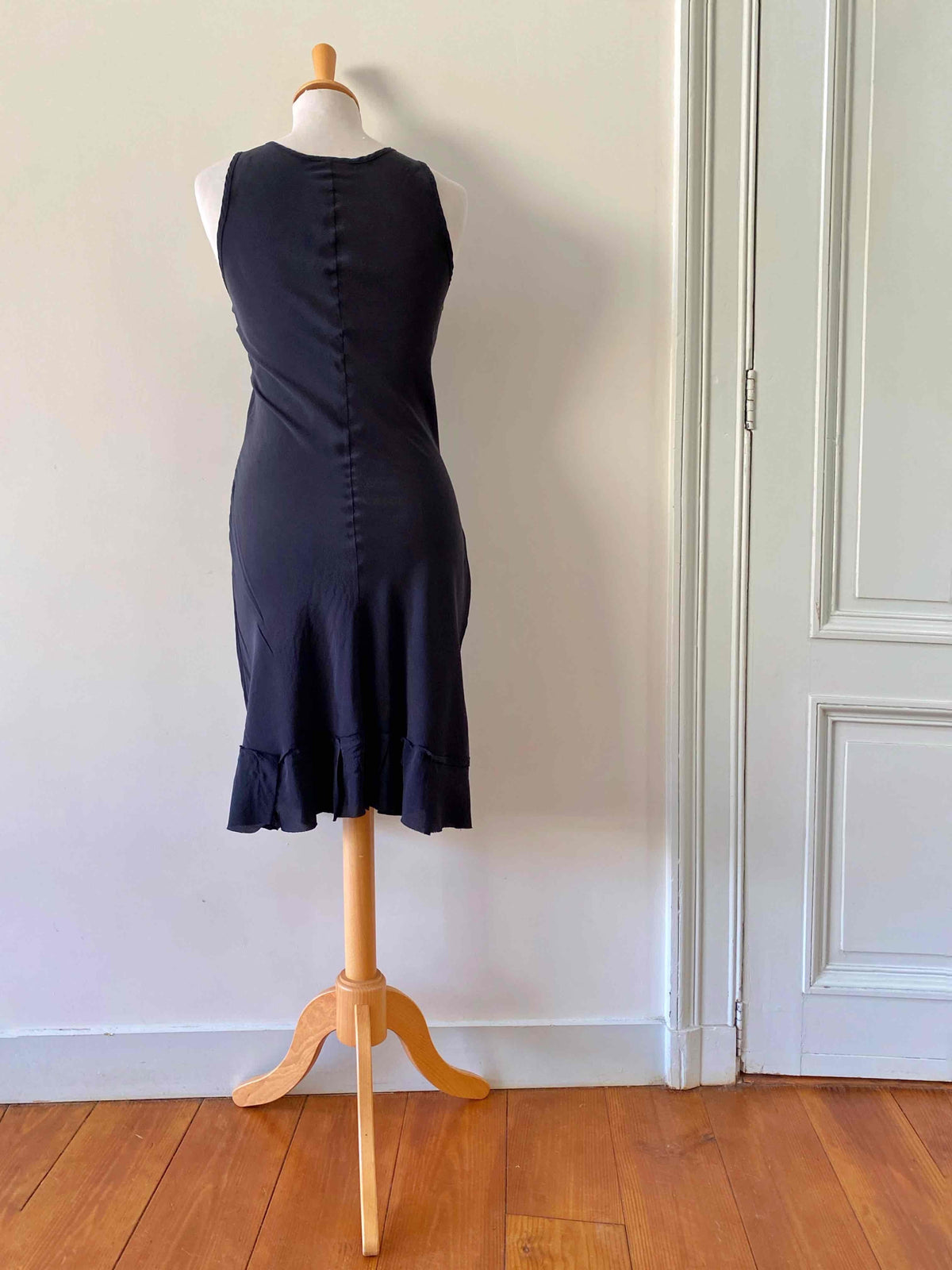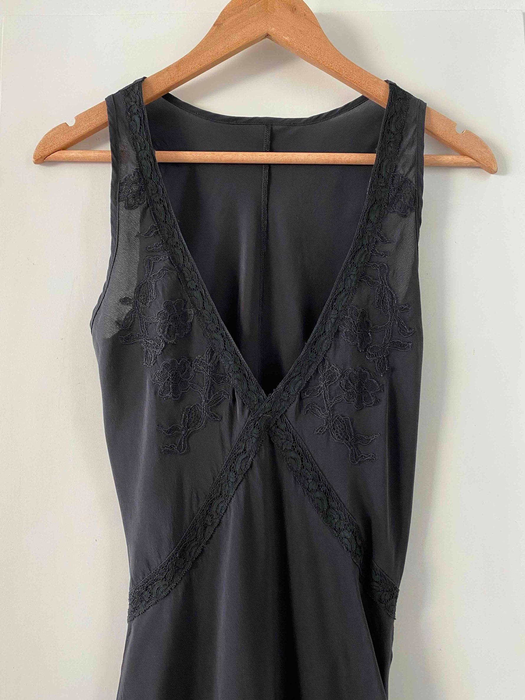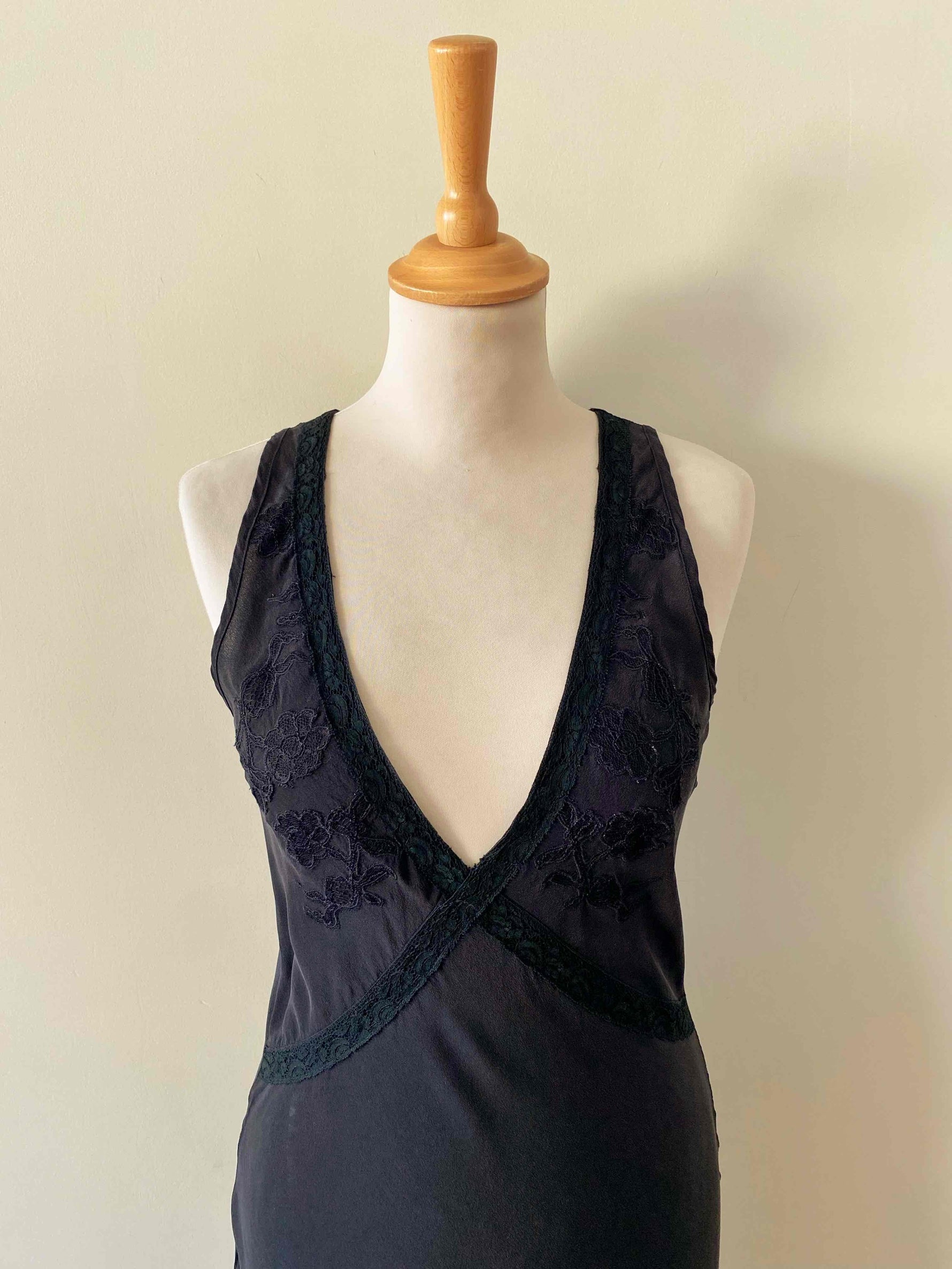Prix unitaire parRobe nuisette en soie, 100% soie noire, encolure V plongeante brodée de dentelle, découpes poitrine croisées et brodées de dentelle noire appliquées, bas volanté, forme fit and flare, fabriquée en Italie, taille 36 portée ici sur un mannequin T36, aisselles 43cm.