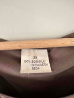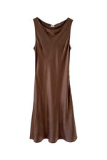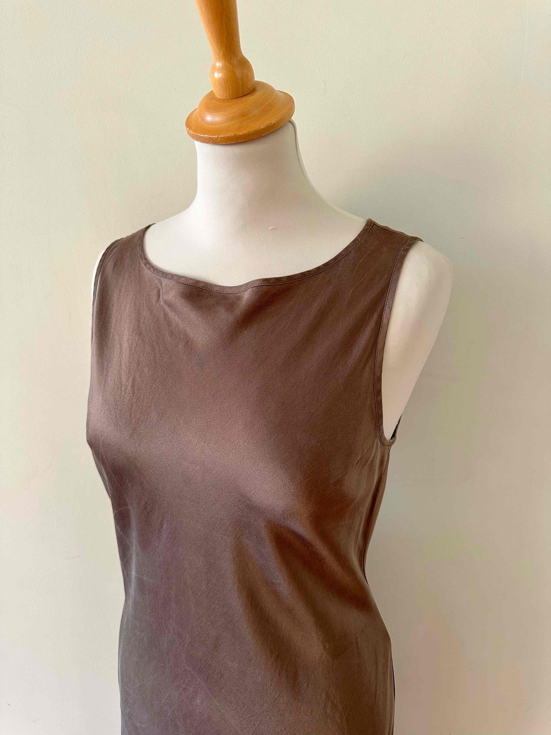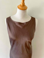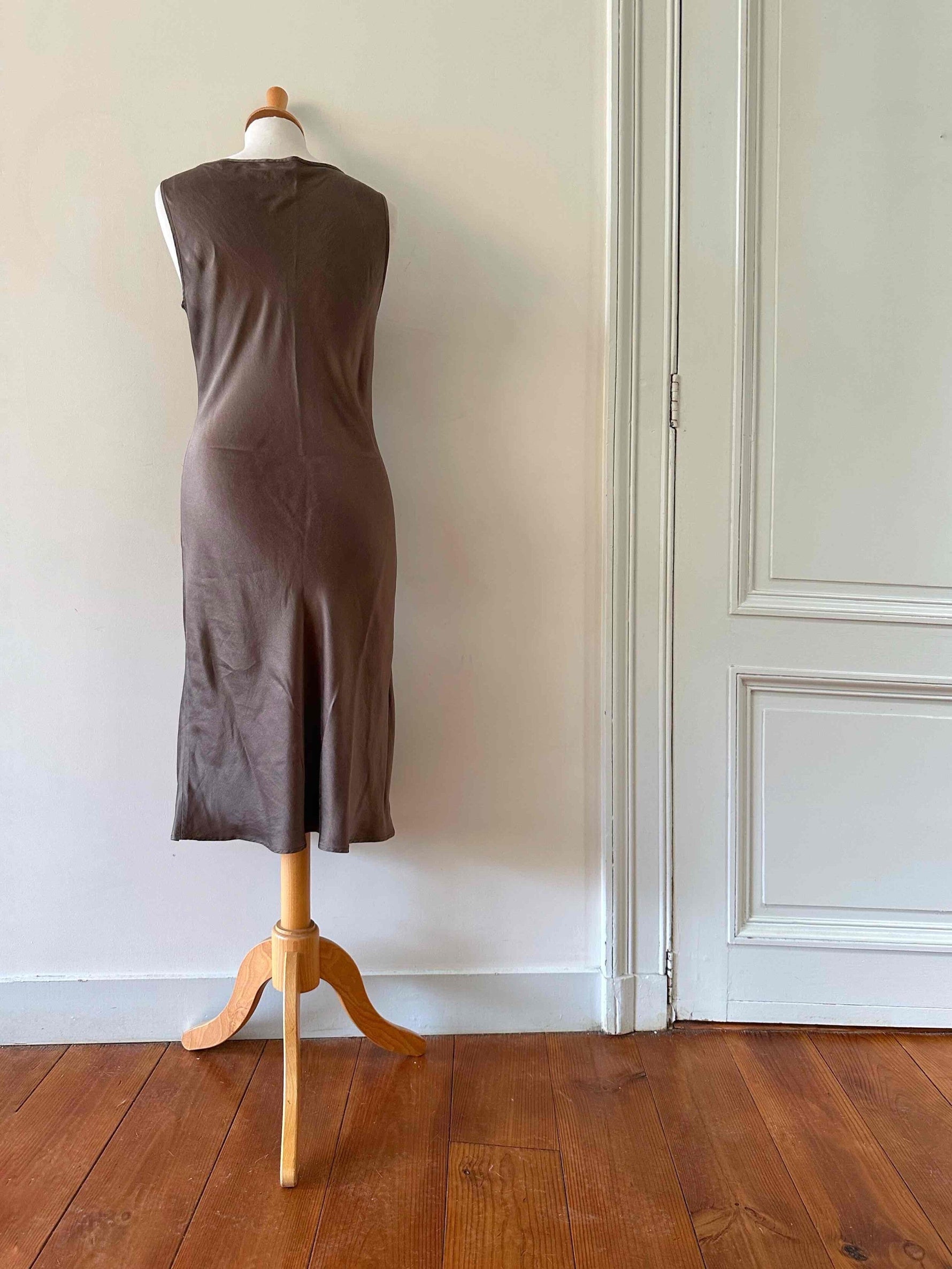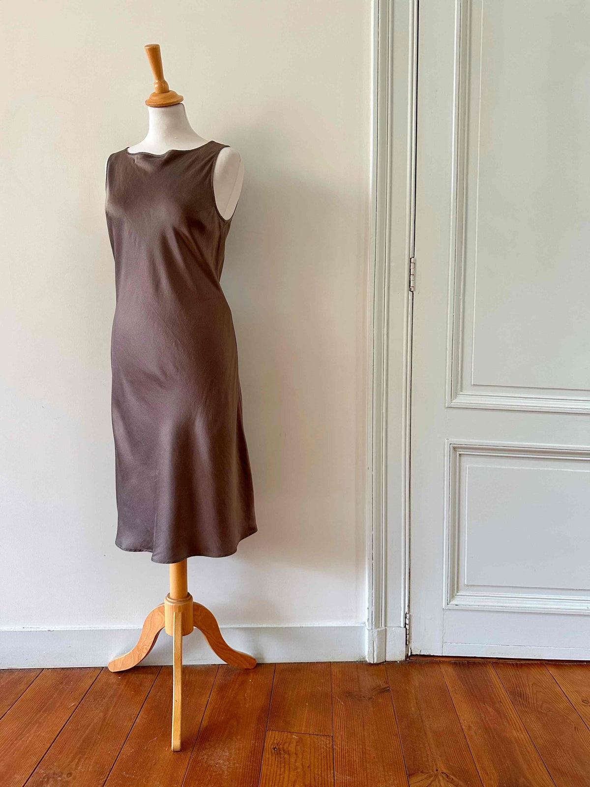 Prix unitaire parRobe nuisette en soie, satin de soie lavé chocolat marron glacé, taillée en biais, taille 36 portée ici sur un mannequin T36, aisselles 43cm.