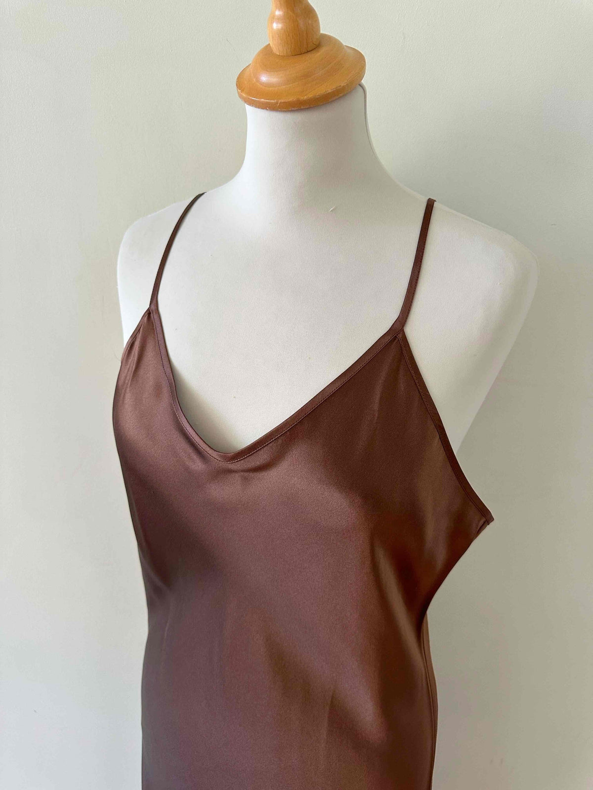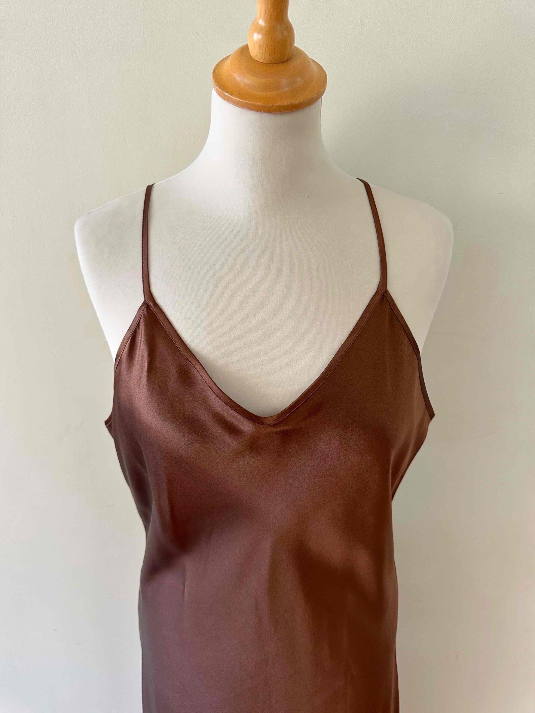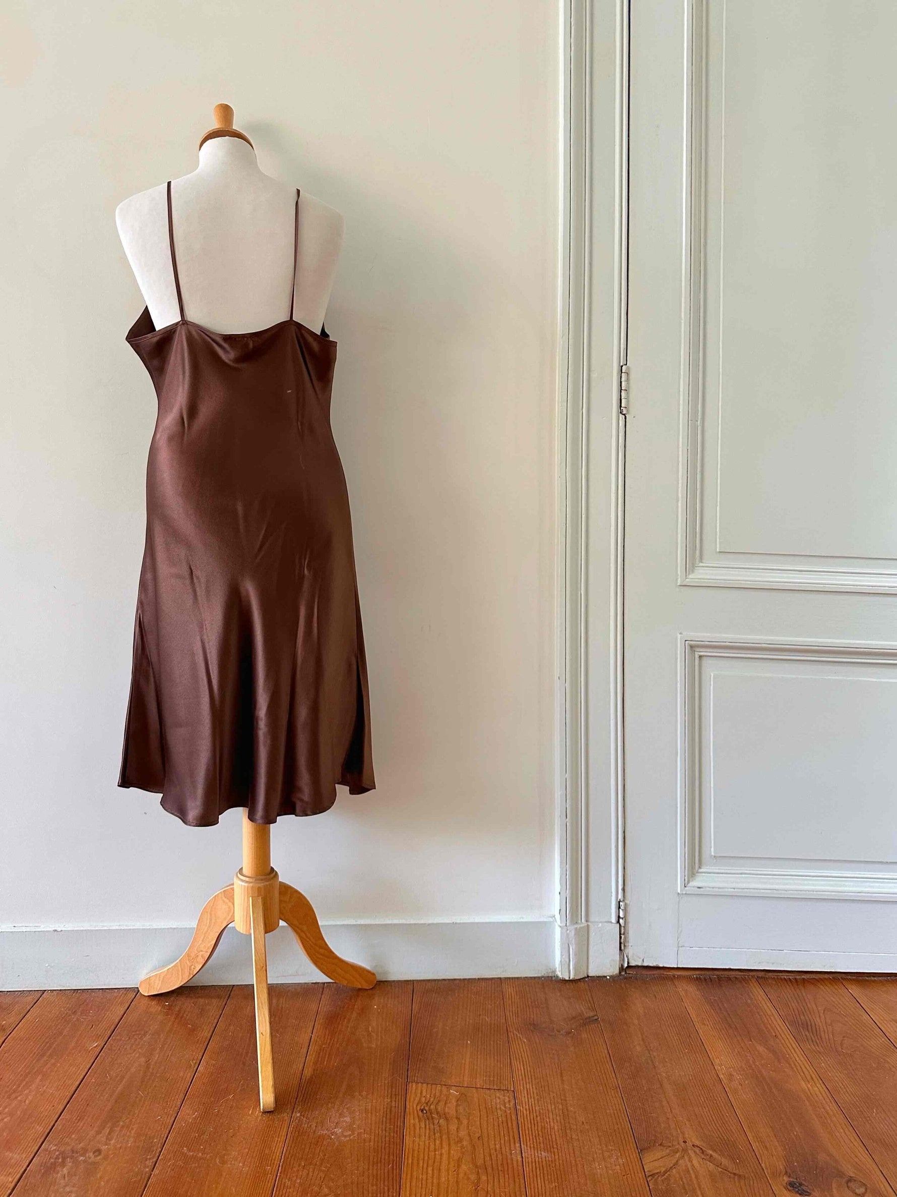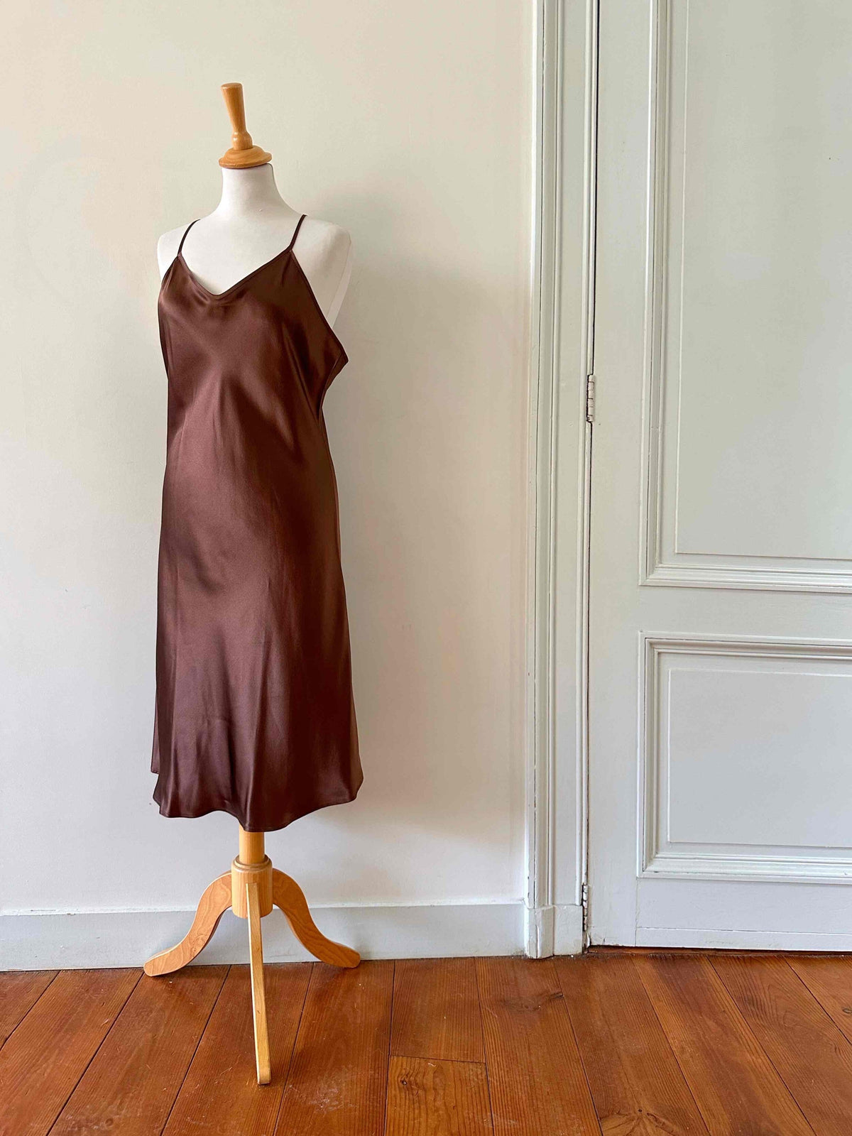 Prix unitaire parNuisette en soie, satin de soie chocolat, bretelles spaghettis, taillée en biais, fabriquée en Italie, taille 40 portée ici sur un mannequin T36, aisselles 50cm.