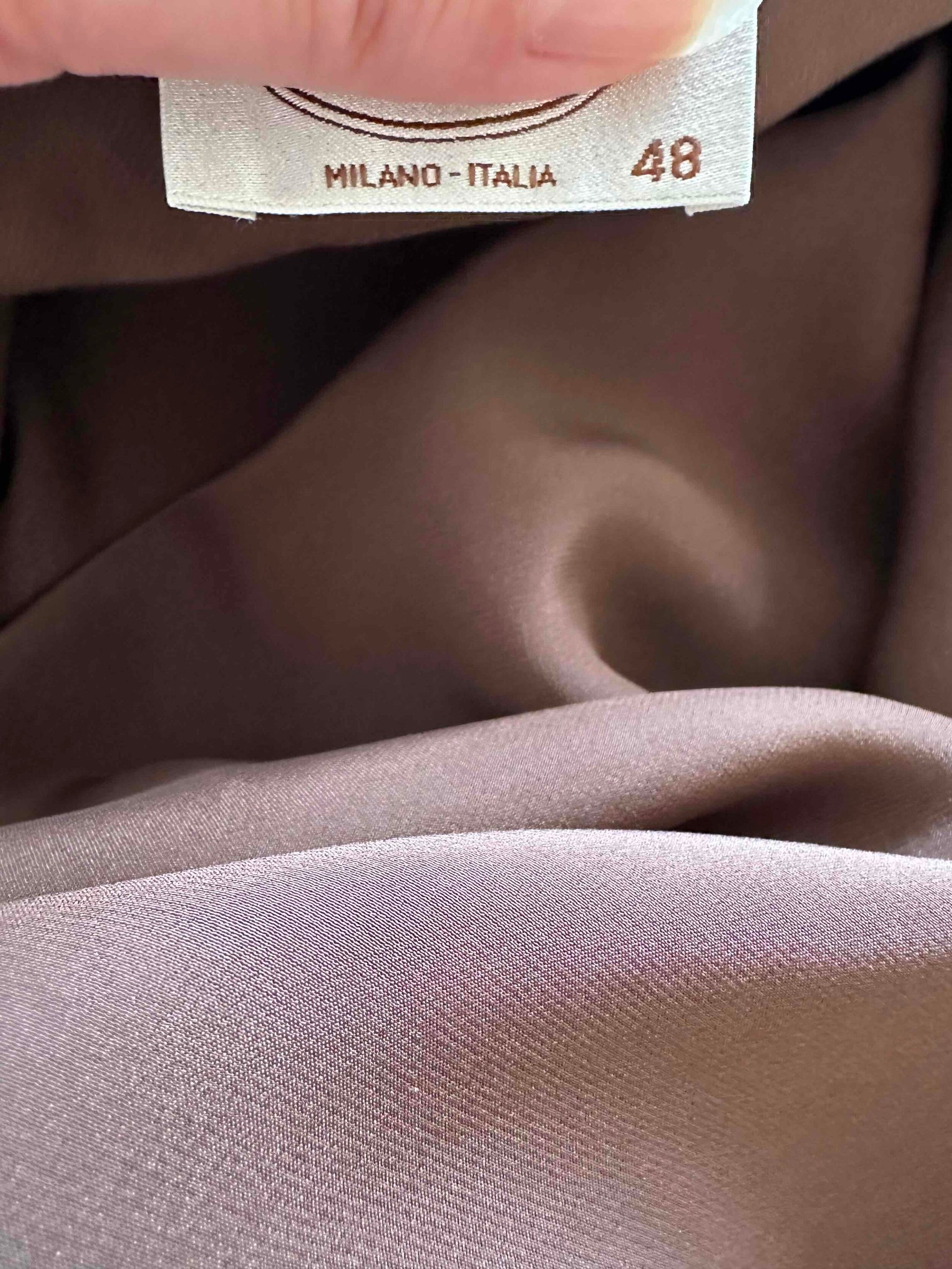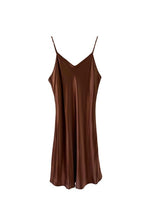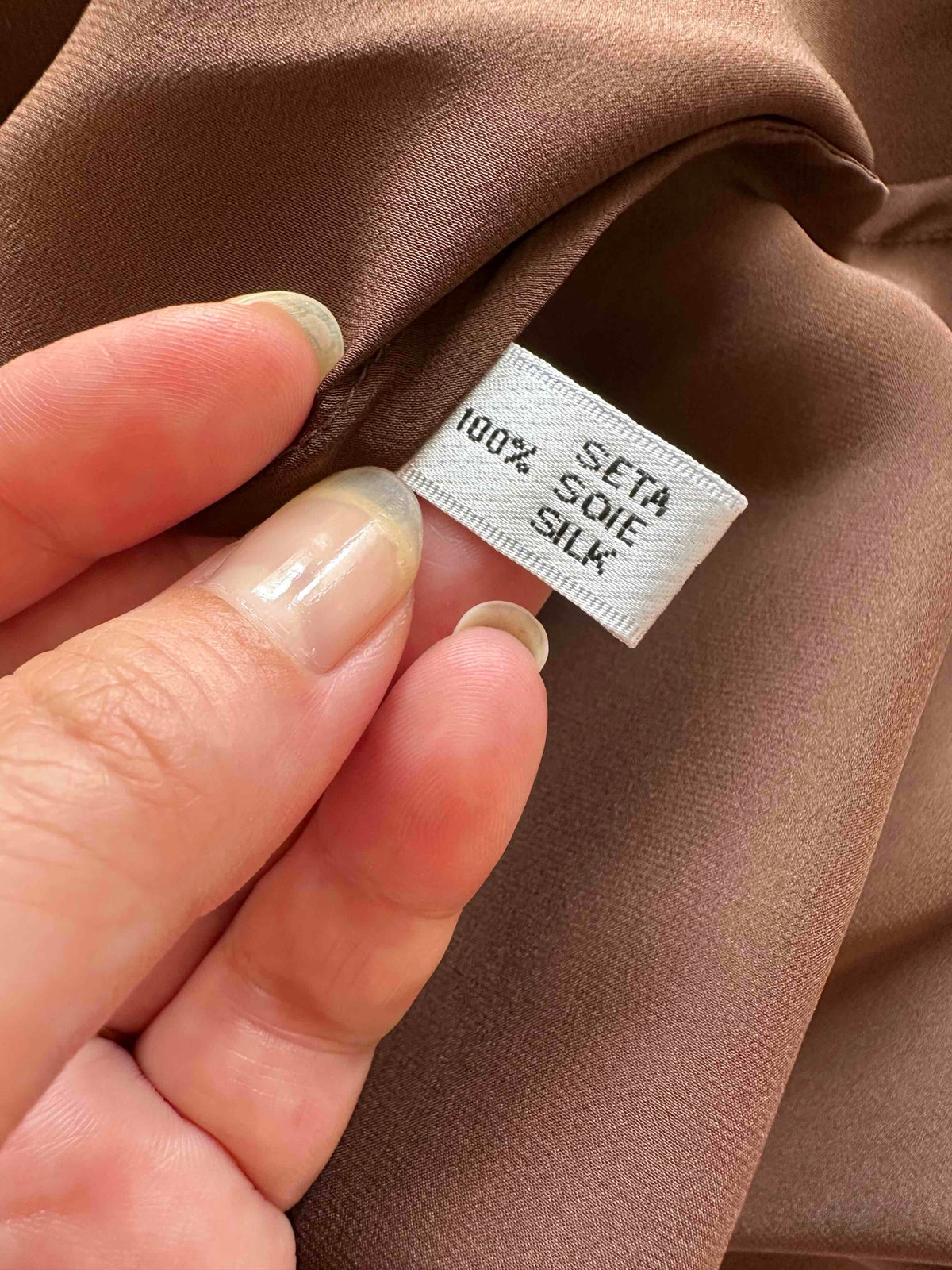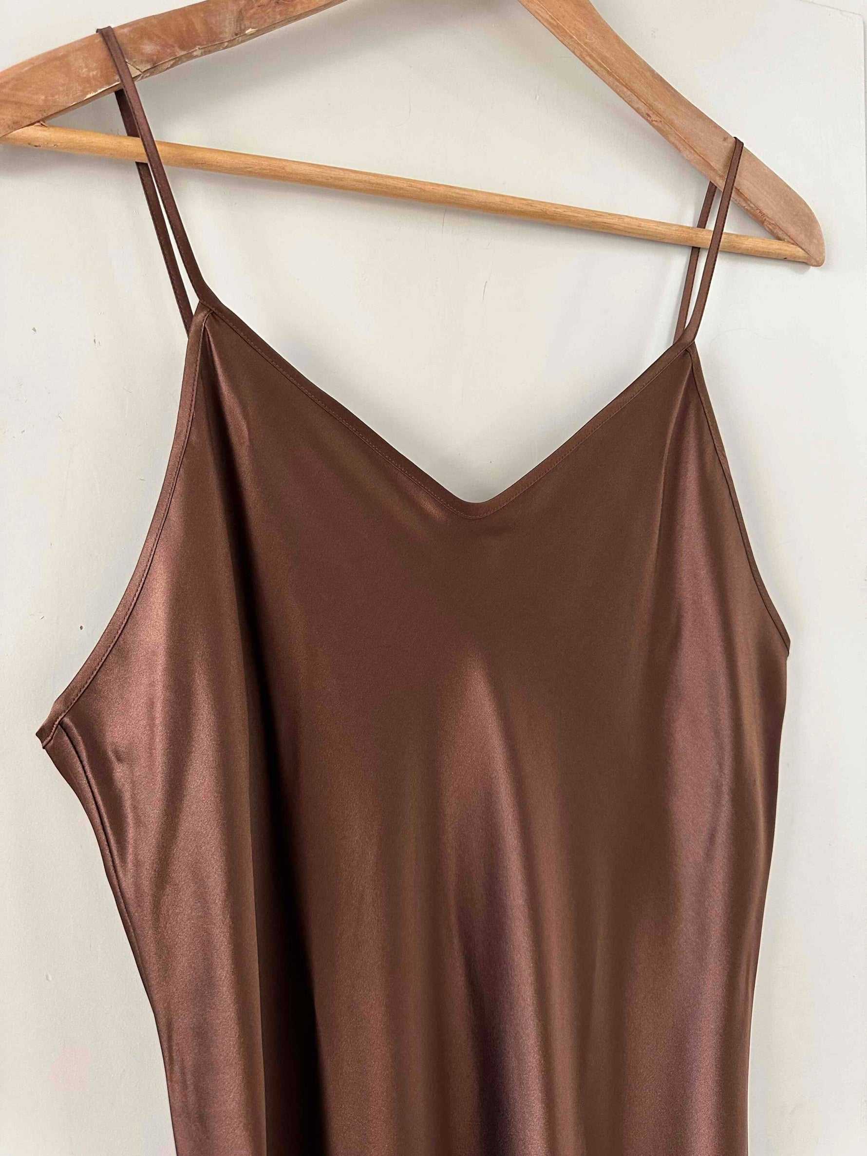 Prix unitaire parNuisette en soie, satin de soie chocolat, bretelles spaghettis, taillée en biais, fabriquée en Italie, taille 40 portée ici sur un mannequin T36, aisselles 50cm.