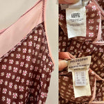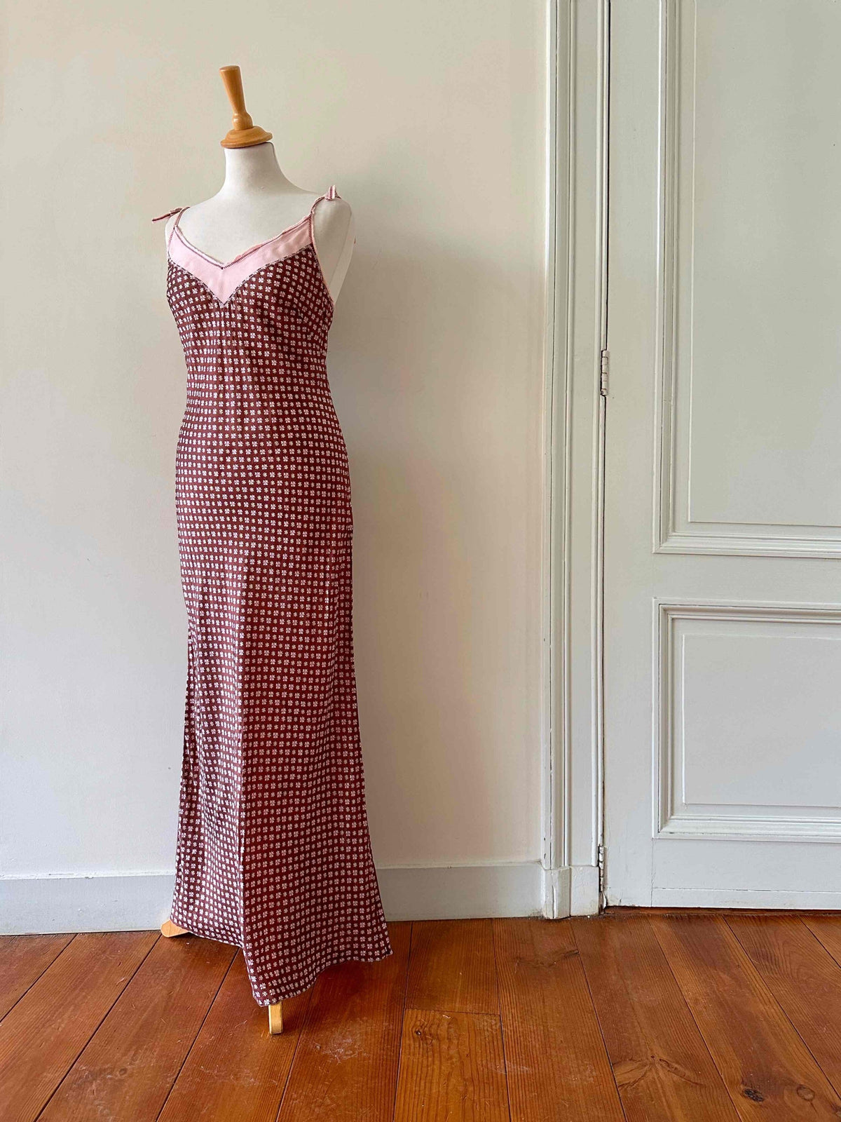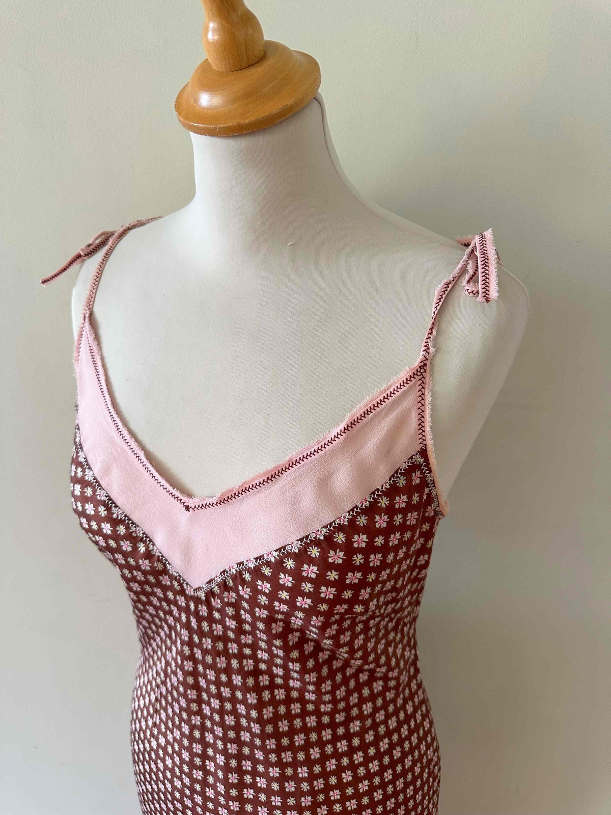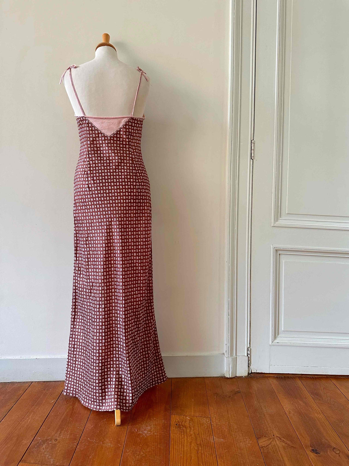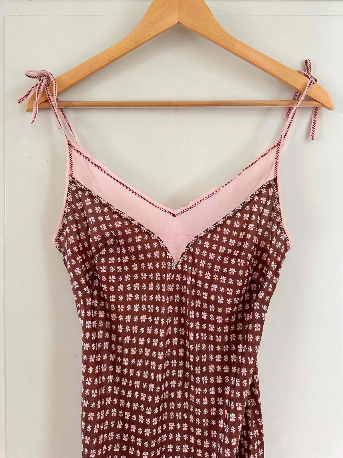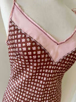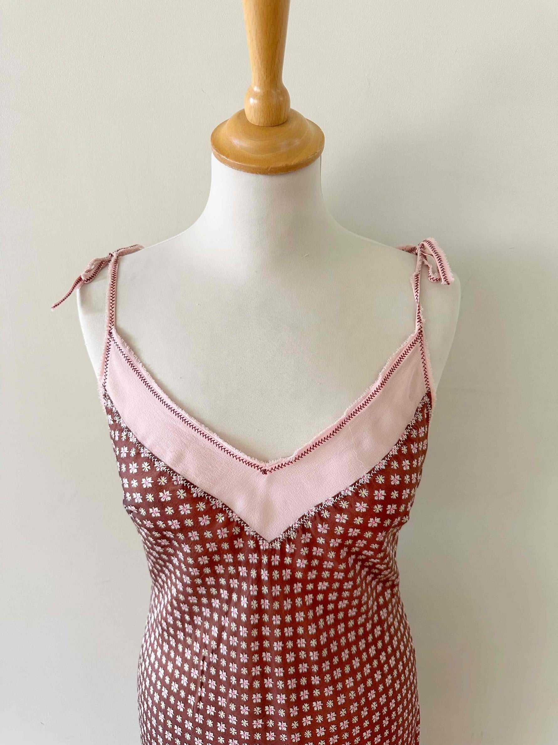 Prix unitaire parRobe nuisettes en soie Alberta Ferretti, en soie chocolat imprimé mini motifs floraux, bretelles en mousseline de soie rose pastel à nouer, taillée en biais, longueur maxi mousseline de soie rose ajourée en bordure poitrine.