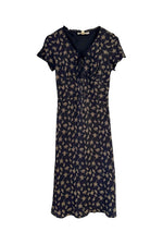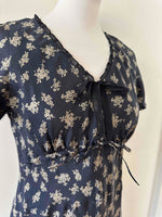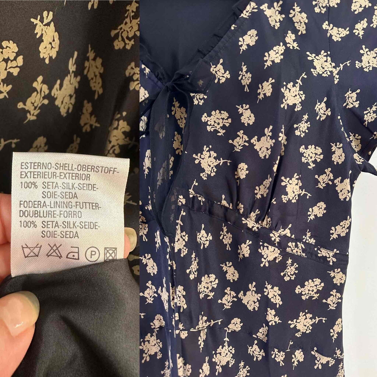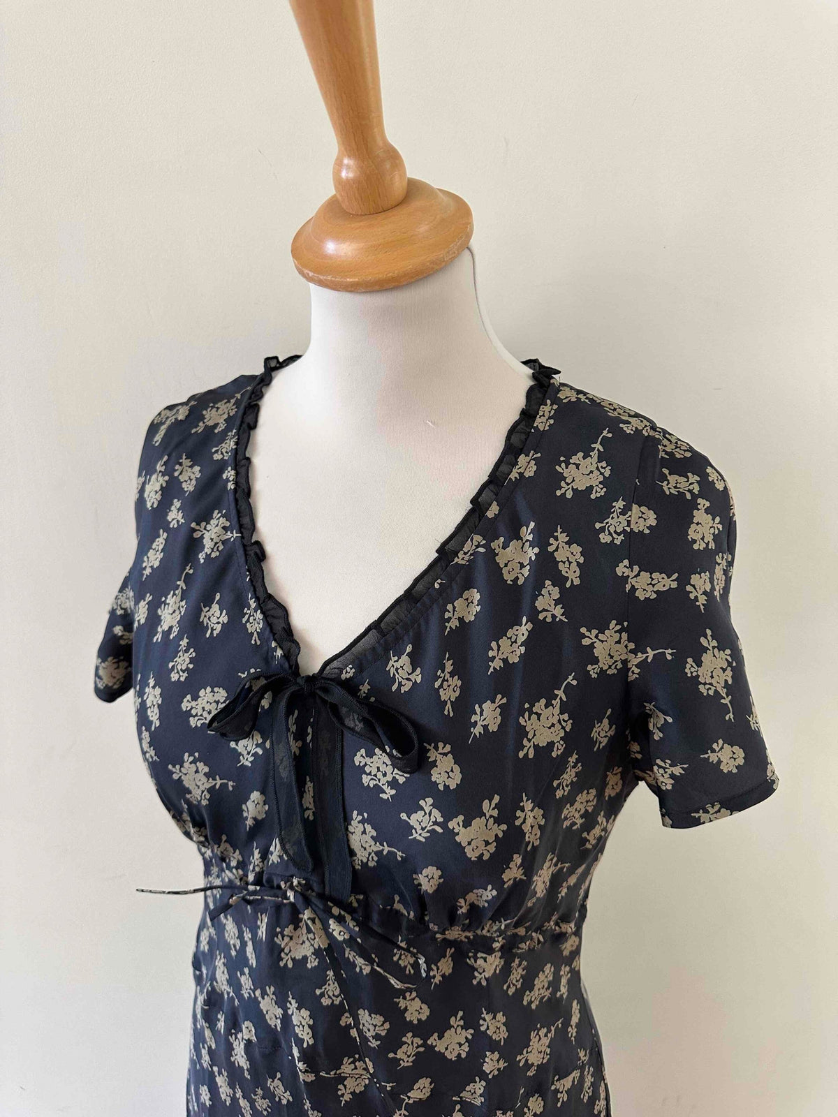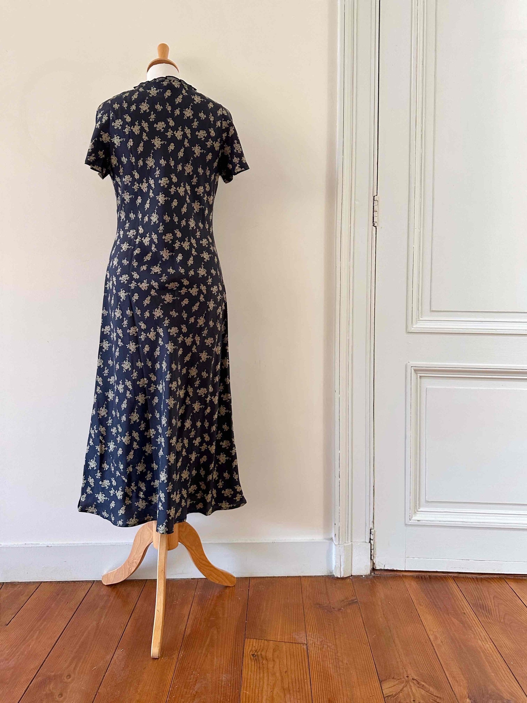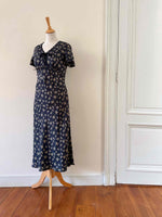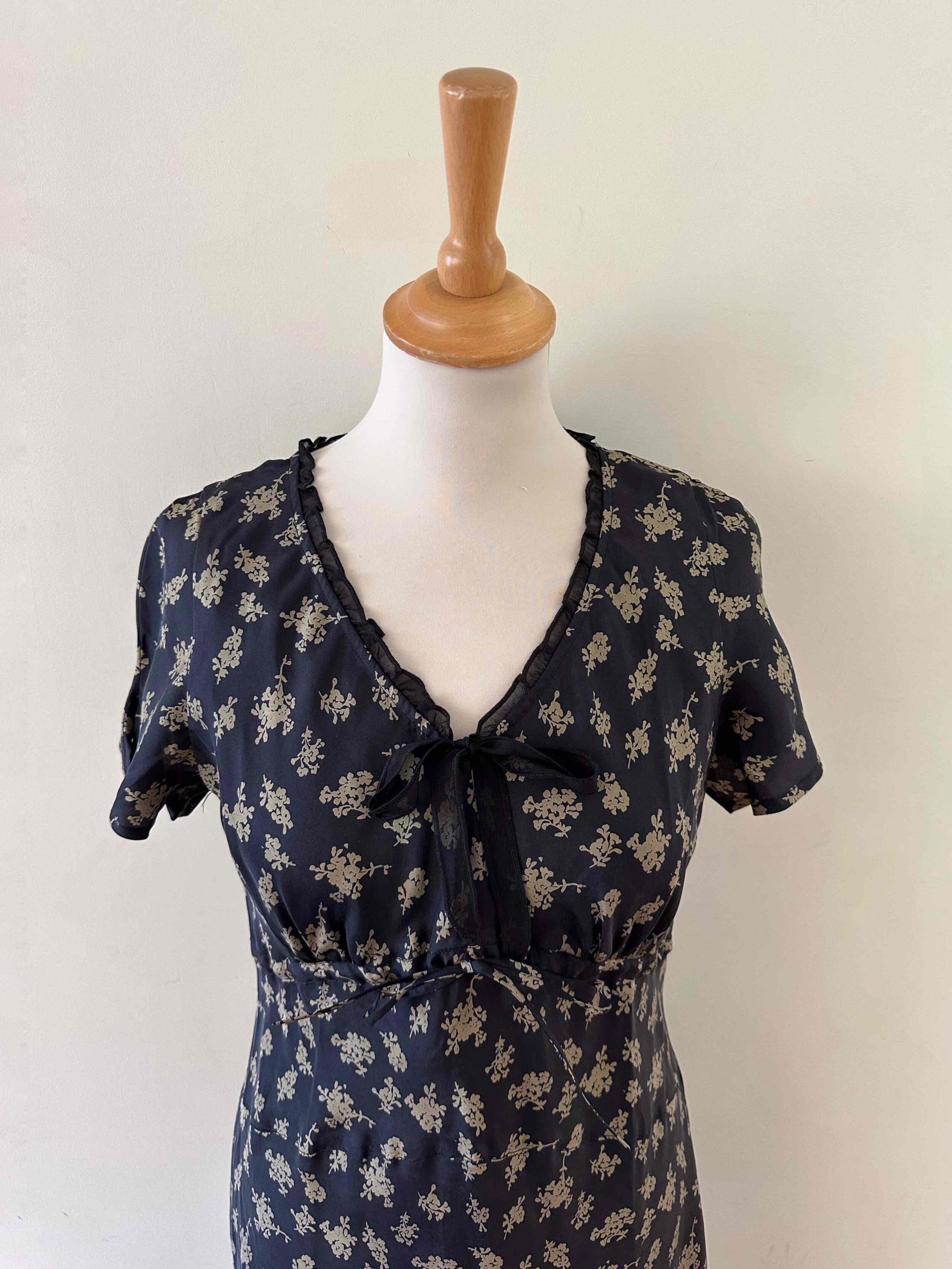 Prix unitaire parRobe nuisette en soie, soie noire motifs fleurs vert olive, manches papillons, encolure V à nouer, découpe sous poitrine à nouer par un cordon, taillée en biais, fabriquée en Italie, taille 36 portée ici sur un mannequin T36, aisselles 44cm.
