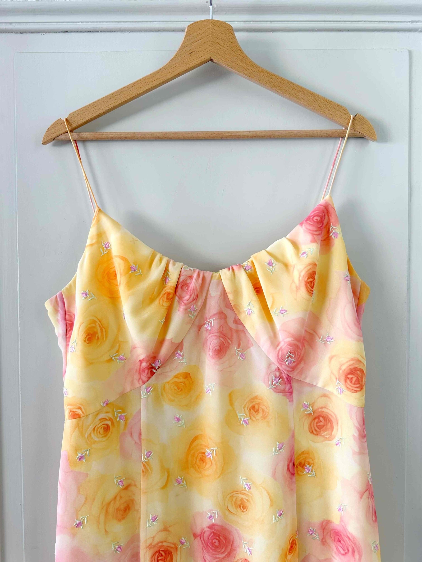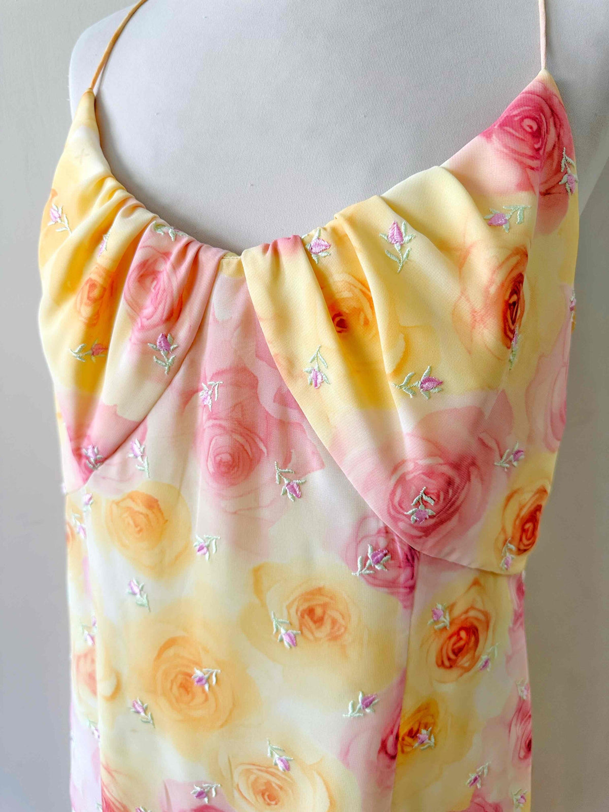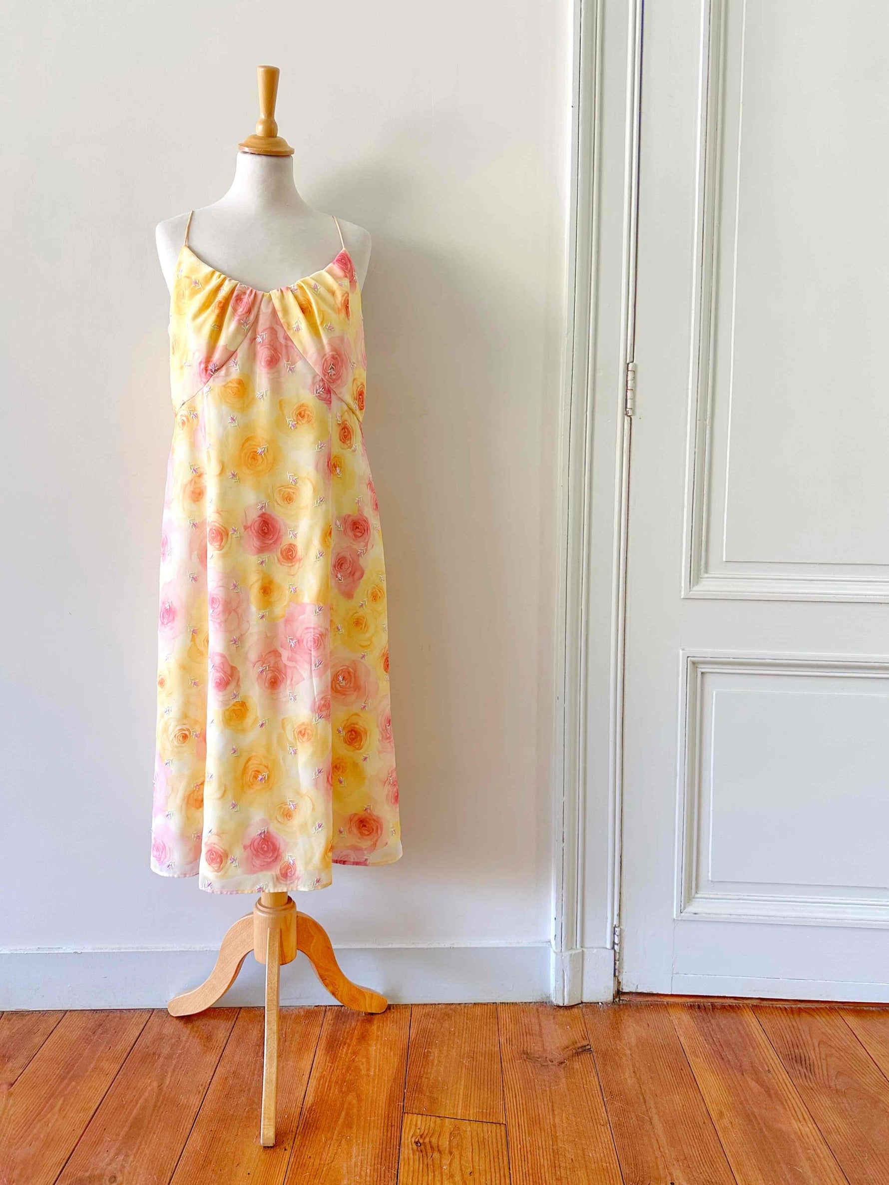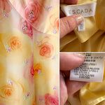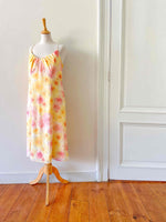 Prix unitaire parRobe nuisette Escada, en soie jaune et voile imprimé de fleurs roses, oranges et jaunes, rebrodé de petites fleurs roses et vertes.